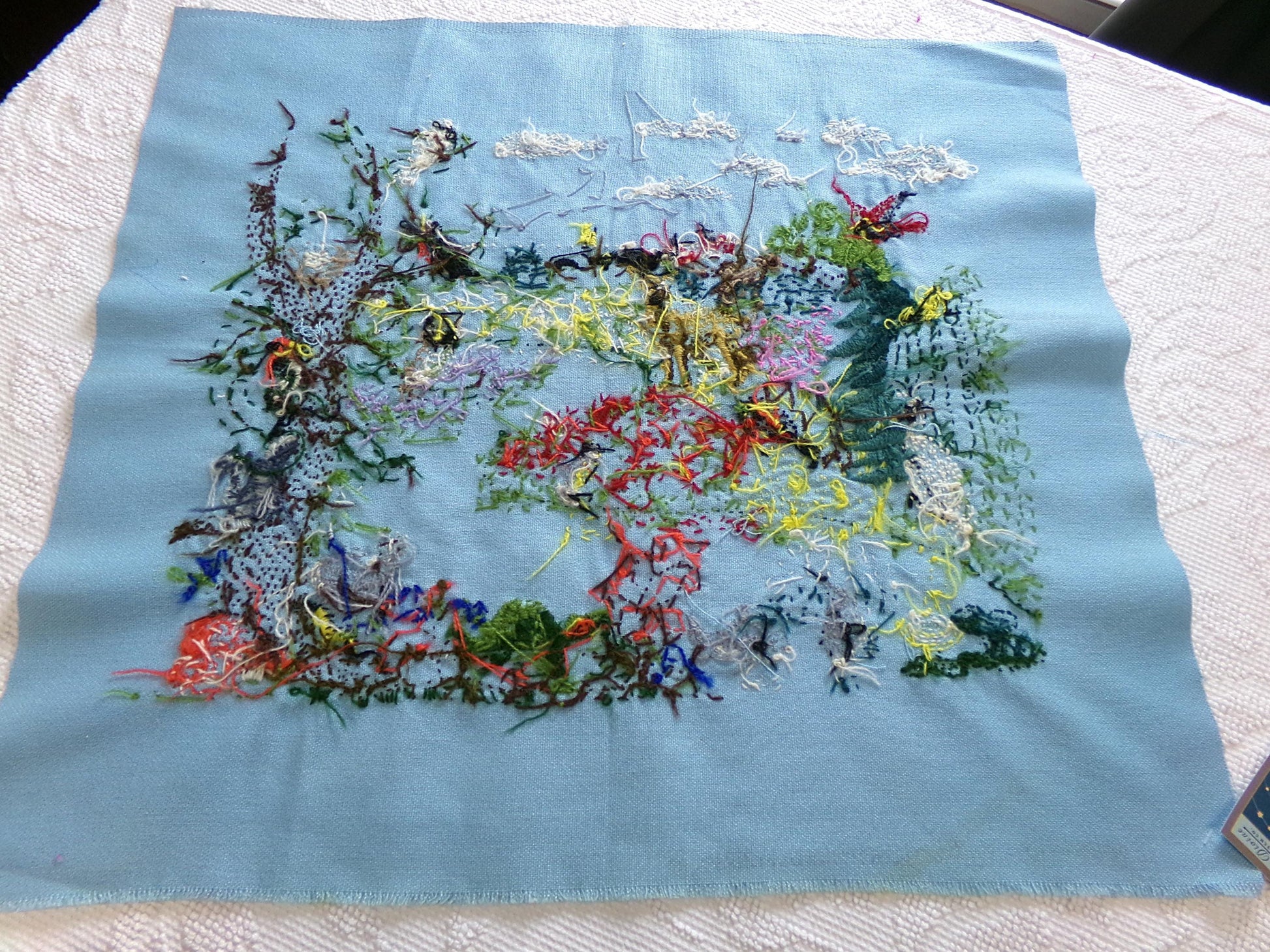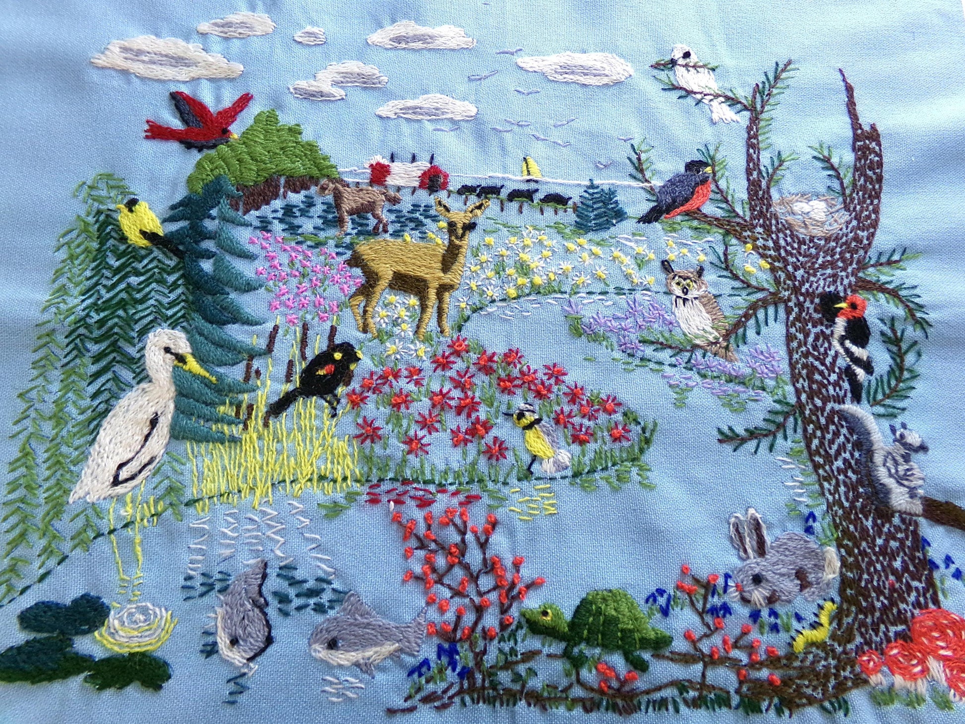 Embroidered by hand from a rare Paragon Needlecraft Kit, #0418/02446x. Original design was by Carol & Don Henning. Measures about 22" x 20" inches.