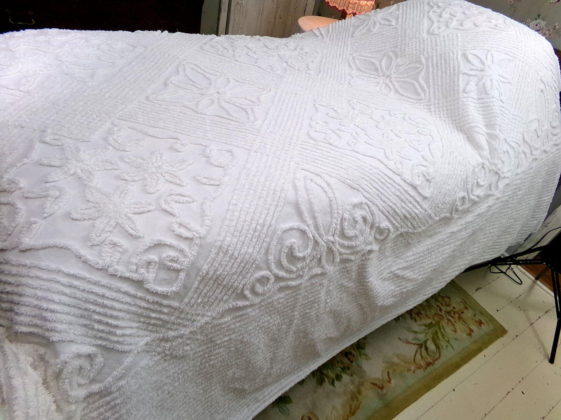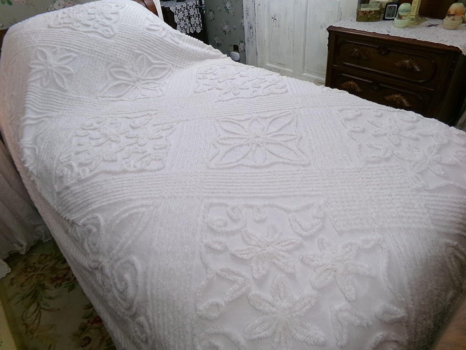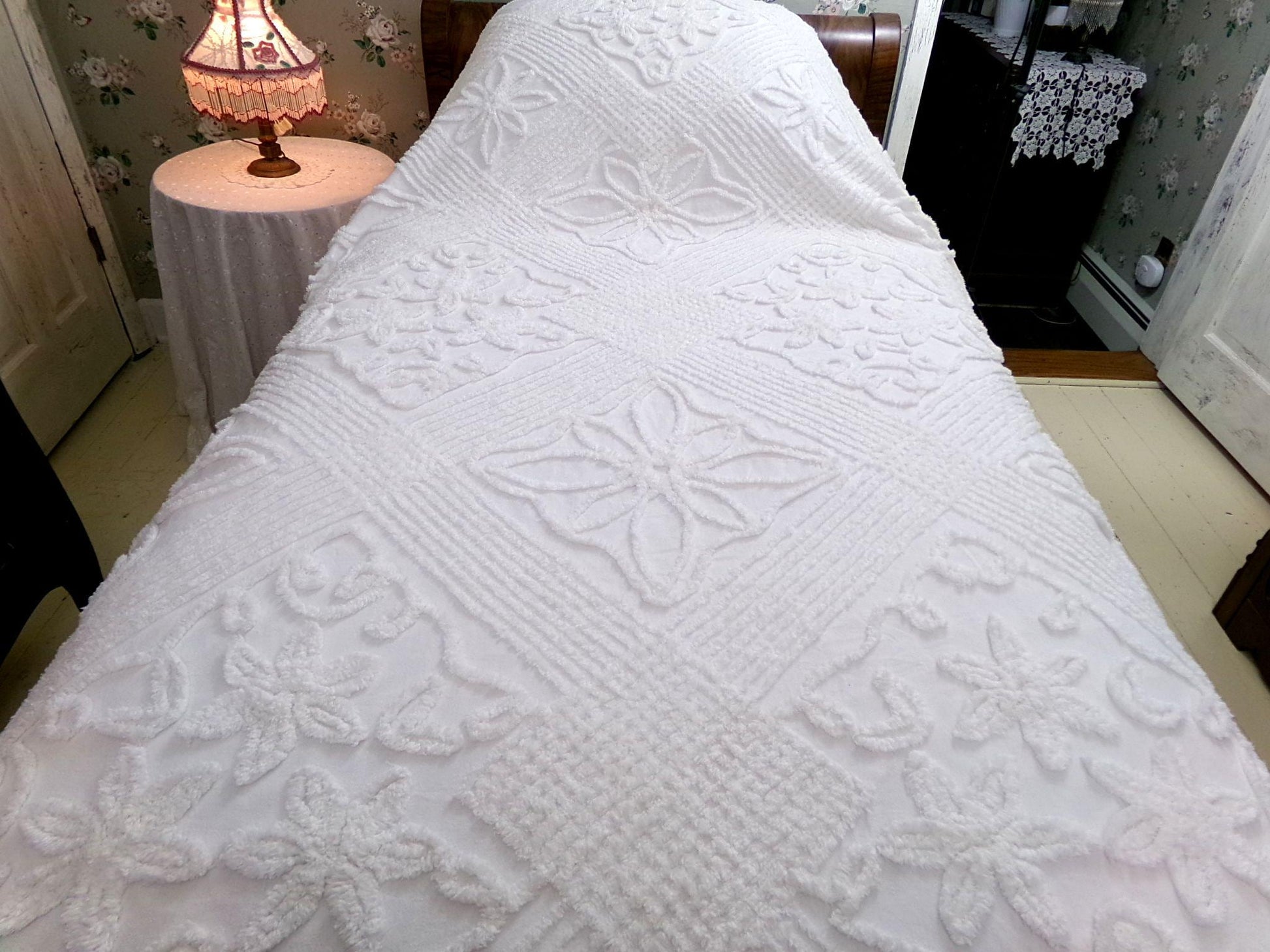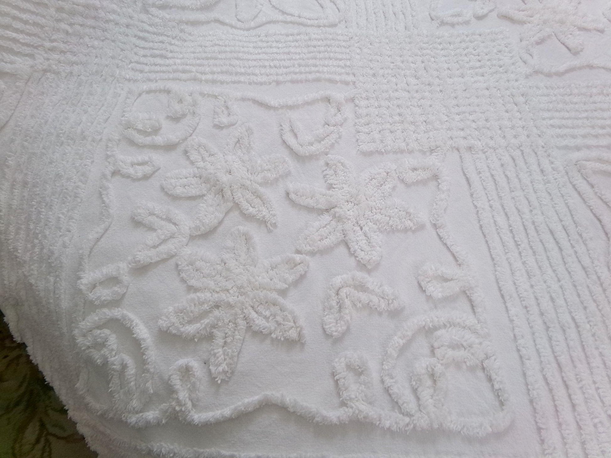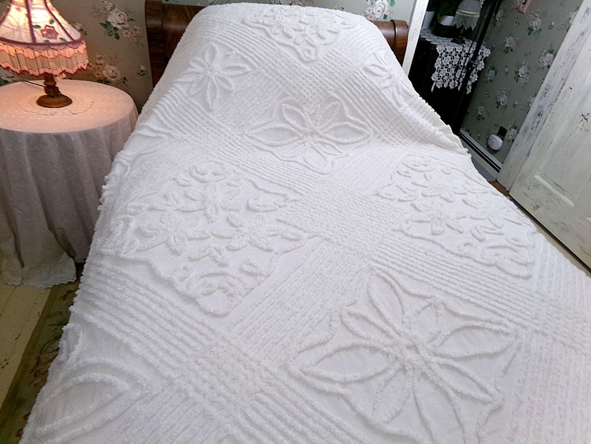 Looking for a simple yet graceful vintage chenille bedspread in a simple white color? You might like this pretty coverlet. This full size bedspread offers a white lily design with contrast geometrics for a striking presentation. A great choice for a summer spread, or layer over coordinating linens for a cottage chic look.No fringe. Square corners. 100% medium weight cotton. Versatile enough to work in a range of decor themes, from cozy vintage to minimal & modern.