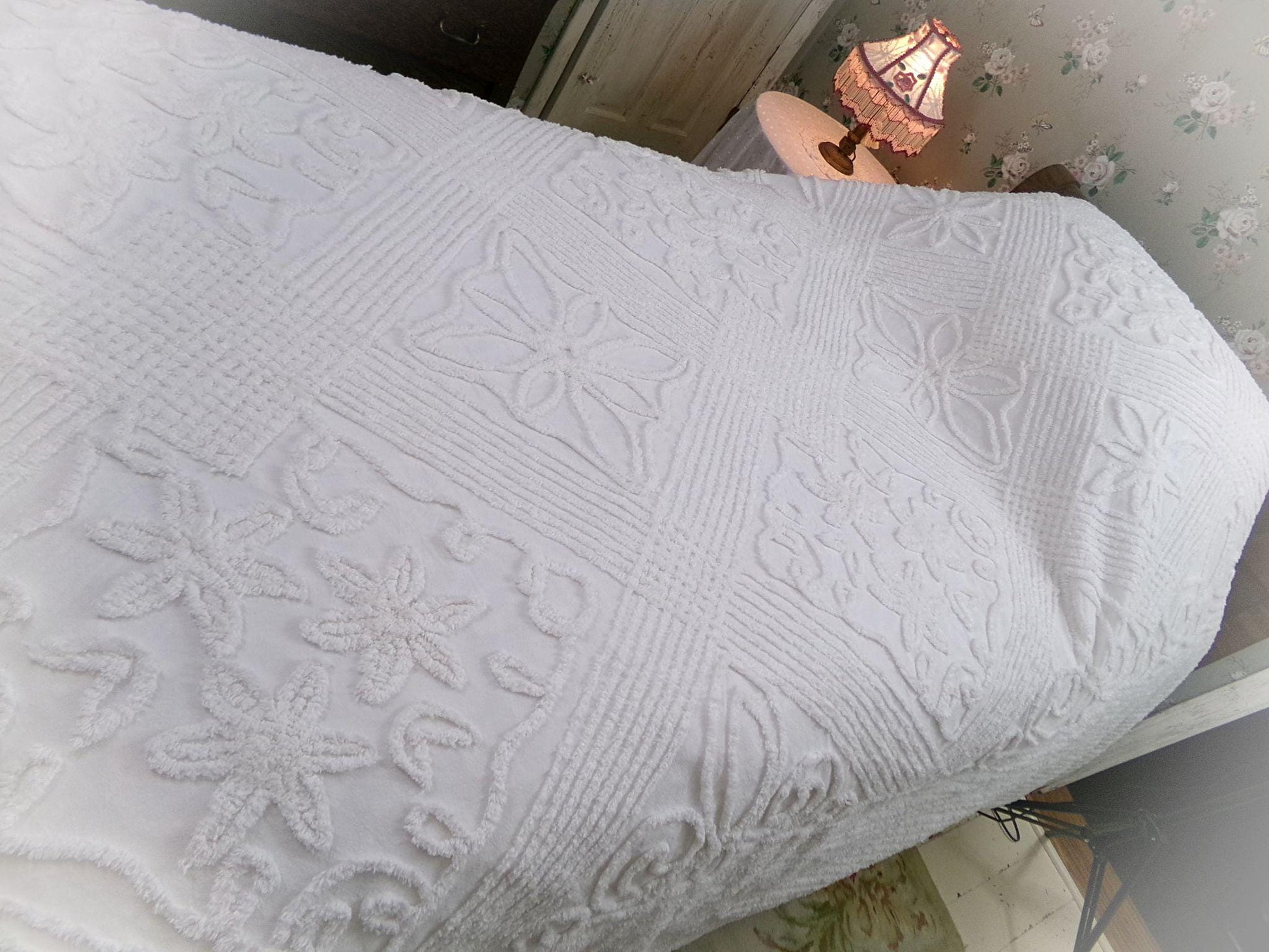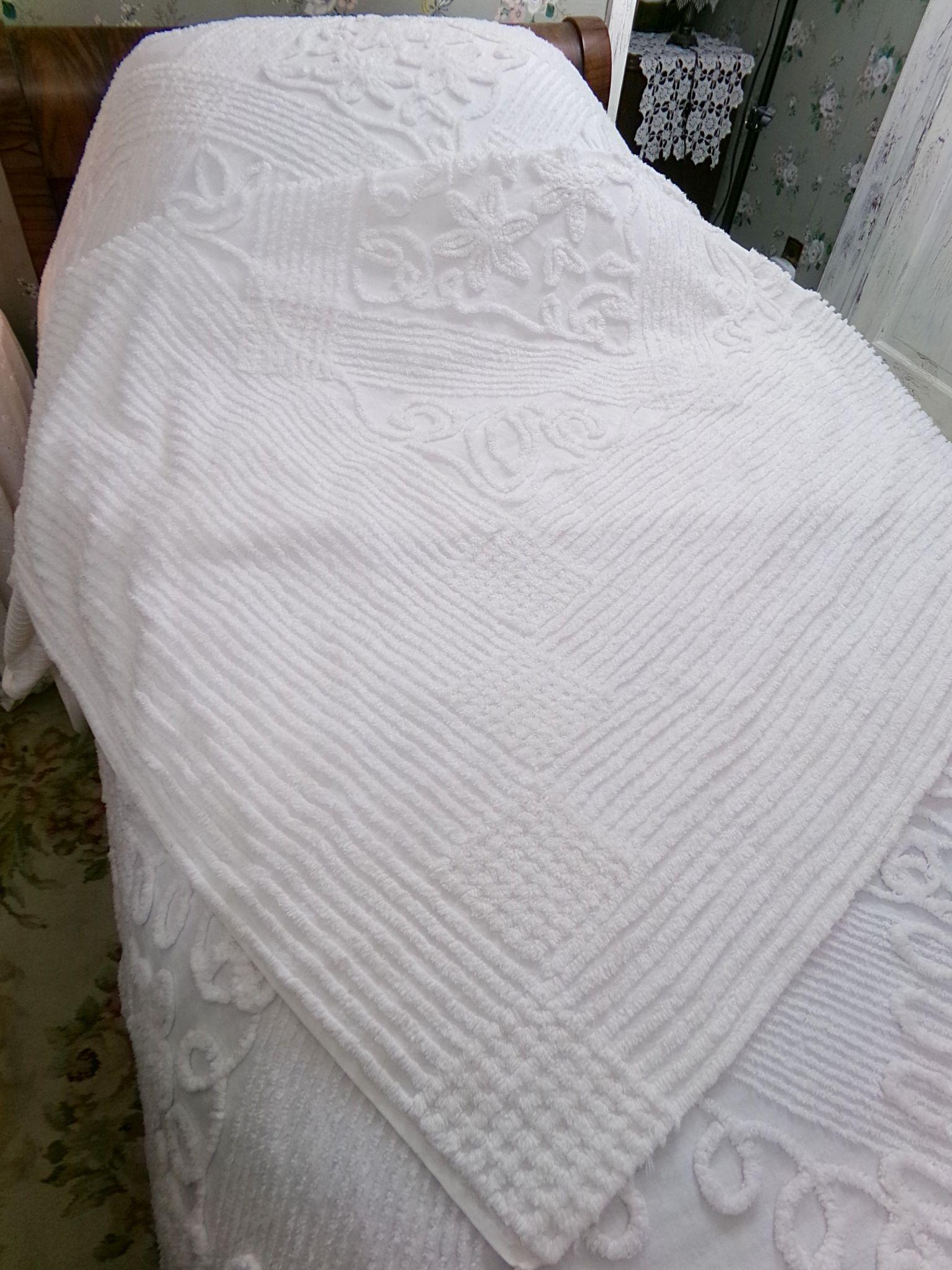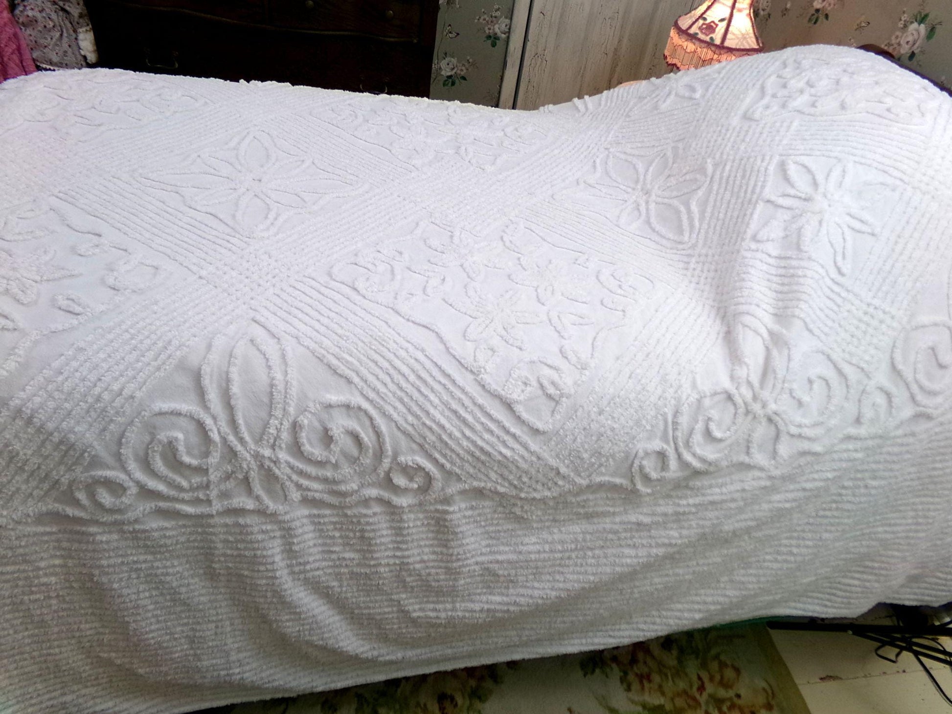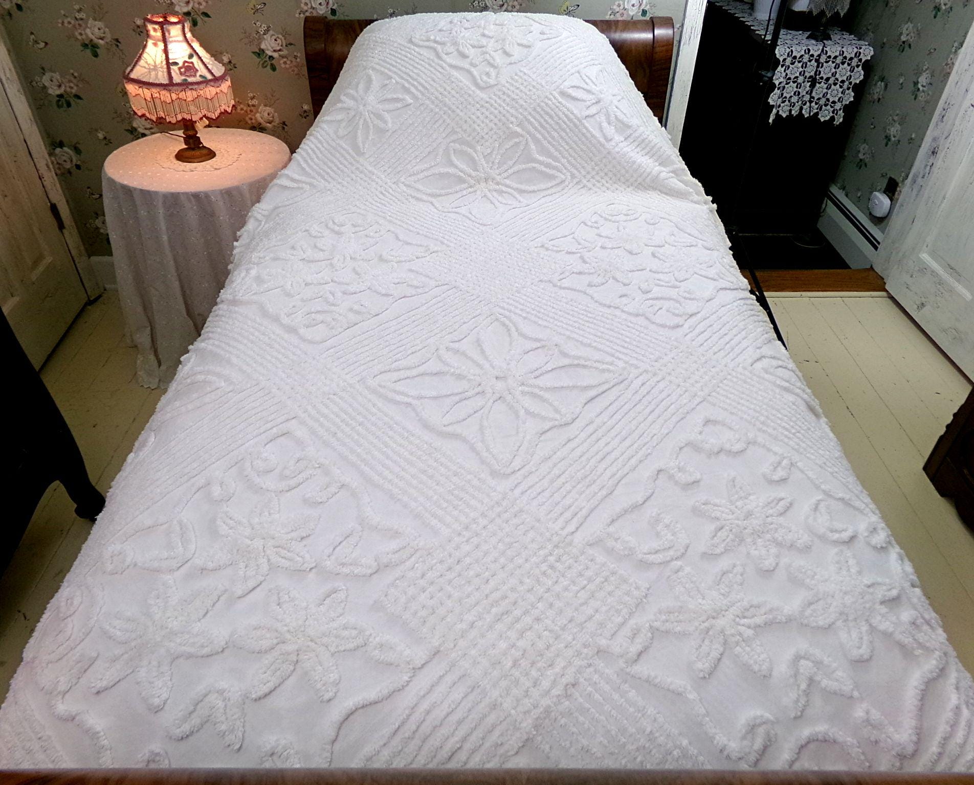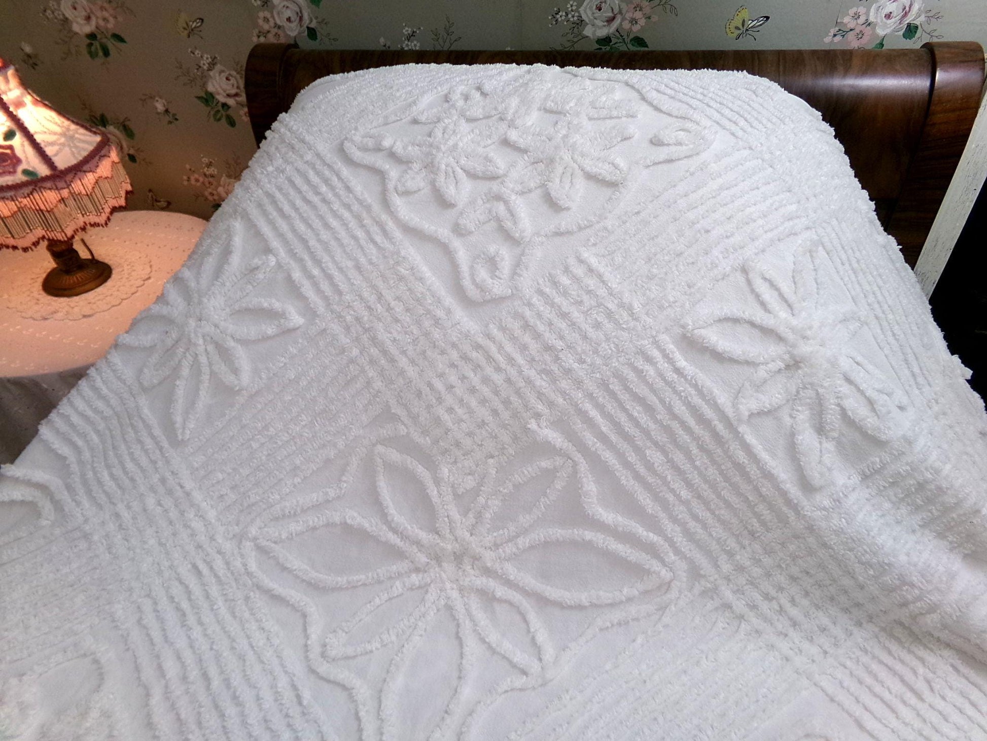 Looking for a simple yet graceful vintage chenille bedspread in a simple white color? You might like this pretty coverlet. This full size bedspread offers a white lily design with contrast geometrics for a striking presentation. A great choice for a summer spread, or layer over coordinating linens for a cottage chic look.No fringe. Square corners. 100% medium weight cotton. Versatile enough to work in a range of decor themes, from cozy vintage to minimal & modern.