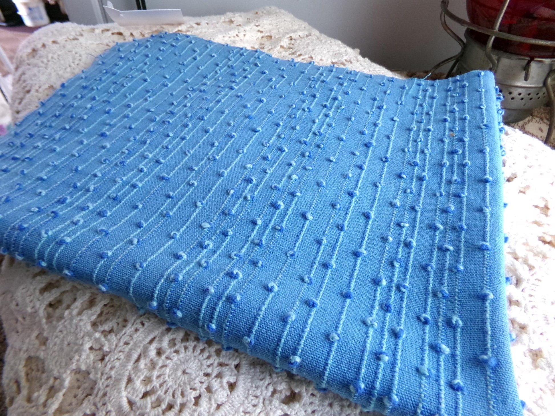 Bring a delicate texture - and a pop of bold color - to your project with this very unique fabric piece. The groundcloth is a medium weight cotton woven, which is tufted with tiny marbleized chenille "dewdrops" or "raindrops," as the pattern is sometimes known.Approx 20" x 24" inch cut fabric piece. Color is very adaptive to light. Great nubby texture that offers a unique look because the dewdrops have such an interesting coloration to them (see closeups).
