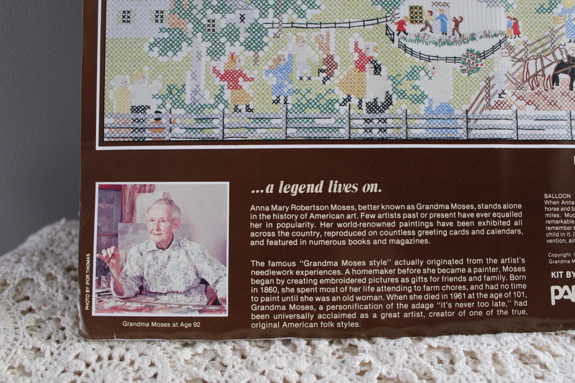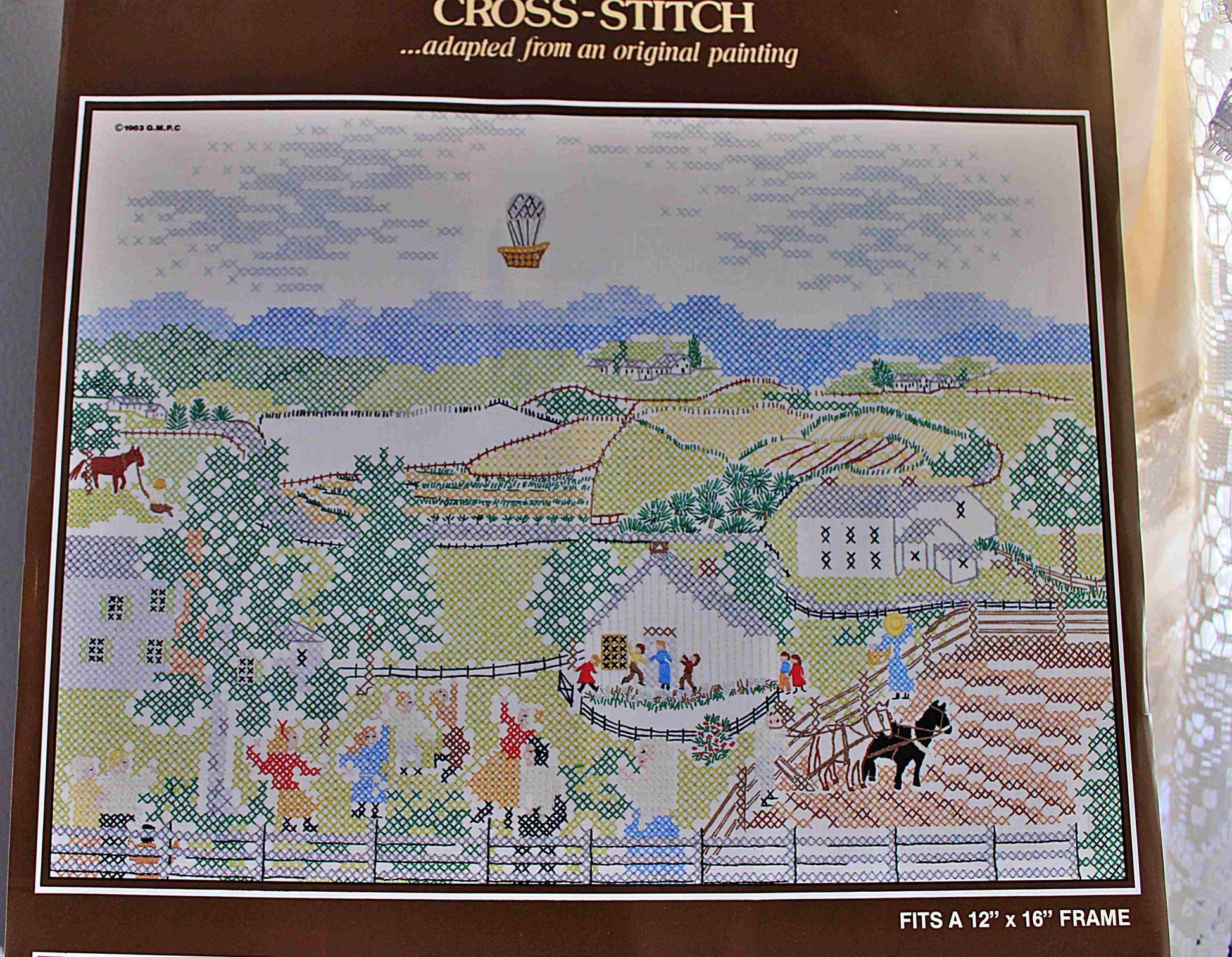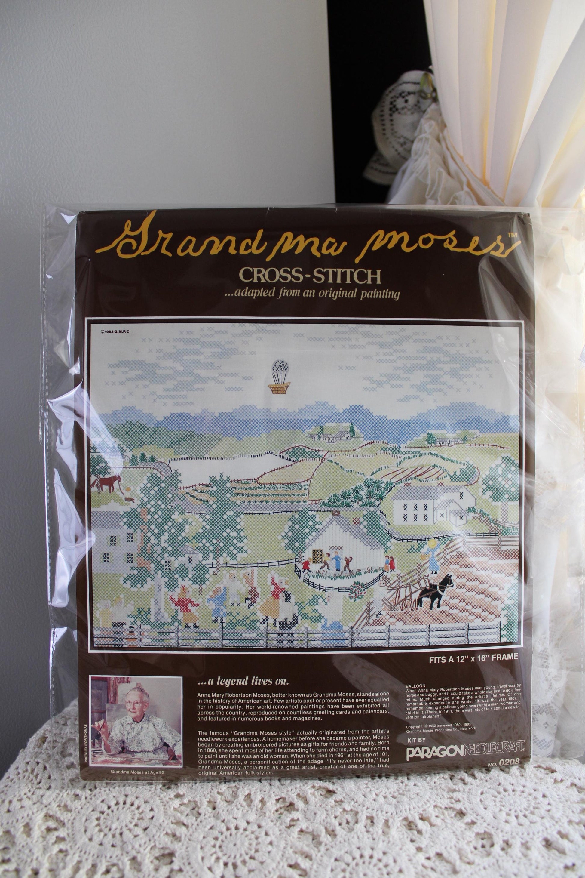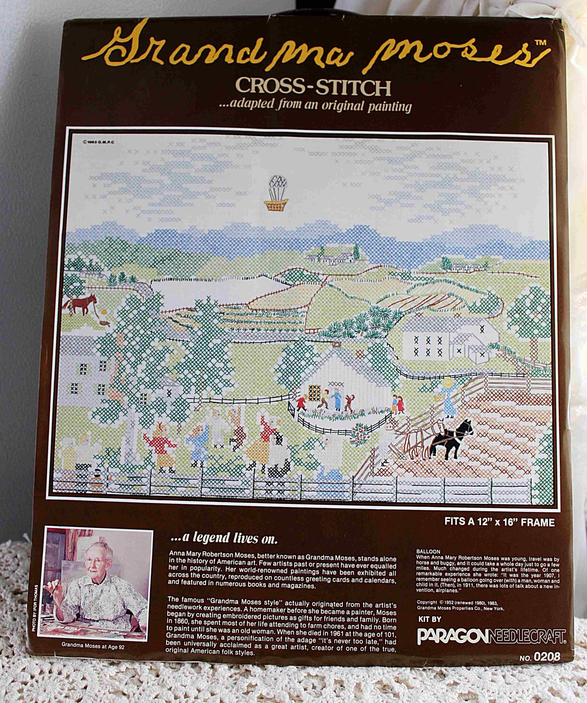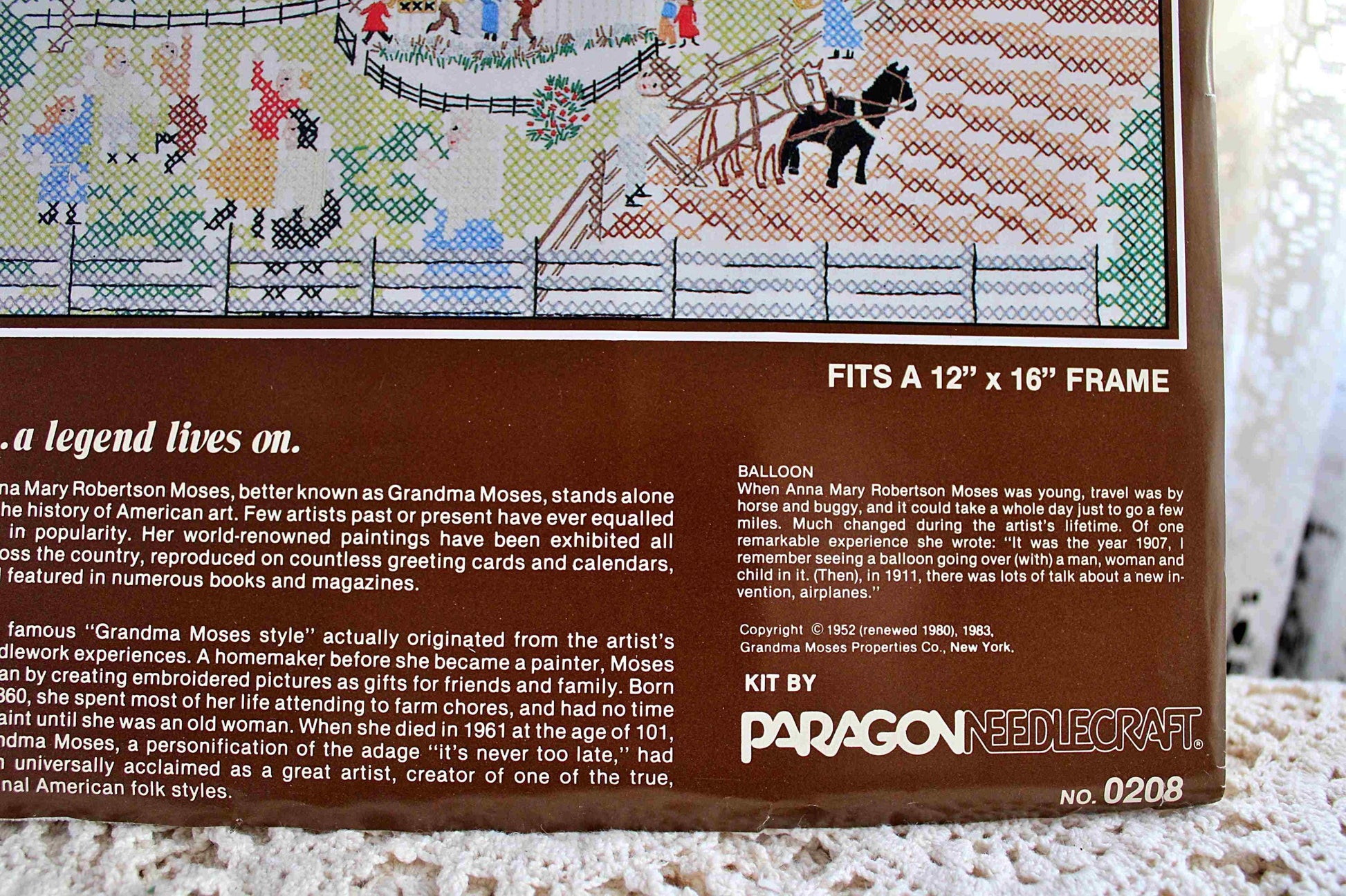 Adapted from a Grandma Moses "Balloon" painting, this Paragon Needlecraft Creative CROSS STITCH Stitchery Kit is ready to embroider. Paragon Kit #0208-Intended to fit a frame size of 12" x 16" inches. Frame not included.-Design copyright 1983