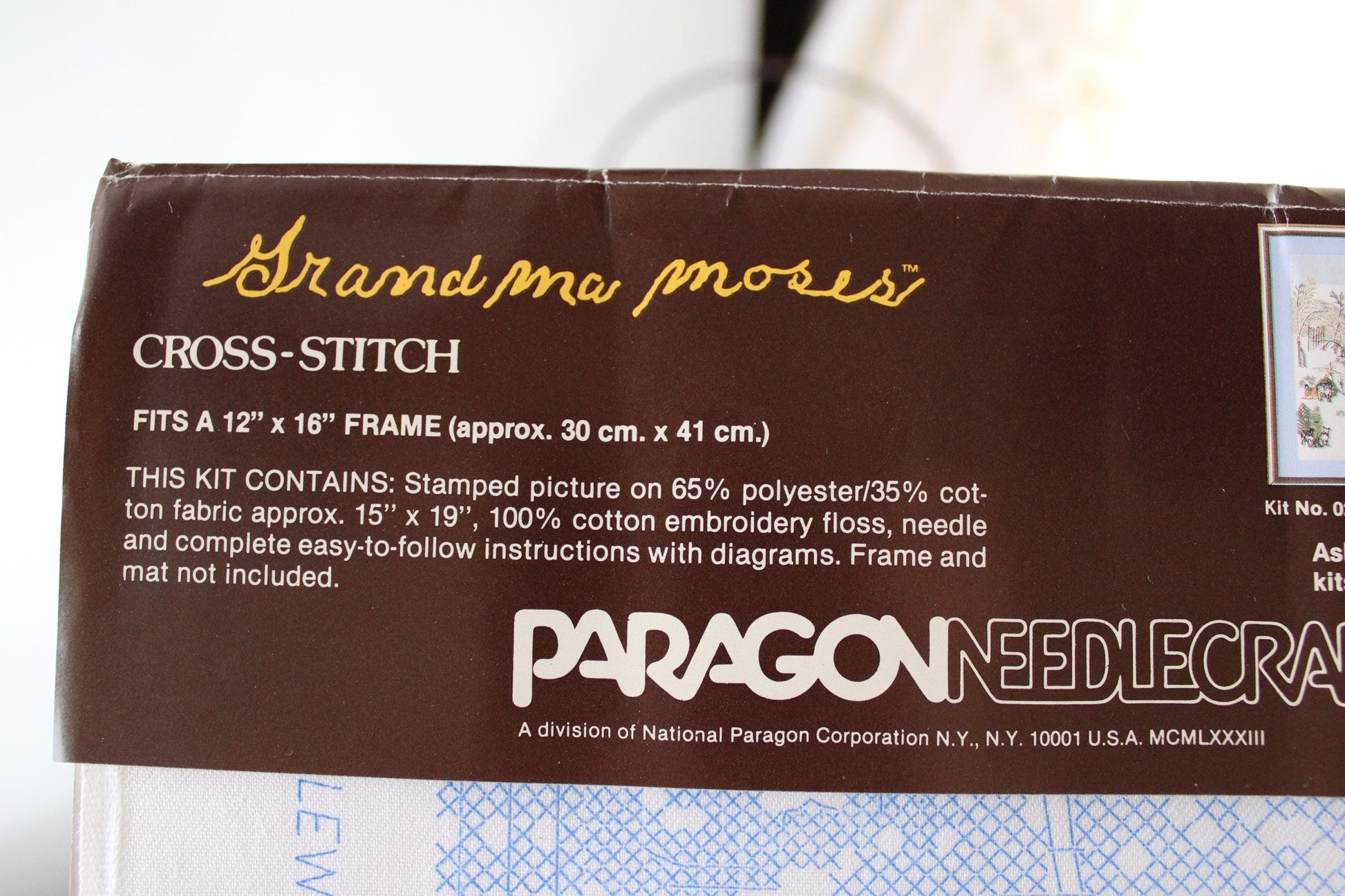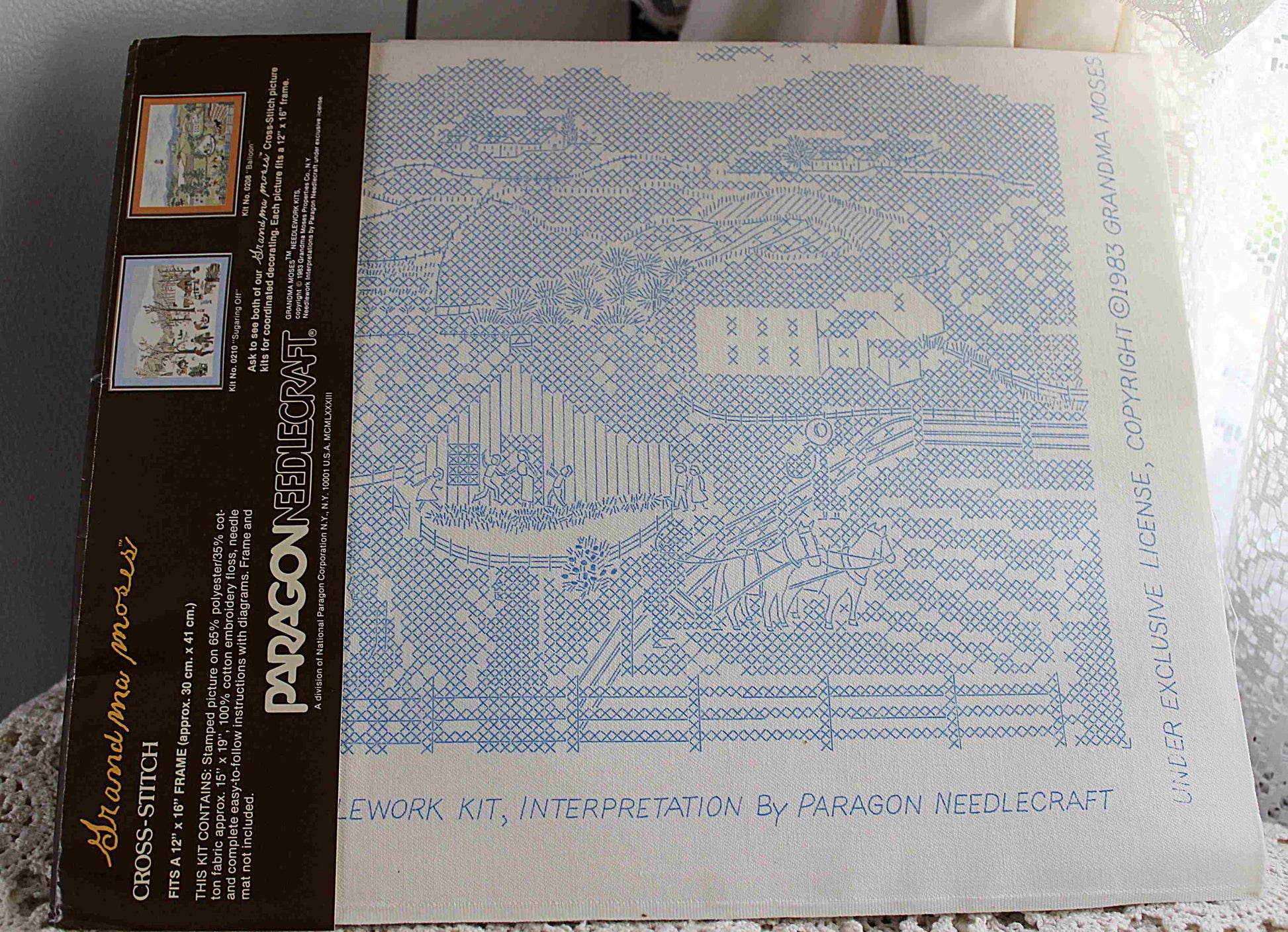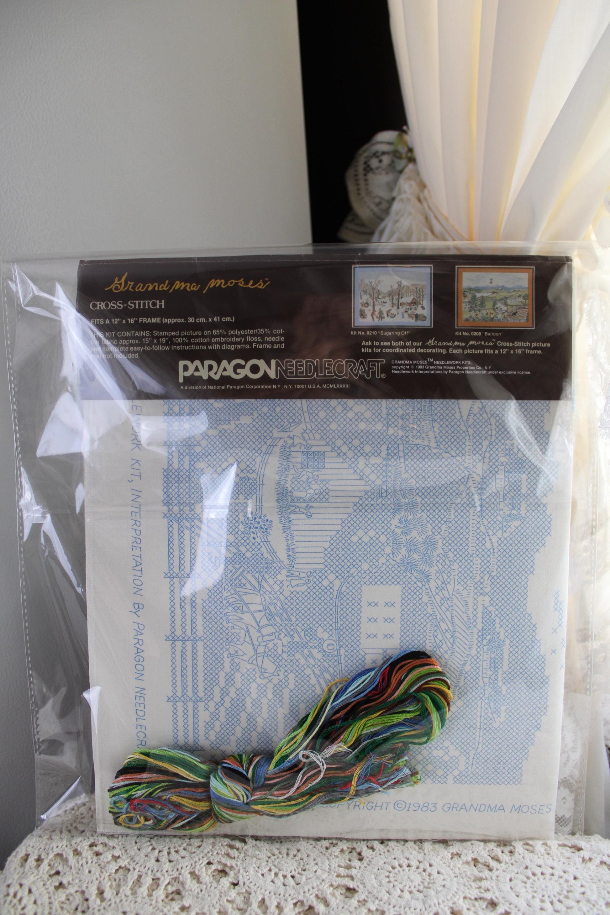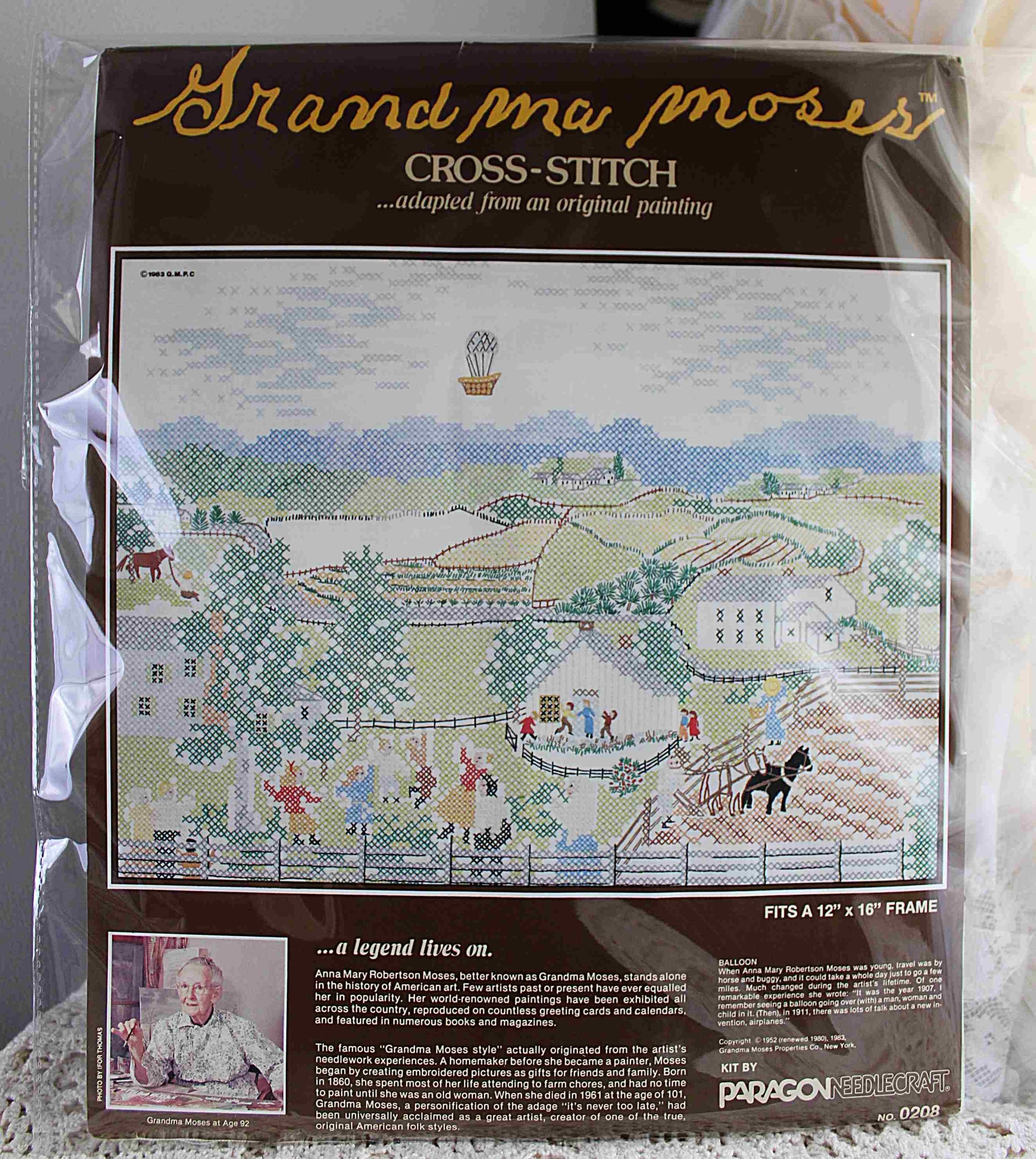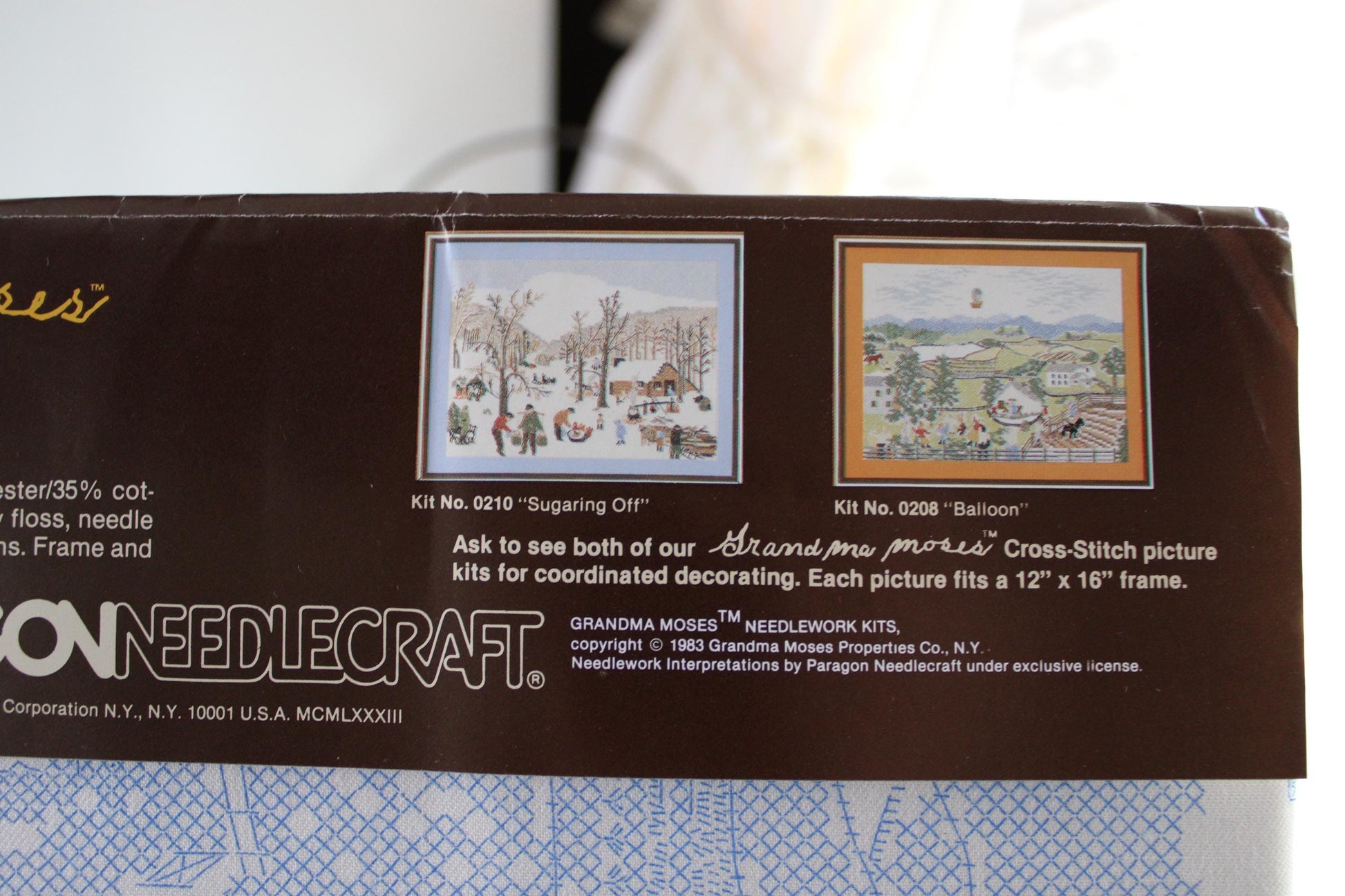 Adapted from a Grandma Moses "Balloon" painting, this Paragon Needlecraft Creative CROSS STITCH Stitchery Kit is ready to embroider. Paragon Kit #0208-Intended to fit a frame size of 12" x 16" inches. Frame not included.-Design copyright 1983