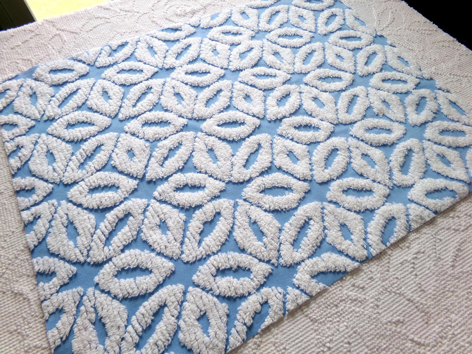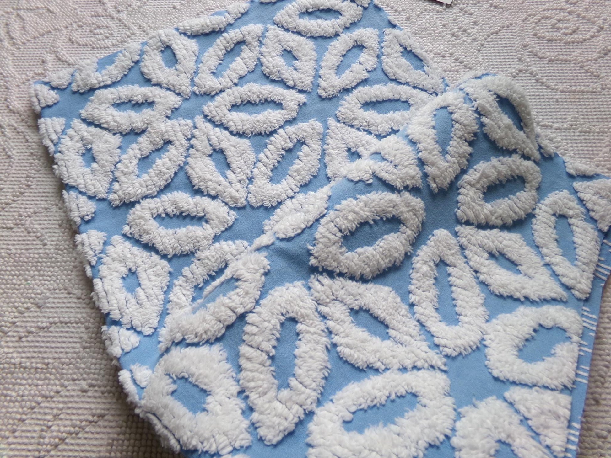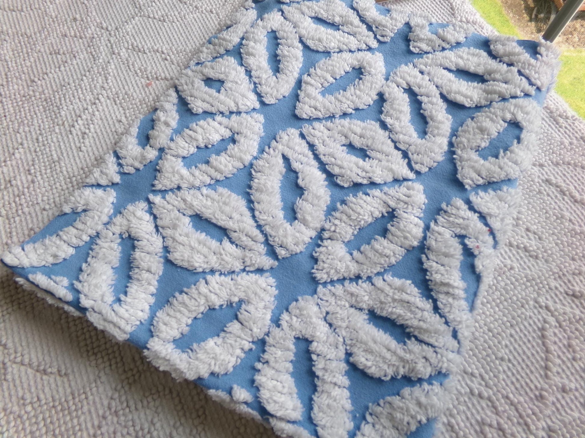 This versatile chenille fabric features simple white tufted daisies that form a geometric pattern on a sky blue bkgd. An excellent fabric choice for beach cottage style designs.100% cotton. Approx msmts: 18" x 24" inches. Shabby attributes may include a few minor pinholes, example in final img.