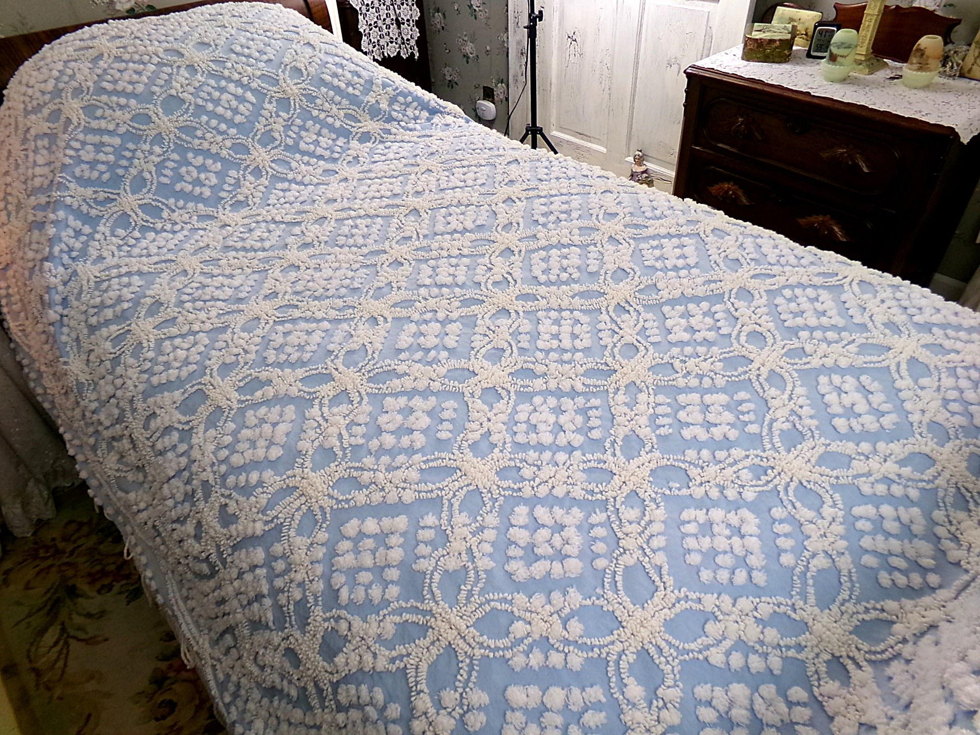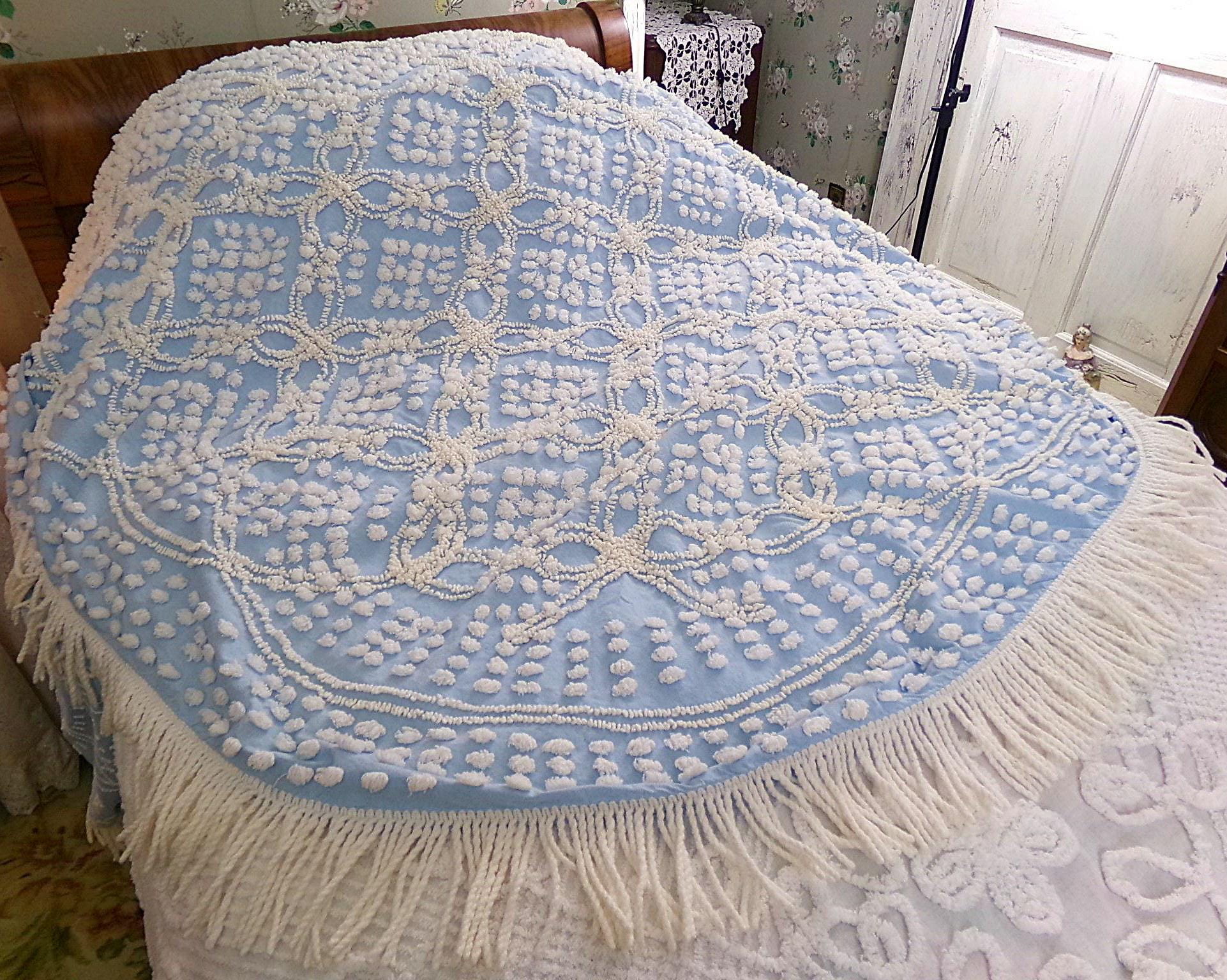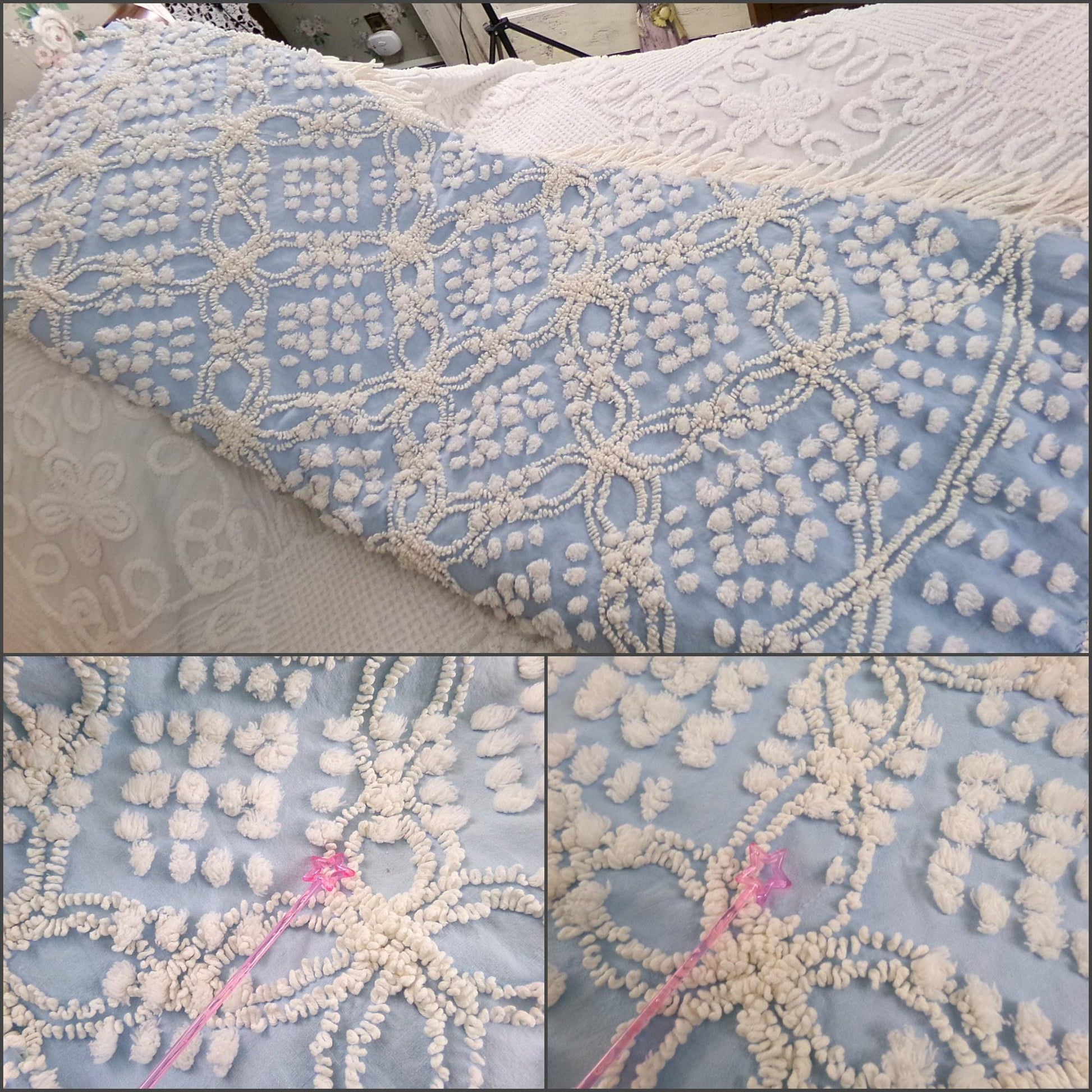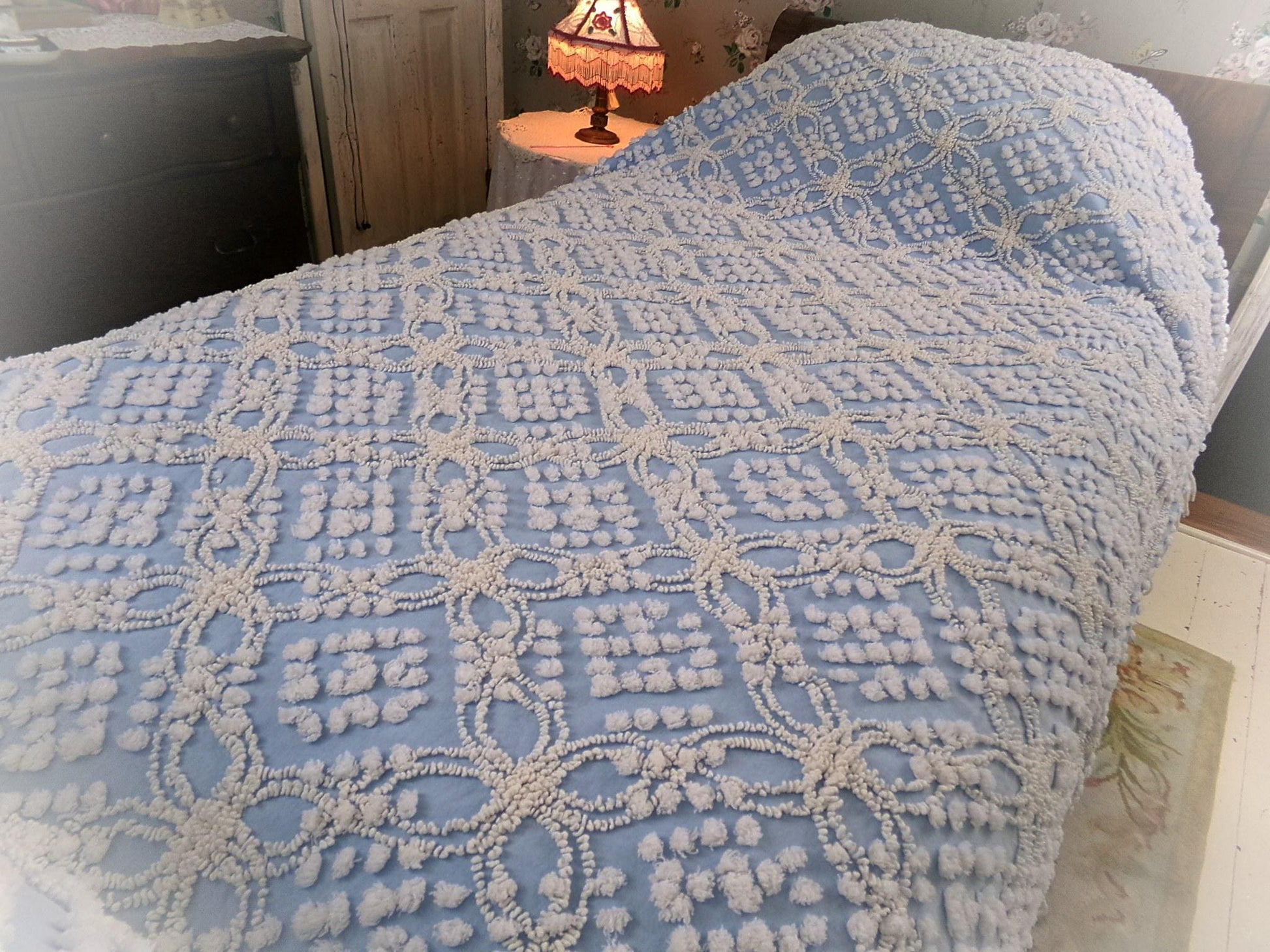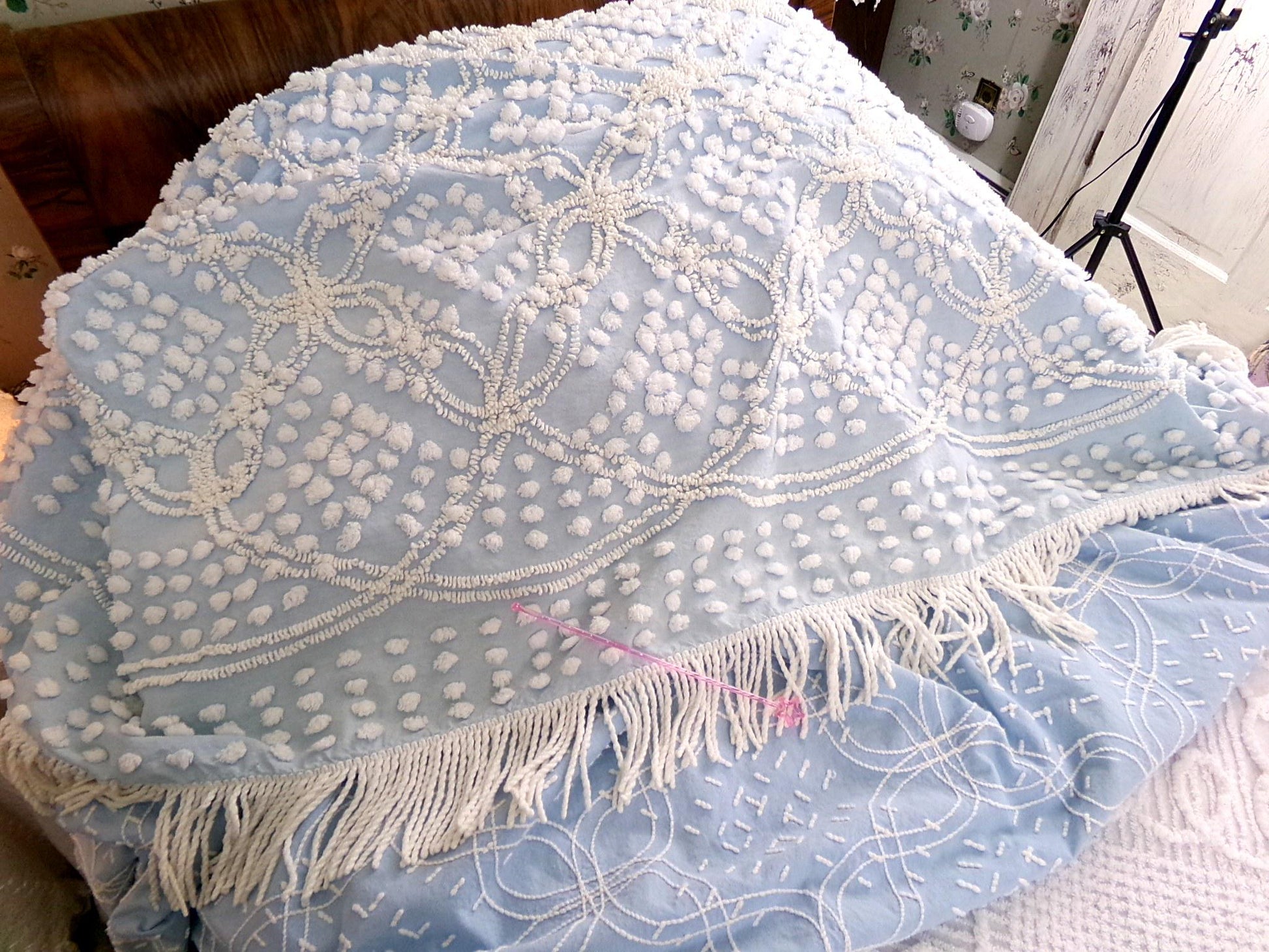 From the coast to the country, this lightweight twin size chenille bedspread brings effortless beachy style in a fresh shade of sky blue. Contrast cream and white tufted geometric designs are accented along the drop sides with quality creamy white accent fringe.Perfect for summers at the cottage or layered on your bed in winter. Twin size, approx 70" W x 100"L. Shabby attributes: skipped tufts, few marks and great gentle color variances, which I've tried to show in the final img since it's hard to see in the full shot photos. 💙