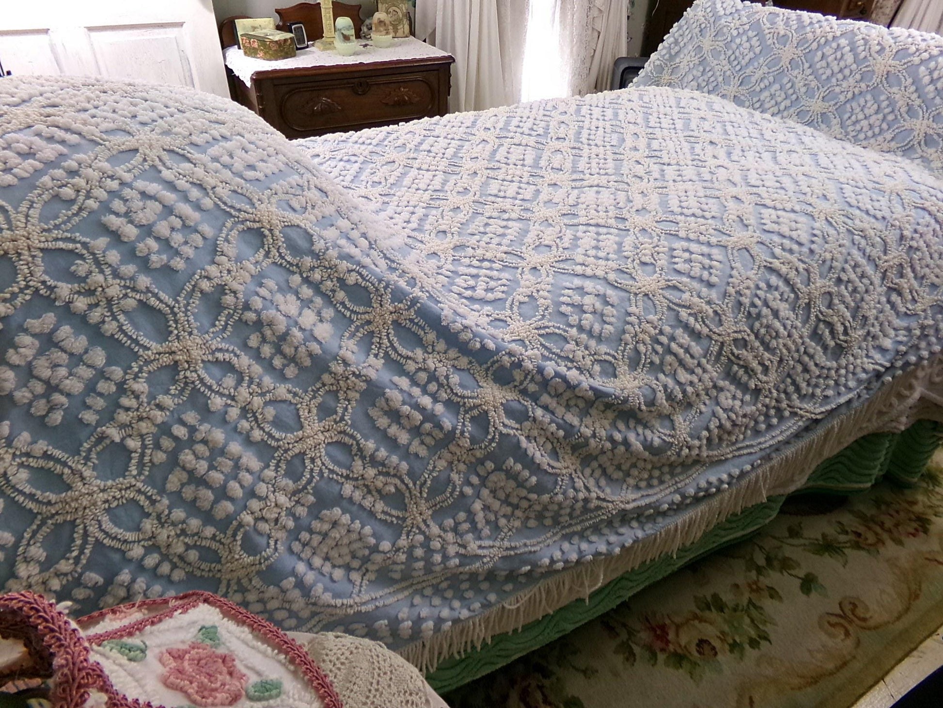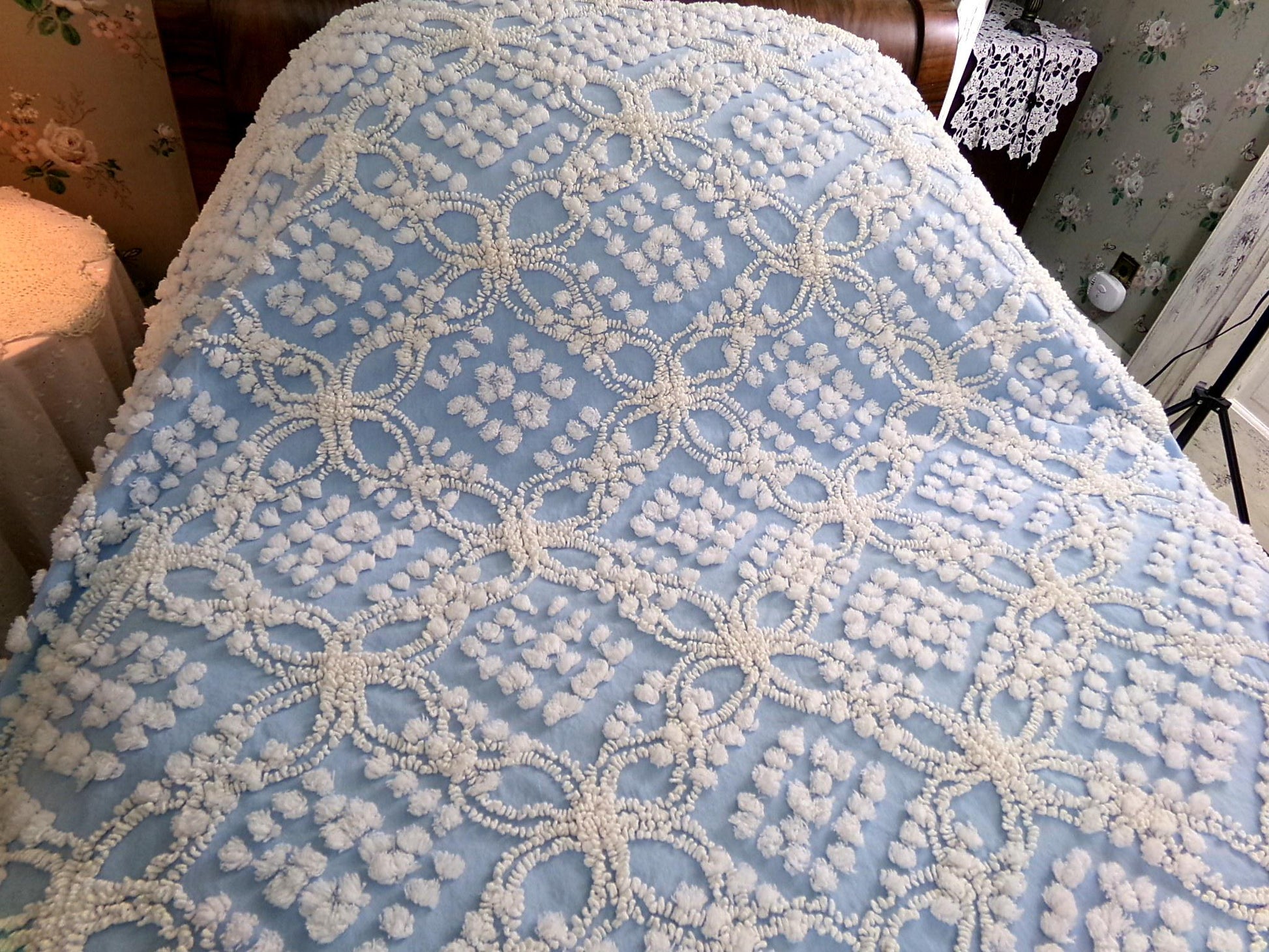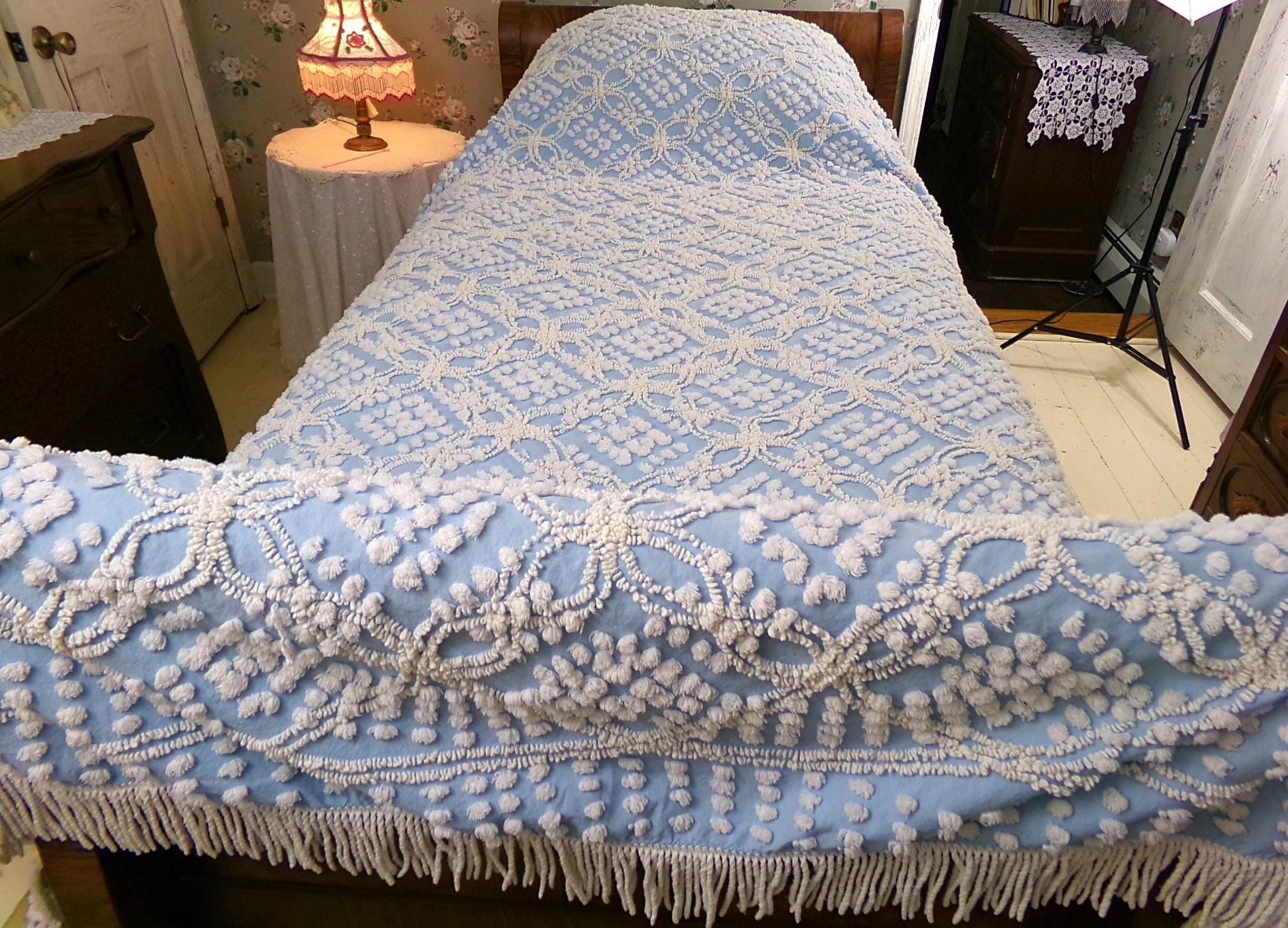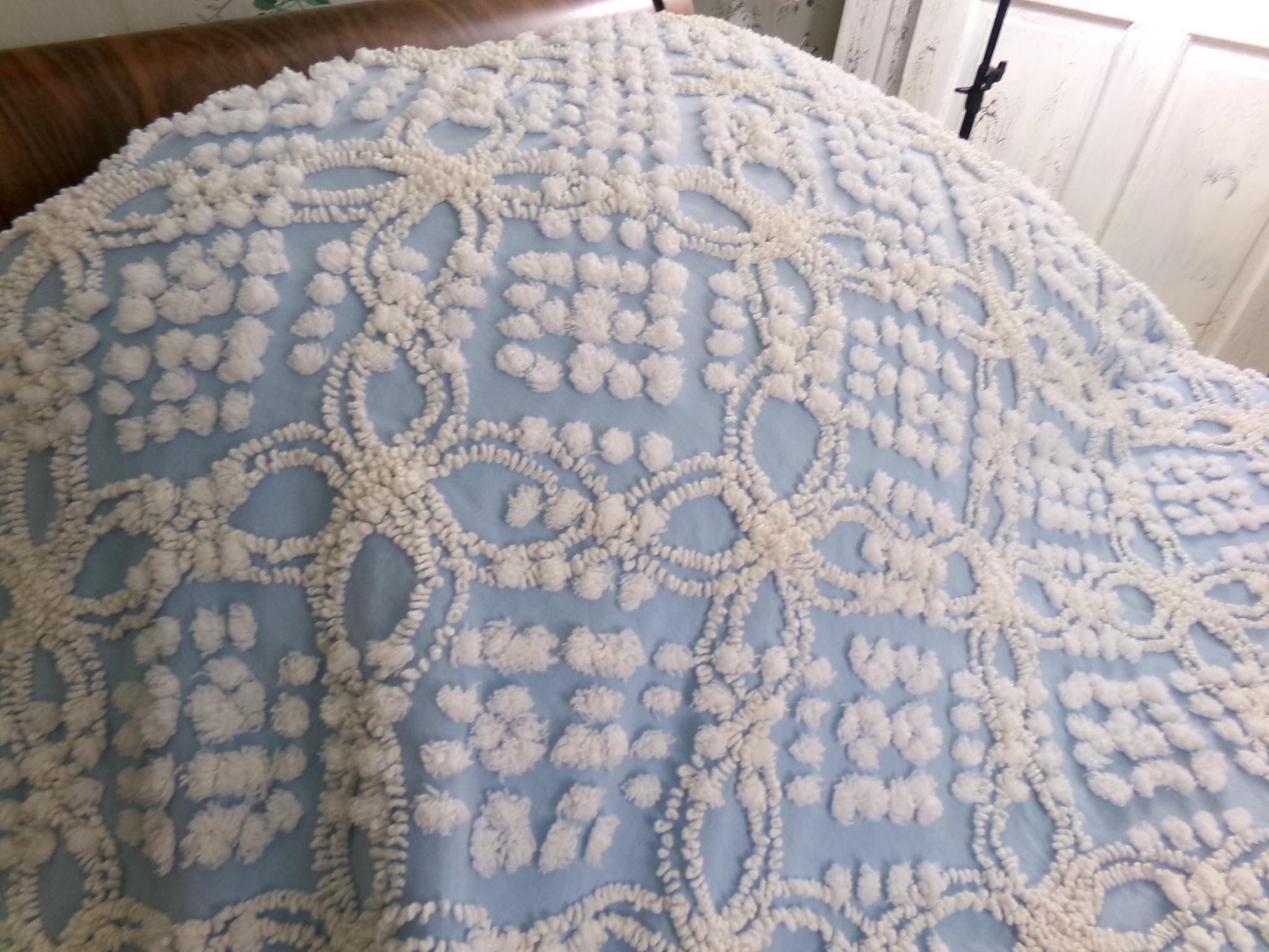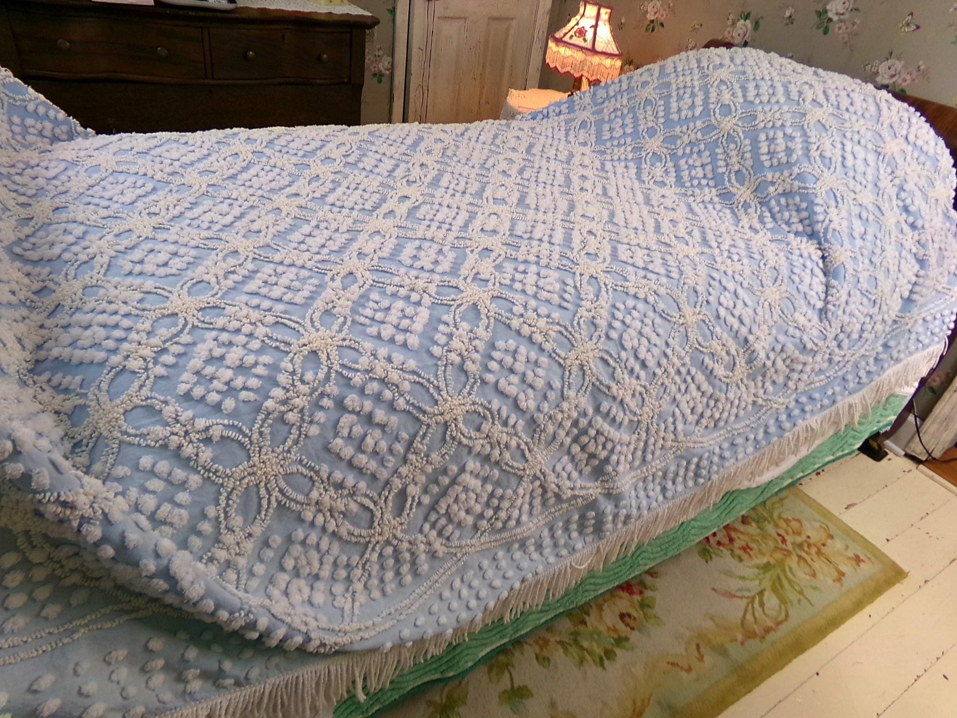 From the coast to the country, this lightweight twin size chenille bedspread brings effortless beachy style in a fresh shade of sky blue. Contrast cream and white tufted geometric designs are accented along the drop sides with quality creamy white accent fringe.Perfect for summers at the cottage or layered on your bed in winter. Twin size, approx 70" W x 100"L. Shabby attributes: skipped tufts, few marks and great gentle color variances, which I've tried to show in the final img since it's hard to see in the full shot photos. 💙