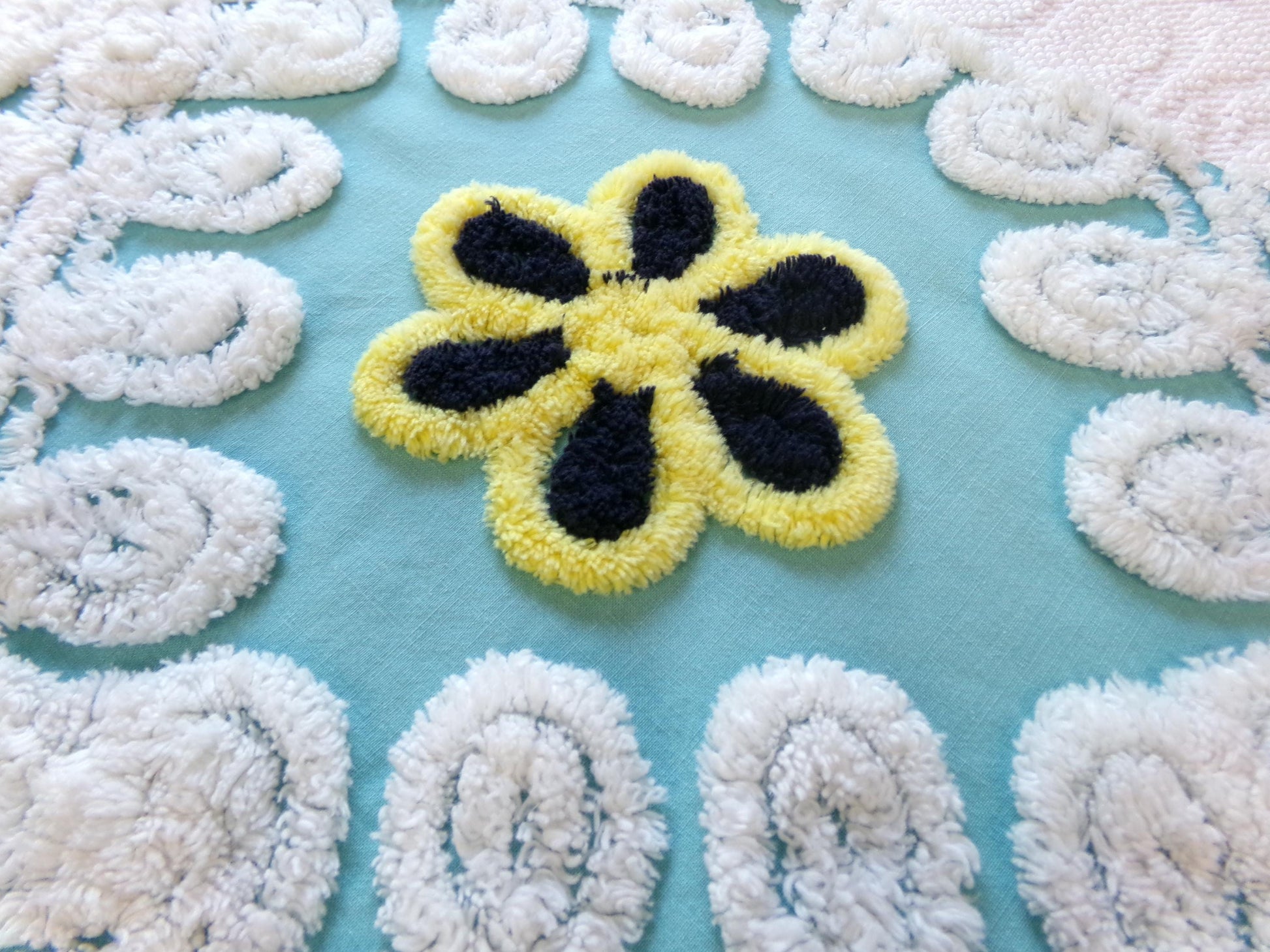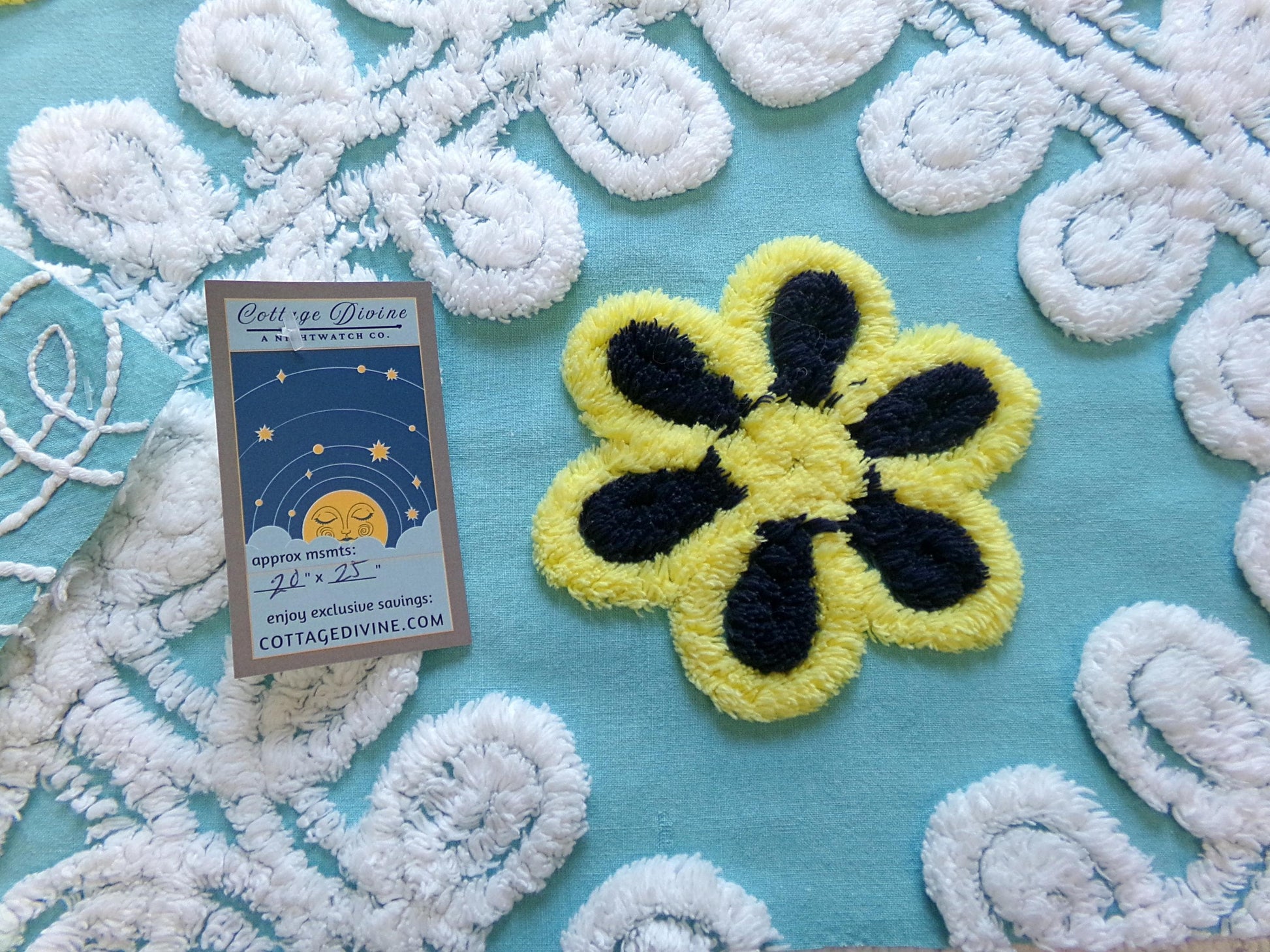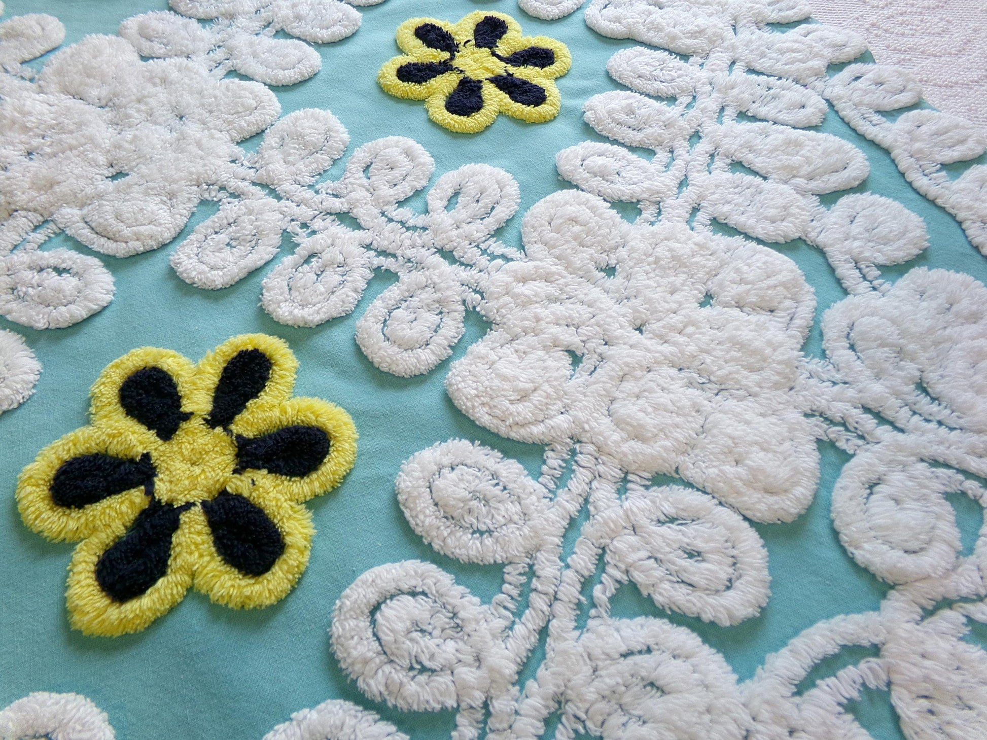 see more, cottagedivine.comDon't you just love the beachy colors on this piece of vintage chenille fabric? It features a plush display of frothy white curlicue swirls that highlight very unique flowers in sunny yellow & deep dark navy (or black, depending on your color perception).