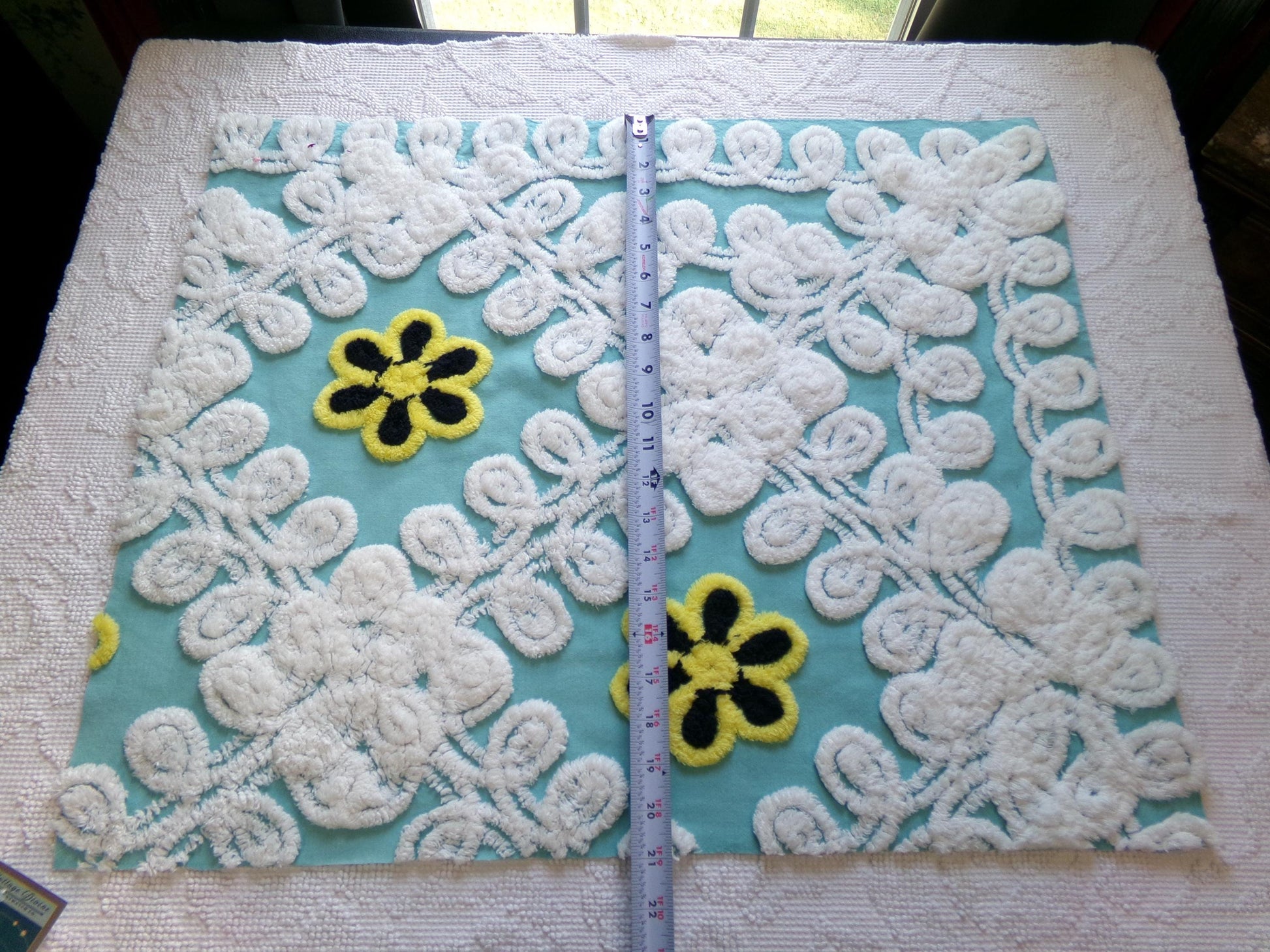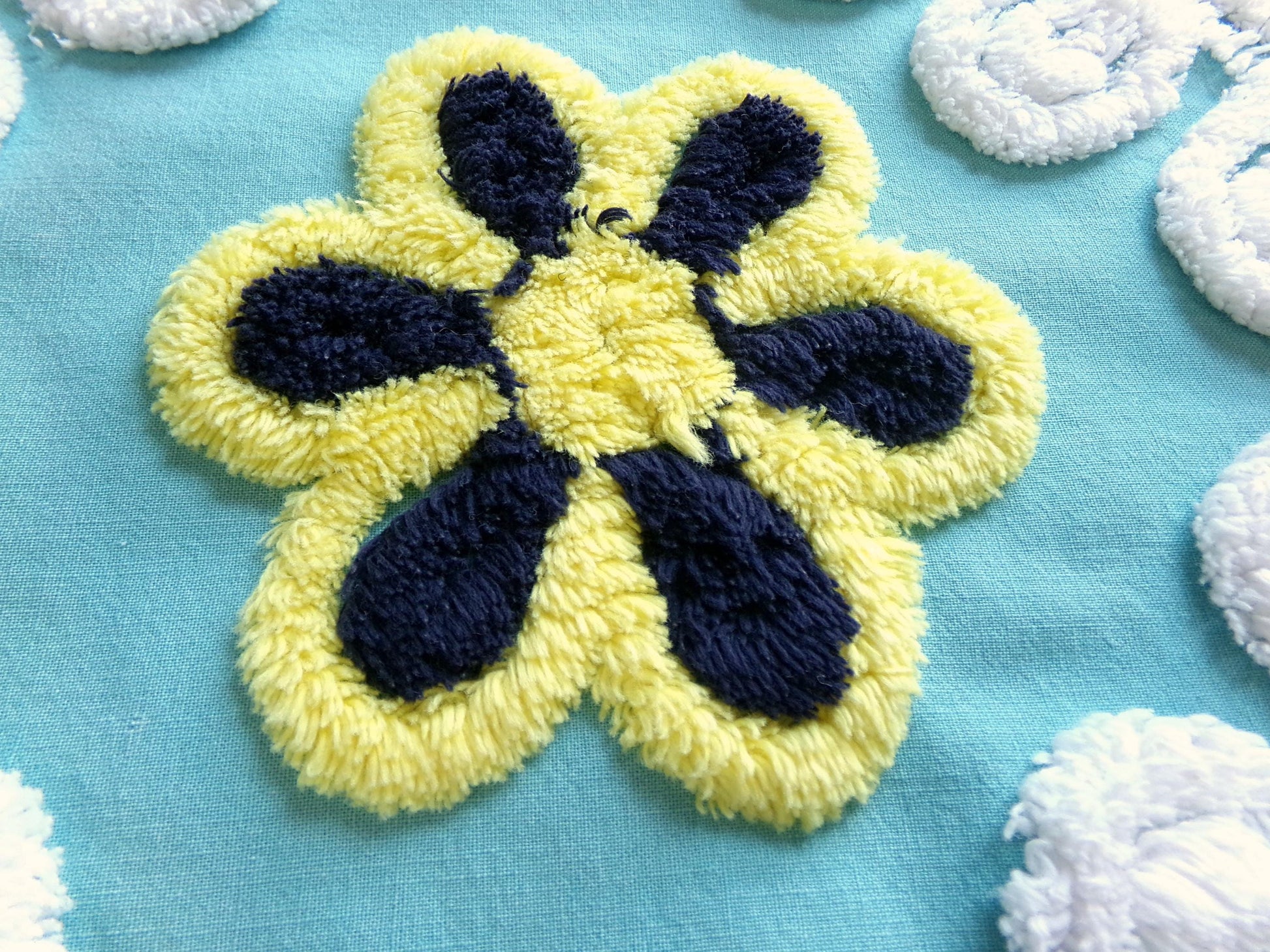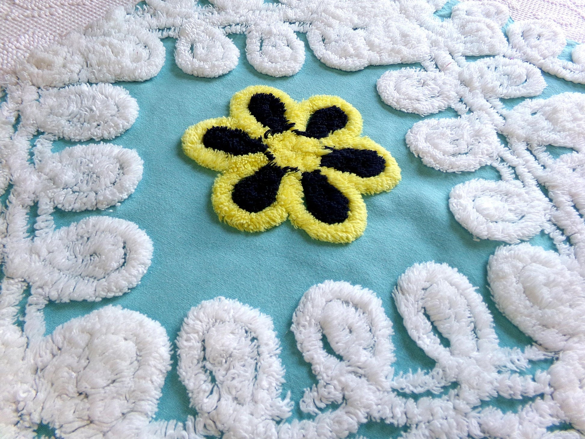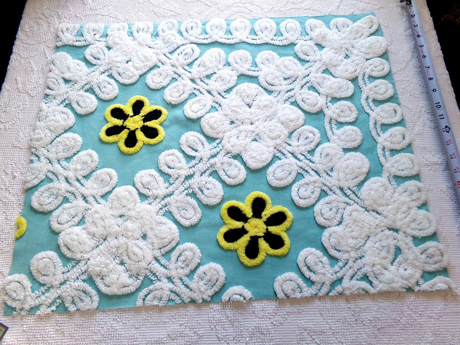 see more, cottagedivine.comDon't you just love the beachy colors on this piece of vintage chenille fabric? It features a plush display of frothy white curlicue swirls that highlight very unique flowers in sunny yellow & deep dark navy (or black, depending on your color perception).