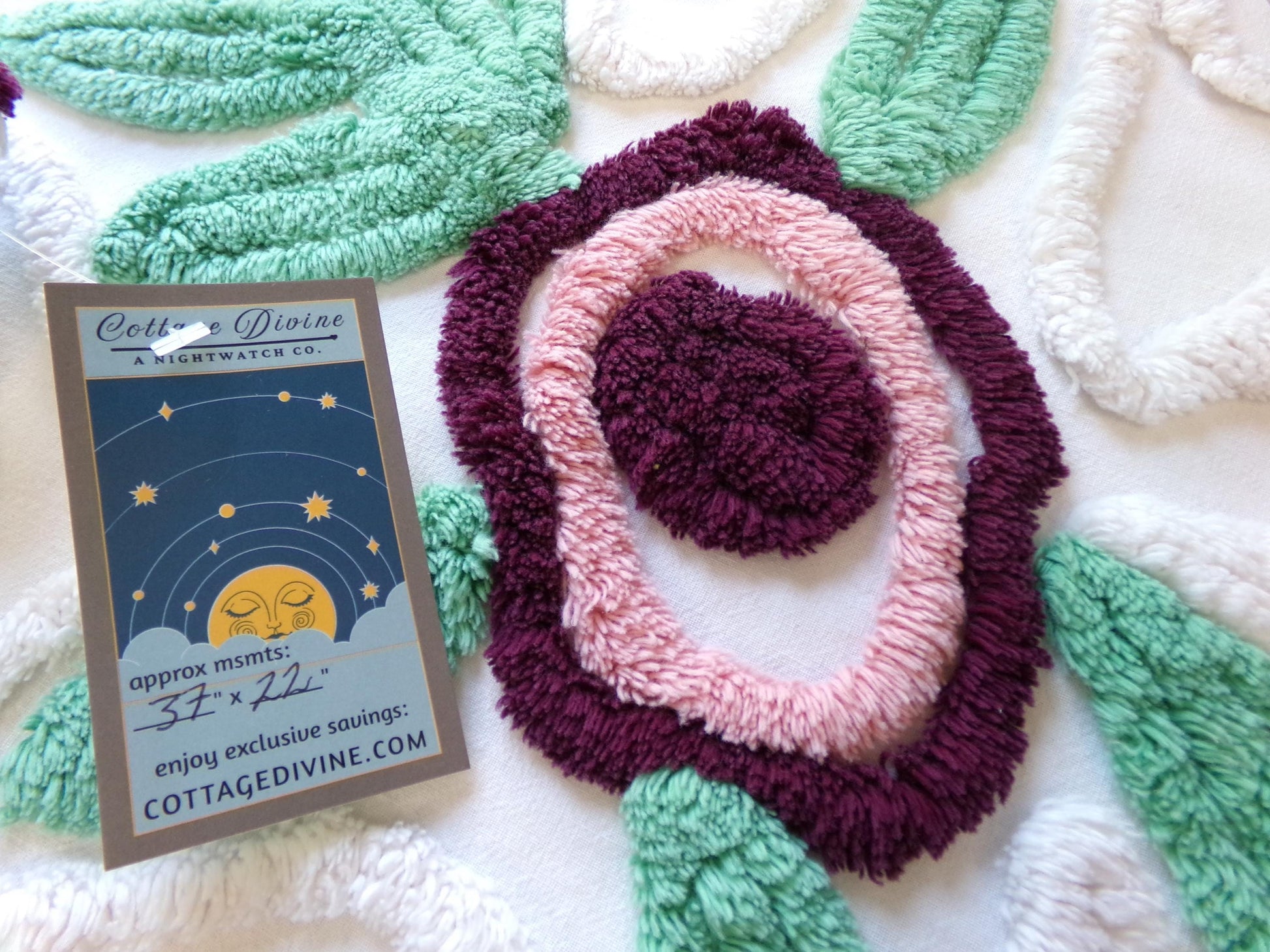 see more, cottagedivine.comThis vintage chenille fabric makes a dramatic appearance, with two berry - mauve pink floral blooms situated in plush white swirls. So pretty.