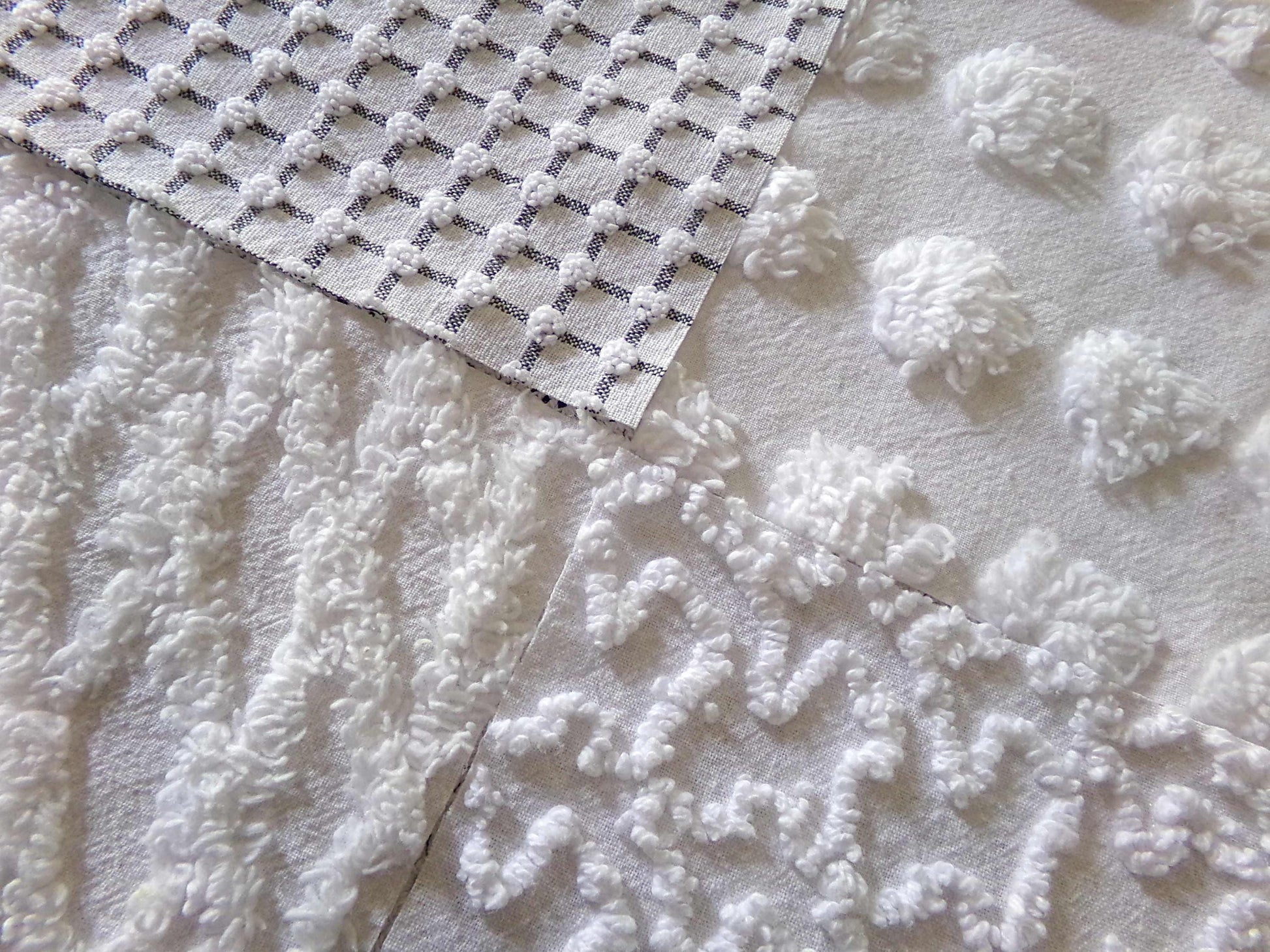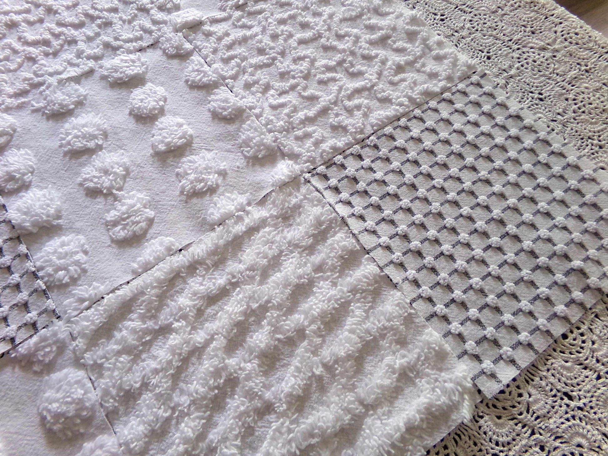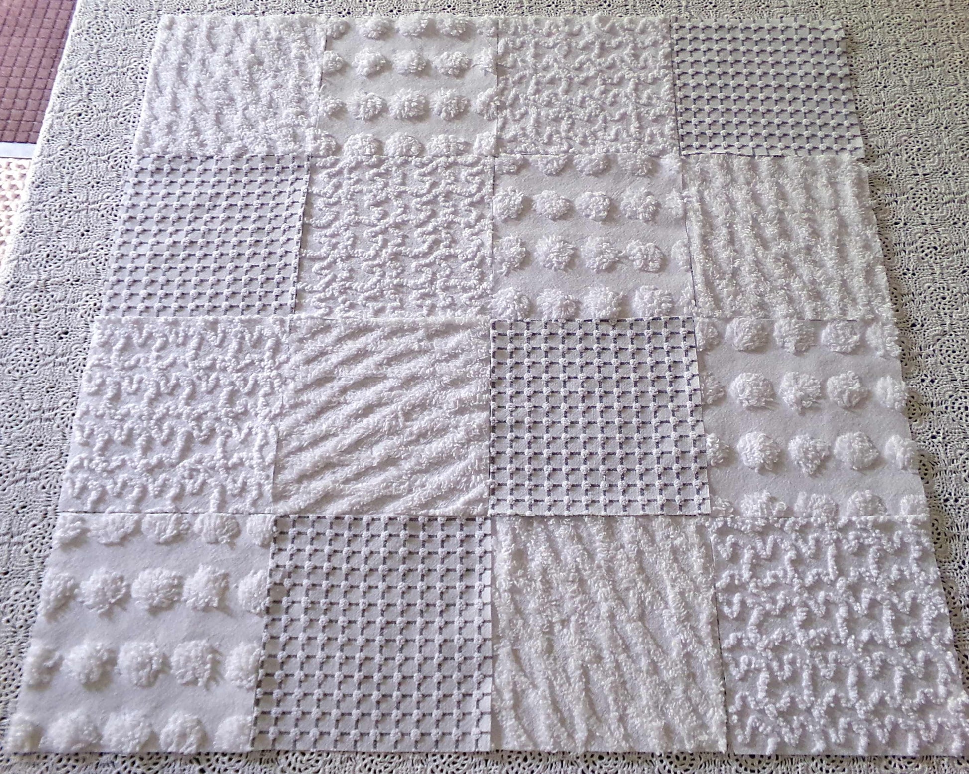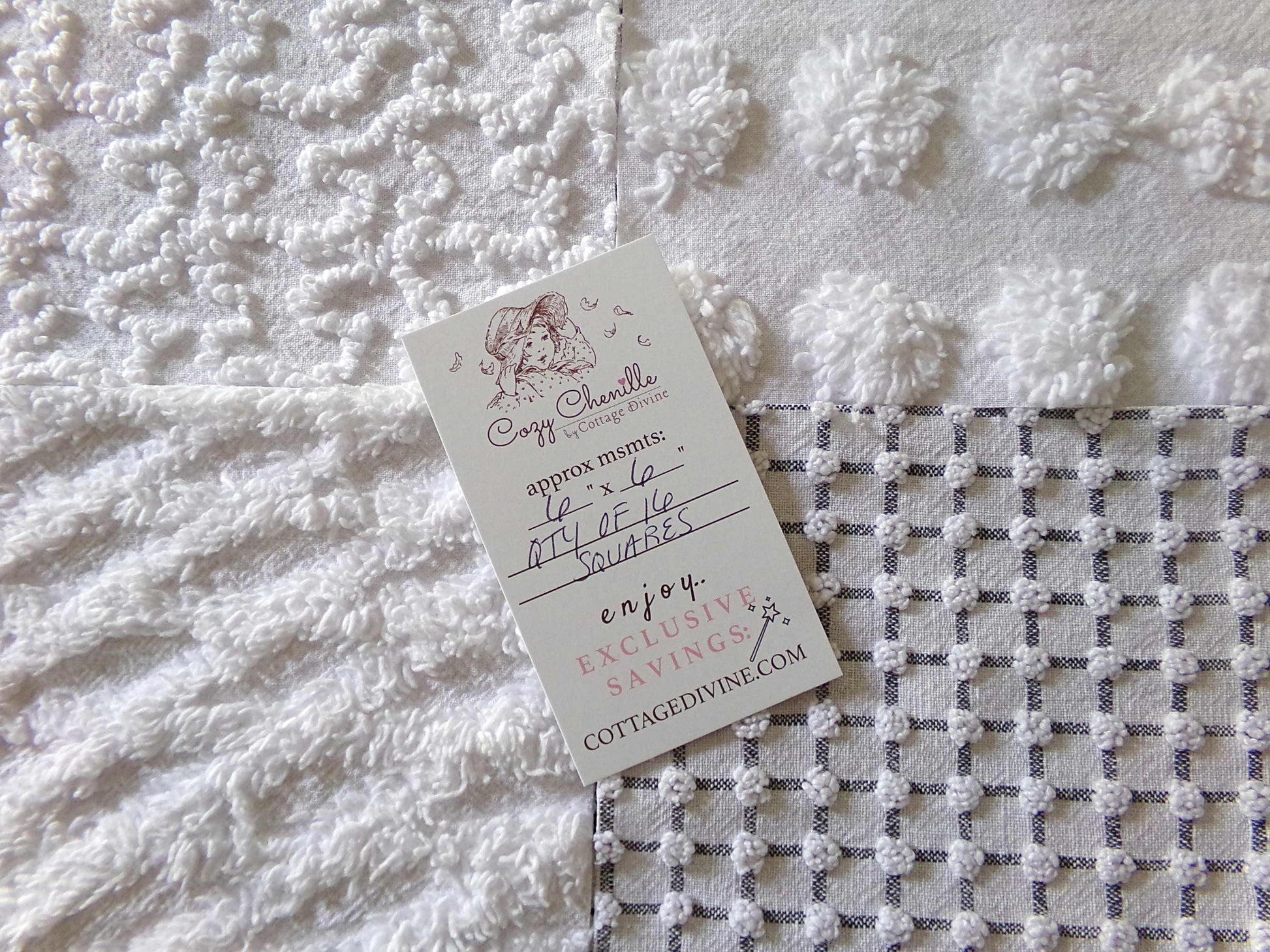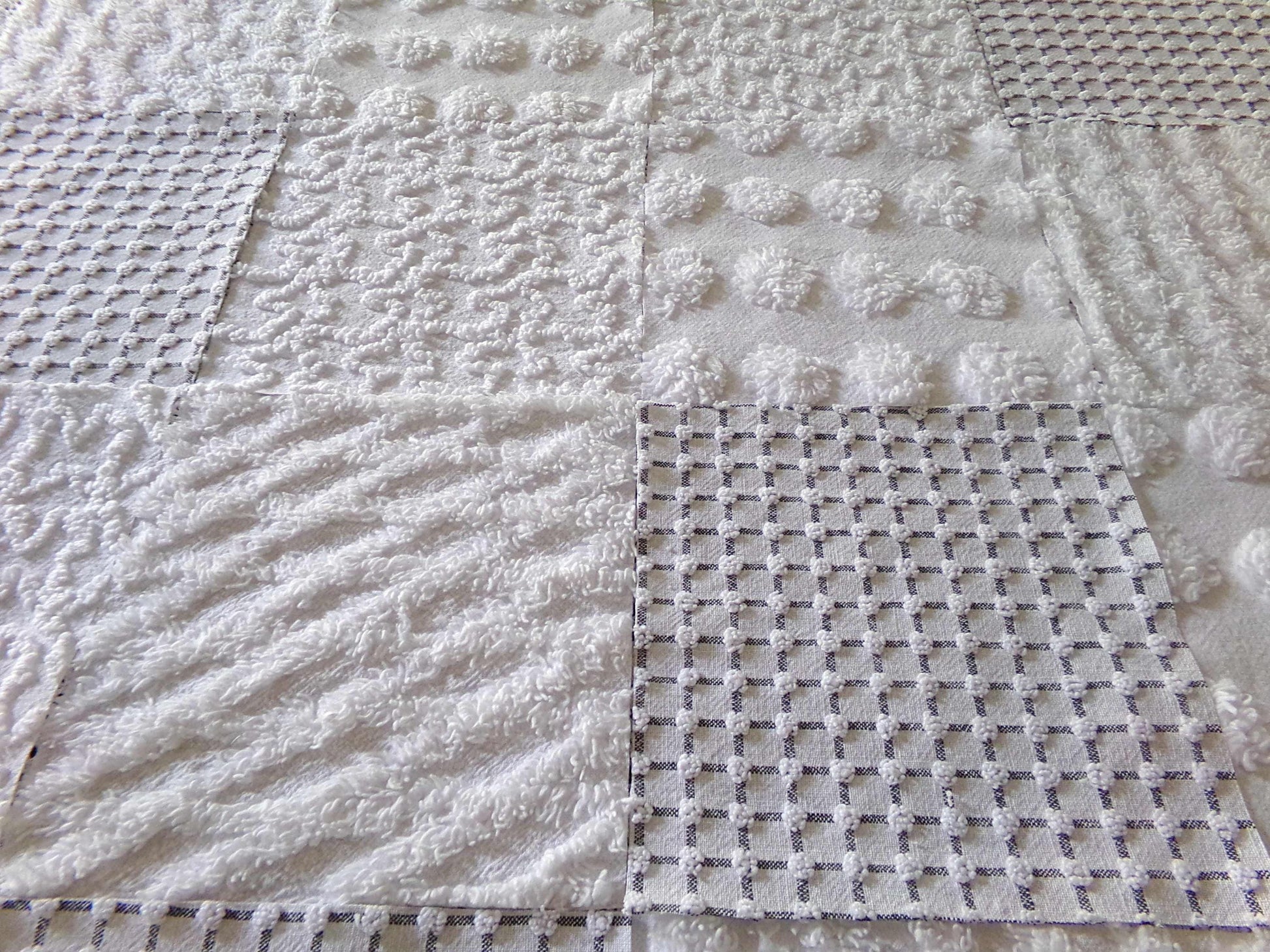 Inspire or enhance your next quilt or craft project with this great starter set of 16 vintage chenille fabric squares in shades of blizzard white. You'll receive 4 each of the following patterns: coin pop, diamond lattice, squiggles & micro pops on black and white windowpane grids.::total qty: 16 chenille fabric quilt squares