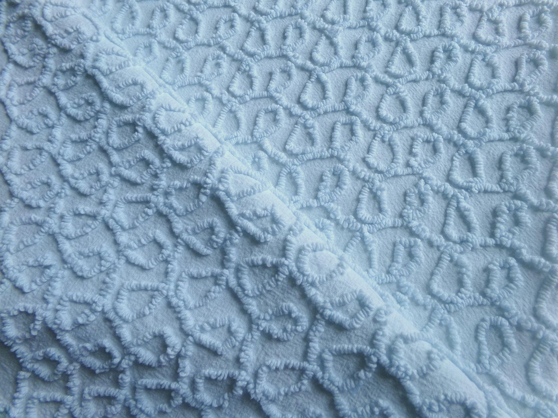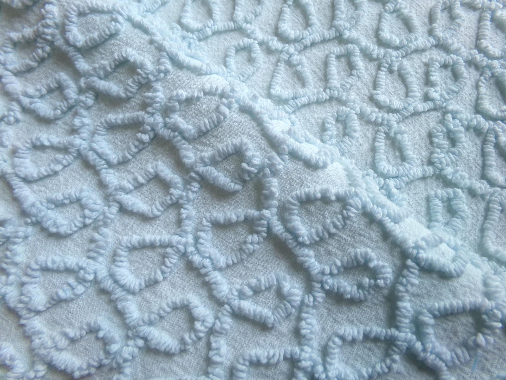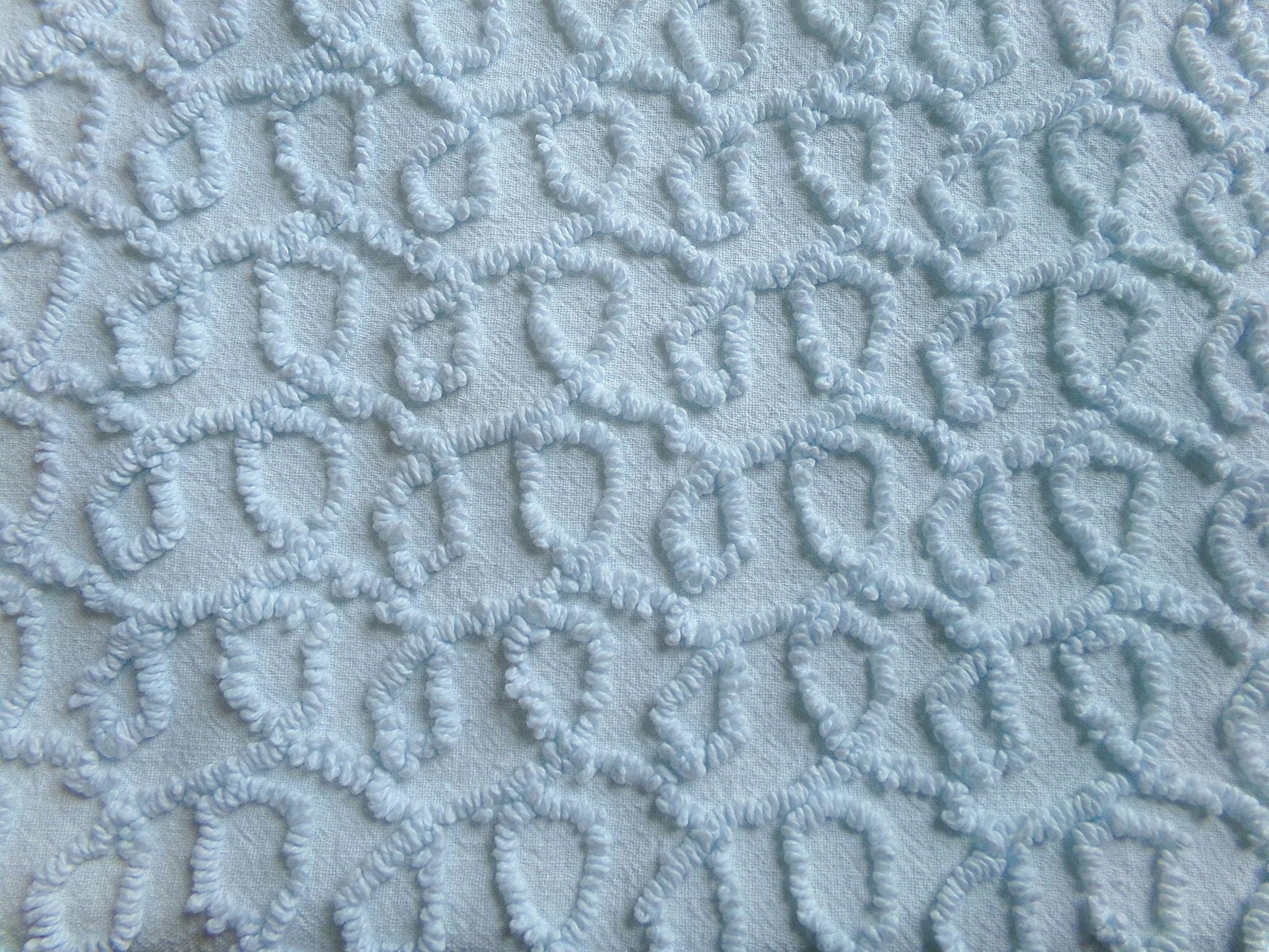 What a cute piece of vintage chenille fabric this is, in an ice blue curly loop pattern. It was a gorgeous sunny day here, so I took photos of its unique color and texture at various times in natural sunlight to show how well it adapts to light.If you want your project to have a nice bit of texture, this is a great choice of fabric. It will give a nice visual and textural interest, particularly in quilts, but it won't overpower your design. So pretty...measures about 18" x 24". Lightweight cotton.