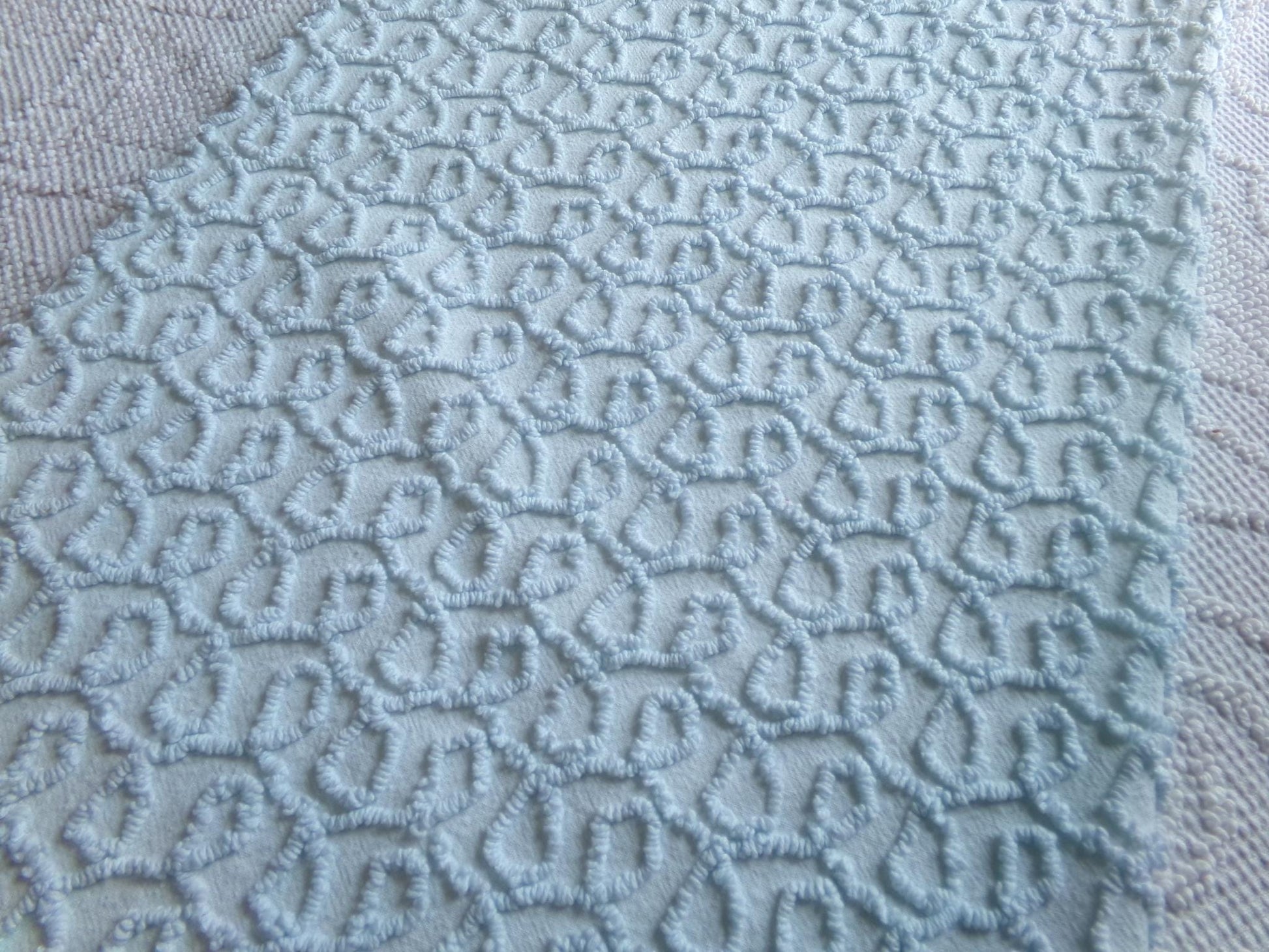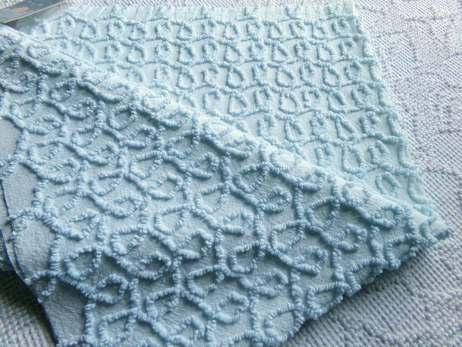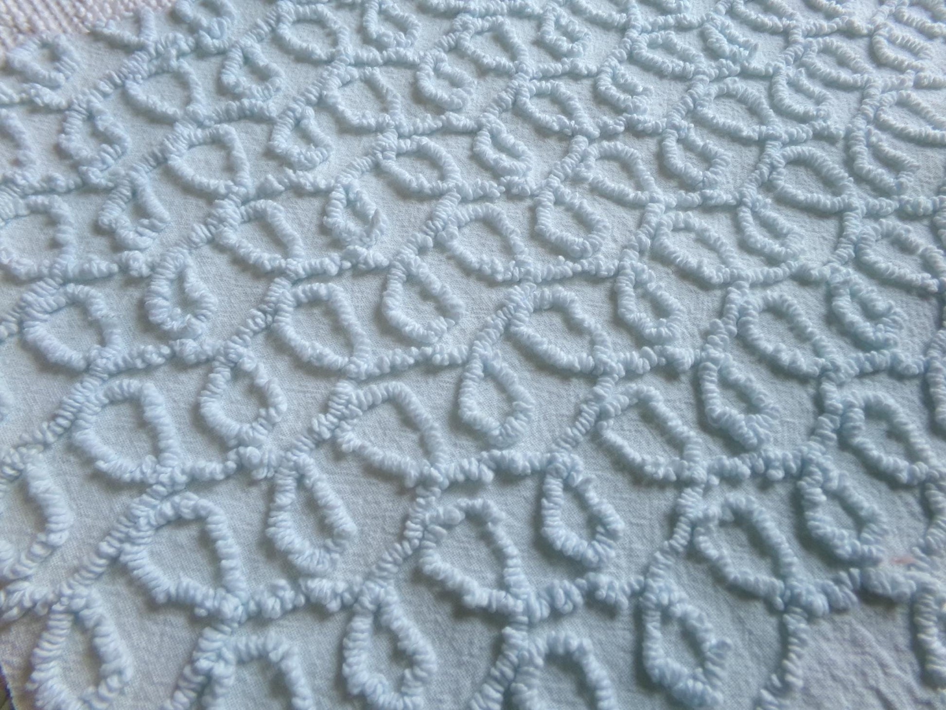 What a cute piece of vintage chenille fabric this is, in an ice blue curly loop pattern. It was a gorgeous sunny day here, so I took photos of its unique color and texture at various times in natural sunlight to show how well it adapts to light.If you want your project to have a nice bit of texture, this is a great choice of fabric. It will give a nice visual and textural interest, particularly in quilts, but it won't overpower your design. So pretty...measures about 18" x 24". Lightweight cotton.
