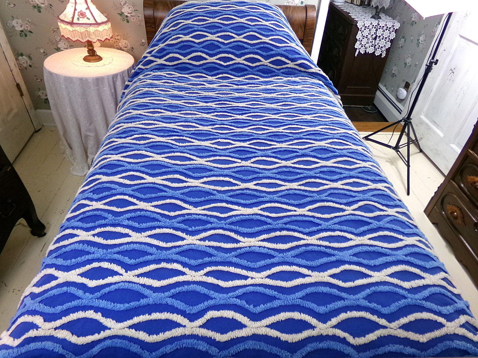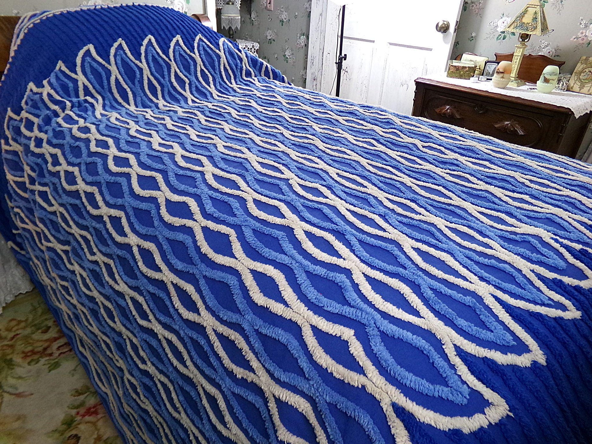 If you were to ask me which chenille bedspread in my many years of collecting stands out as most unique, this one would probably top the list. It features a very unusual blue and white flame design - so striking that I've shown you what it looks like by placing the bedspread in two different orientations in the photos so you can see what it might look like in your room.The linked flame design features coordinating starry blue and weathered white tufting, all set on a royal blue cotton bkgd. To me it almost looks like the accent tufting around the edging is a very very light grey, but it's one of those colors that different people will perceive differently based on lighting, etc. I took two closeups for your review in the final collage img.