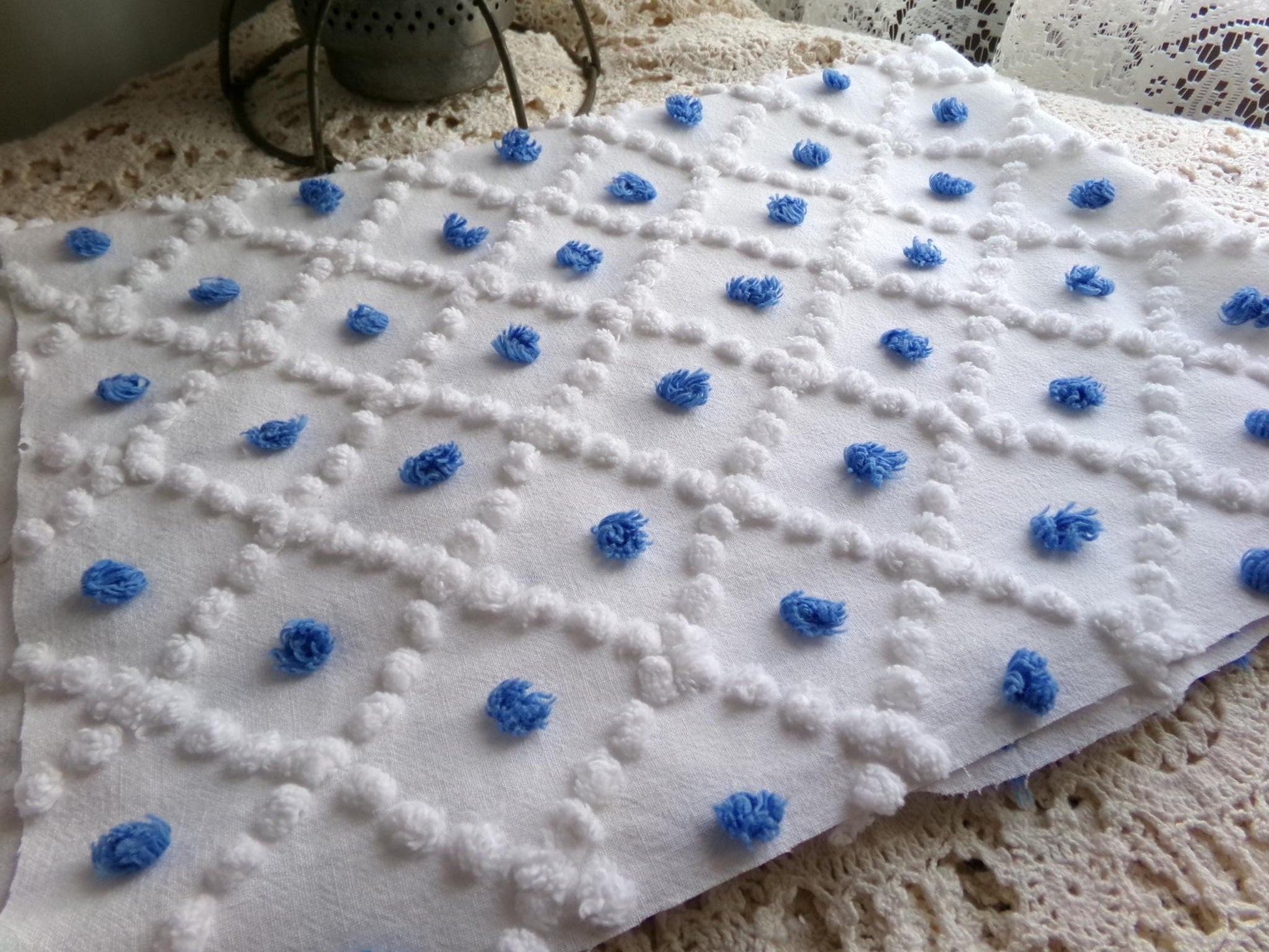 Adorable blueberry pops are situated in squares shaped by little white snowdrop popcorns on this piece of vintage chenille fabric. Just so cute. Photos taken in high natural sunlight.Measures approx 18" x 26" inches. Very lightweight 100% antique cotton, handtufted material. May have a few light pinholes. A versatile fabric that adapts well in vintage to modern design concepts.