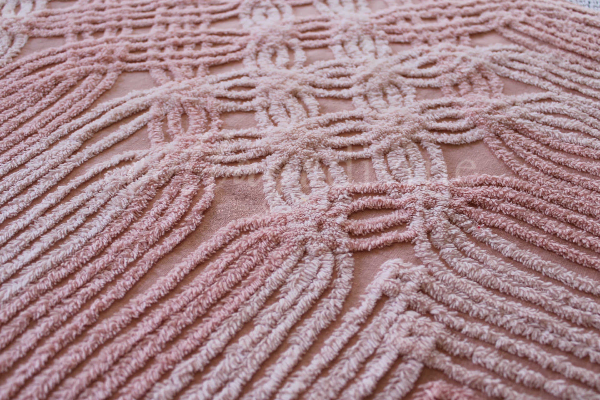 100% cotton. Two-tone pink intricate spider tuft motifs meet delicate cathedral stripe lines with a corner stairstepper design. Measures about 20" x 24" inches.