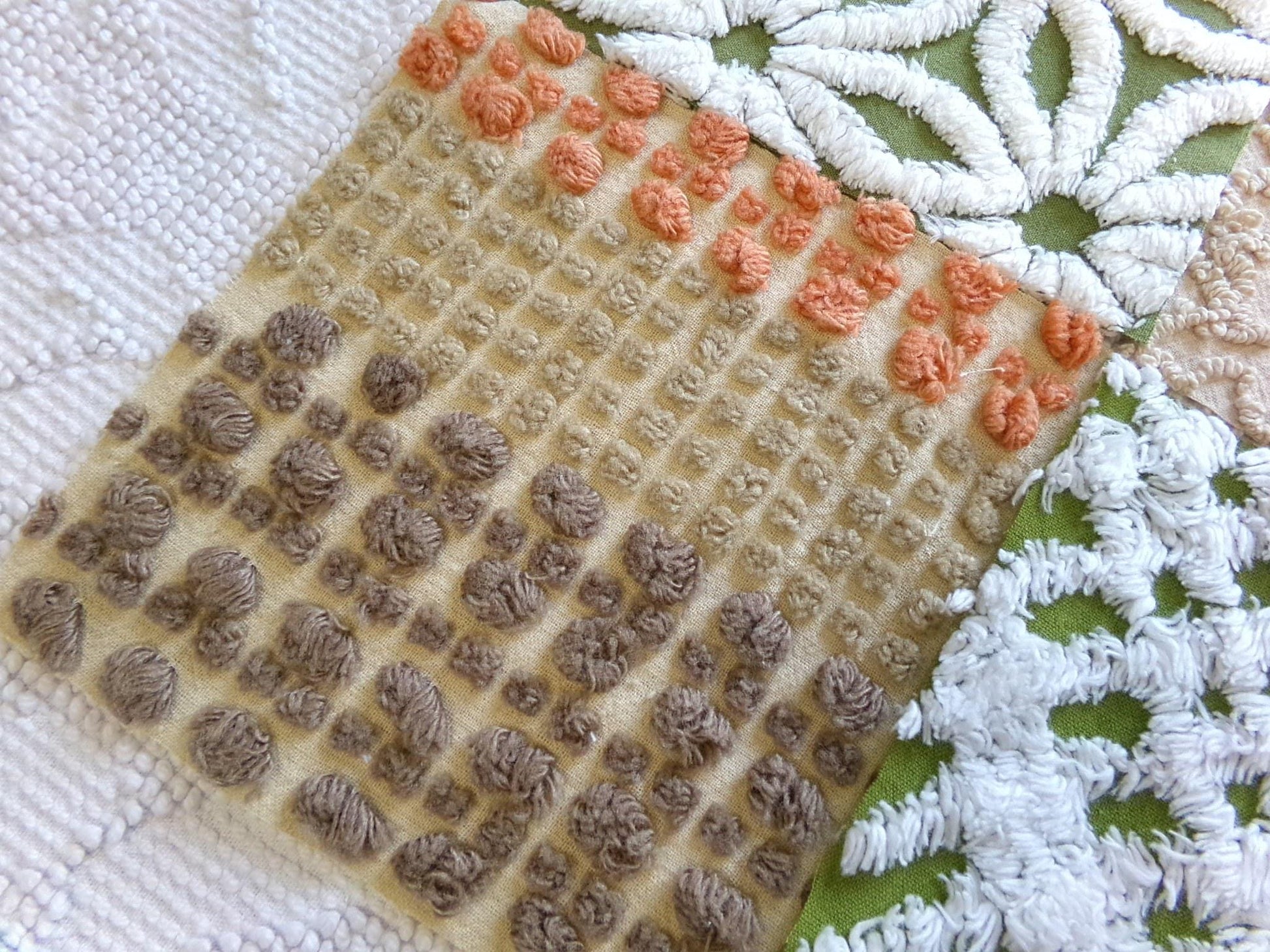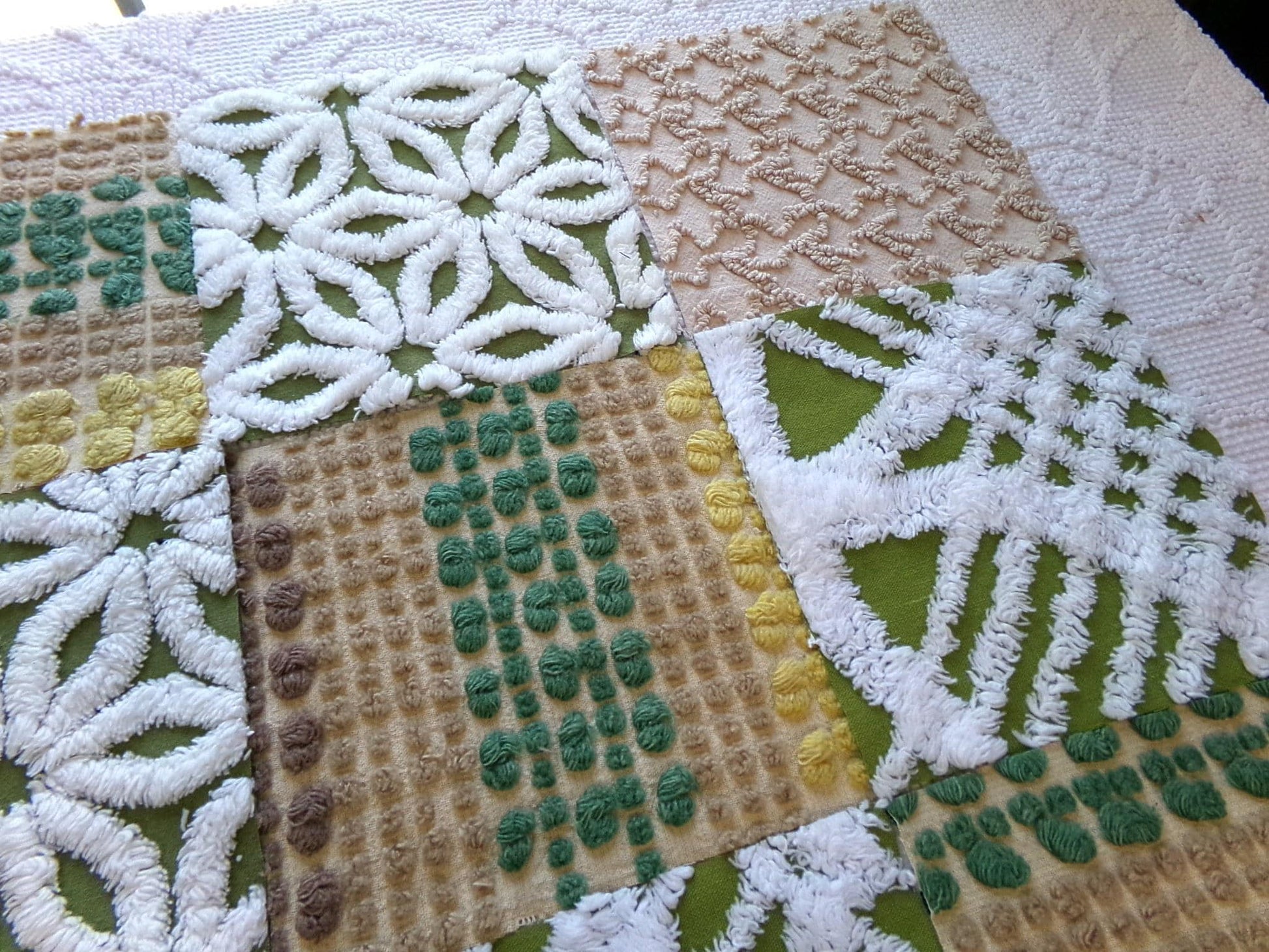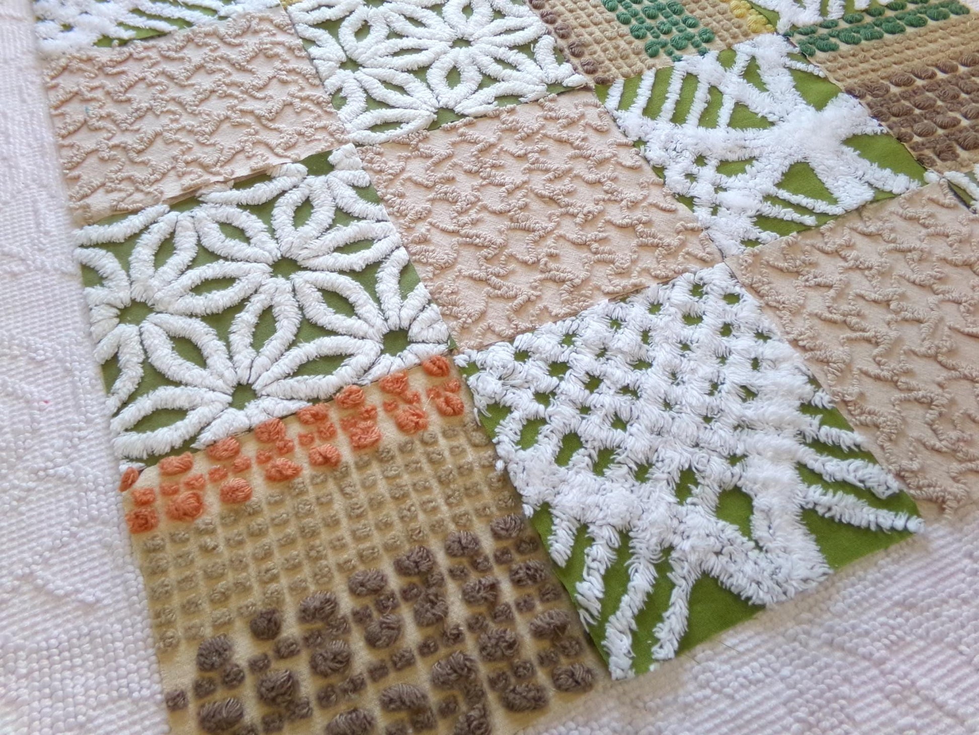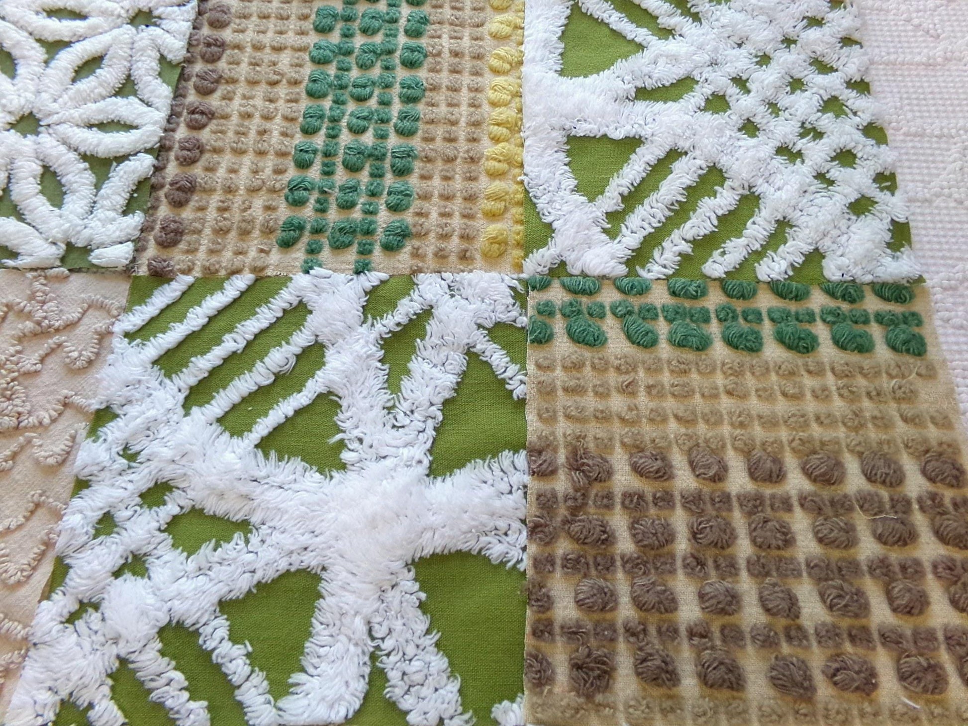 Boho Babe... This was a fun set of vintage chenille squares to assemble for you...whatever you create with these fabric squares, you'll get to time travel back to the glory days of the hippie era.Great earthtones textures in boho colors like olive green, sand, mocha and white. Includes 4 rare Morgan Jones multisize multicolor nubby dot squares, a relic of the late 1960s era.