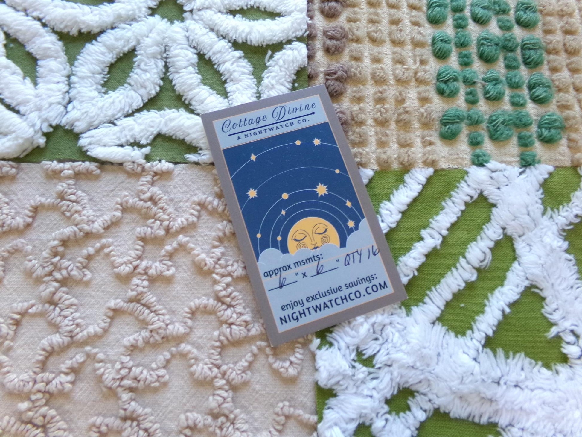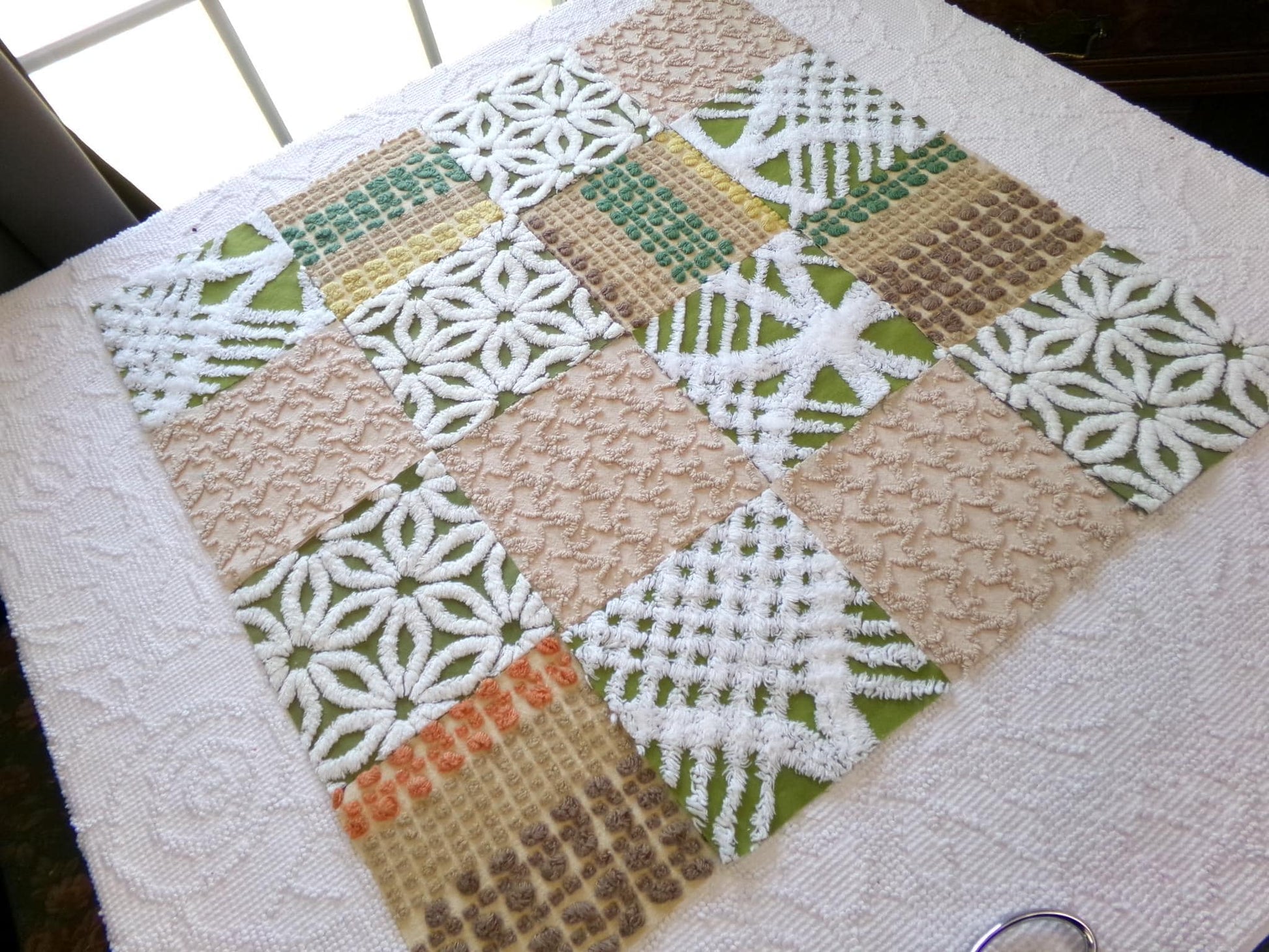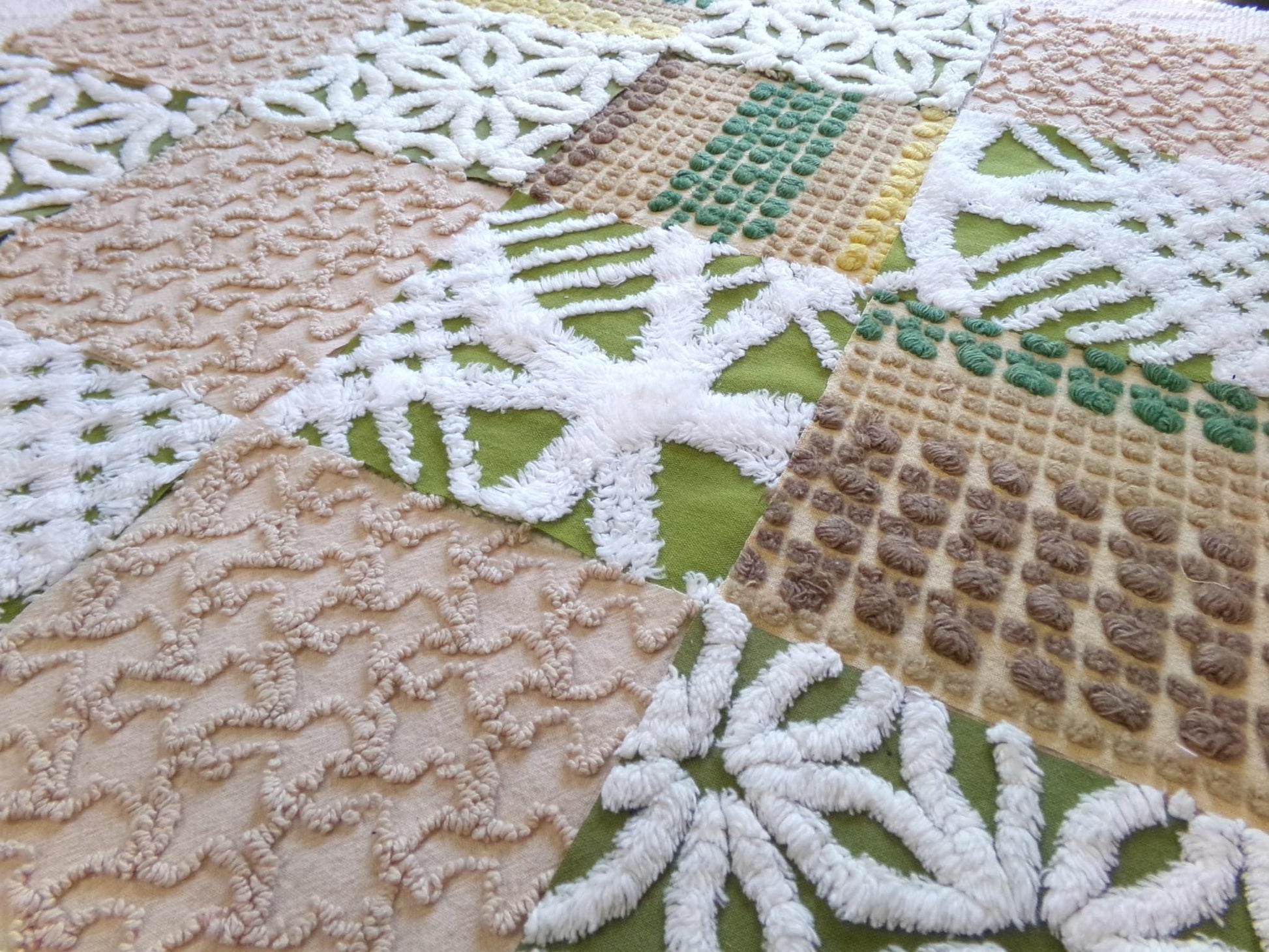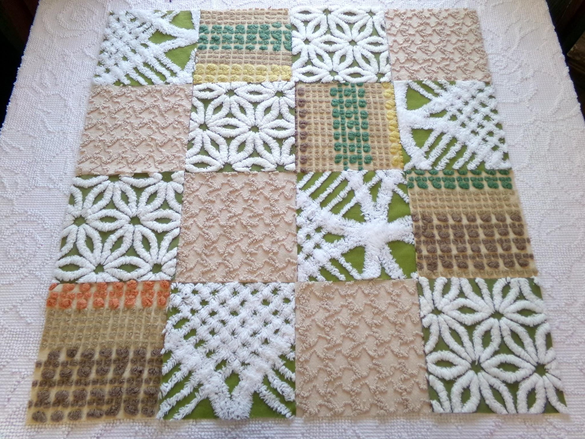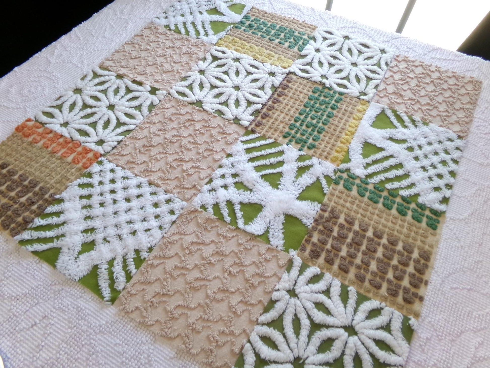 Boho Babe... This was a fun set of vintage chenille squares to assemble for you...whatever you create with these fabric squares, you'll get to time travel back to the glory days of the hippie era.Great earthtones textures in boho colors like olive green, sand, mocha and white. Includes 4 rare Morgan Jones multisize multicolor nubby dot squares, a relic of the late 1960s era.