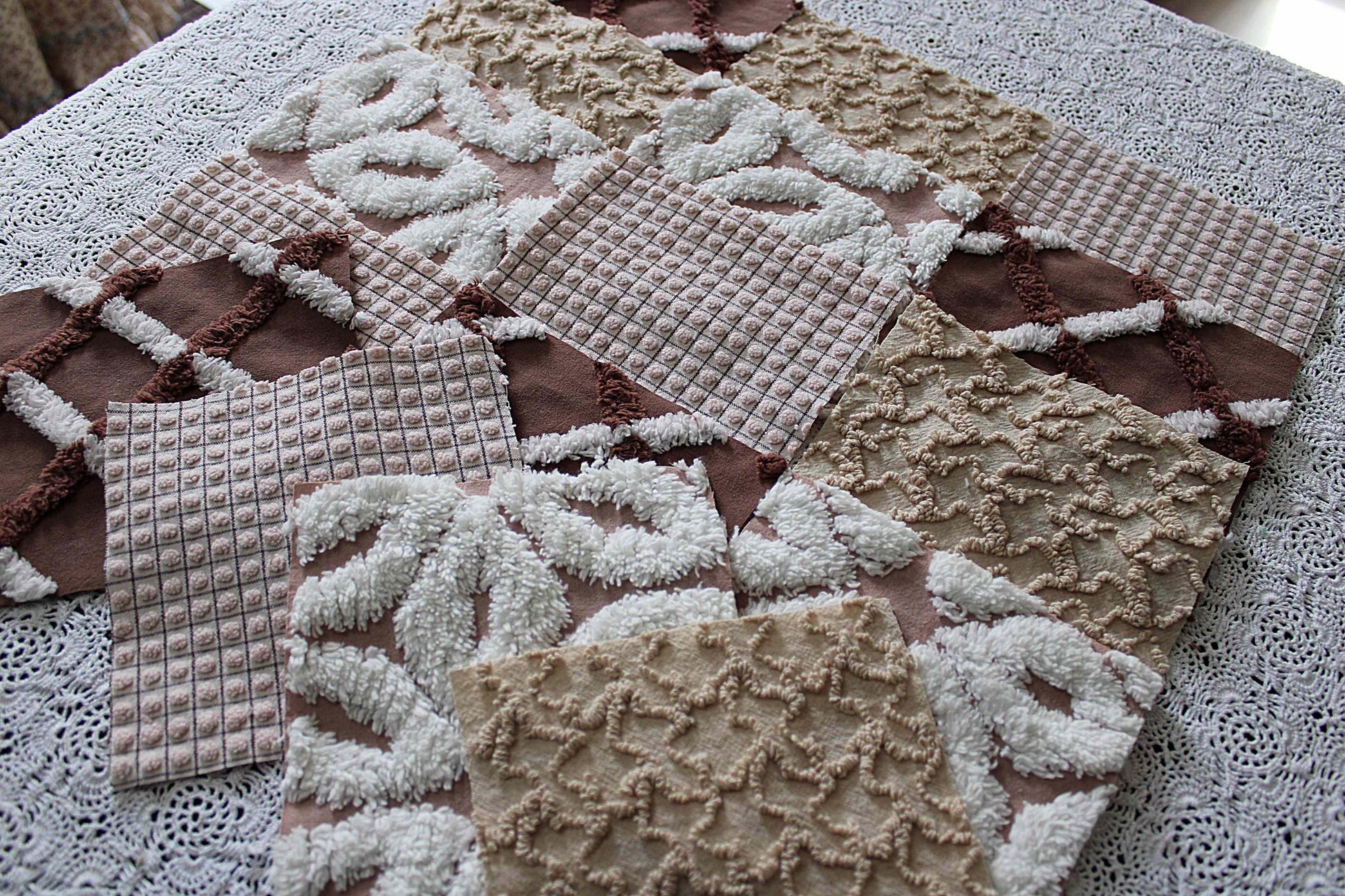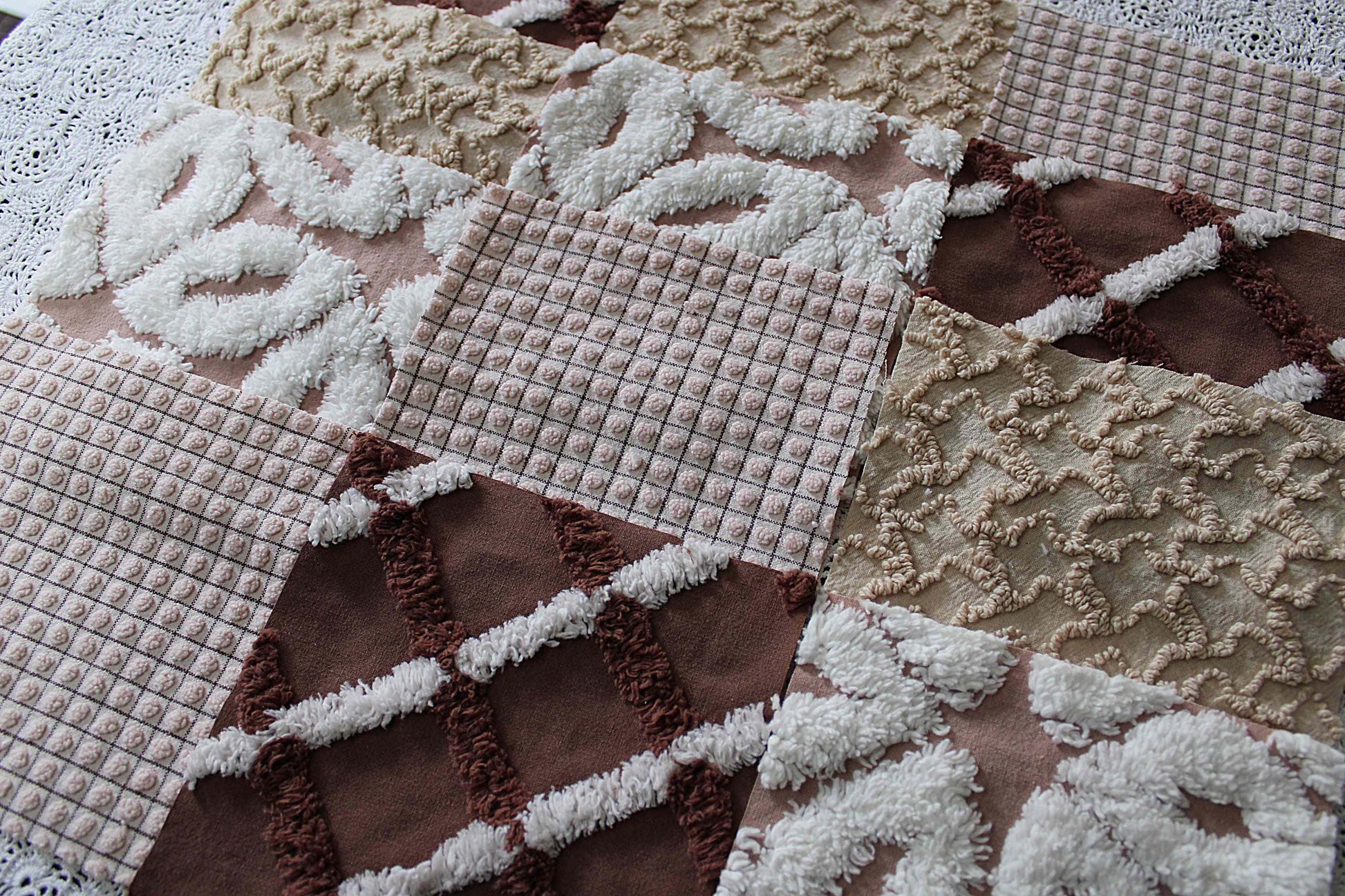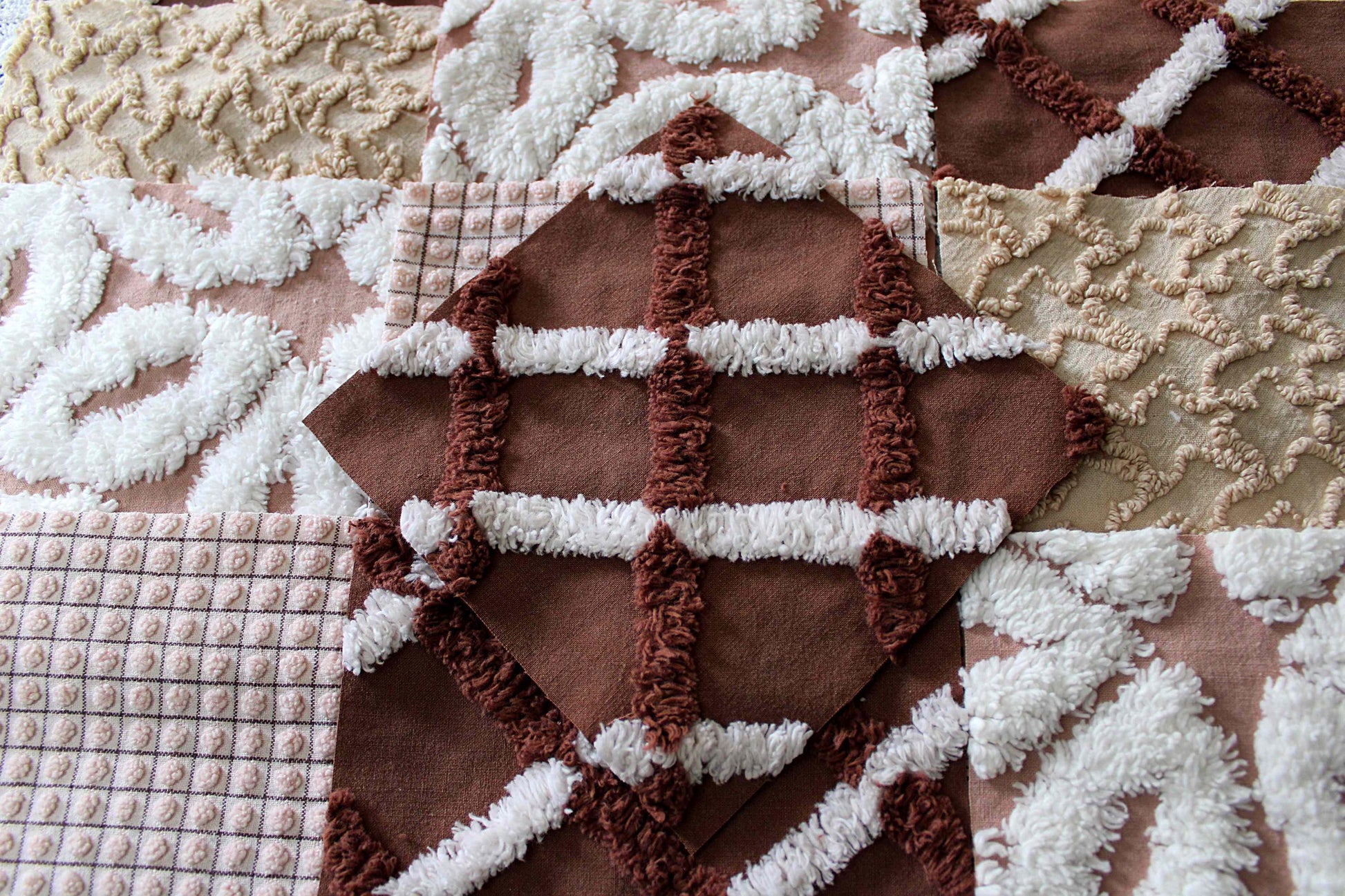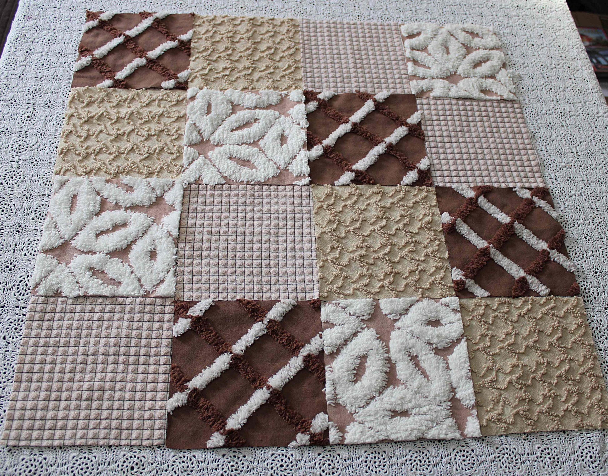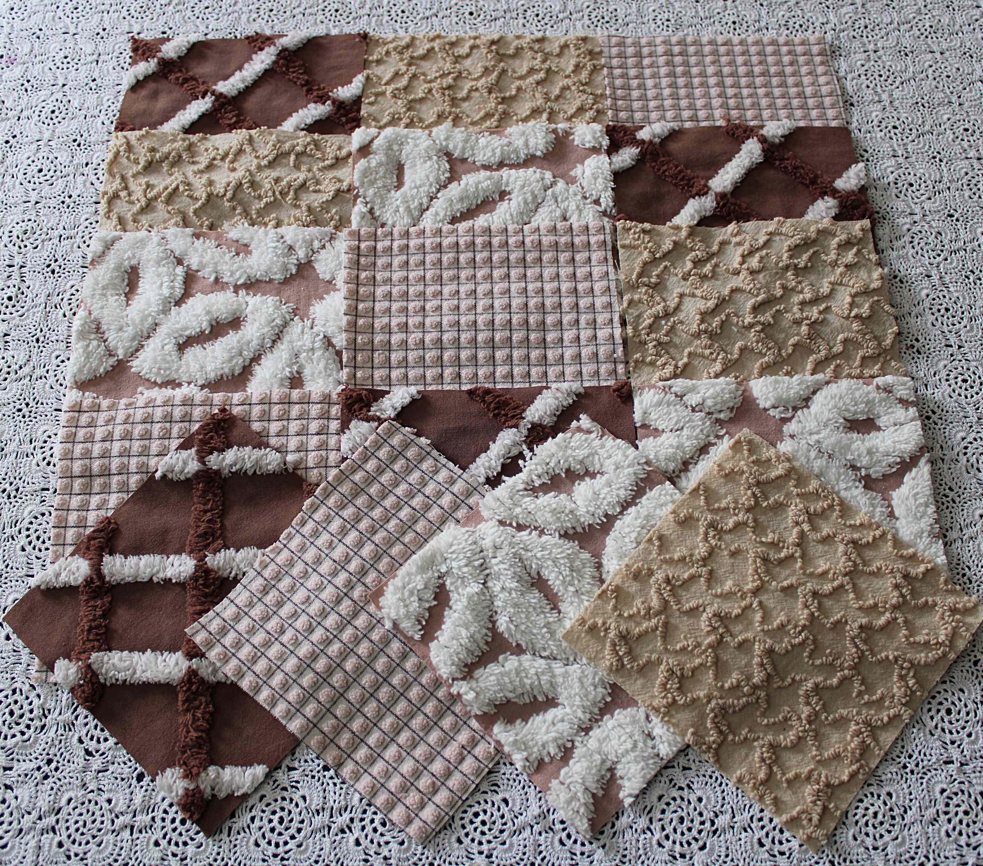 "Boho Browns" ... This is a wonderful set of 16 vintage chenille fabric squares emphasizing welcoming shades of earthy browns, from rich chocolate to sandy mocha, with hints of white.::total qty: 16 separate chenille quilt squares