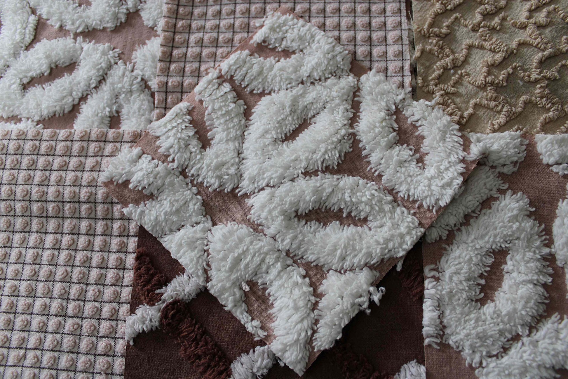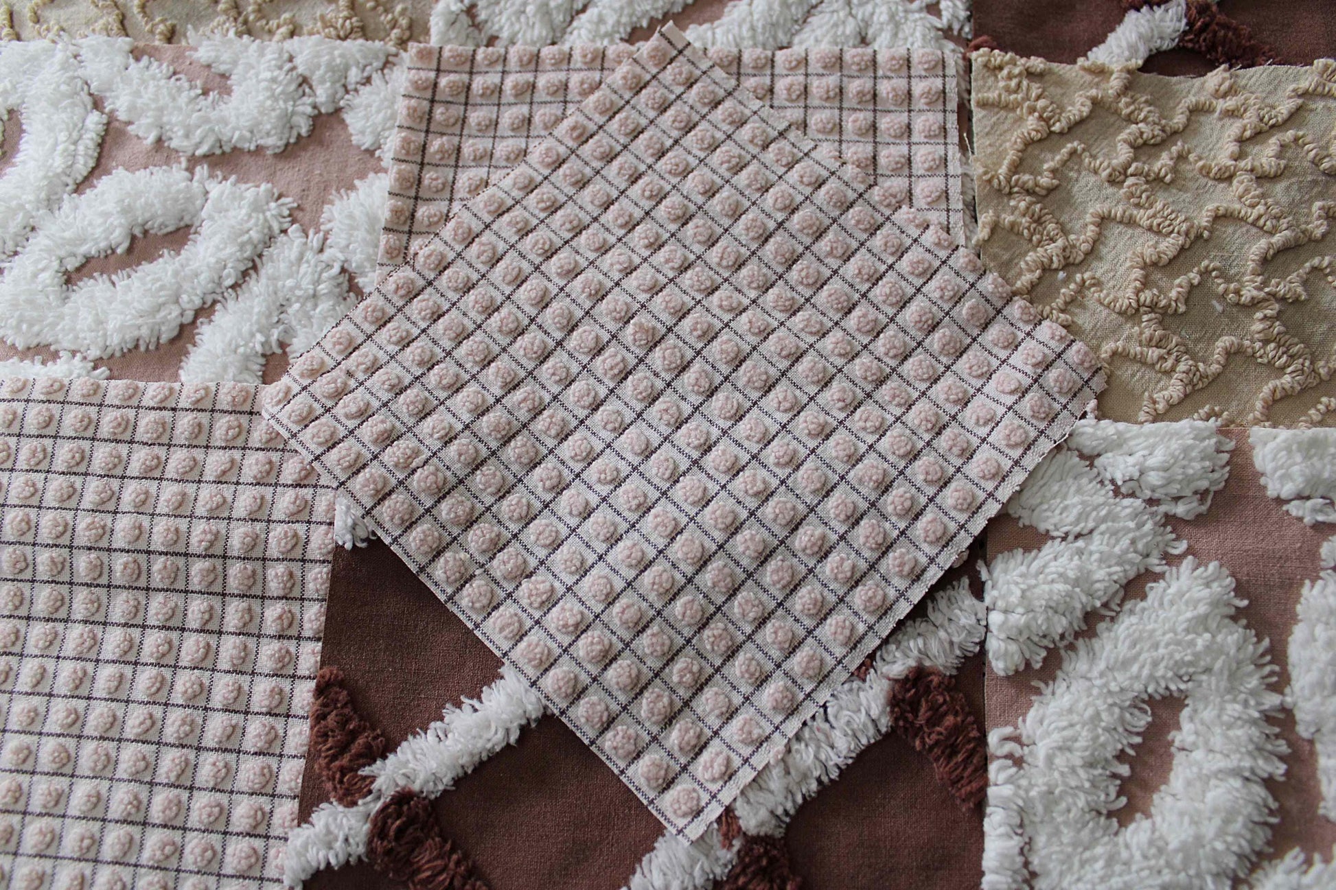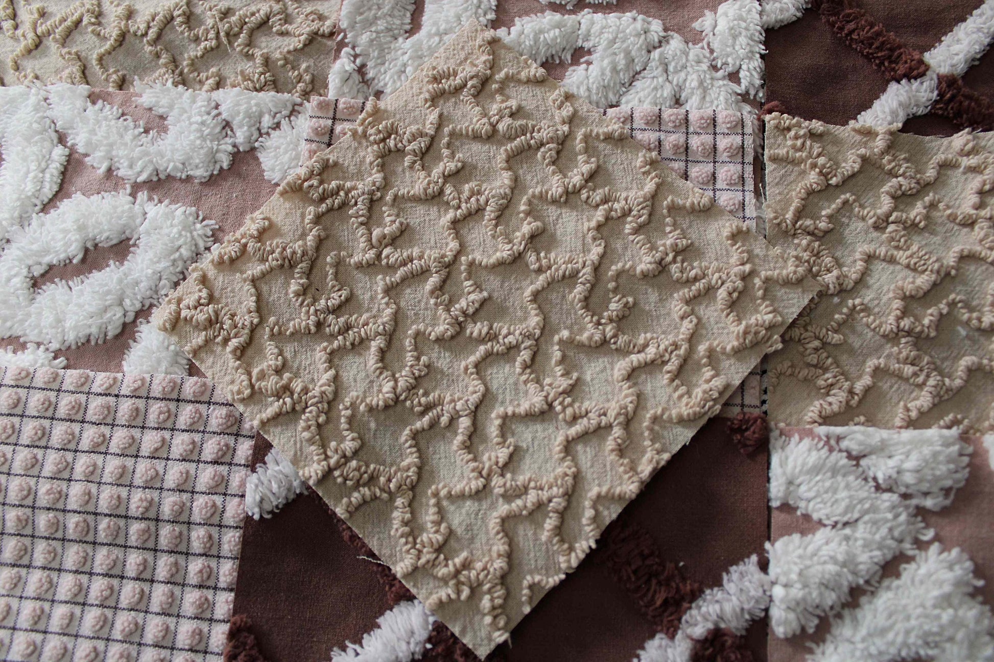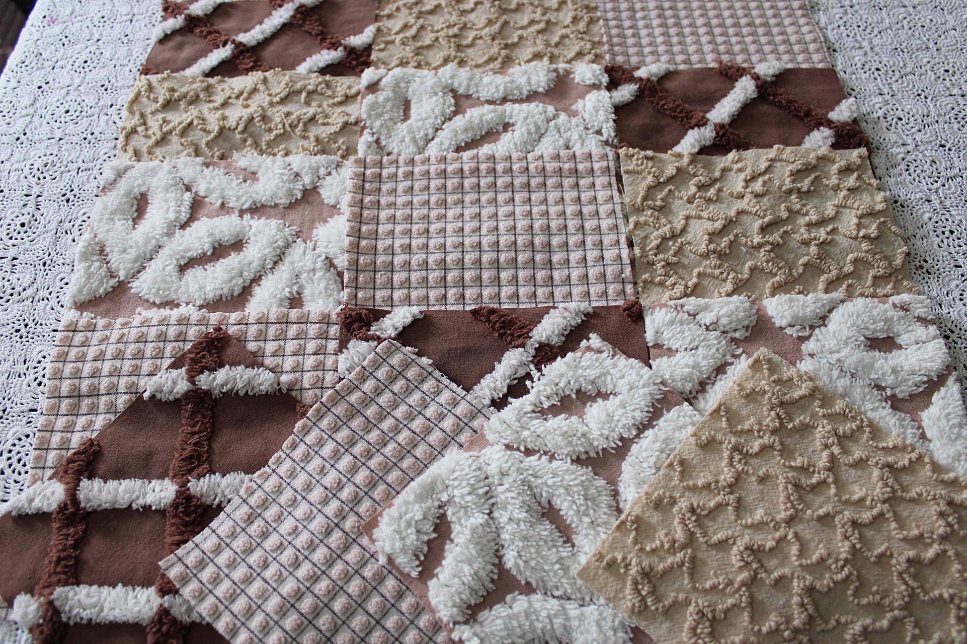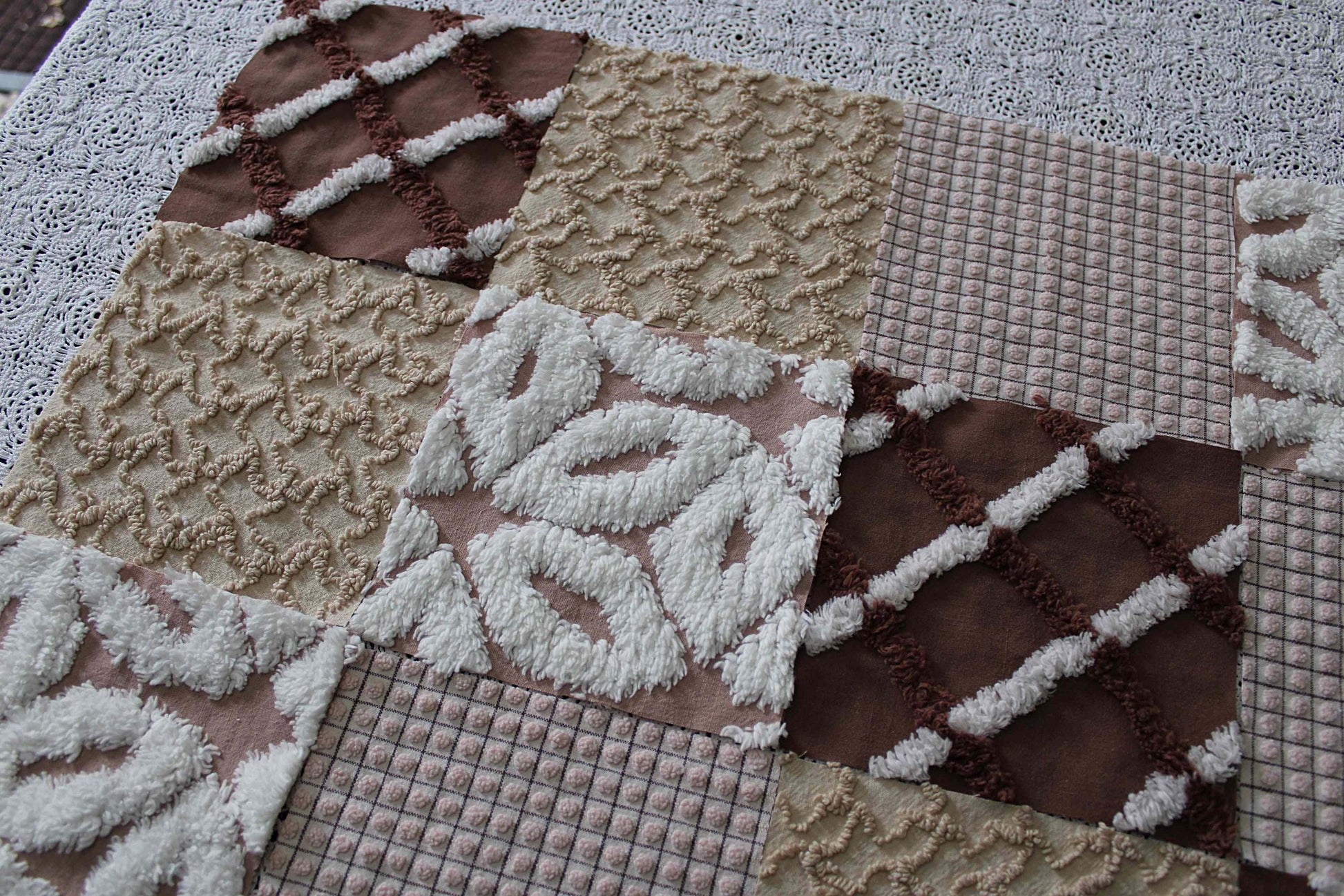 "Boho Browns" ... This is a wonderful set of 16 vintage chenille fabric squares emphasizing welcoming shades of earthy browns, from rich chocolate to sandy mocha, with hints of white.::total qty: 16 separate chenille quilt squares