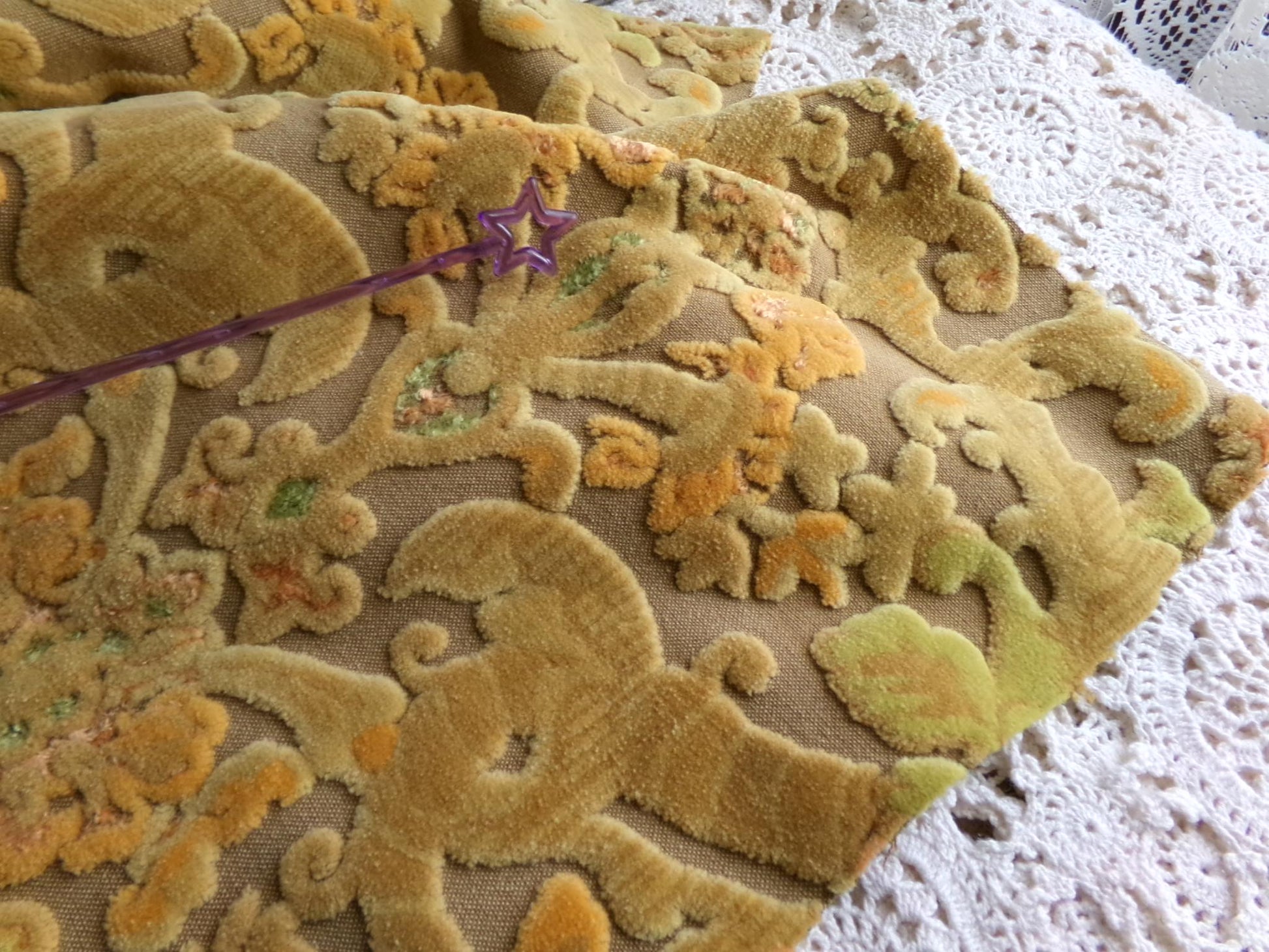 The perfect hippie boho style colors combine on this piece of beautiful vintage cut velvet fabric: a warm faded almost acid-tone coppery bronze groundcloth is tufted with coordinating accent shades of burnt orange & grecian green with other earthy tones. Fabulous natural distressing throughout where the tufting has worn off as seen in final imgs gives an Old World vibe. If you look closely on the back, you'll see the groundcloth is has a darker linear strip to create almost a gentle ombre look on the front.Approx msmts: 14" x 20" piece. A Bates design, with all the quality the famed company is so well known for. Actual piece you will receive is pictured; all photos are unedited & taken in natural bright light. The fabric adapts well to light, appearing deeper tone indoors in low light.