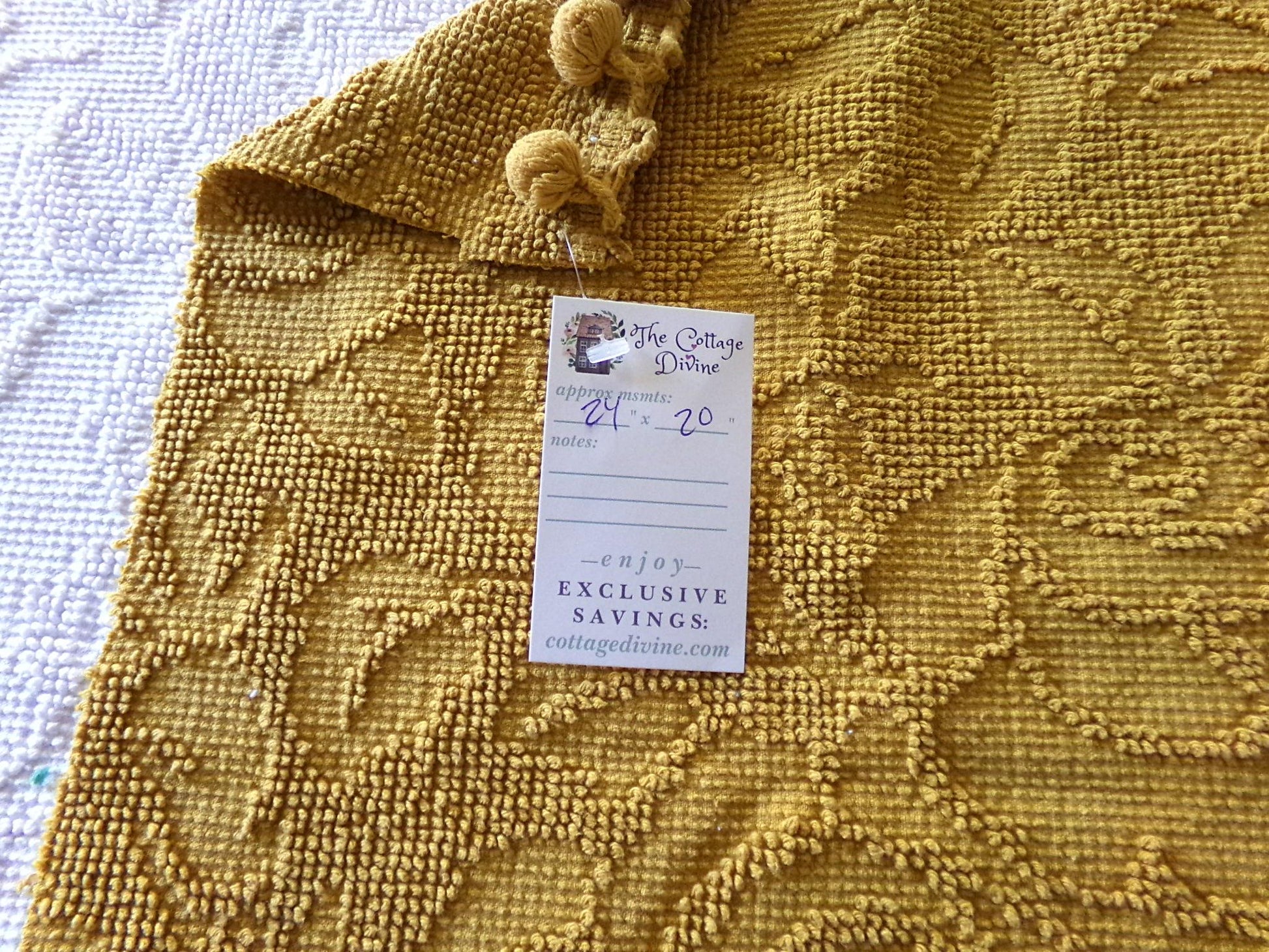 Evoke the retro cozy earthy warmth of the 1960s & 70s hippie era with this bold piece of vintage woven chenille fabric. In a saturated earthtone harvest gold so popular back then, this reversible pattern features scattered large cabbage roses in a hobnail design which lends a nice texturized appearance.Approx msmts: 20" x 24" inch piece. This fabric pairs beautifully with other earthtones, particularly olive greens and deep chocolate tones. Versatile, easy to work with and durable in a variety of applications, from totes and essential oil bags to pillows and quilts.