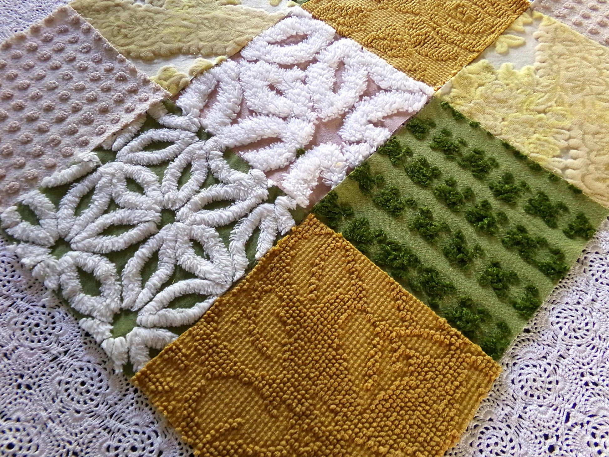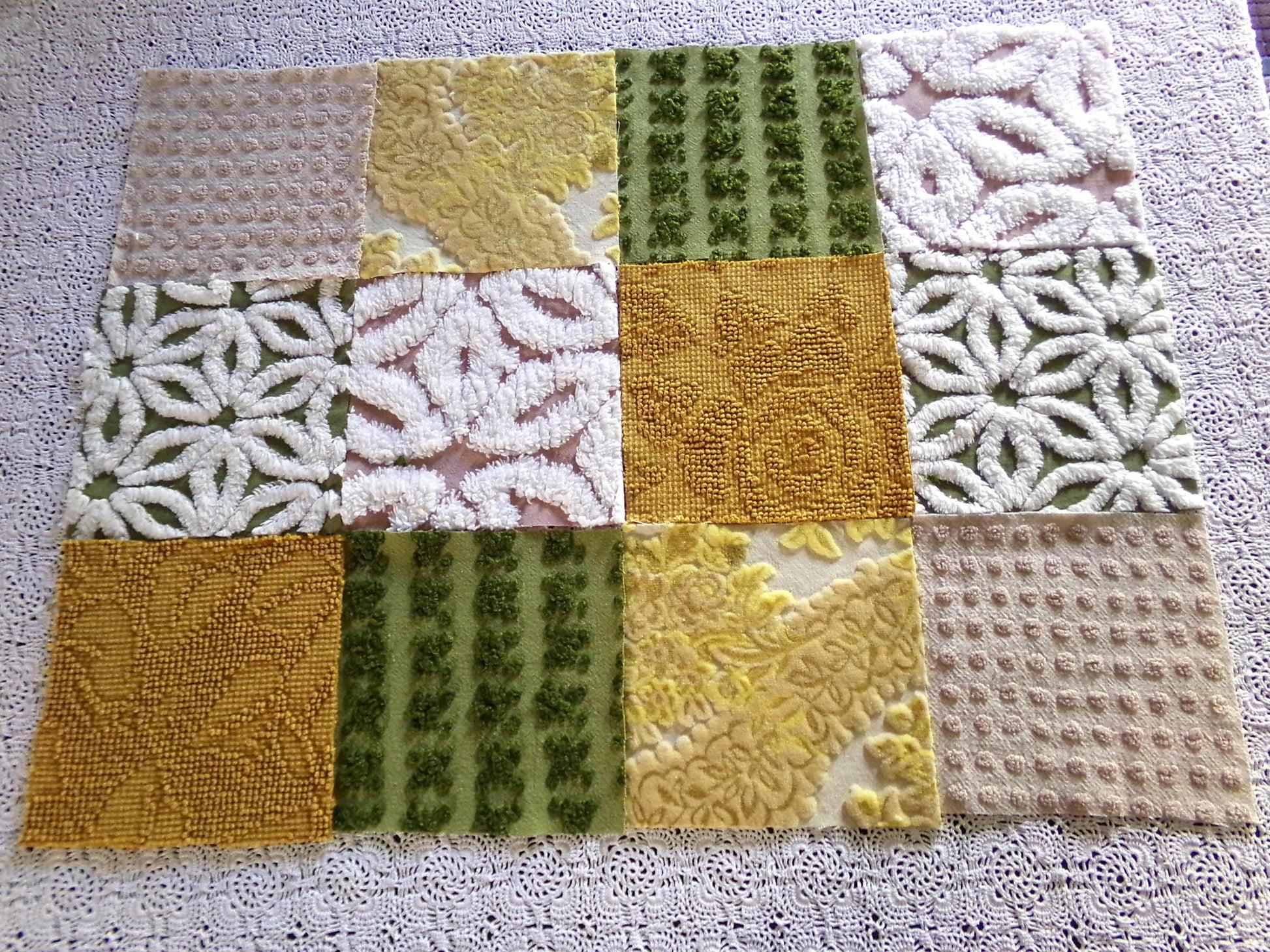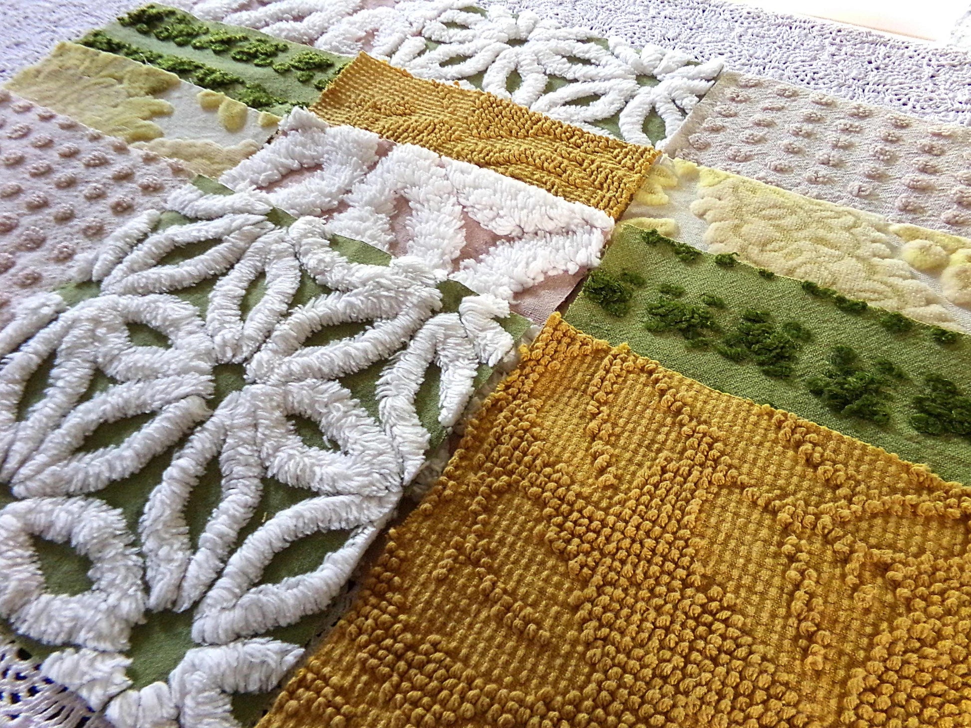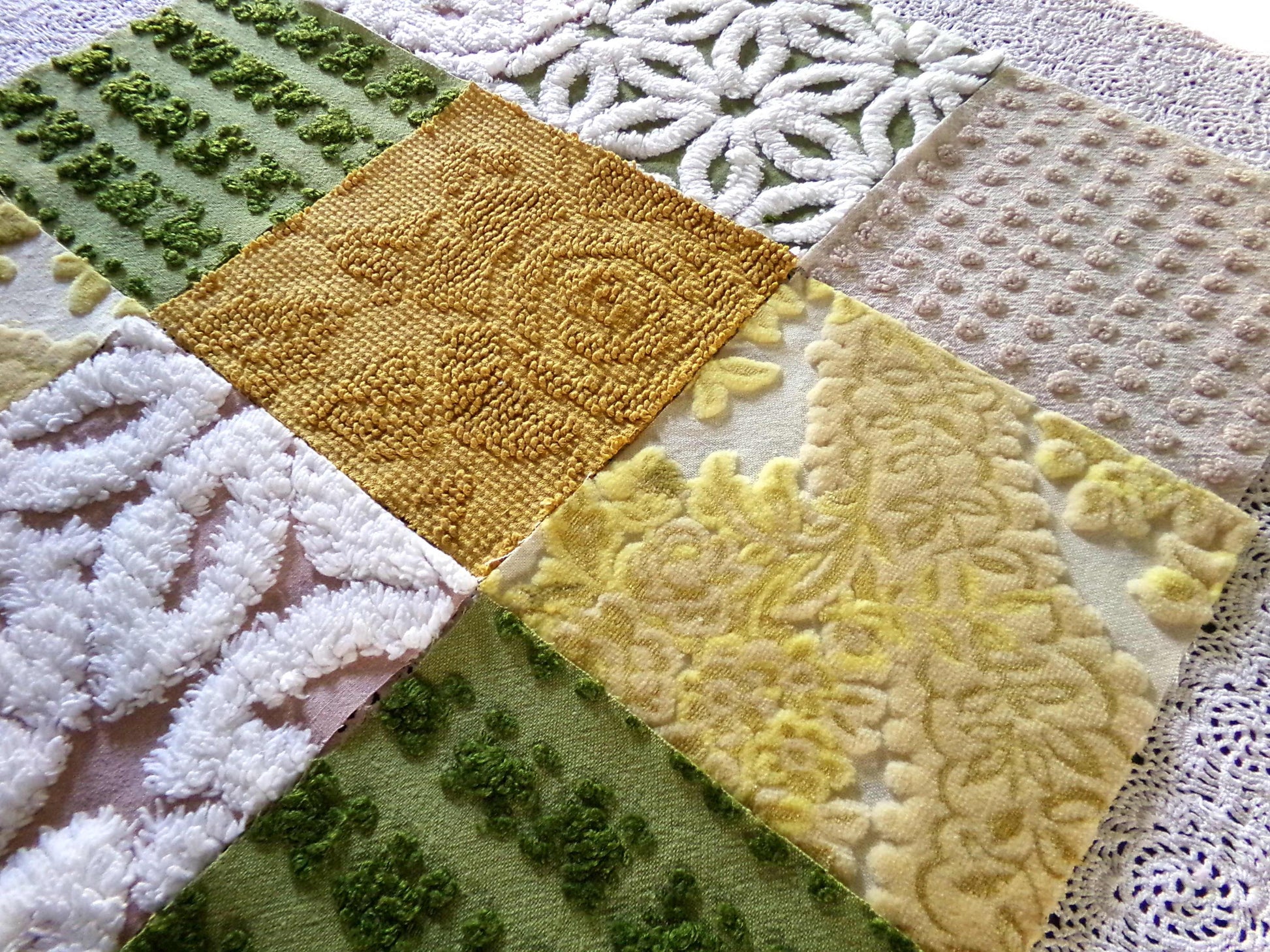 Spark your creativity with this set of fabric squares cut from vintage chenille bedspreads. Two squares are Bates cut velvet in a gorgeous design. This boho themed assorted selection emphasizes woodsy, earthtone retro hippie colors with a range of textures. Each measures about 6" square.Perfect for: slow stitching, mending patches, junk journals, little craft projects like pin cushions or small doll clothes, or to incorporate into larger projects like patchwork pillow covers or handmade quilts.