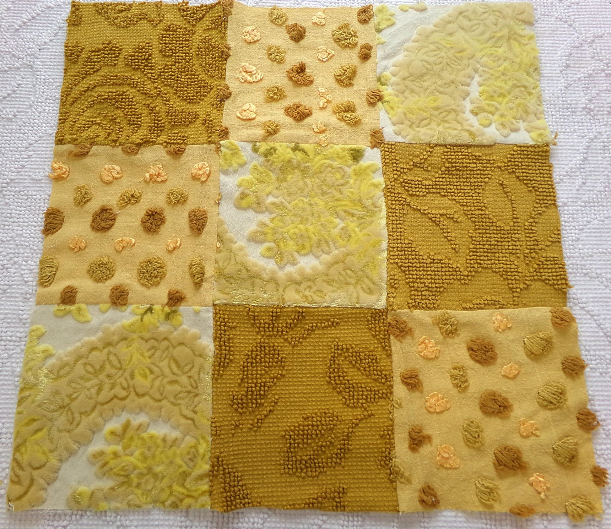 • fabric composition: 100% cotton vintage chenille (6 blocks) & cut velvet (3 blocks)