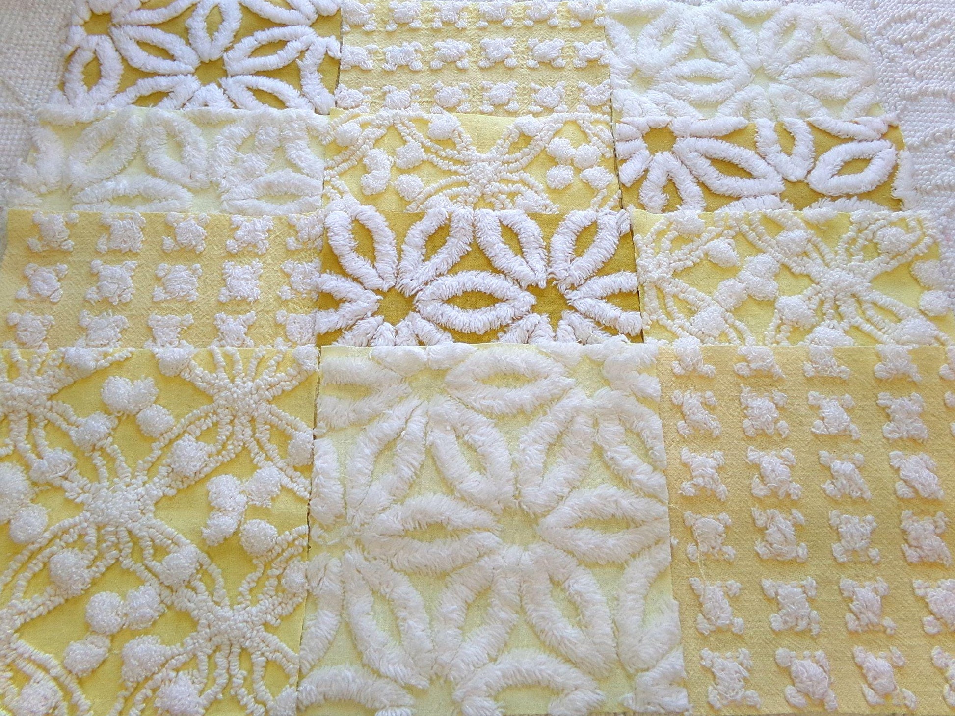 Inspire or enhance your next project with this set of vintage chenille fabric squares in a gorgeous selection of uplifting yellows with a boho autumn sunrise vibe.You'll receive a total of 16 fabric squares measuring 6" x 6". 4 each of the following patterns: white daisy on harvest gold, white daisy on light yellow, white rosebud on sunshine yellow, white needletuft wedding ring pop on vibrant yellow.