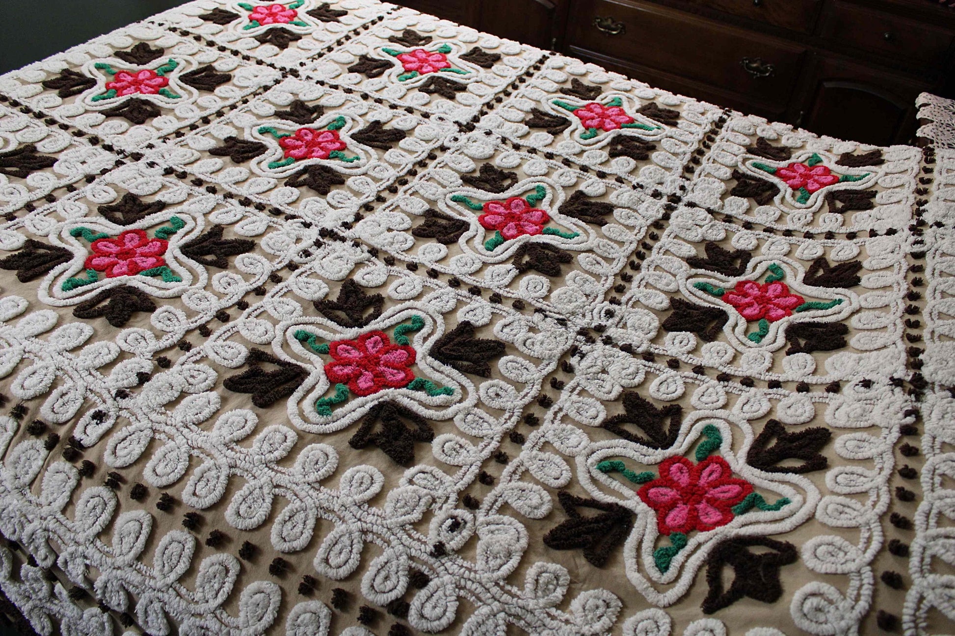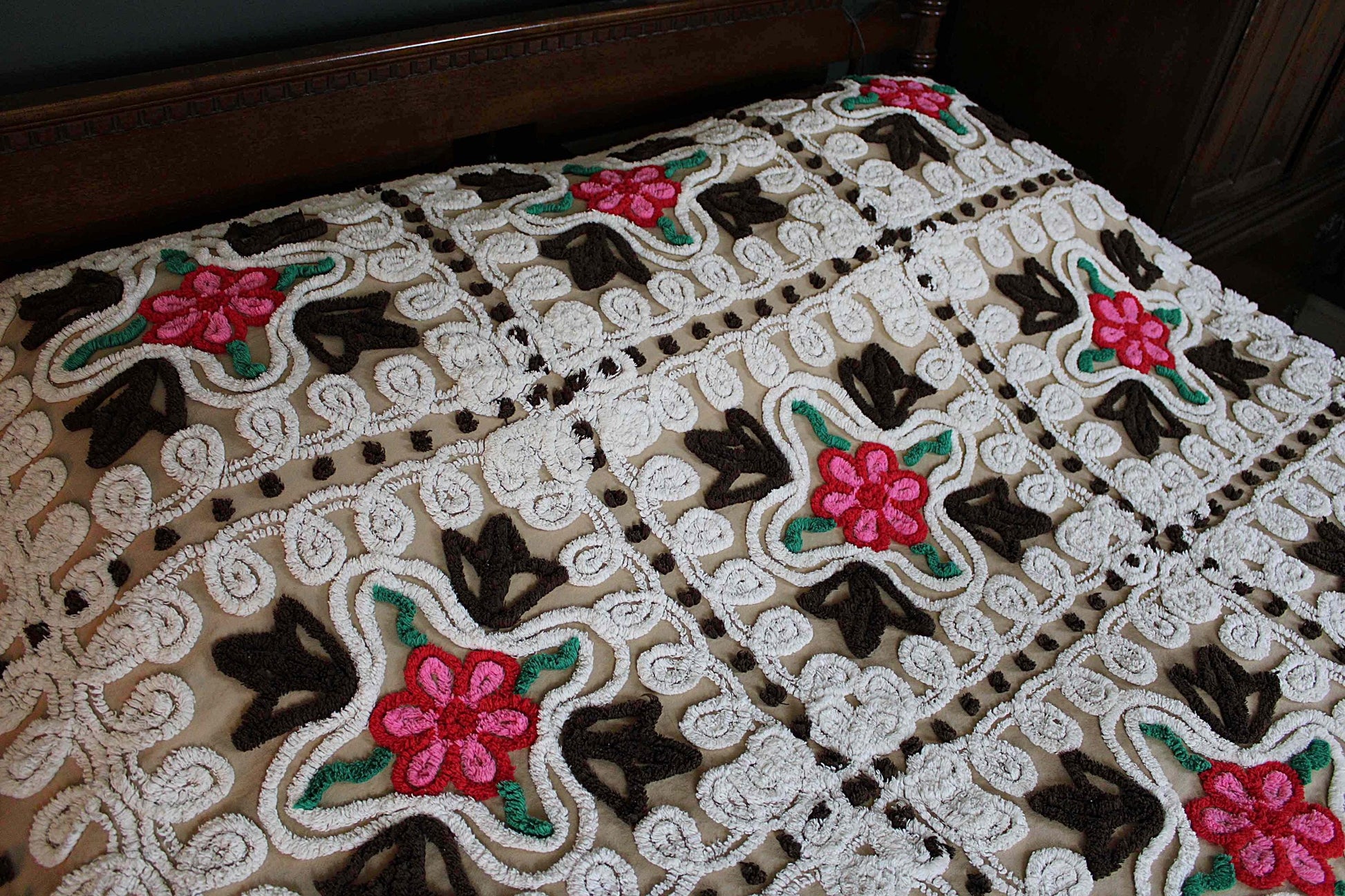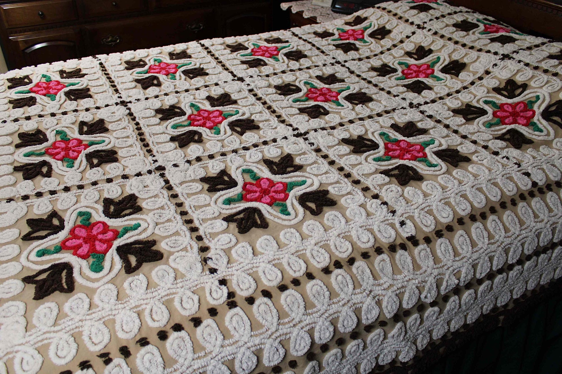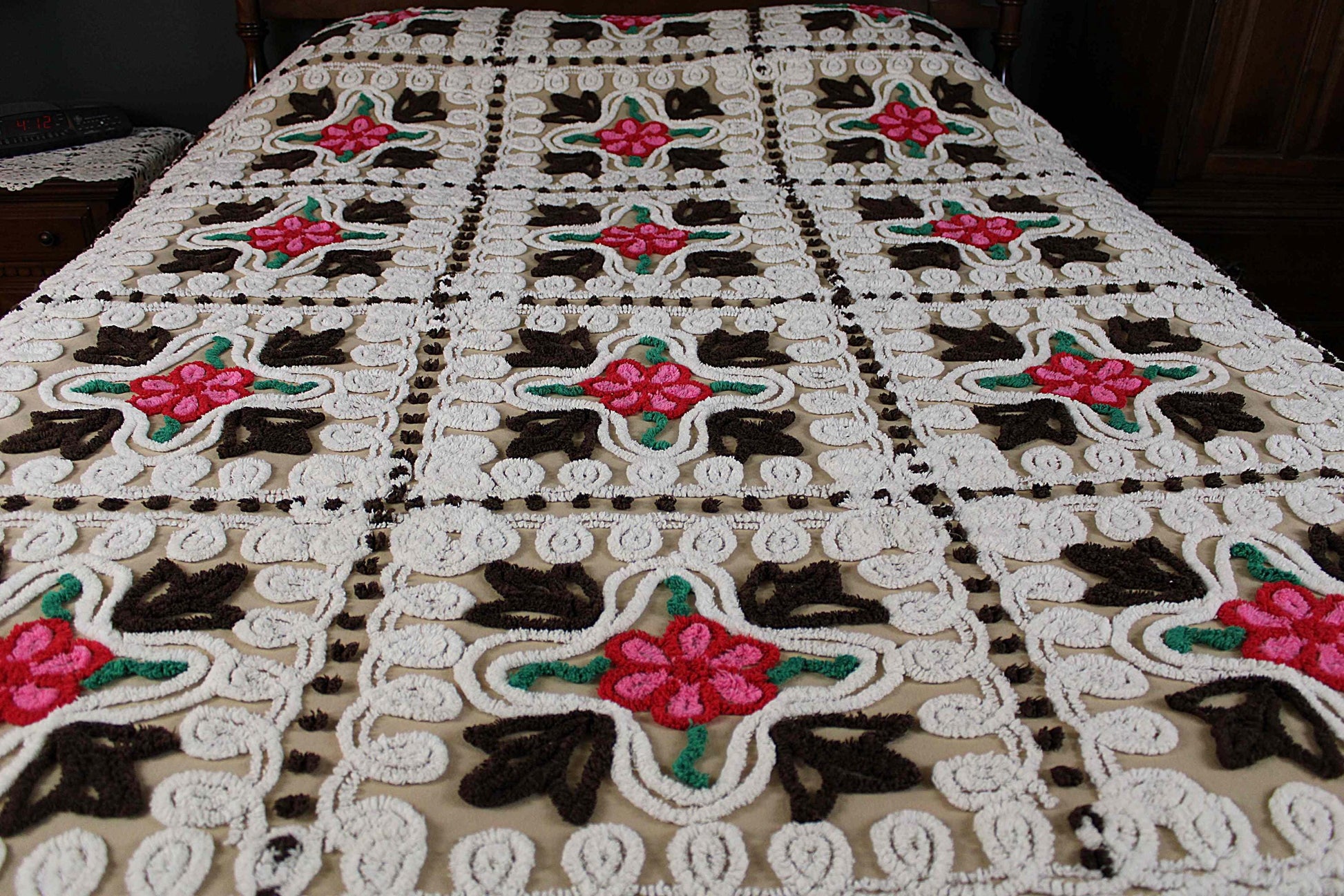 Love this boho cottagecore FULL size chenille bedspread, in a rare pattern and colorway. If you appreciate the bold & the beautiful, you'll fall in love with this incredible vintage spread that is waiting to become the focal point of whatever room you choose to place it in.A creamy mocha cotton groundcloth is tufted with frosty white swirls & twirls of curlicues that wrap around prominently positioned quilt style blocks. Each block showcases a single deep pink rose flower.