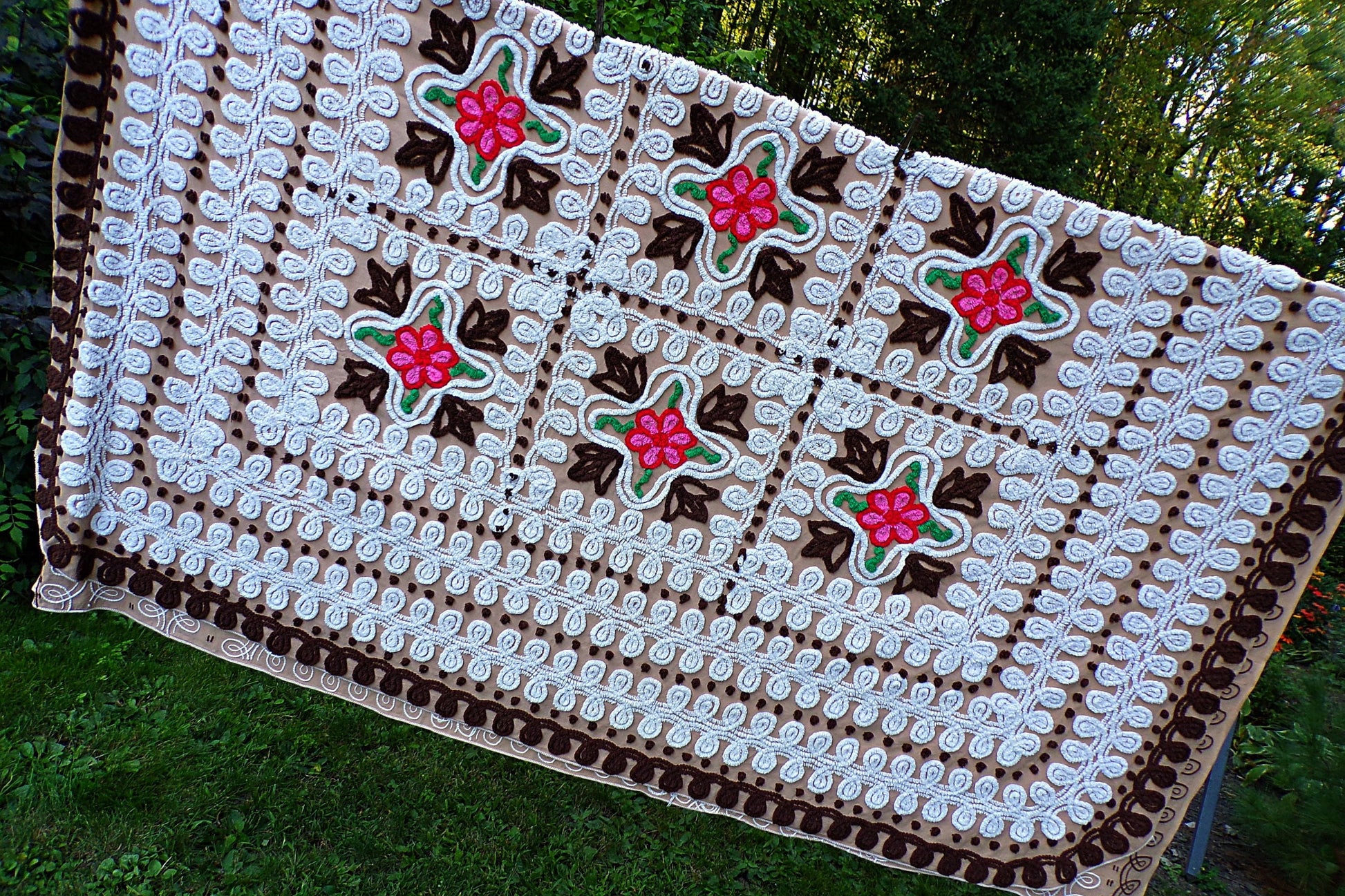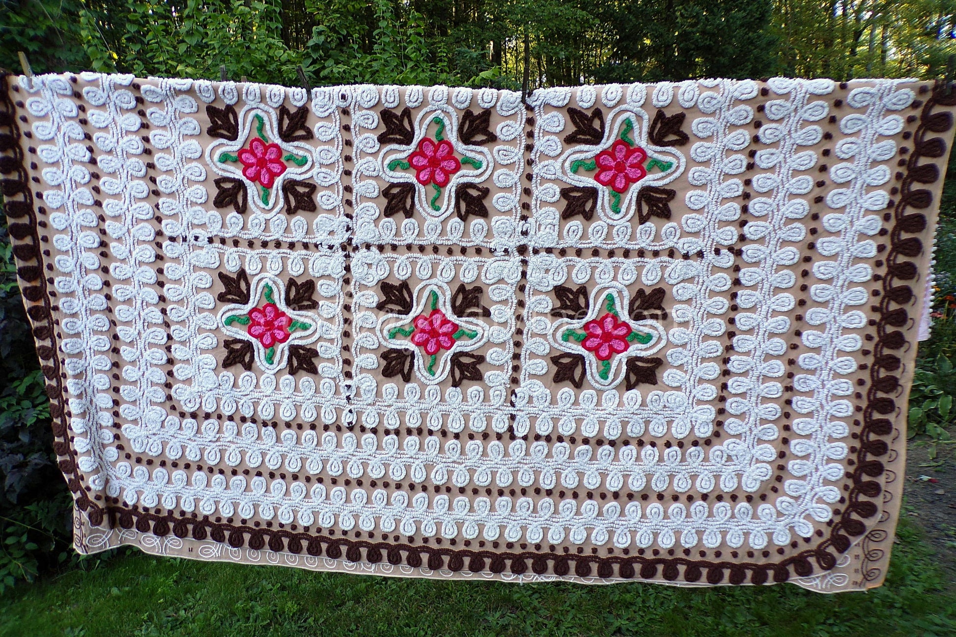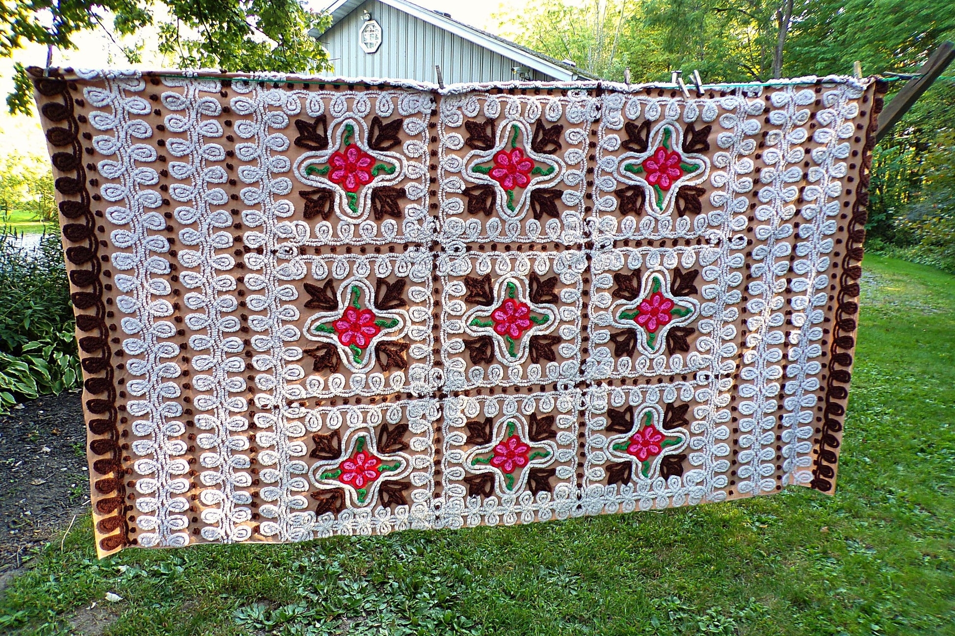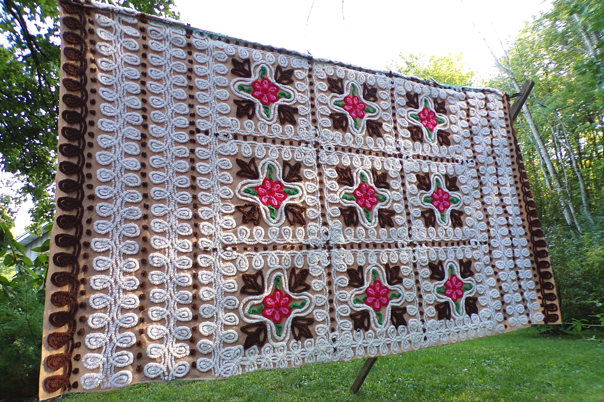 Love this boho cottagecore FULL size chenille bedspread, in a rare pattern and colorway. If you appreciate the bold & the beautiful, you'll fall in love with this incredible vintage spread that is waiting to become the focal point of whatever room you choose to place it in.A creamy mocha cotton groundcloth is tufted with frosty white swirls & twirls of curlicues that wrap around prominently positioned quilt style blocks. Each block showcases a single deep pink rose flower.