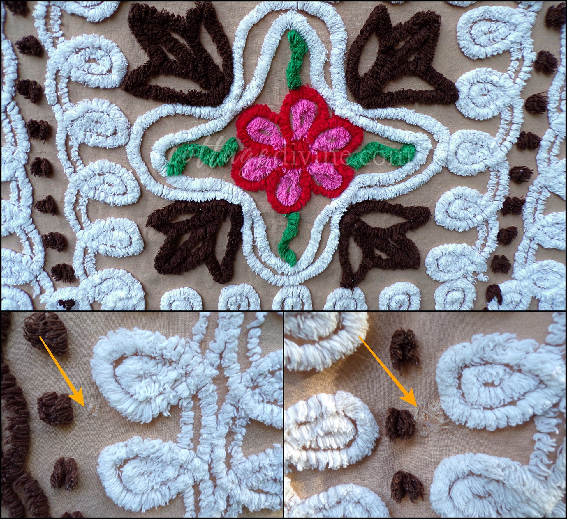 While this bedspread is in great condition given its age, it does have a few scattered small holes, such as seen final img. Reach out if you would like to see additional photos.