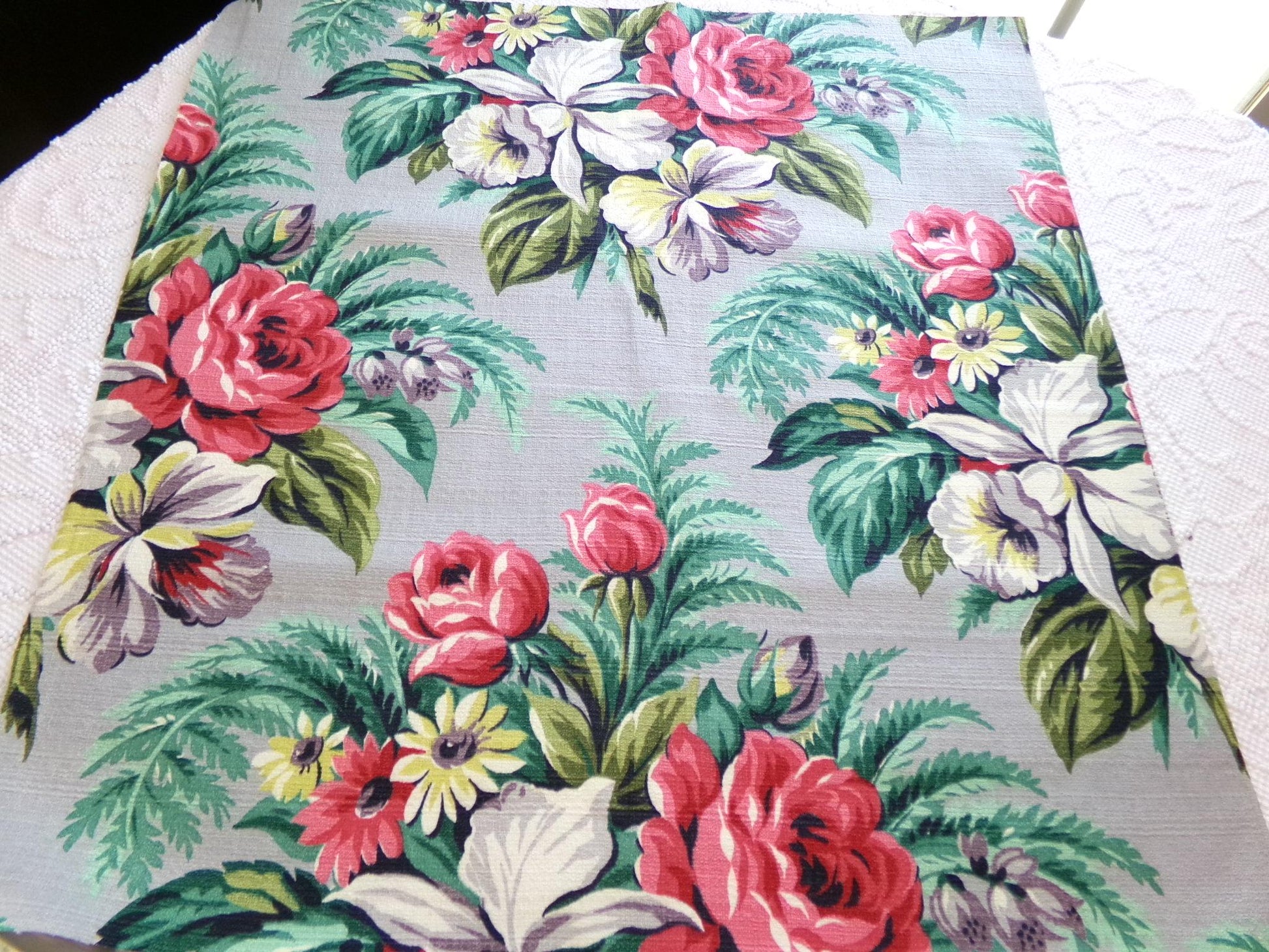 Absolutely beautiful piece of vintage barkcloth fabric featuring a showy botanical floral print on a silvery grey bkgd. Measures about 22" x 23" inches. An ideal piece for pillows or to upcycle into a wall hanging. Note some natural slub lines to fabric, as seen final img.w h a t - t o - k n o w