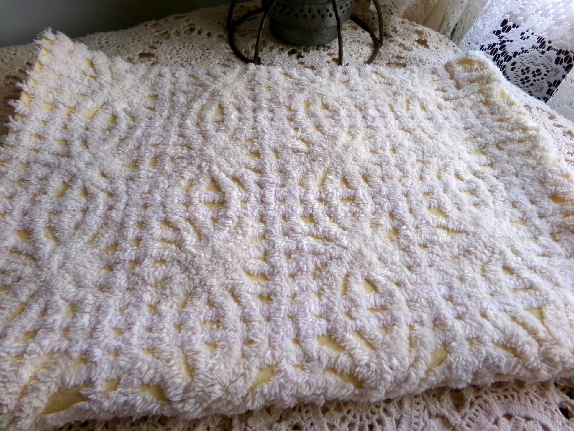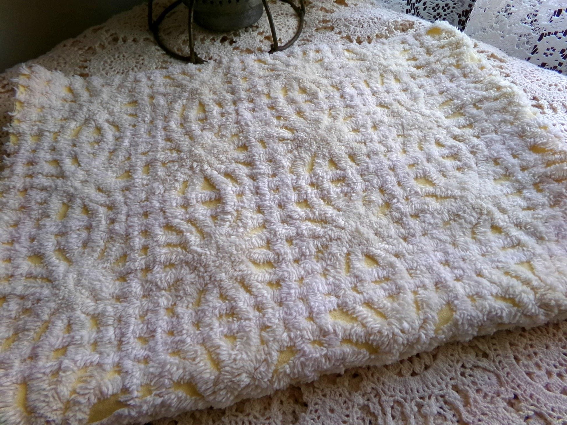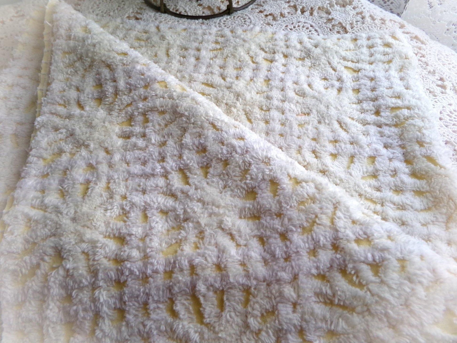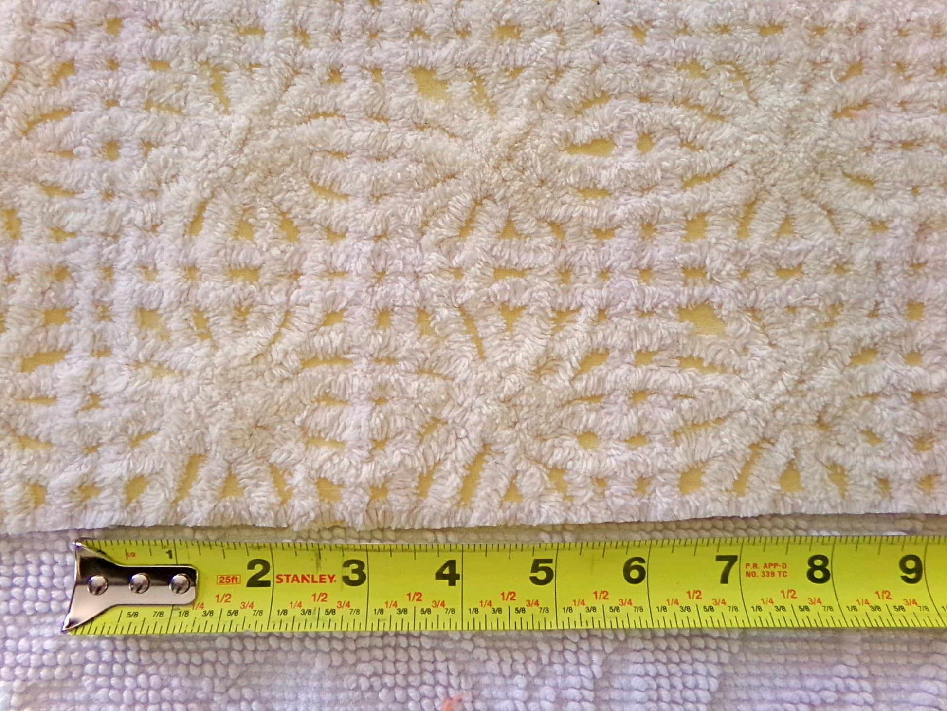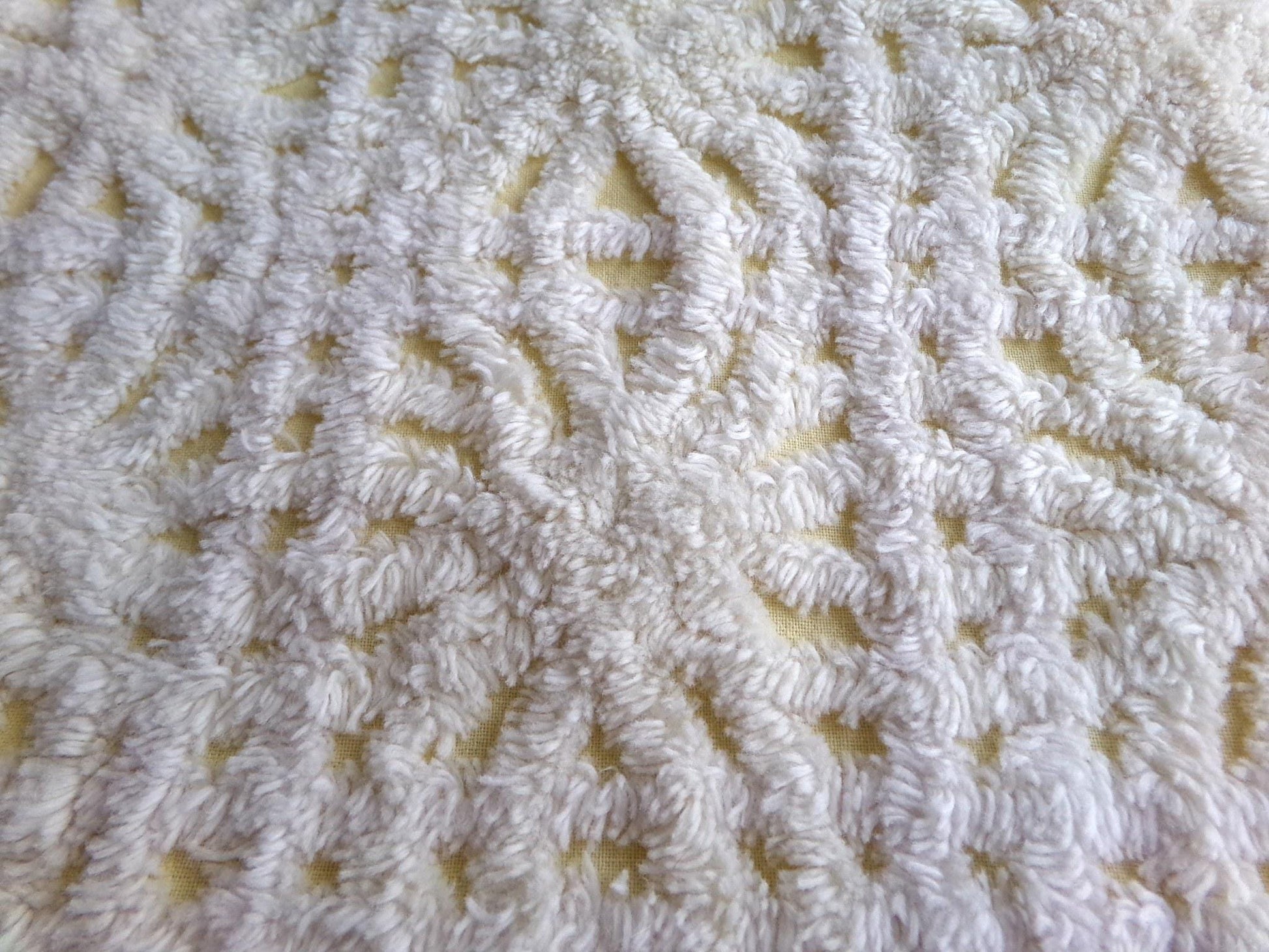Bring a soft springtime essence to your creative design with this piece of vintage chenille fabric in a nostalgic buttercup yellow. A densely tufted, thick two-tone spider ring pattern adds outstanding texture, in a gentle color that doesn't overwhelm the design.Fabric piece measures approx 19" x 26" inches. Sourced from a 100% cotton original vintage chenille bedspread.