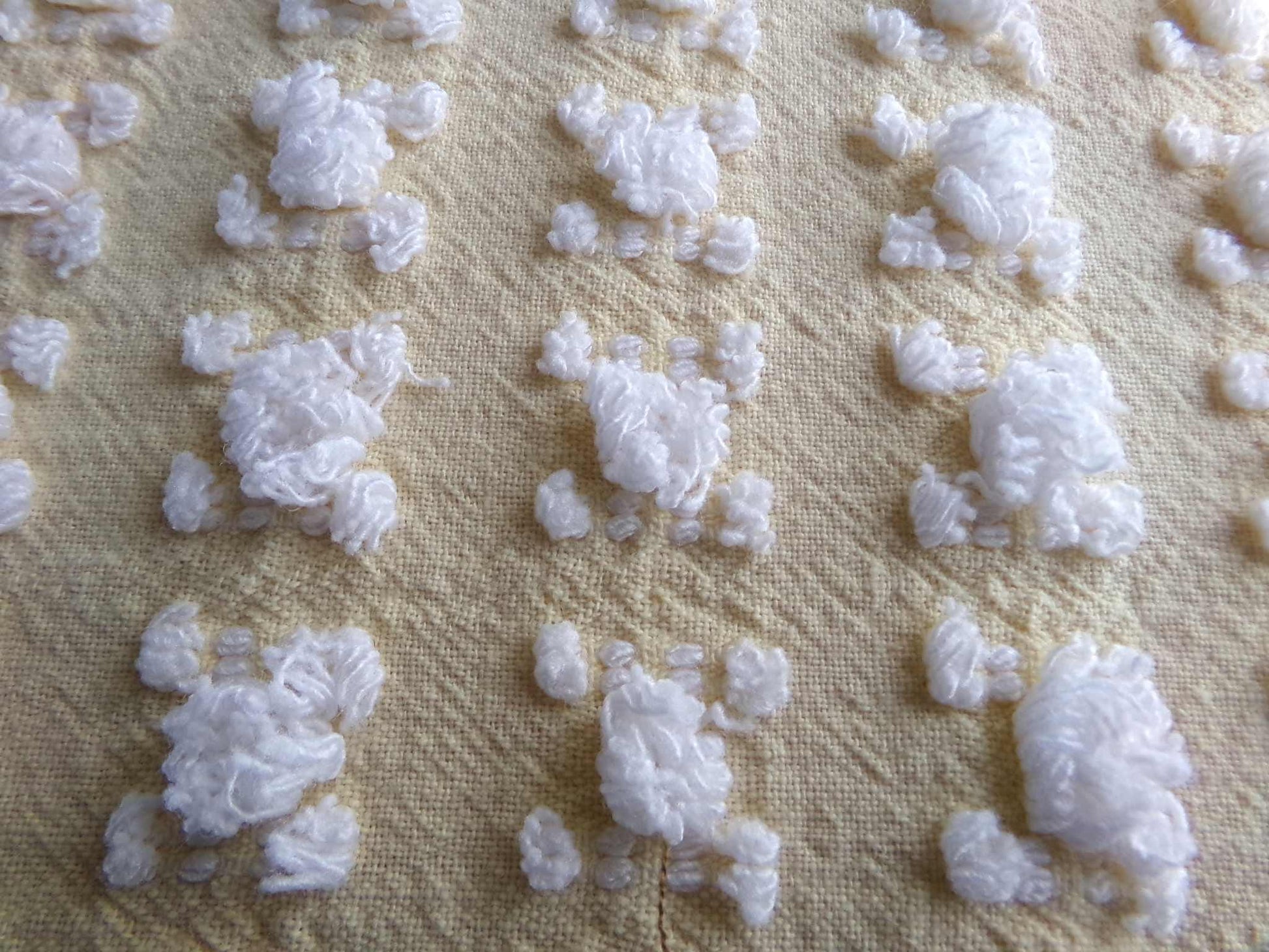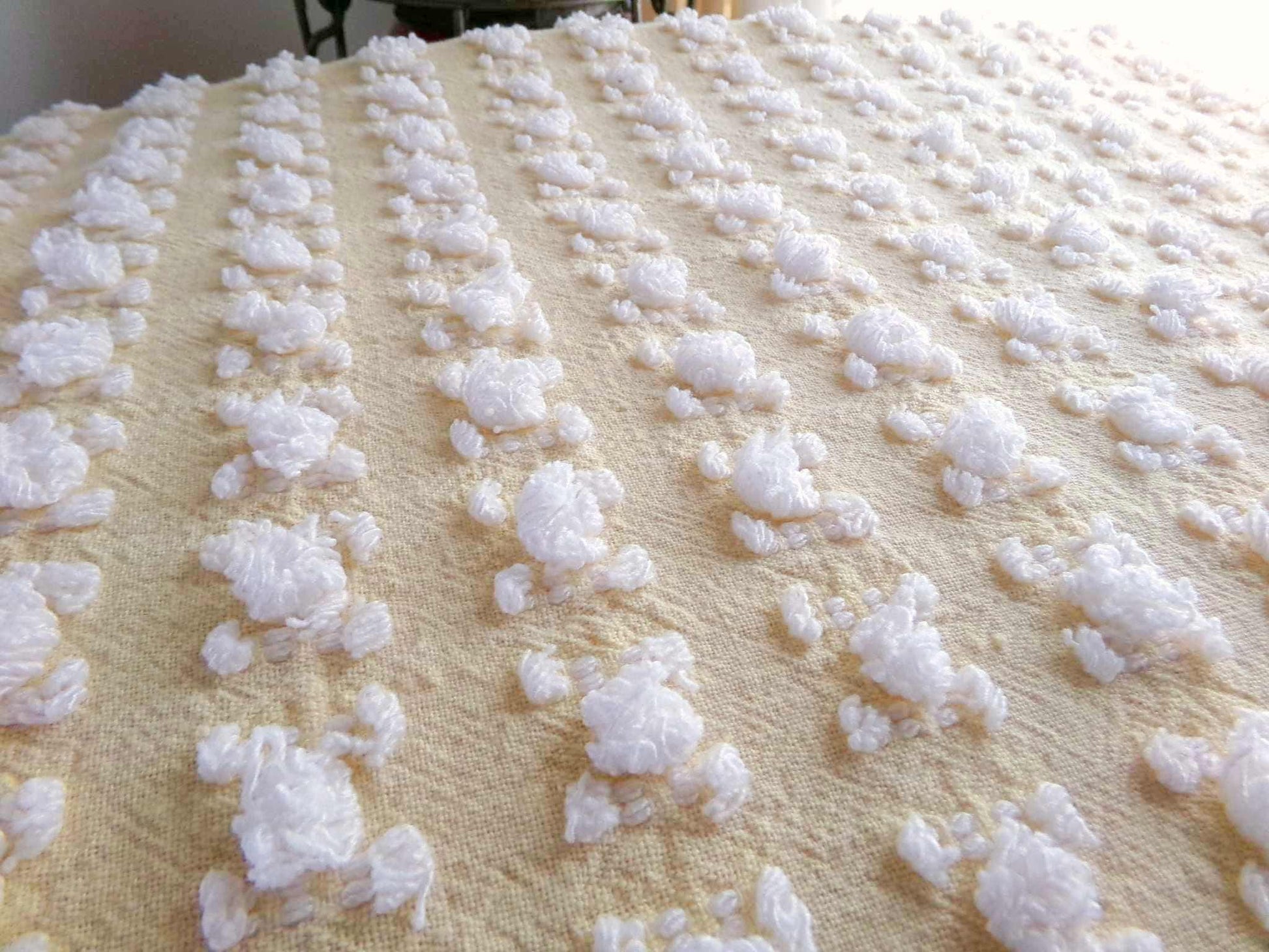 Uplift your pretty project with this piece of vintage chenille fabric. Loosely tufted white rosebuds are tufted onto a buttercup yellow background. A great way to effortlessly add cottage style sunshine into any project.Cotton or cotton blend. Fabric piece measures about 12" x 24" inches. Strong, light-weight & very easy to work with.
