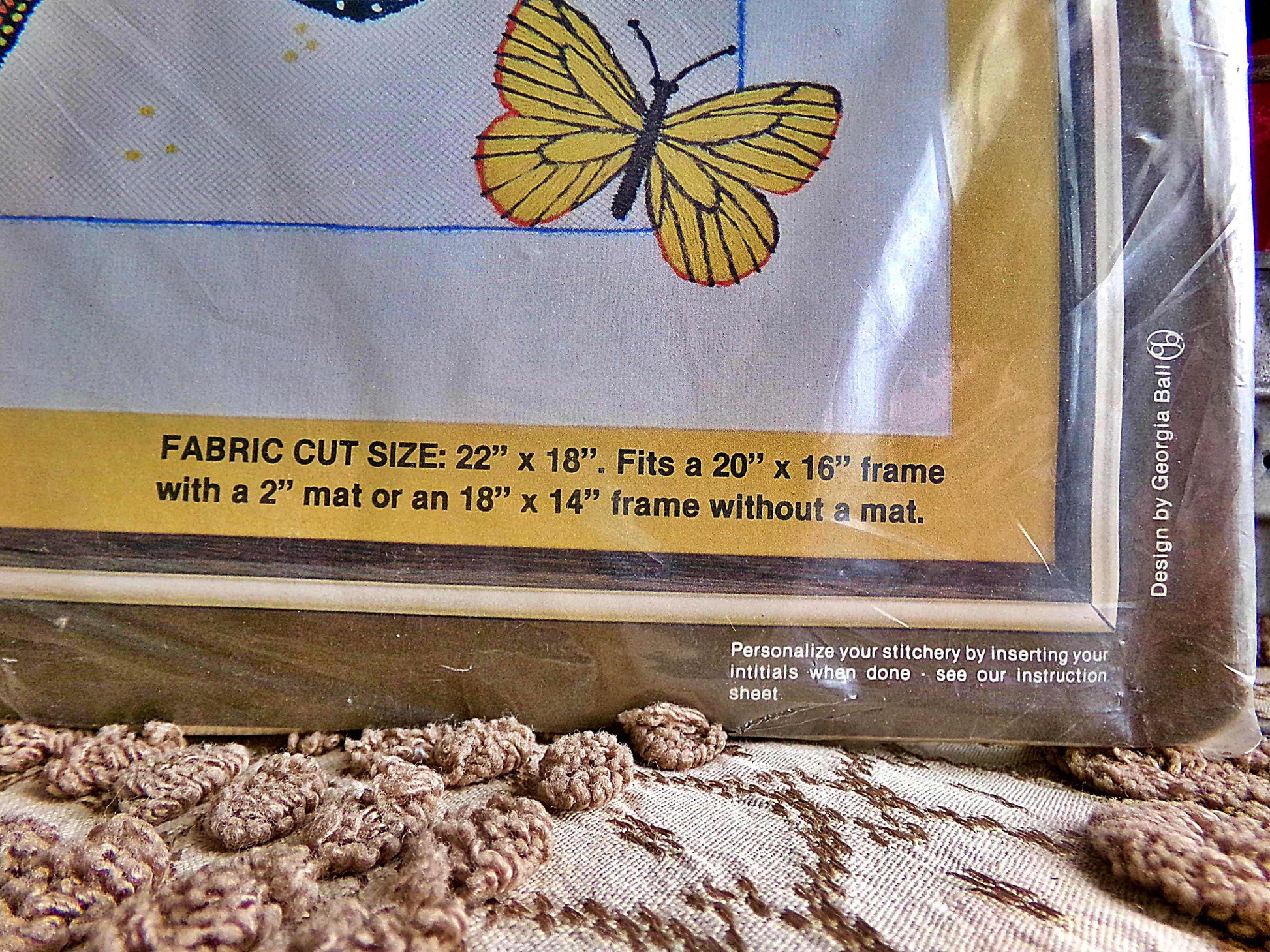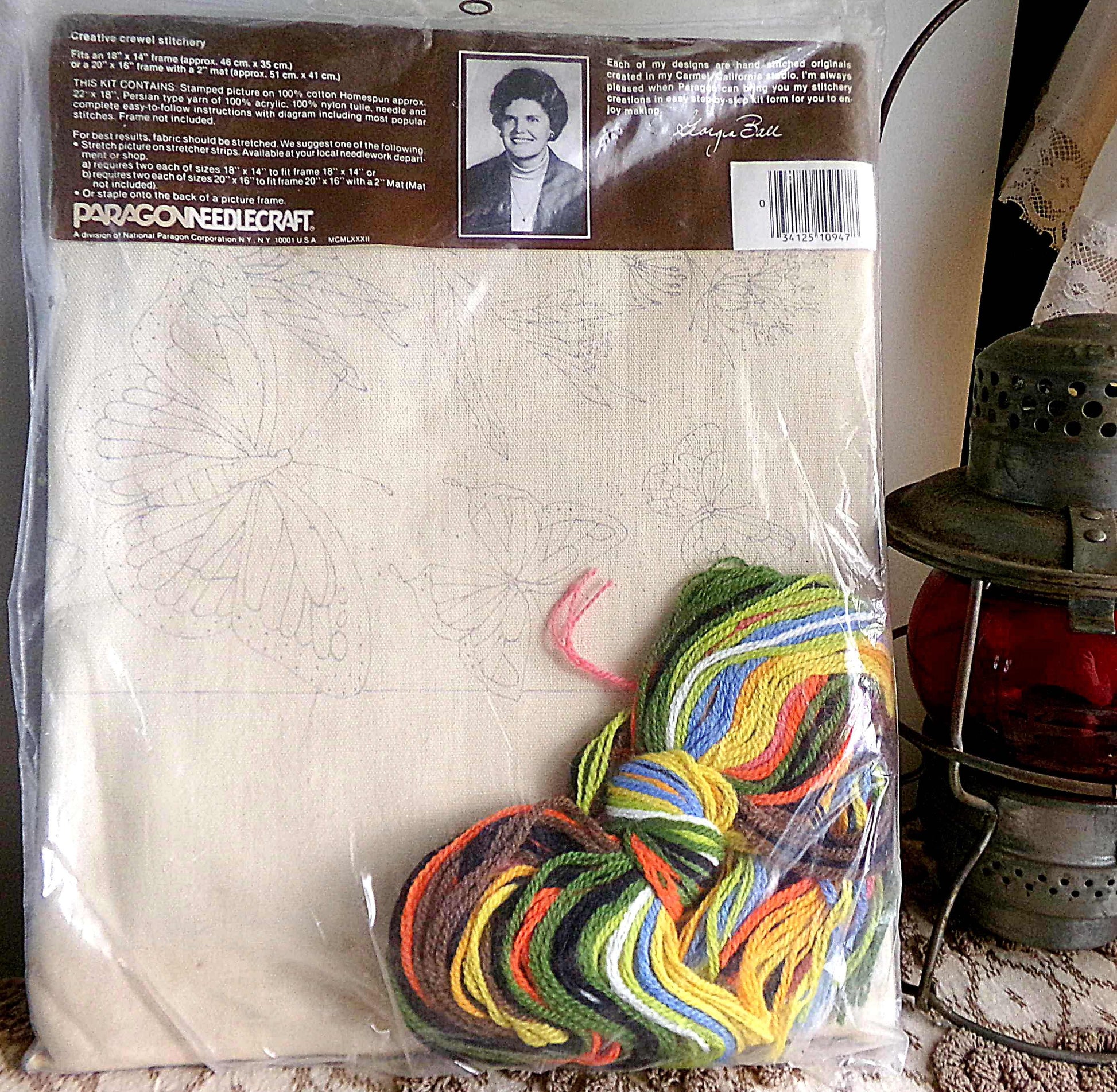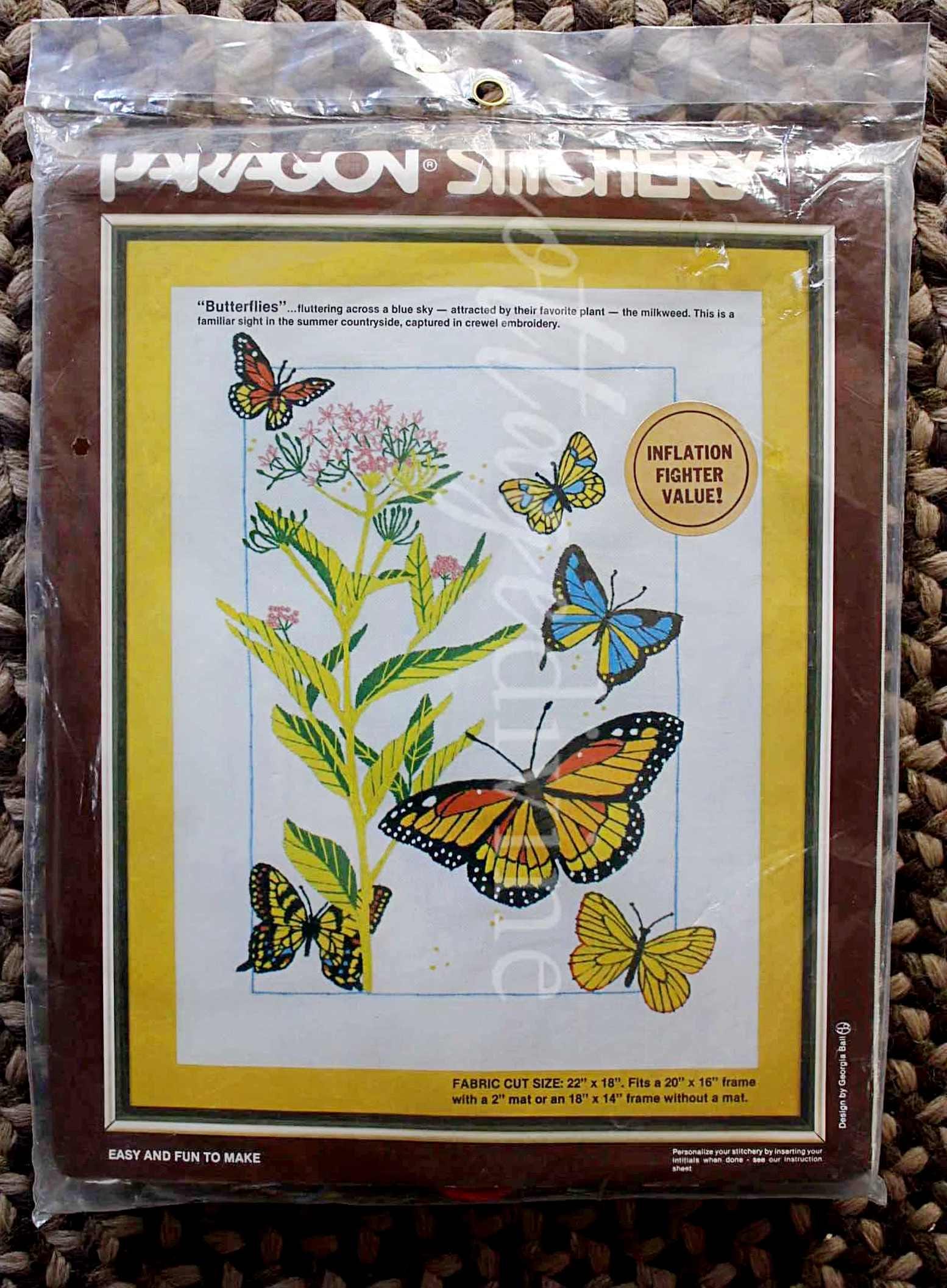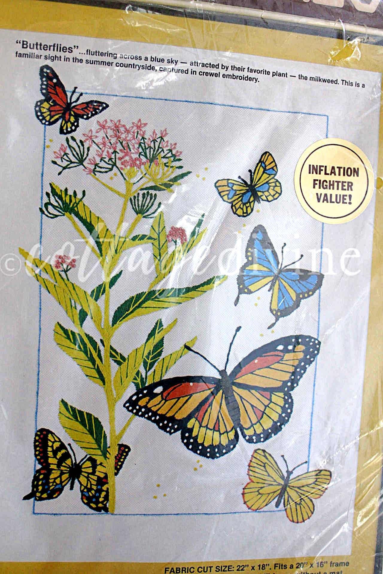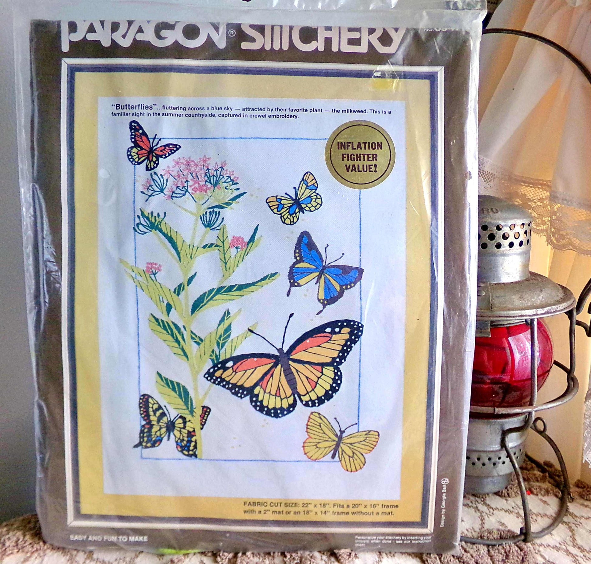 Ready to embroider..."'Butterflies'...fluttering across a blue sky - attracted by their favorite plant - the milkweed. This is a familiar sight in the summer countryside, captured in crewel embroidery."Design by Georgia Ball. A rare vintage Paragon Stitchery Kit # 0947. Intended to fit a frame size 20" x 16", with a 2" mat or 18" x 14" with no mat (frame & mat not included).
