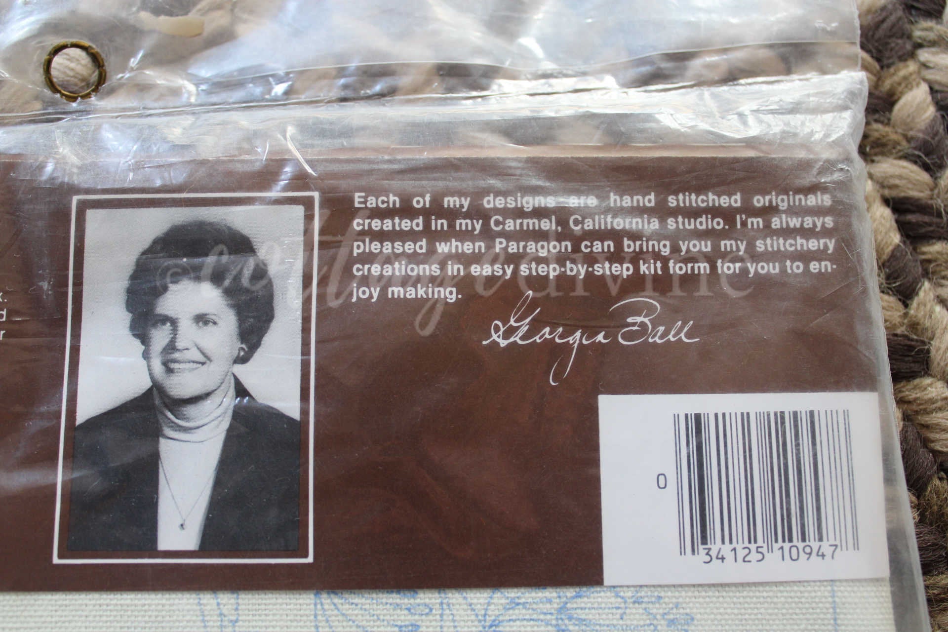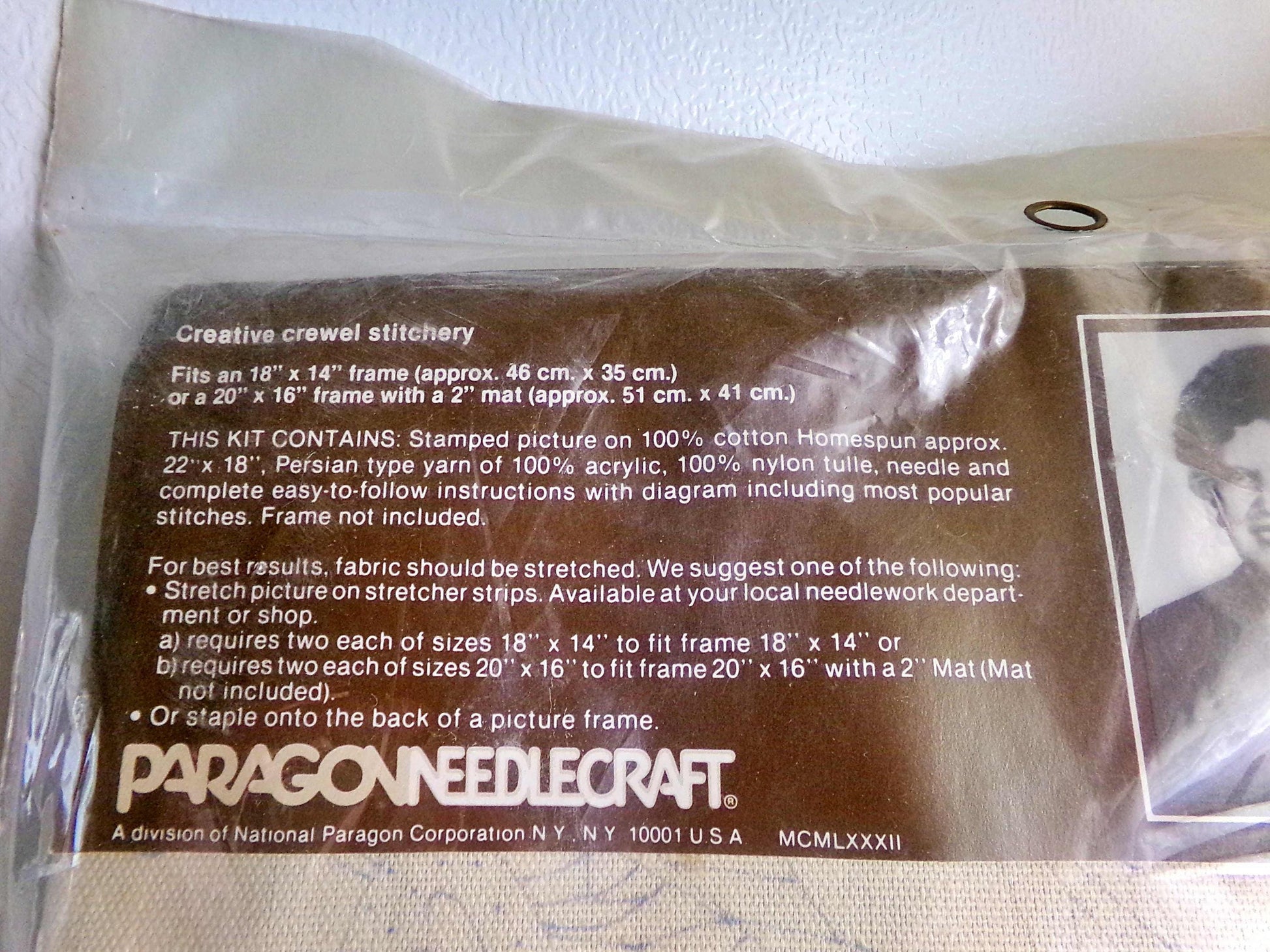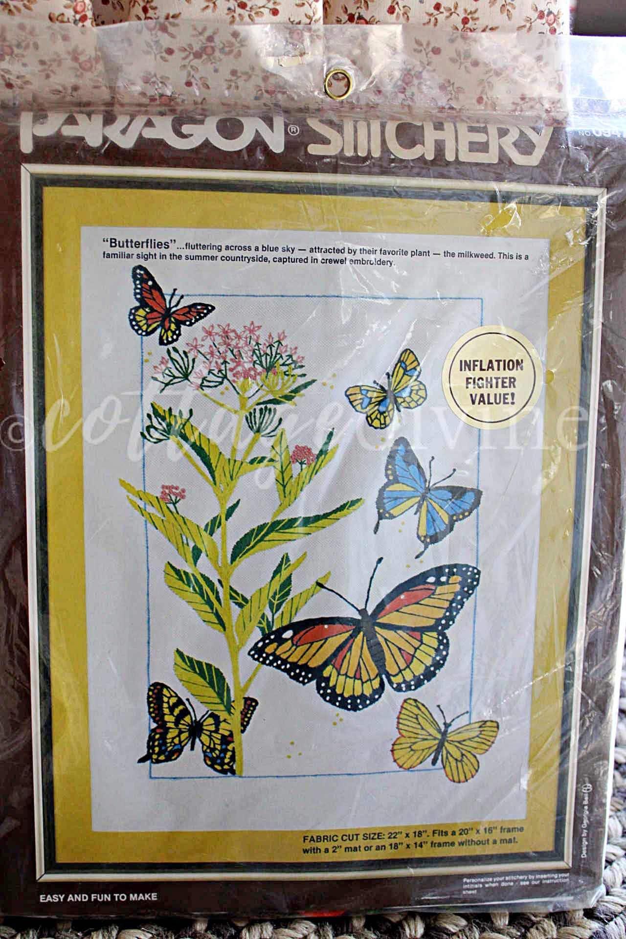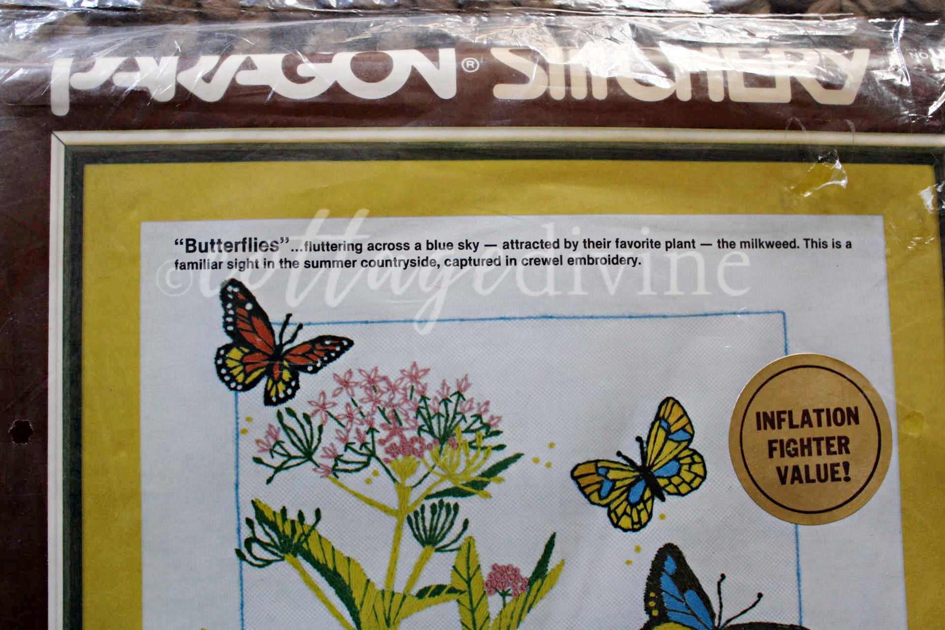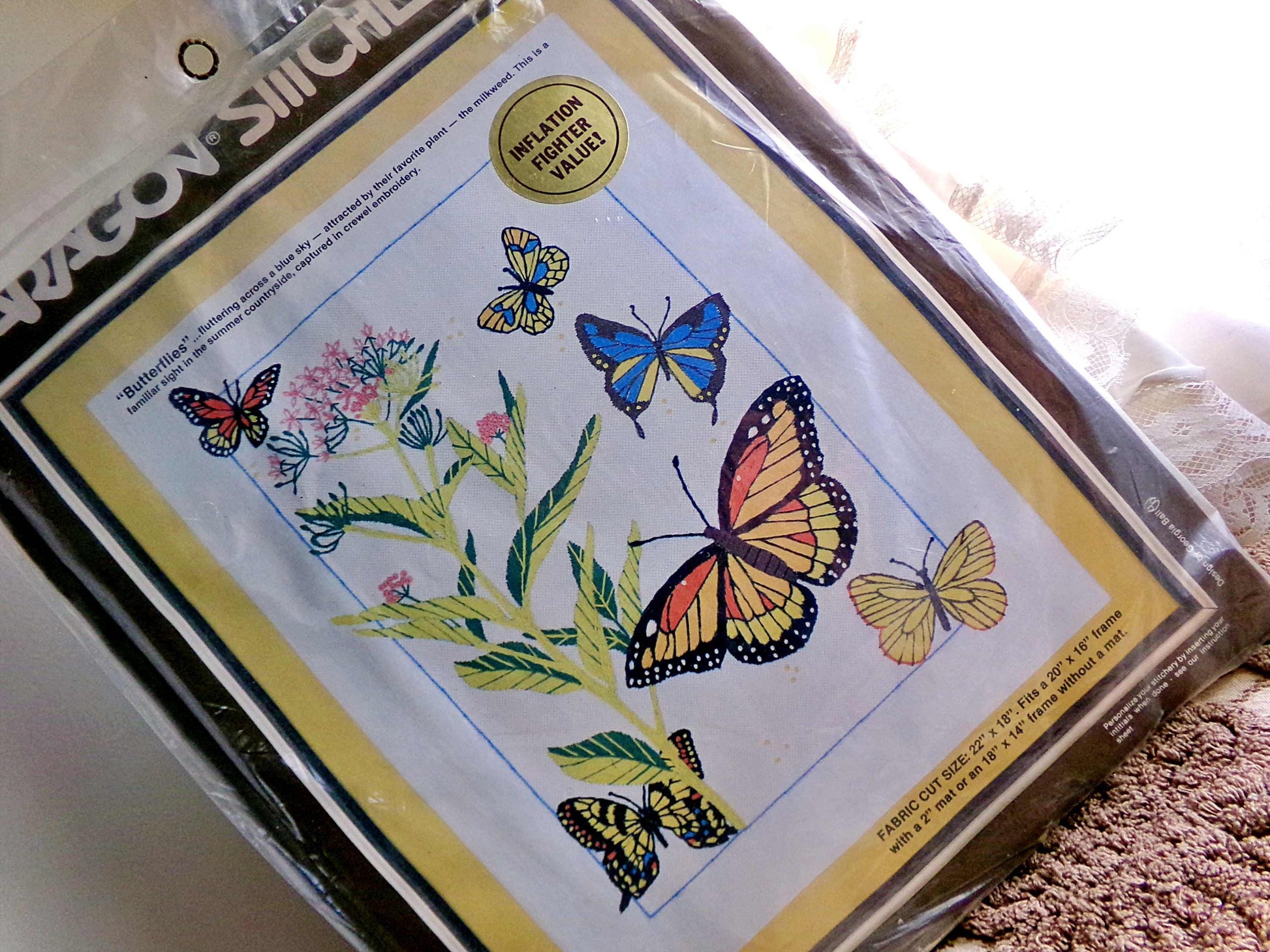 Ready to embroider..."'Butterflies'...fluttering across a blue sky - attracted by their favorite plant - the milkweed. This is a familiar sight in the summer countryside, captured in crewel embroidery."Design by Georgia Ball. A rare vintage Paragon Stitchery Kit # 0947. Intended to fit a frame size 20" x 16", with a 2" mat or 18" x 14" with no mat (frame & mat not included).