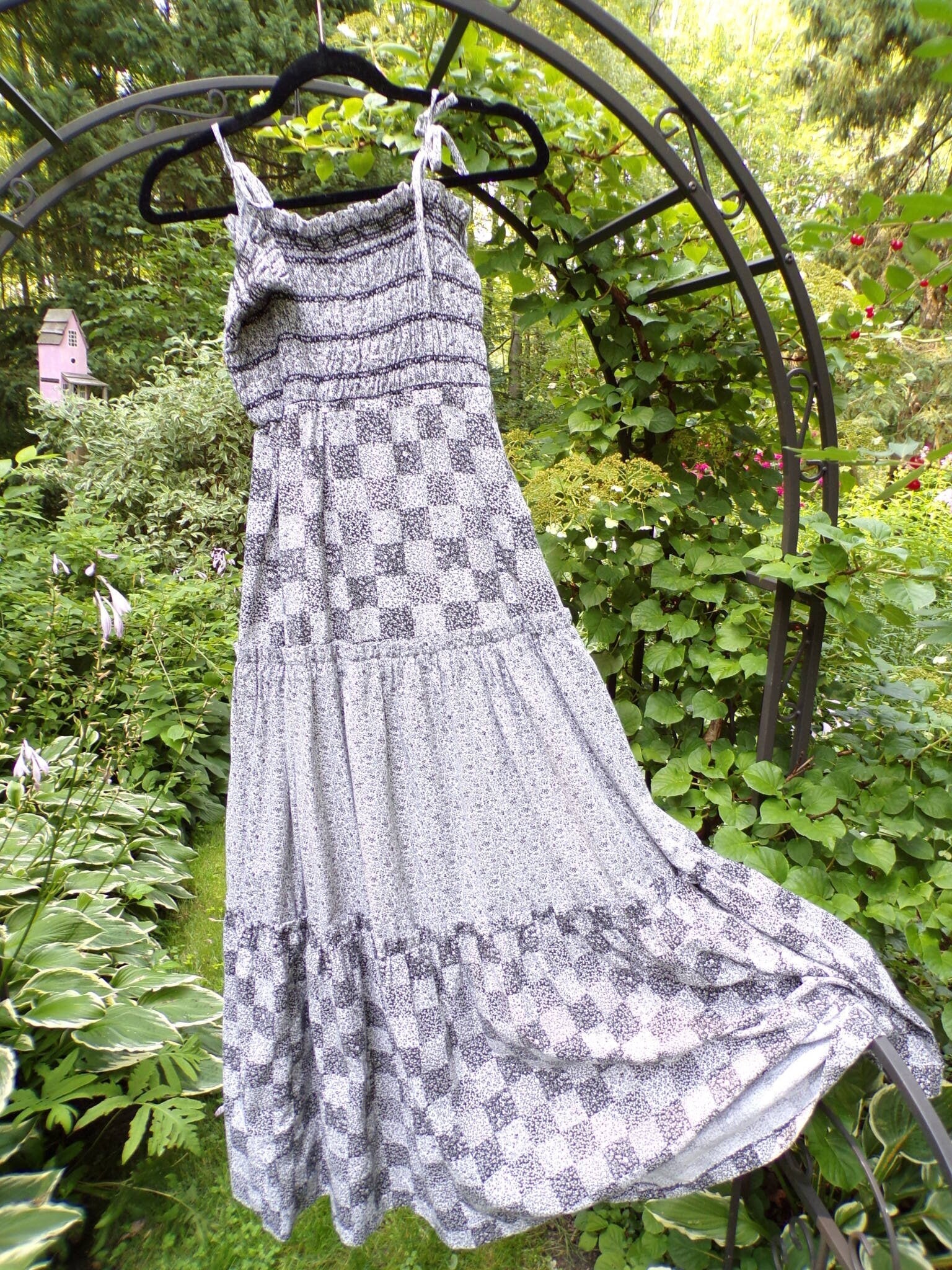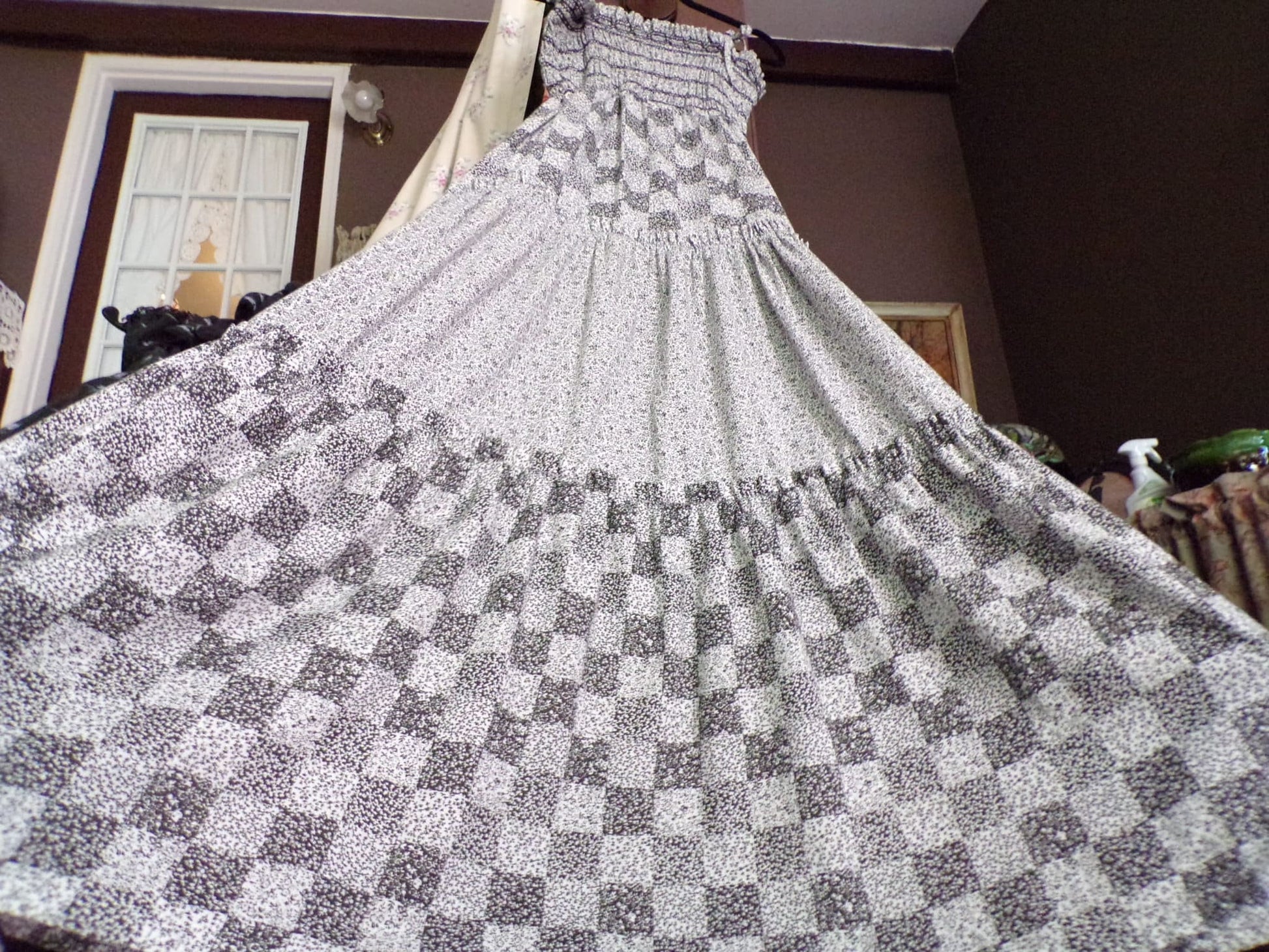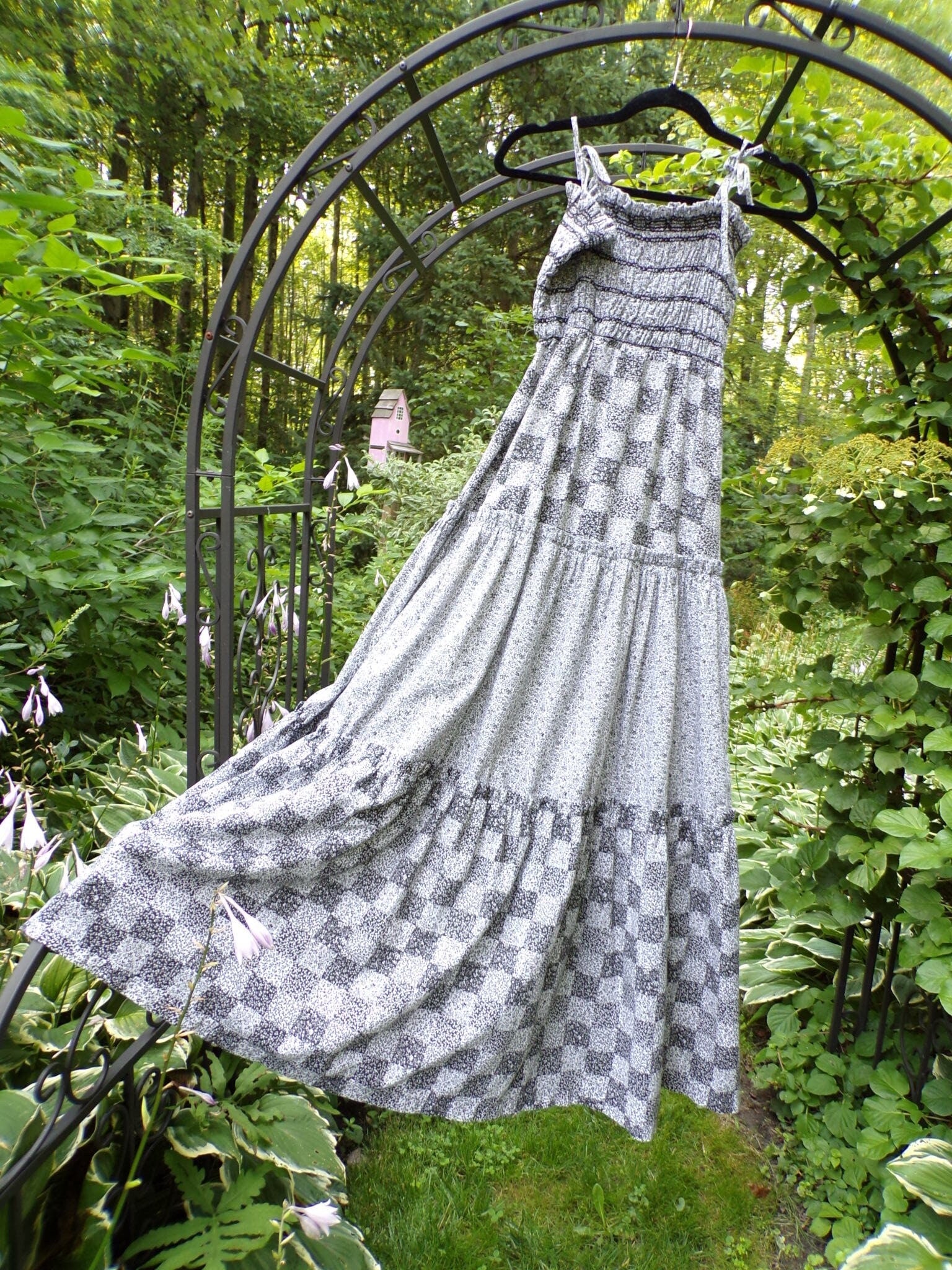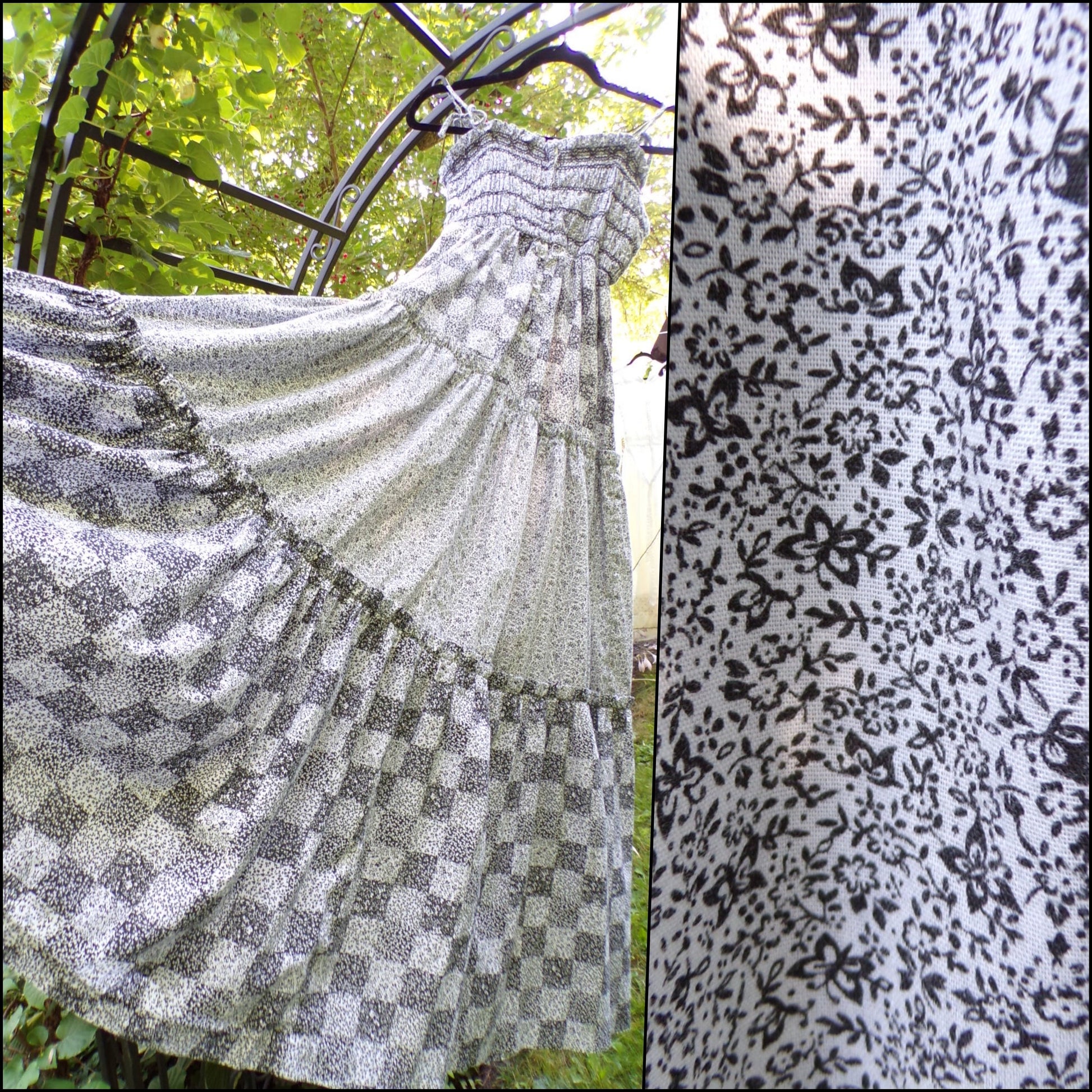 Beautiful & very unique prairie dress in a striking black & white butterfly floral calico print. By vintage label Candi Jones California. This was a Jr. size 13, but the tag has long fallen off; only the original brand tag remains.Skinny spaghetti tie straps at shoulders...smocked bodice...flowing tiered silhouette that's very figure flattering. Soft lightweight cotton or cotton blend fabric perfect for summer or boho themed photoshoots.