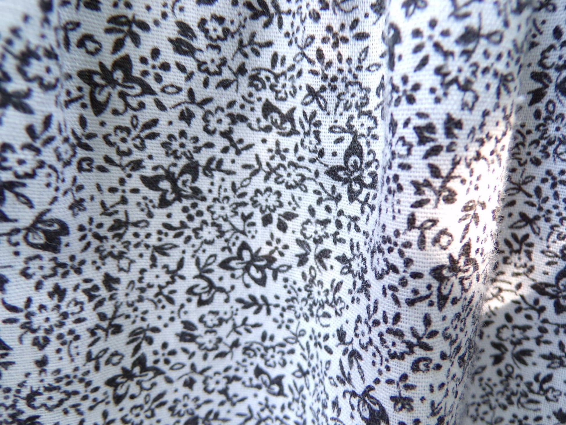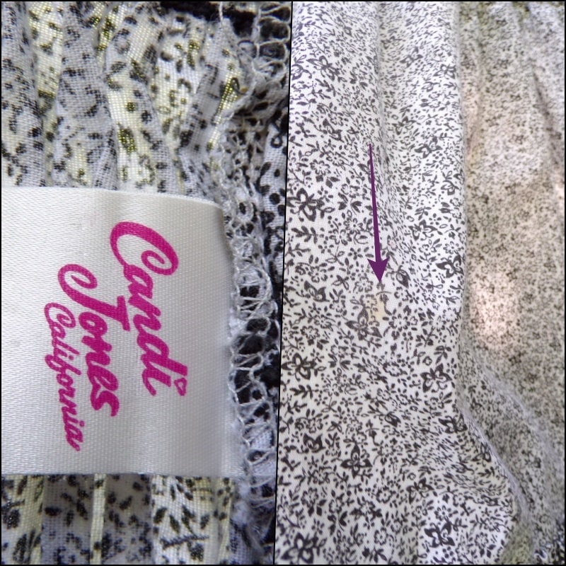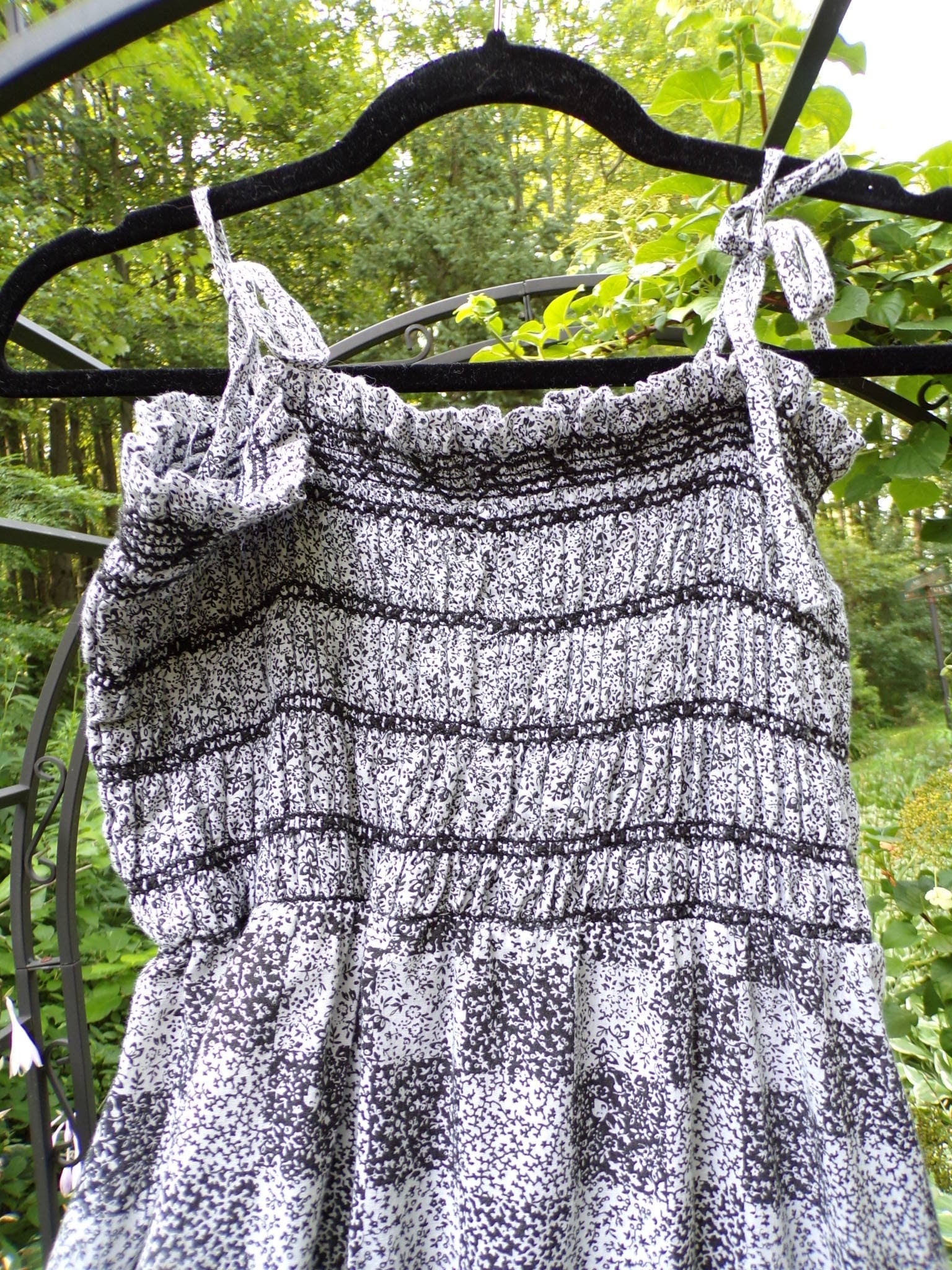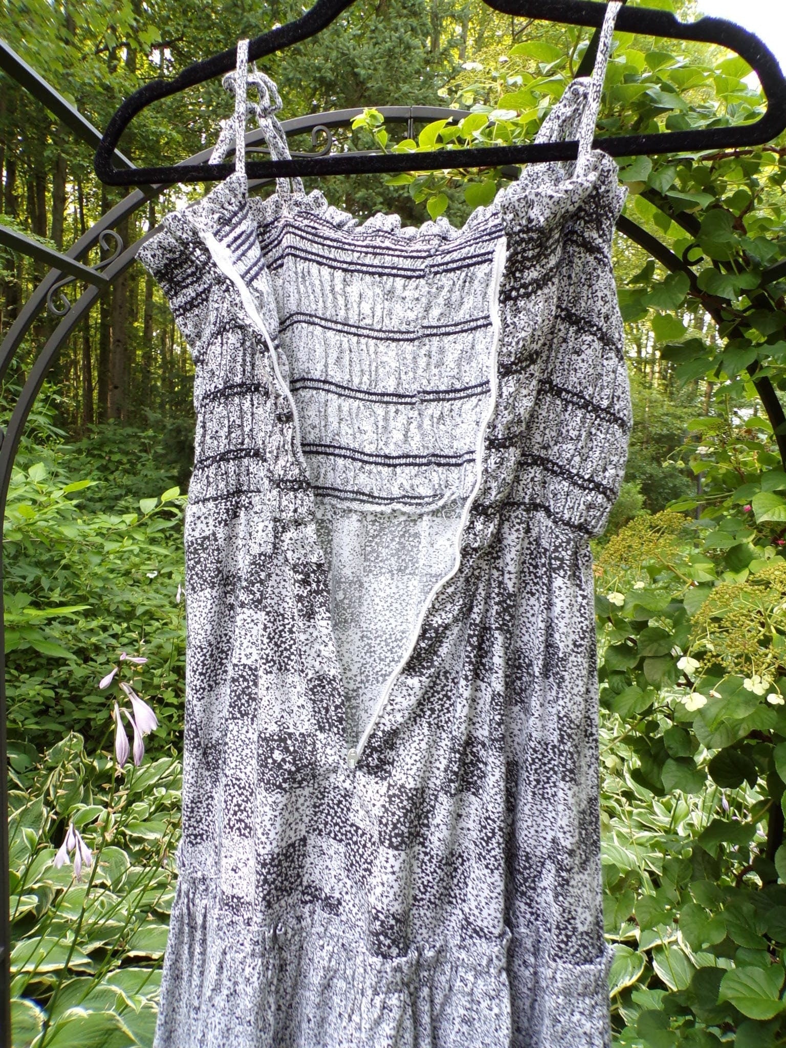 Beautiful & very unique prairie dress in a striking black & white butterfly floral calico print. By vintage label Candi Jones California. This was a Jr. size 13, but the tag has long fallen off; only the original brand tag remains.Skinny spaghetti tie straps at shoulders...smocked bodice...flowing tiered silhouette that's very figure flattering. Soft lightweight cotton or cotton blend fabric perfect for summer or boho themed photoshoots.