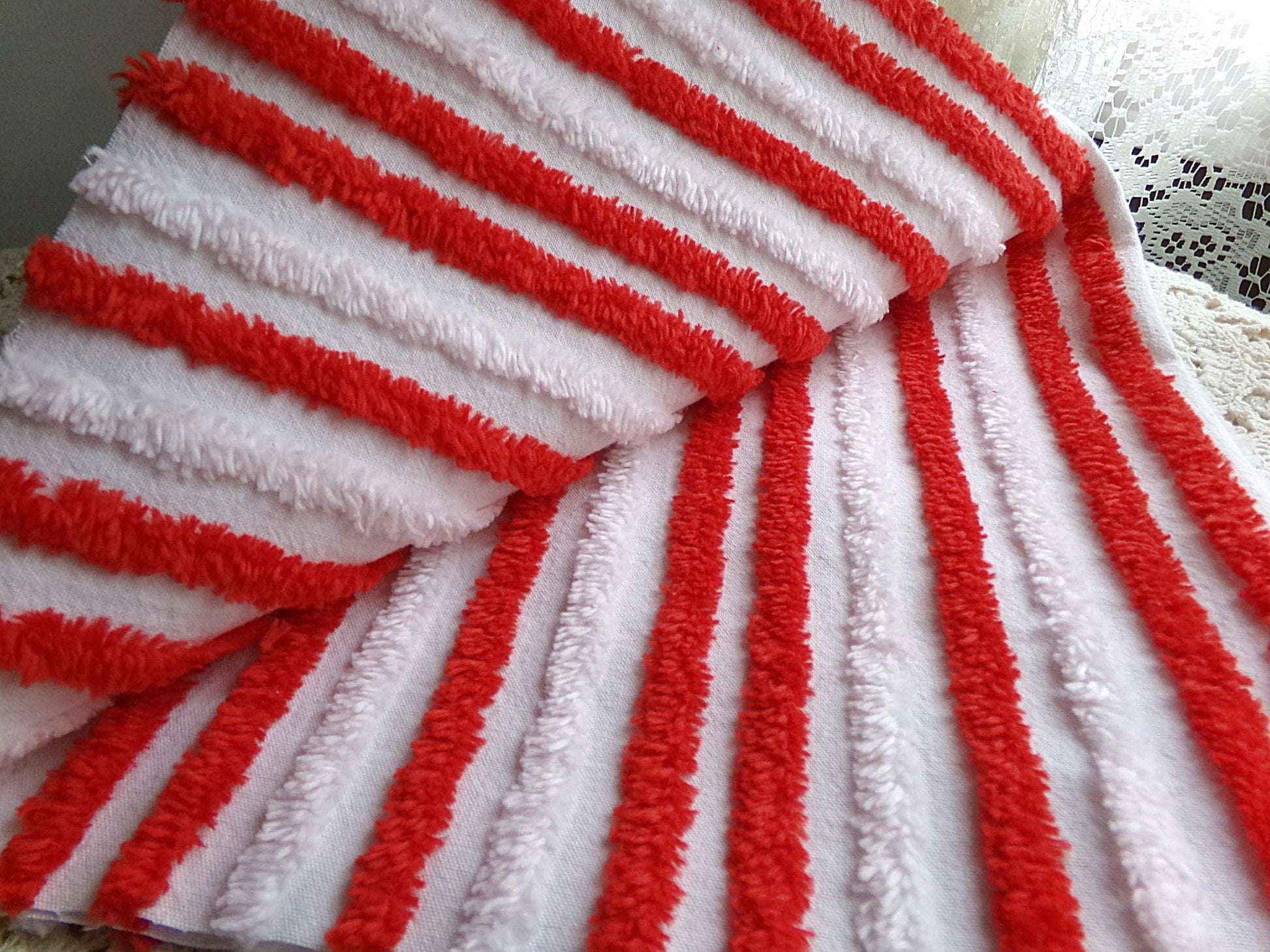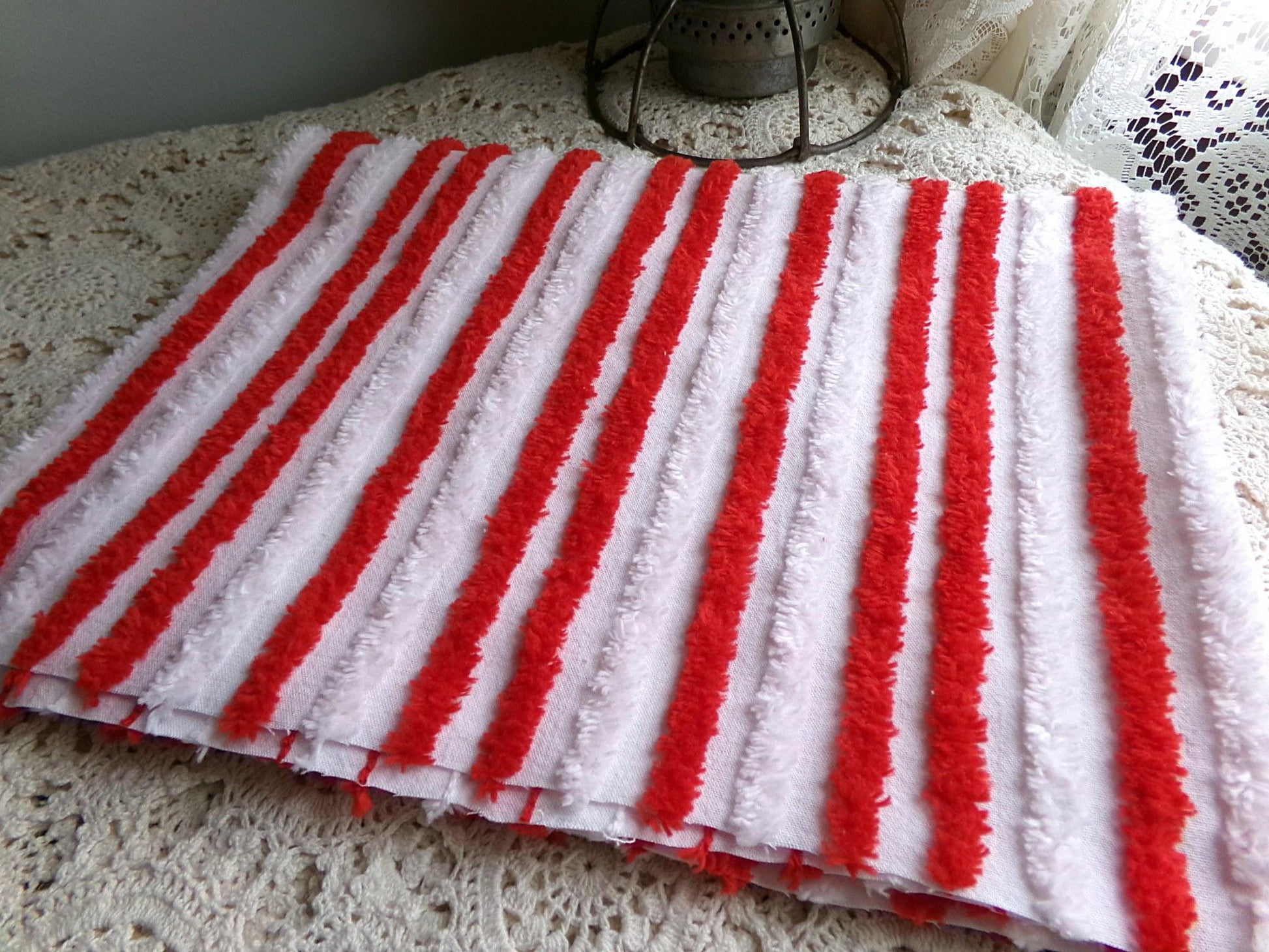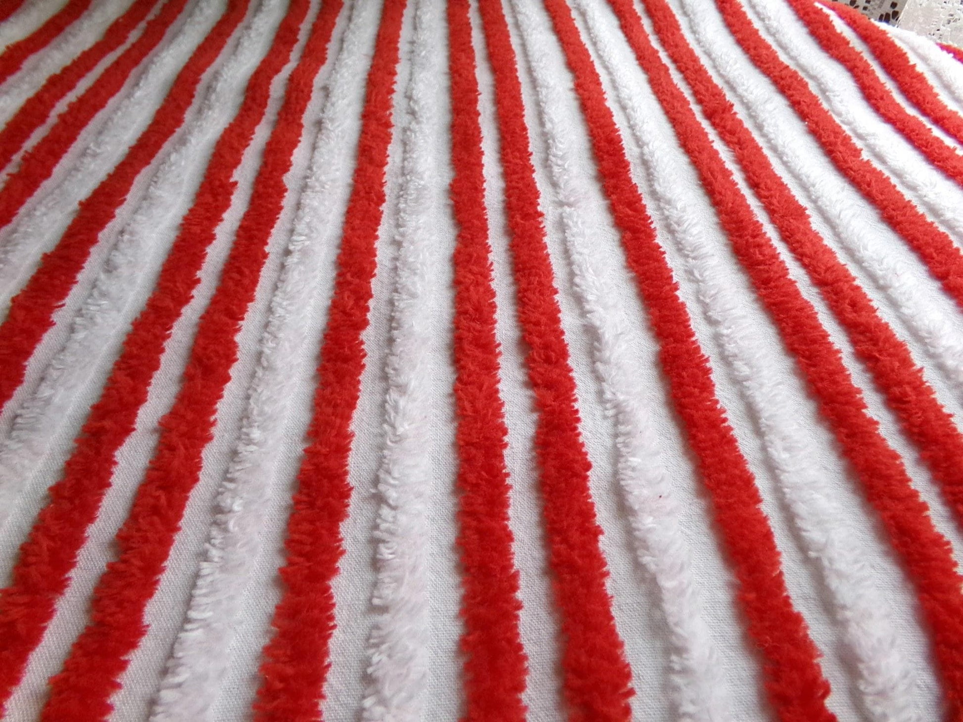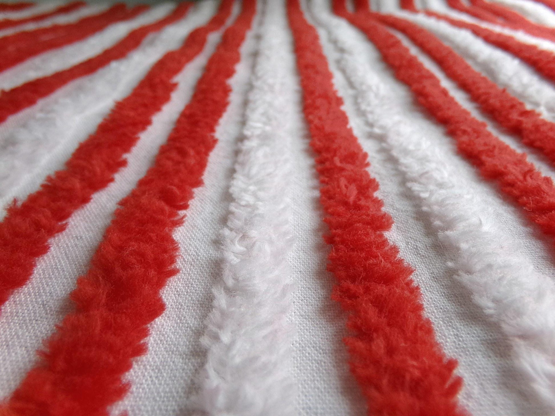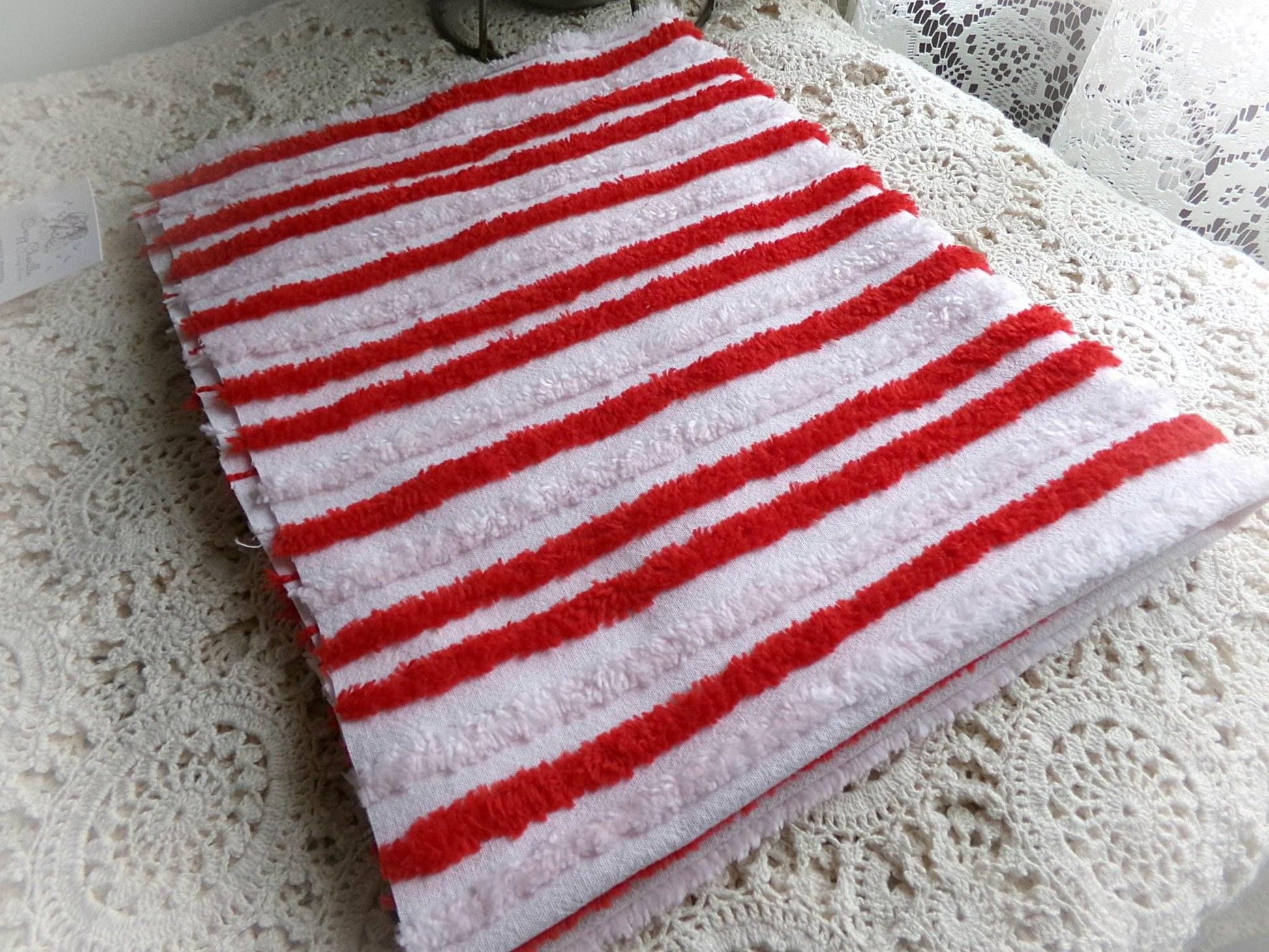 Add an instant pop of festive color to your project with this fun piece of vintage chenille fabric. Itpresents a vibrant display of red and white stripes on a white bkgd. A great fabric for Xmas stockings & trees.