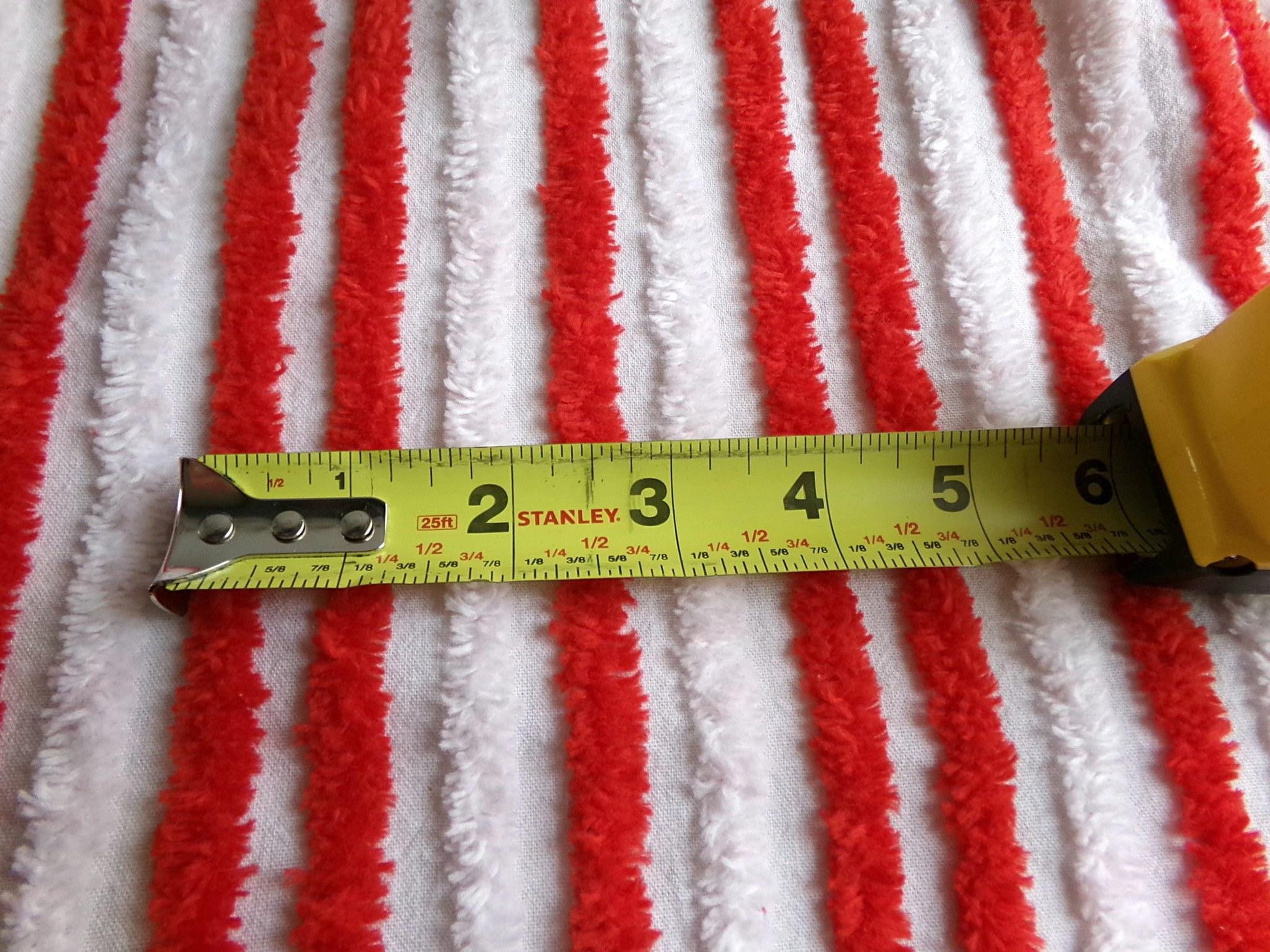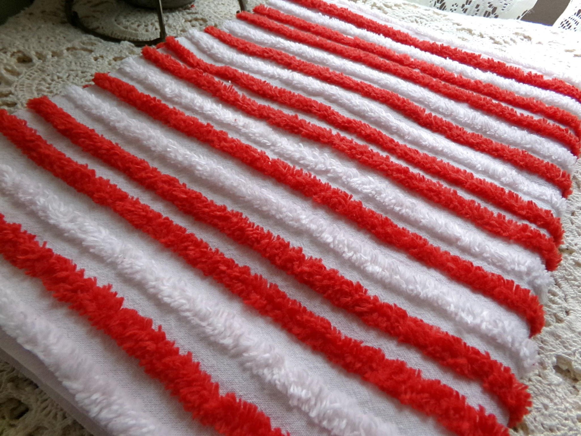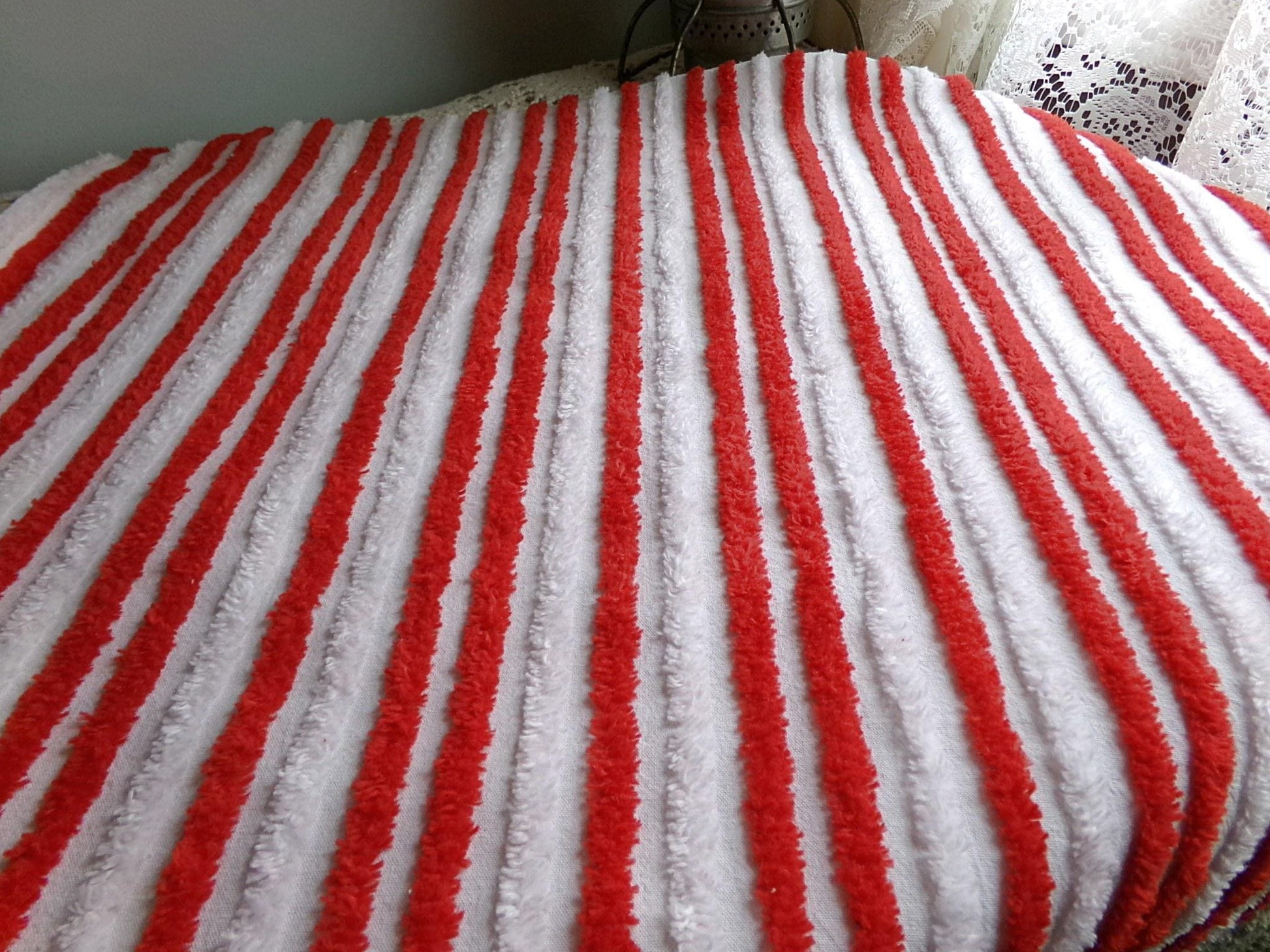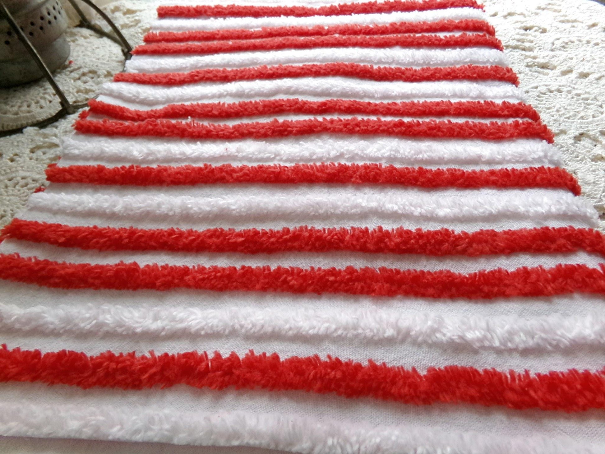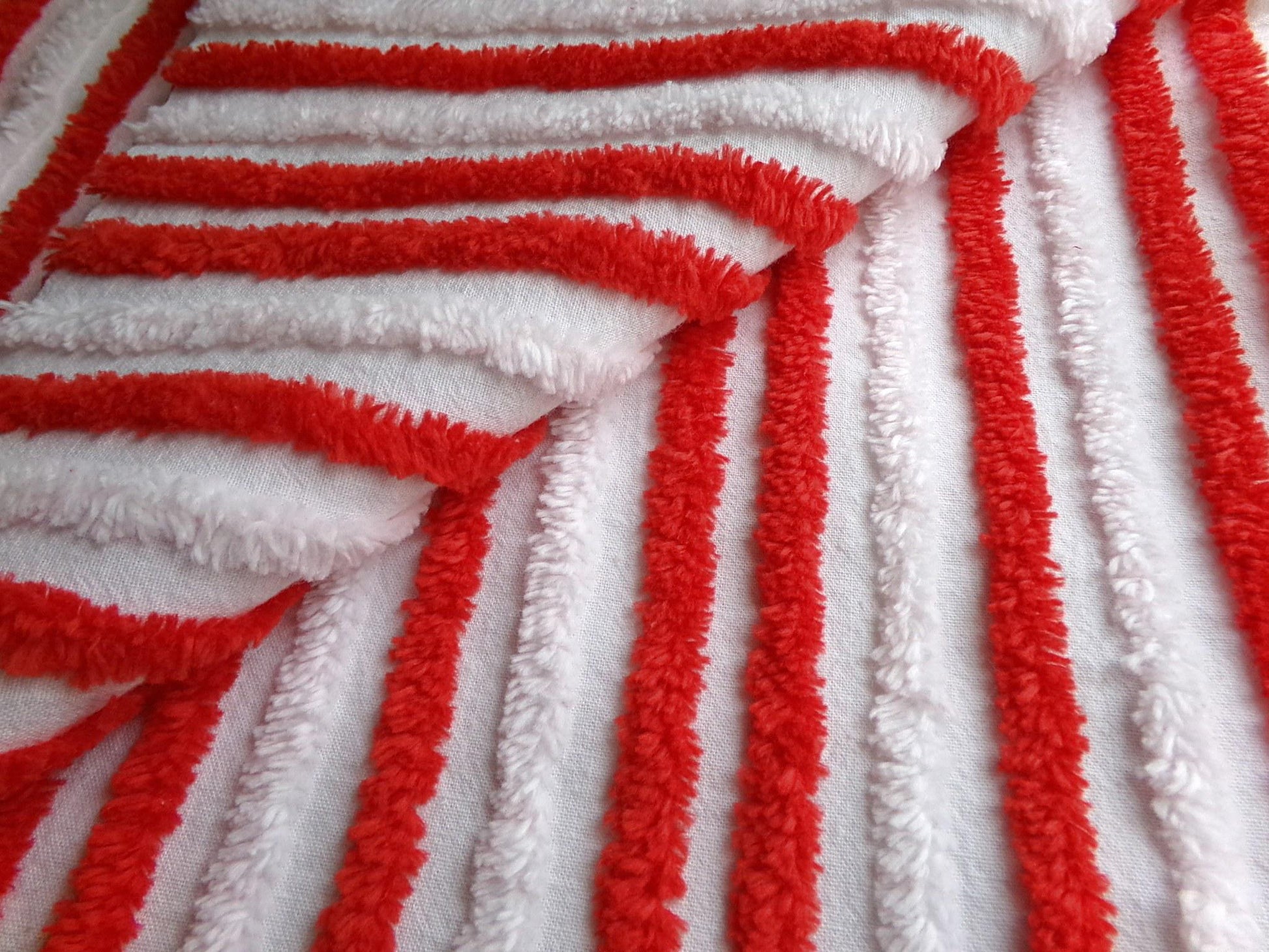 Add an instant pop of festive color to your project with this fun piece of vintage chenille fabric. Itpresents a vibrant display of red and white stripes on a white bkgd. A great fabric for Xmas stockings & trees.