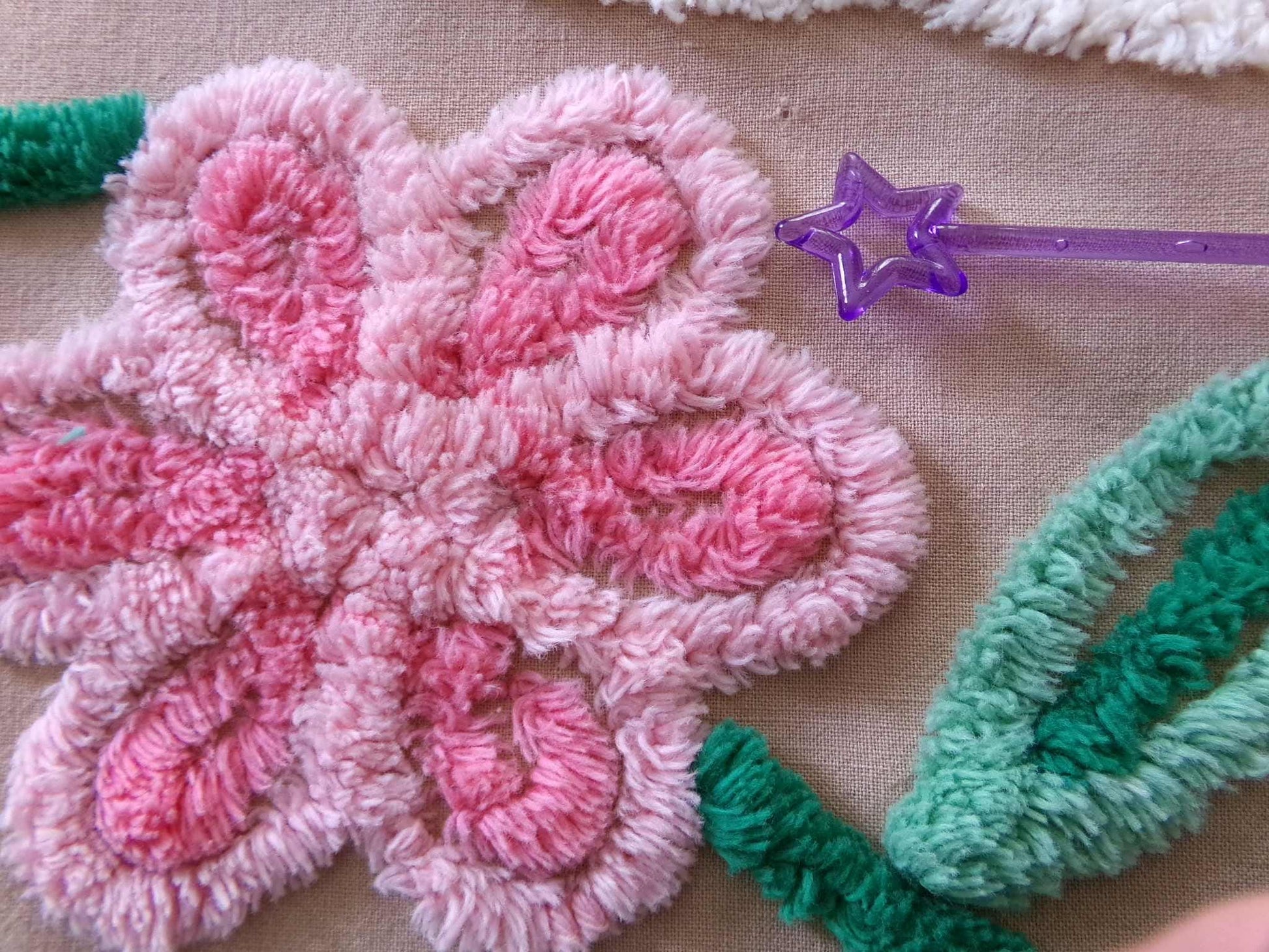 Boho style shabby sweet piece of vintage chenille fabric in a great color that is seldom seen - a honey caramel. Three colorful flowers - 2 pink and 1 yellow - are accented by contrast curlicues.Fabric measures approx 16.5" x 19.5" inches. 100% lightweight cotton, circa early 1940s era. Shabby attributes include a few pinholes & skipped tufts, etc. common to the material (see final imgs). Pretty in quilts, DIY pillow designs, or even incorporated into a wall hanging.