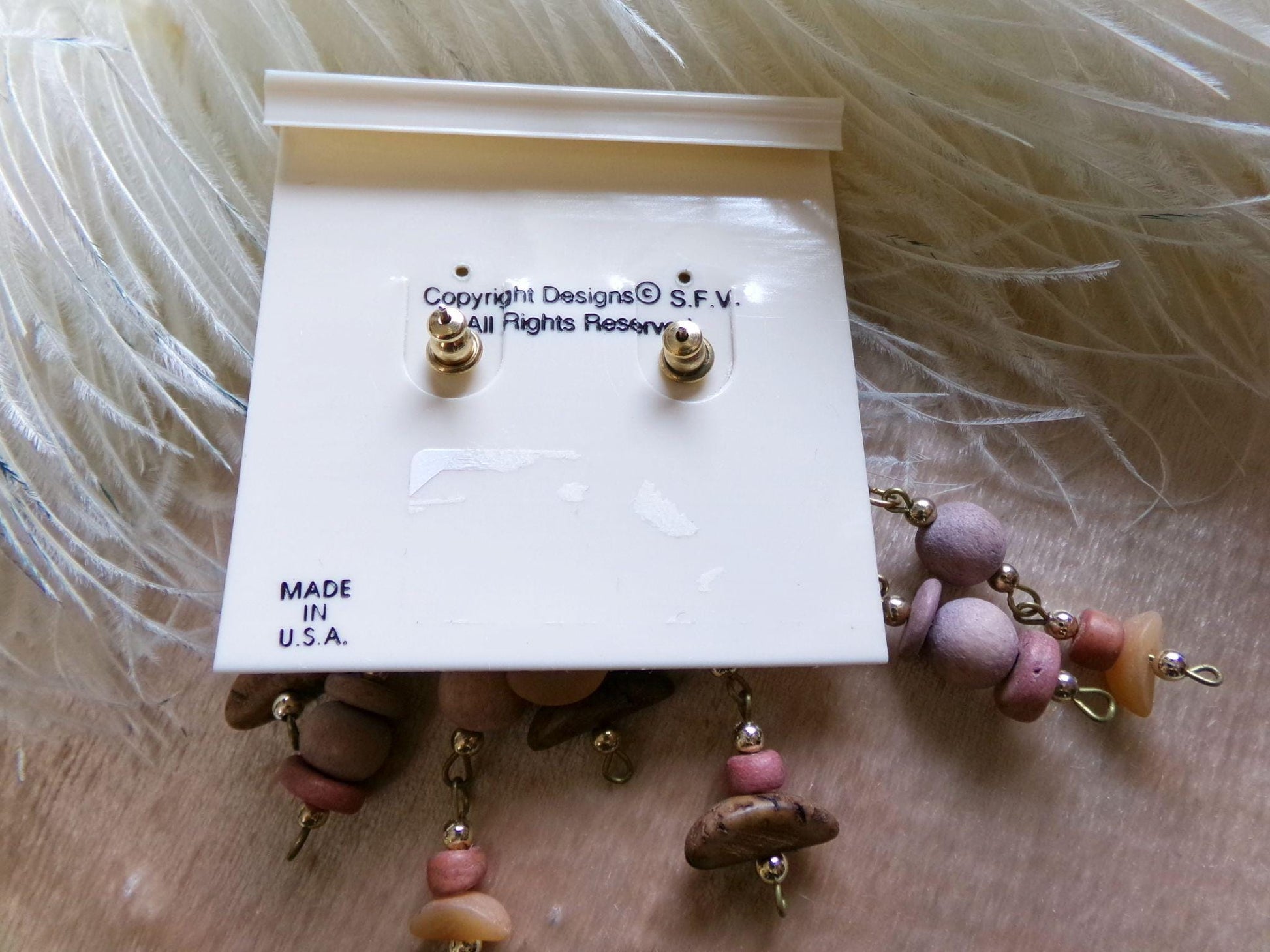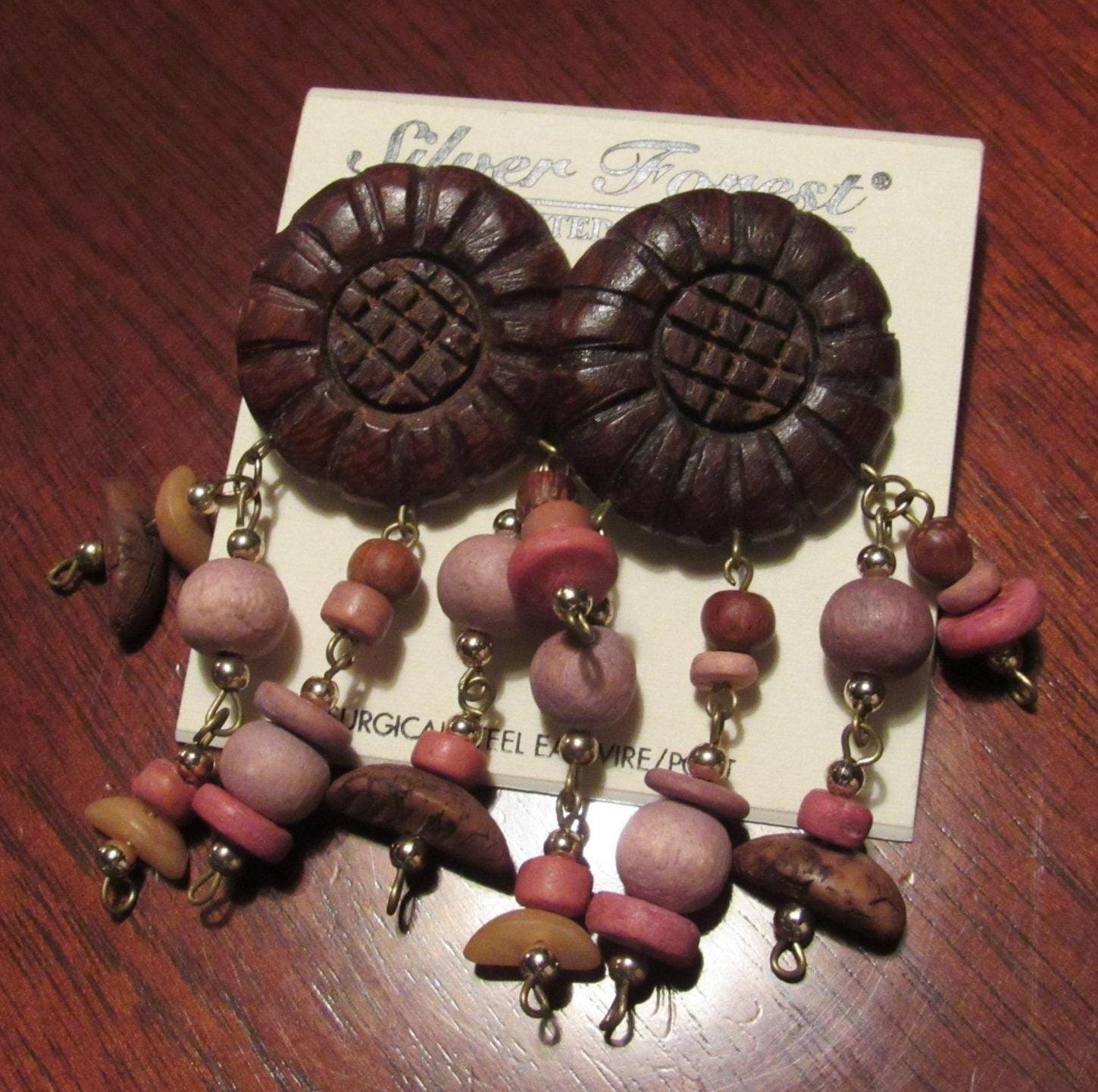 Here is a rare pair of vintage boho chic Silver Forest dangle pierced earrings. They are handcrafted in Vermont, featuring a variety of wood bangles dangling from an intricately carved daisy, also wood. Very artsy design.Post backing. Approx 2 3/4" length. Pre-loved condition. Natural vintage attributes with some nice light patina/wear to the carved daisies.