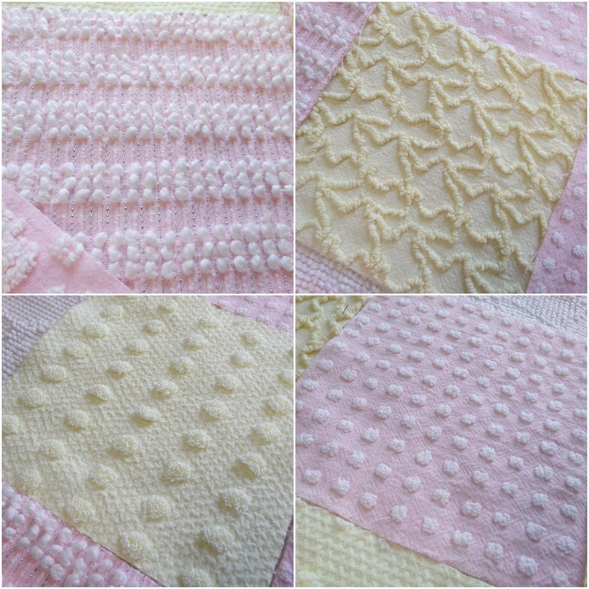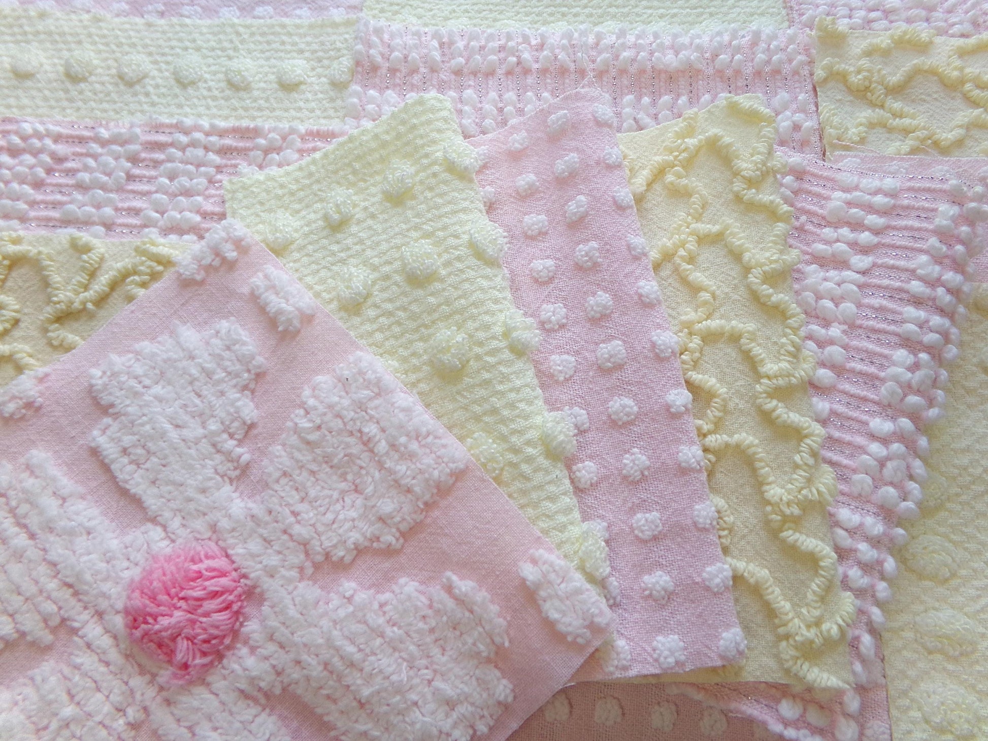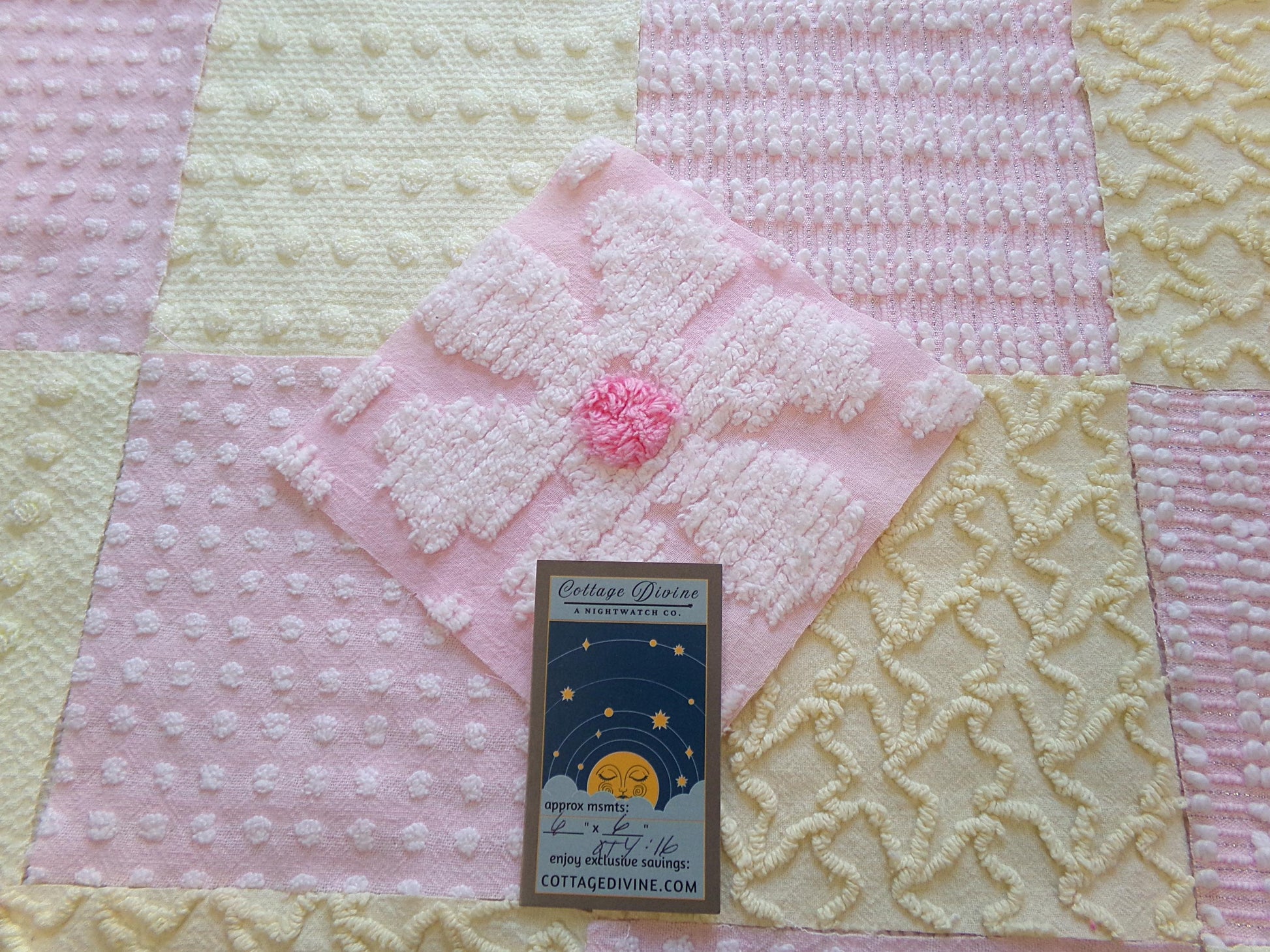 see more, cottagedivine.com"Celebrate Spring" ... a cheerful set of 17 vintage chenille fabric squares emphasizing the sunny shades of springtime. *pattern placement may vary*