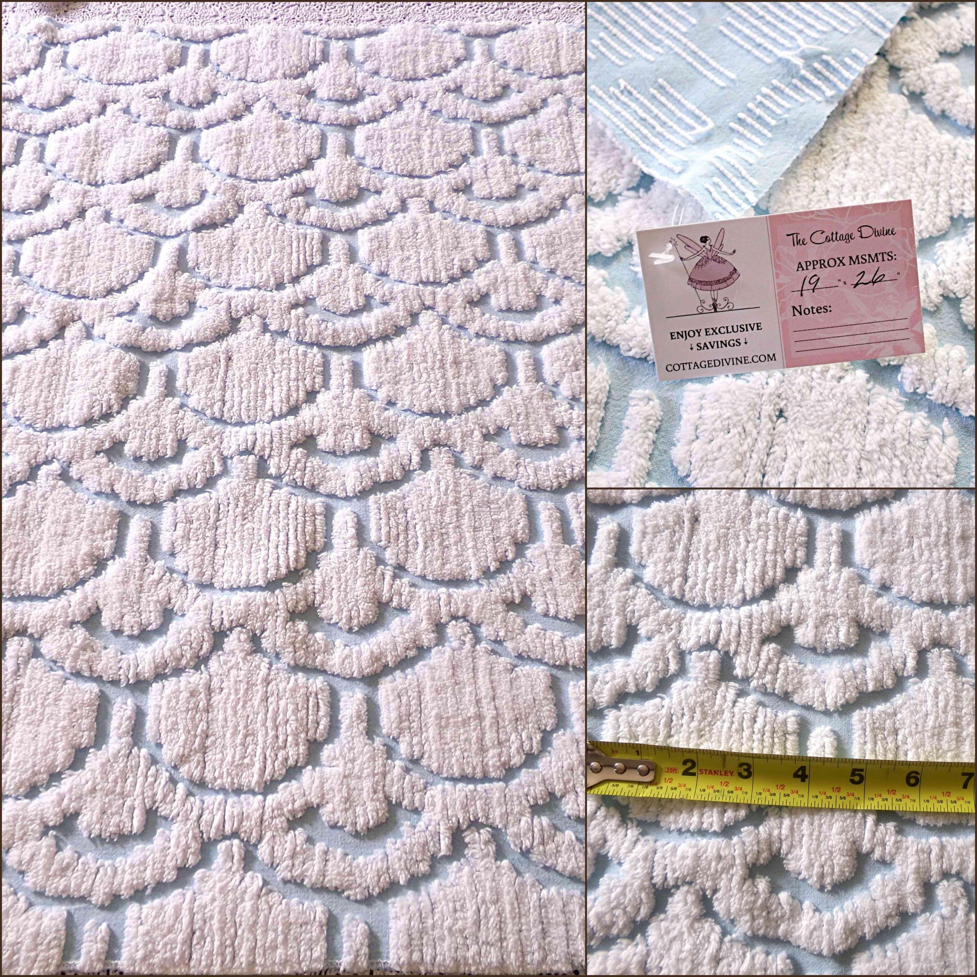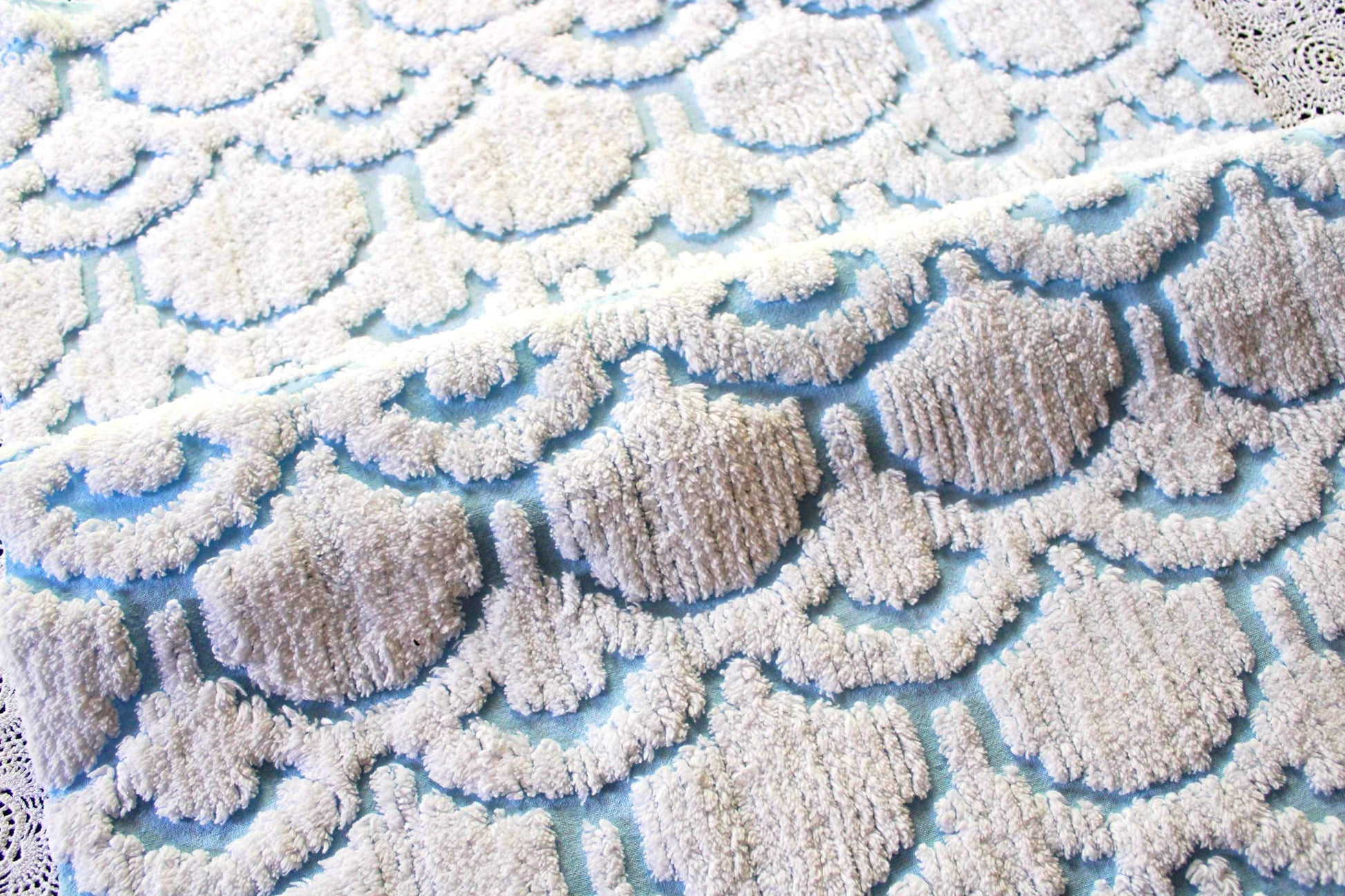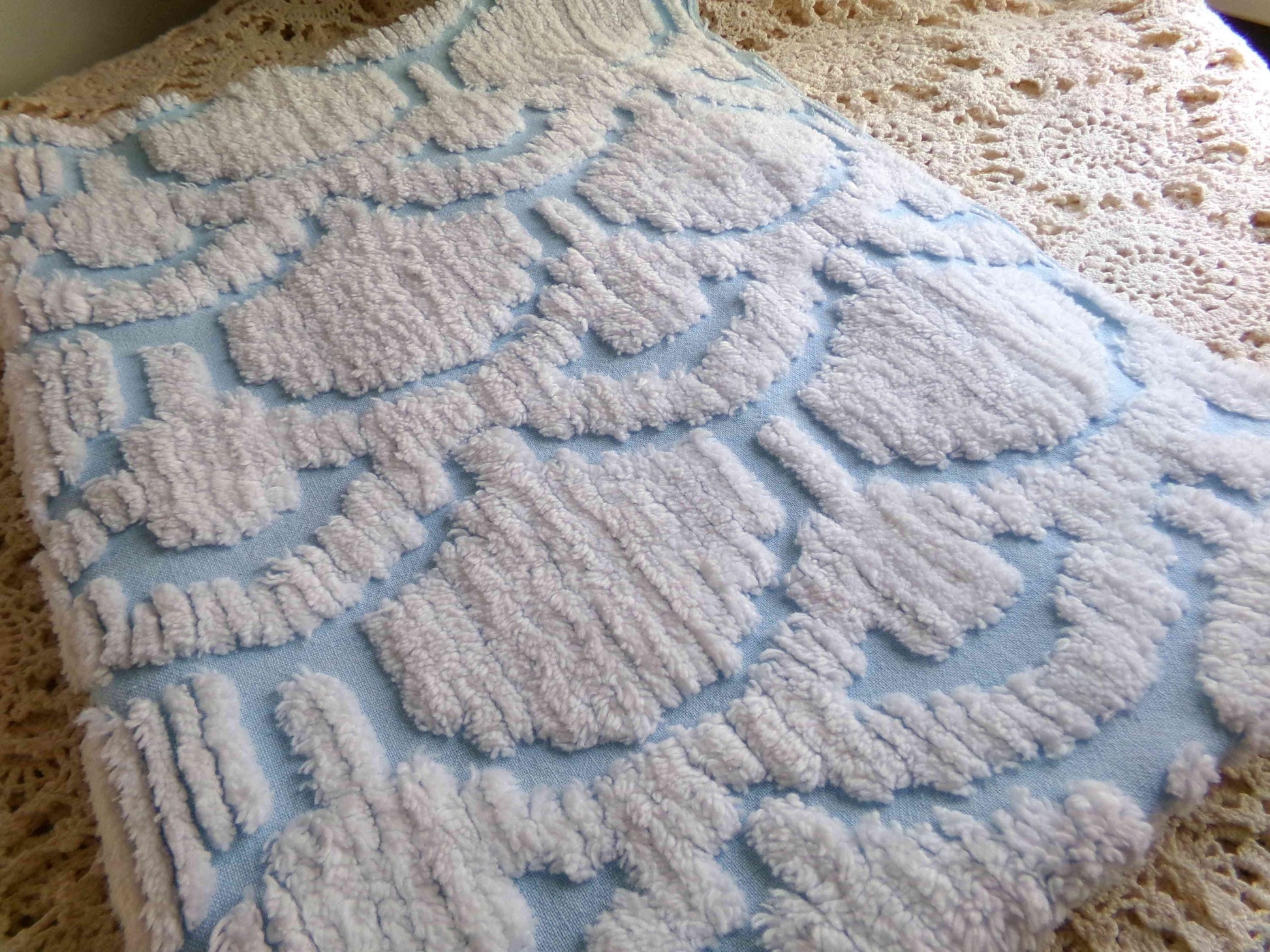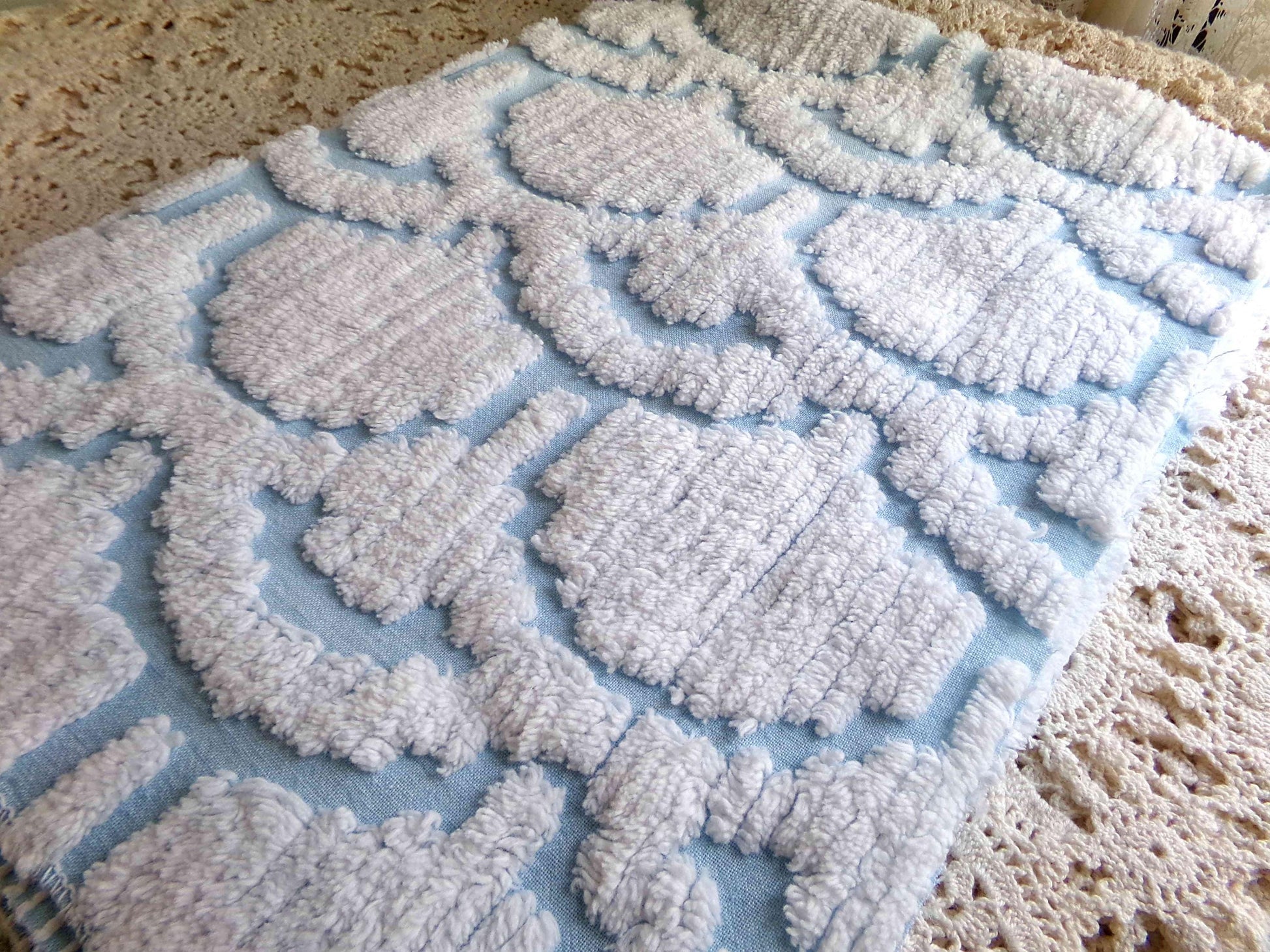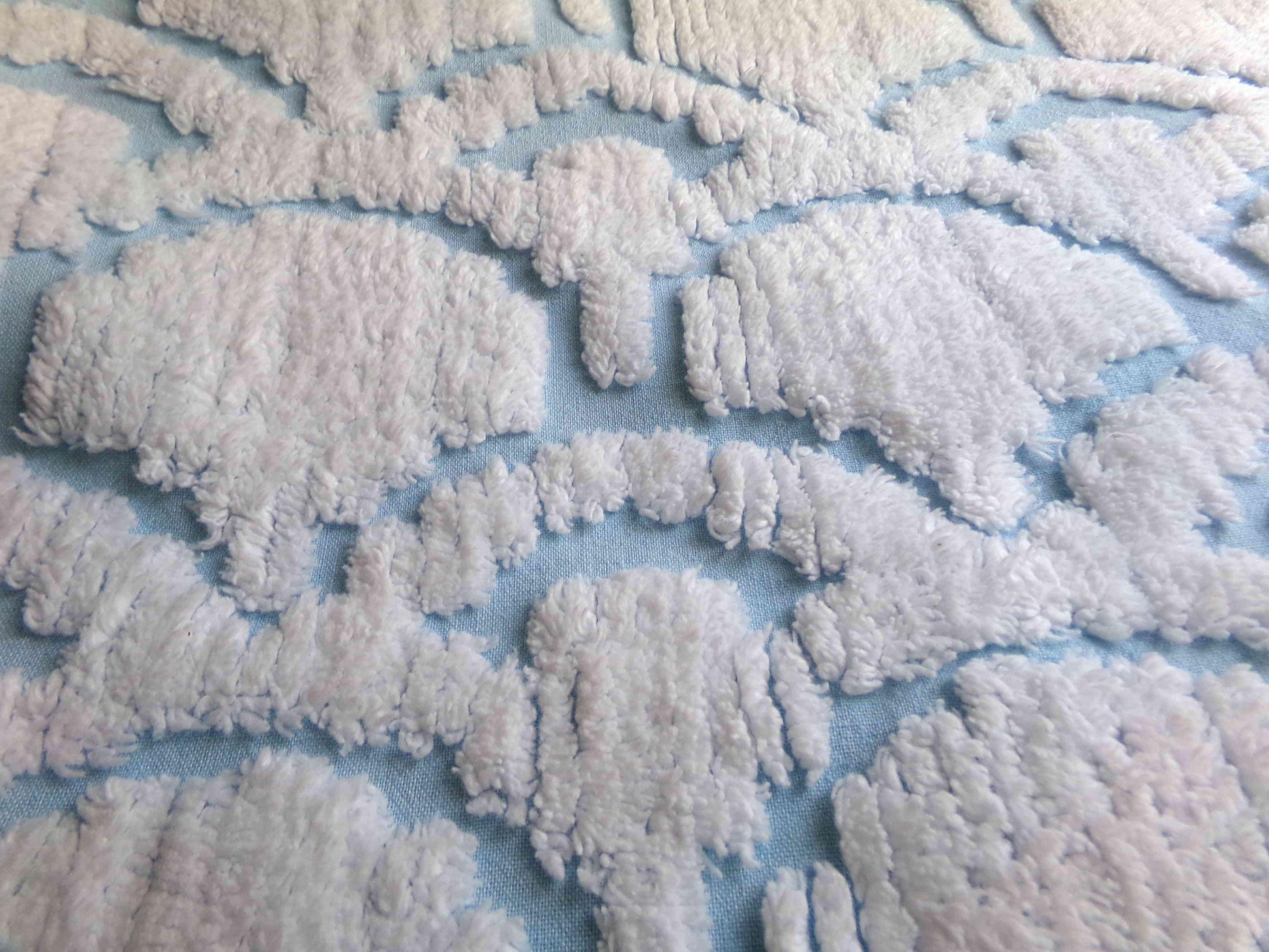 This very unique piece of vintage chenille fabric features an abstract, 3D tufted cloud design in snowy white set on a peaceful sky blue background. Given its striking pattern and texture, it's versatile enough to use in a range of creative projects.Measures approx 19" x 26" inches. 100% cotton, easy to work with. Sourced from an original 1960s chenille bedspread in excellent condition.