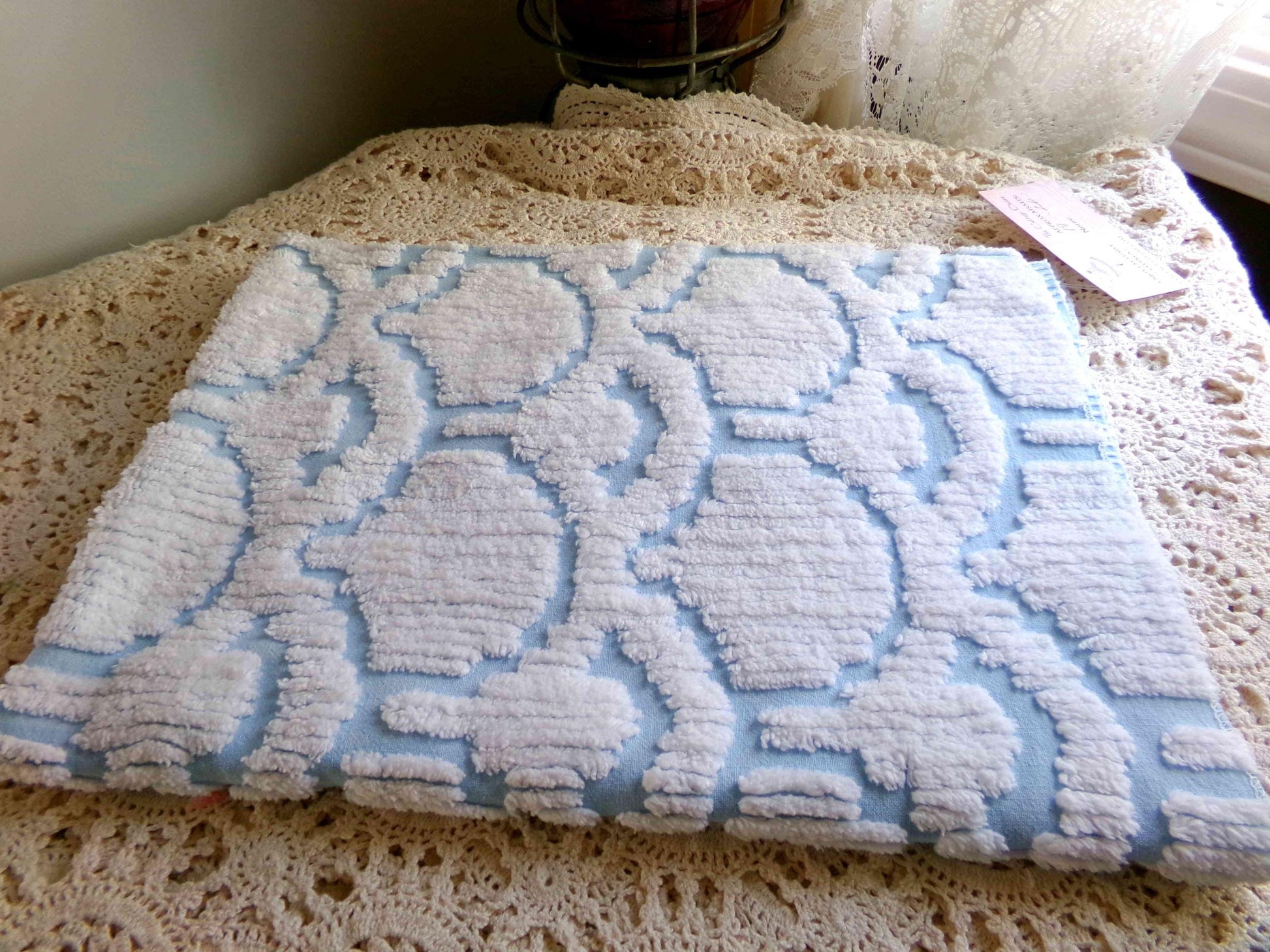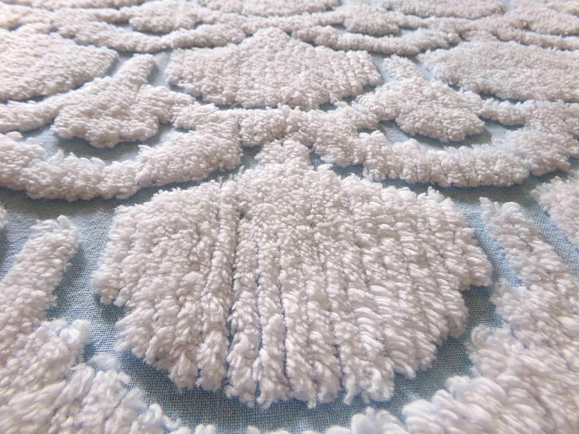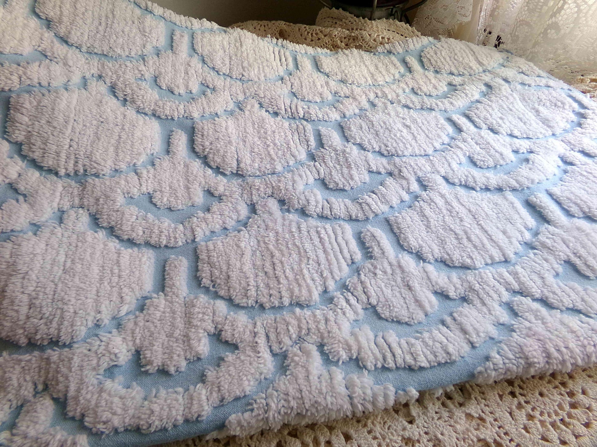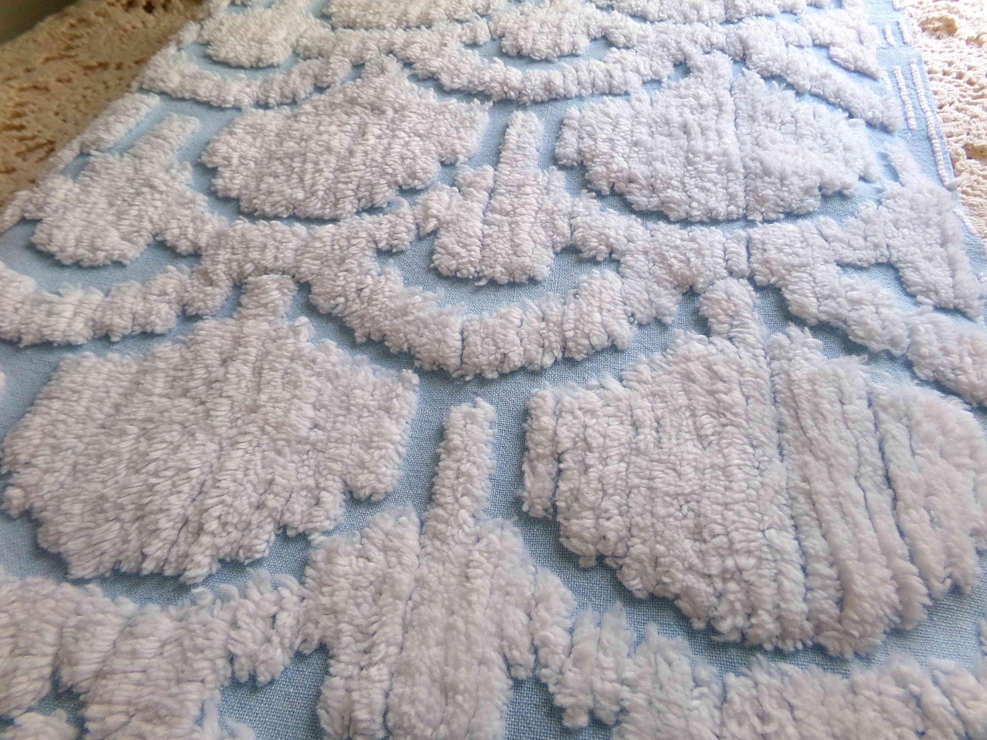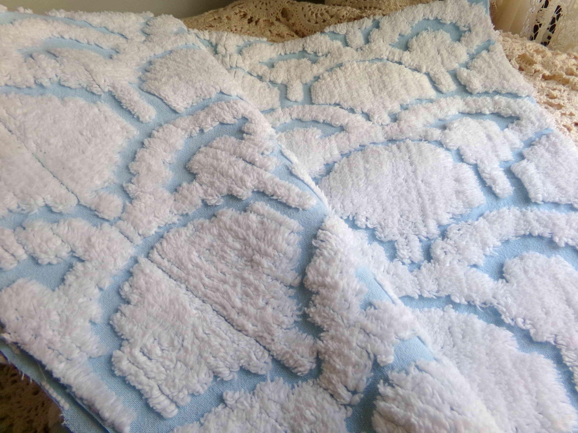 This very unique piece of vintage chenille fabric features an abstract, 3D tufted cloud design in snowy white set on a peaceful sky blue background. Given its striking pattern and texture, it's versatile enough to use in a range of creative projects.Measures approx 19" x 26" inches. 100% cotton, easy to work with. Sourced from an original 1960s chenille bedspread in excellent condition.