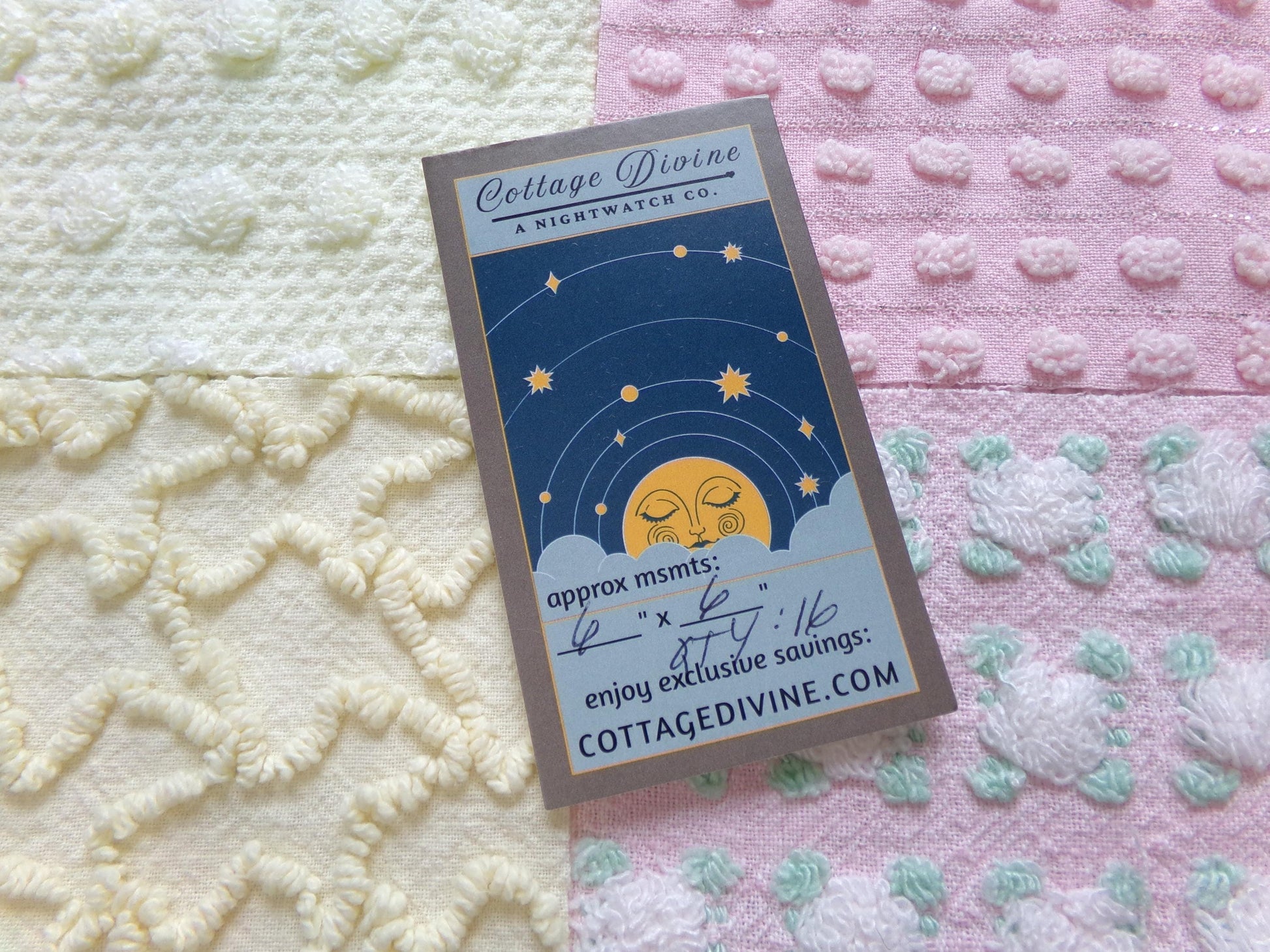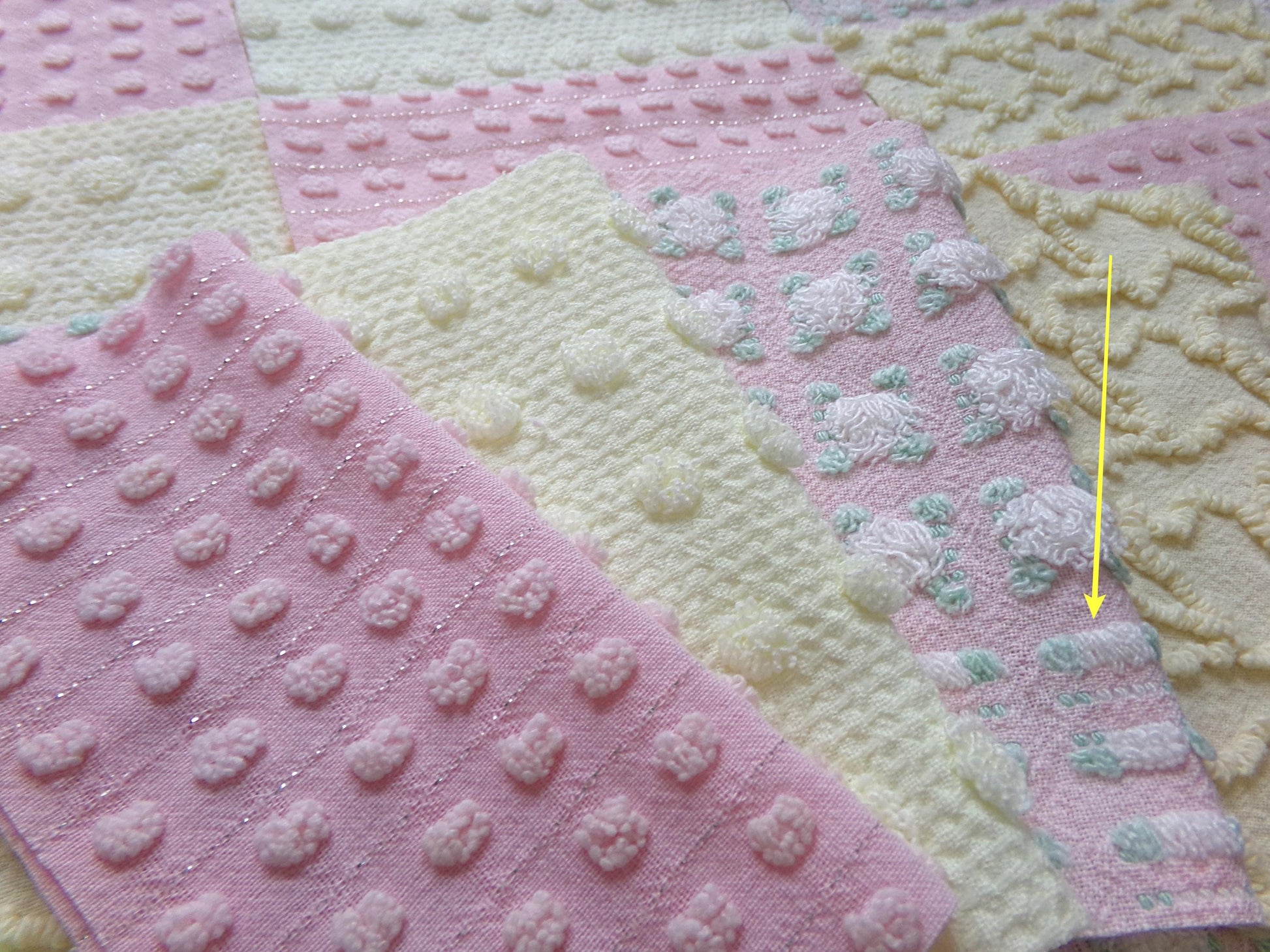 Inspire or enhance your next project with this set of vintage chenille fabric squares in a cheerful selection in enchanting springtime colors: pretty pink and sunny yellow.You'll receive a total of 16 fabric squares measuring 6" x 6". 4 each of the following patterns: phantom pink rosebud, yellow squiggle, lemon chiffon woven dot, pink dot. *Note the rosebud blocks are called a phantom design, where some rosebuds are empty (leaves only), creating a unique pattern (see final img).