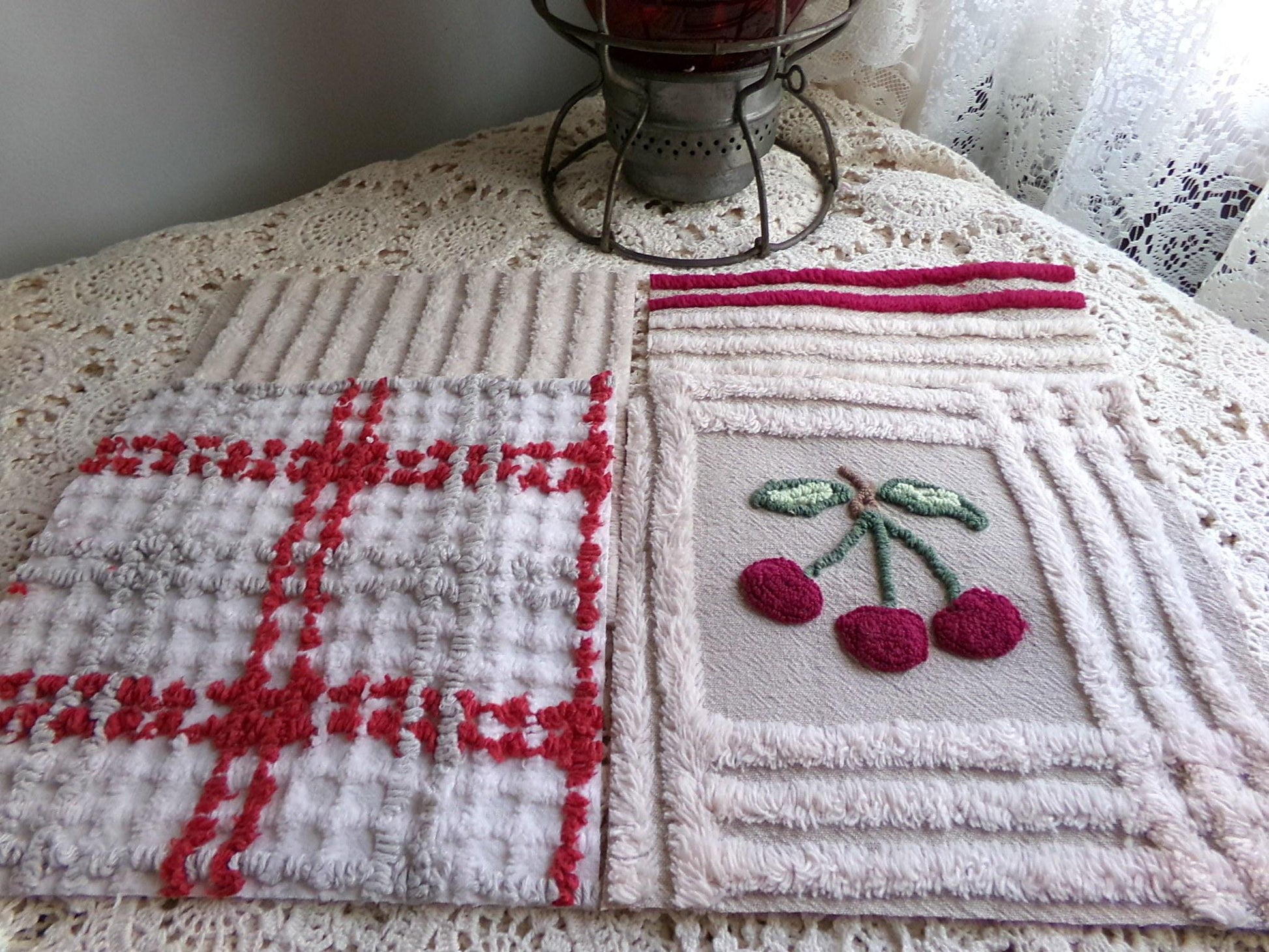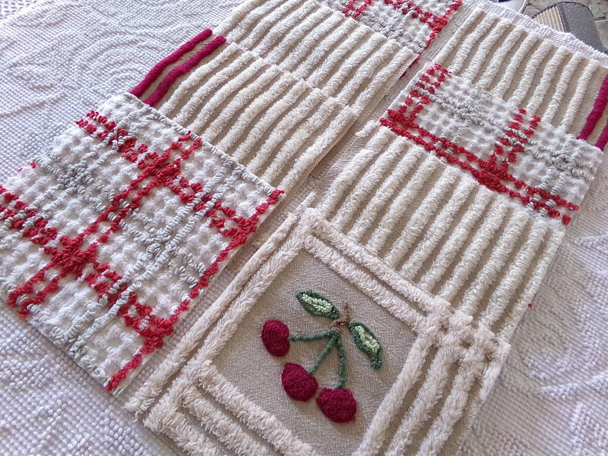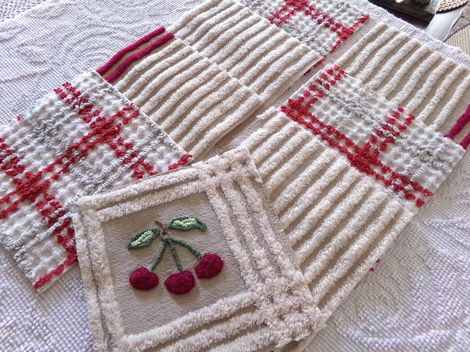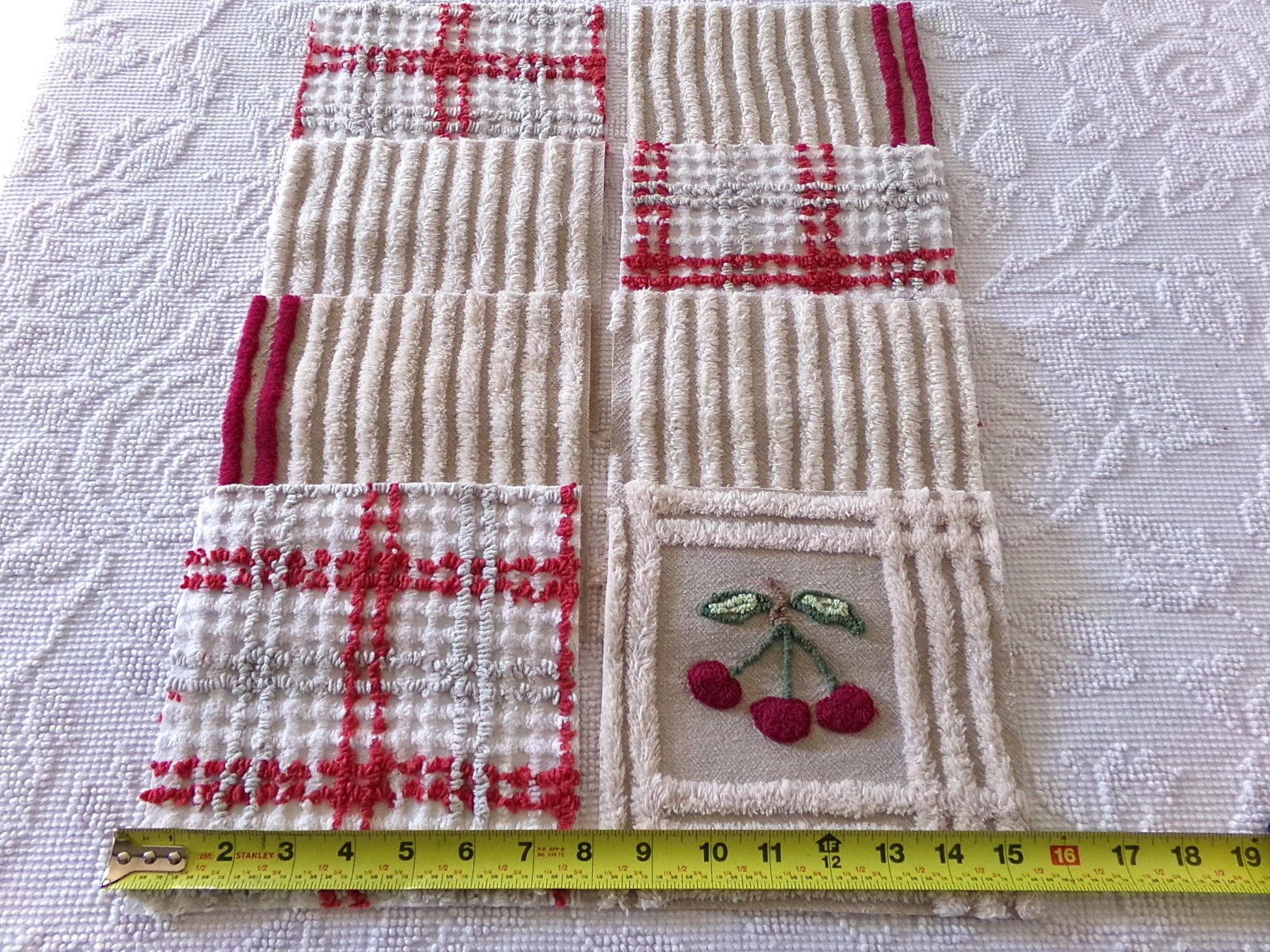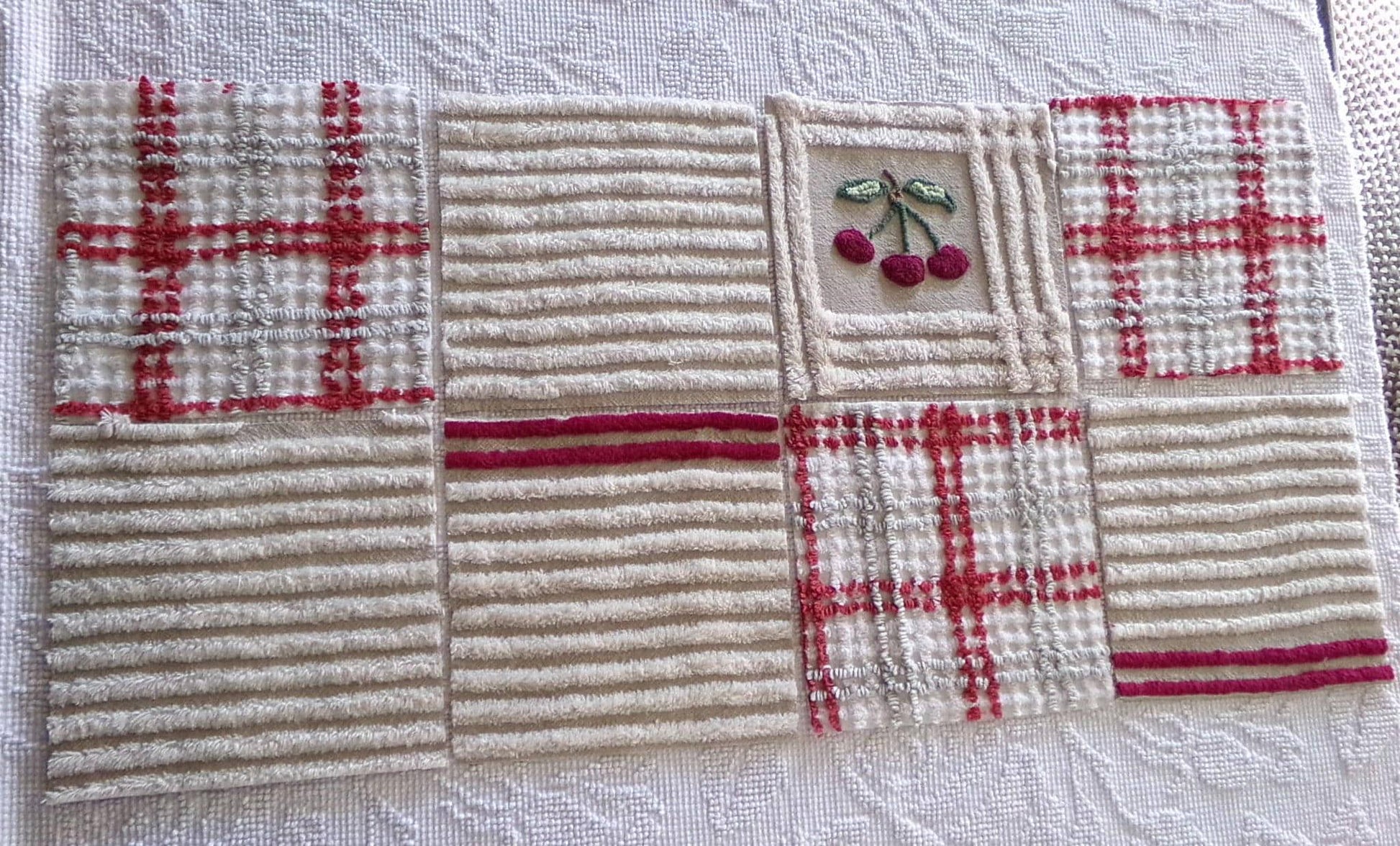 It's the cherry cheery set...Get crafty with this retro mix of 8 vintage chenille quilt blocks that measure about 7.5" x 7.5" square each. I put together this coordinated set to highlight that cute cherry square - make a patchwork pillow, an inlay for a quilt, or whatever else your creative mind can dream up ;)You'll receive a total of 8 rotary cut craft squares, which include: 1 cherry square, 3 grey & maroon plaid, 2 grey & mist white stripe, and 2 grey & mist white stripe with double line maroon edge. All are cotton.