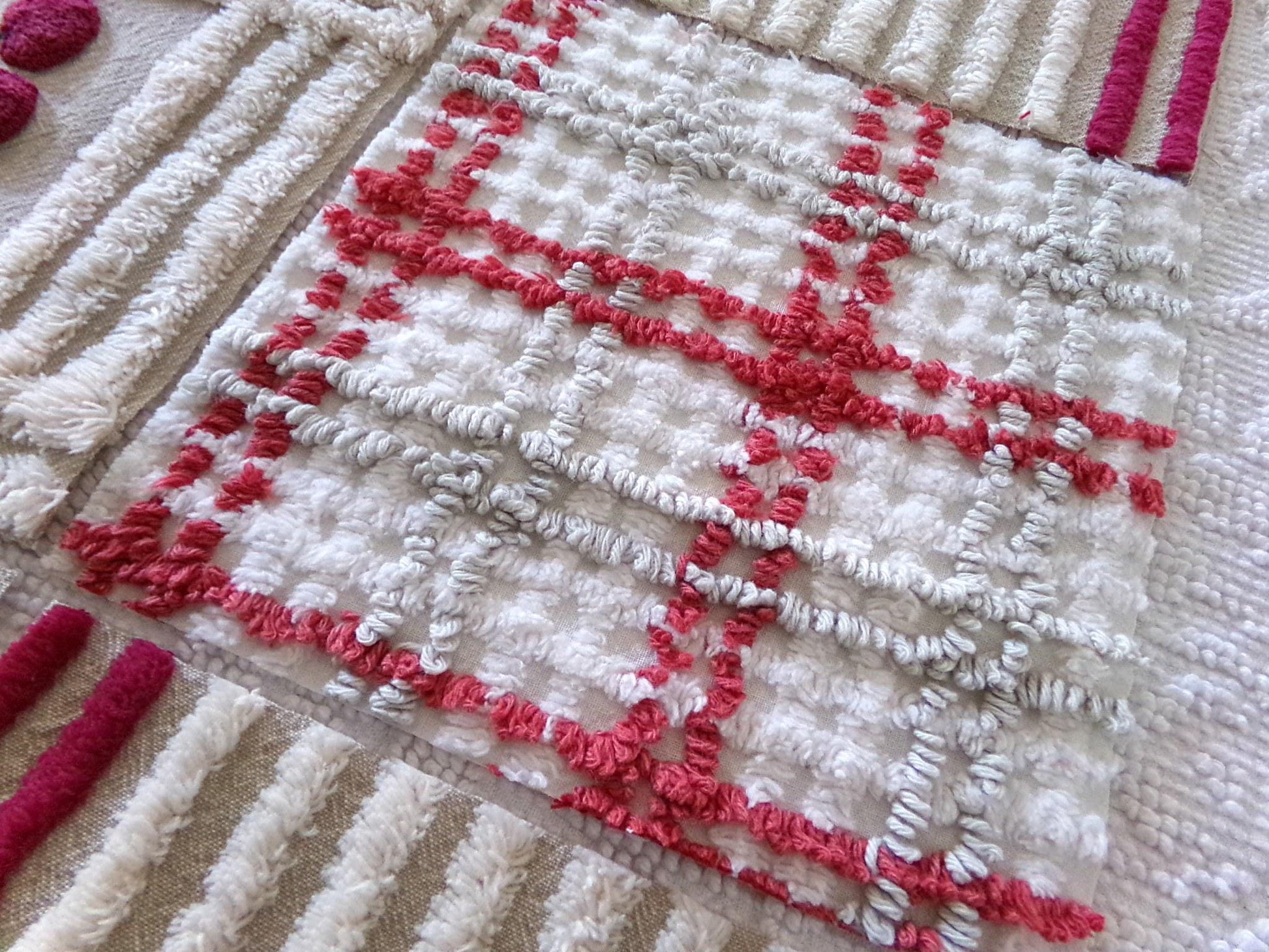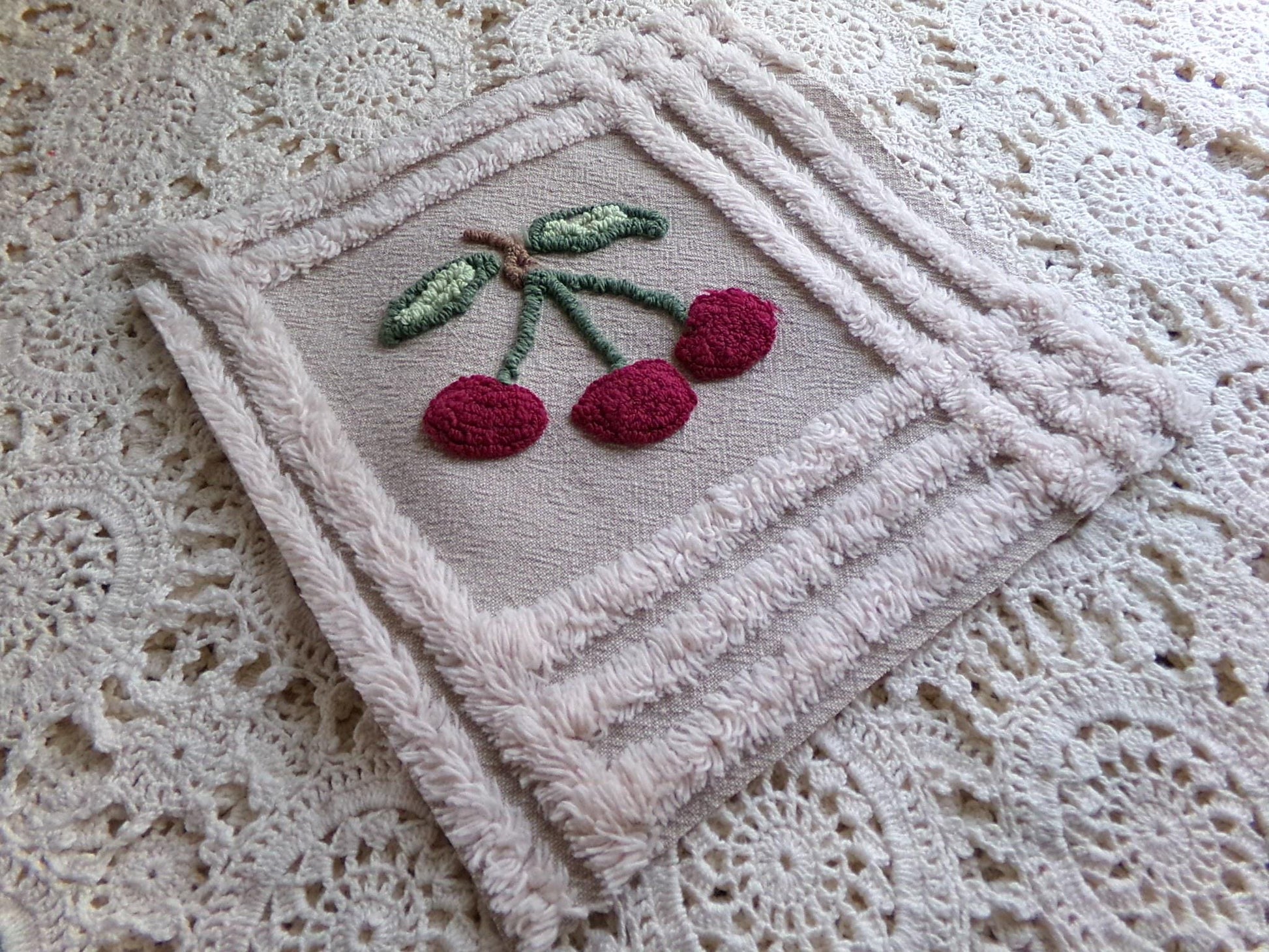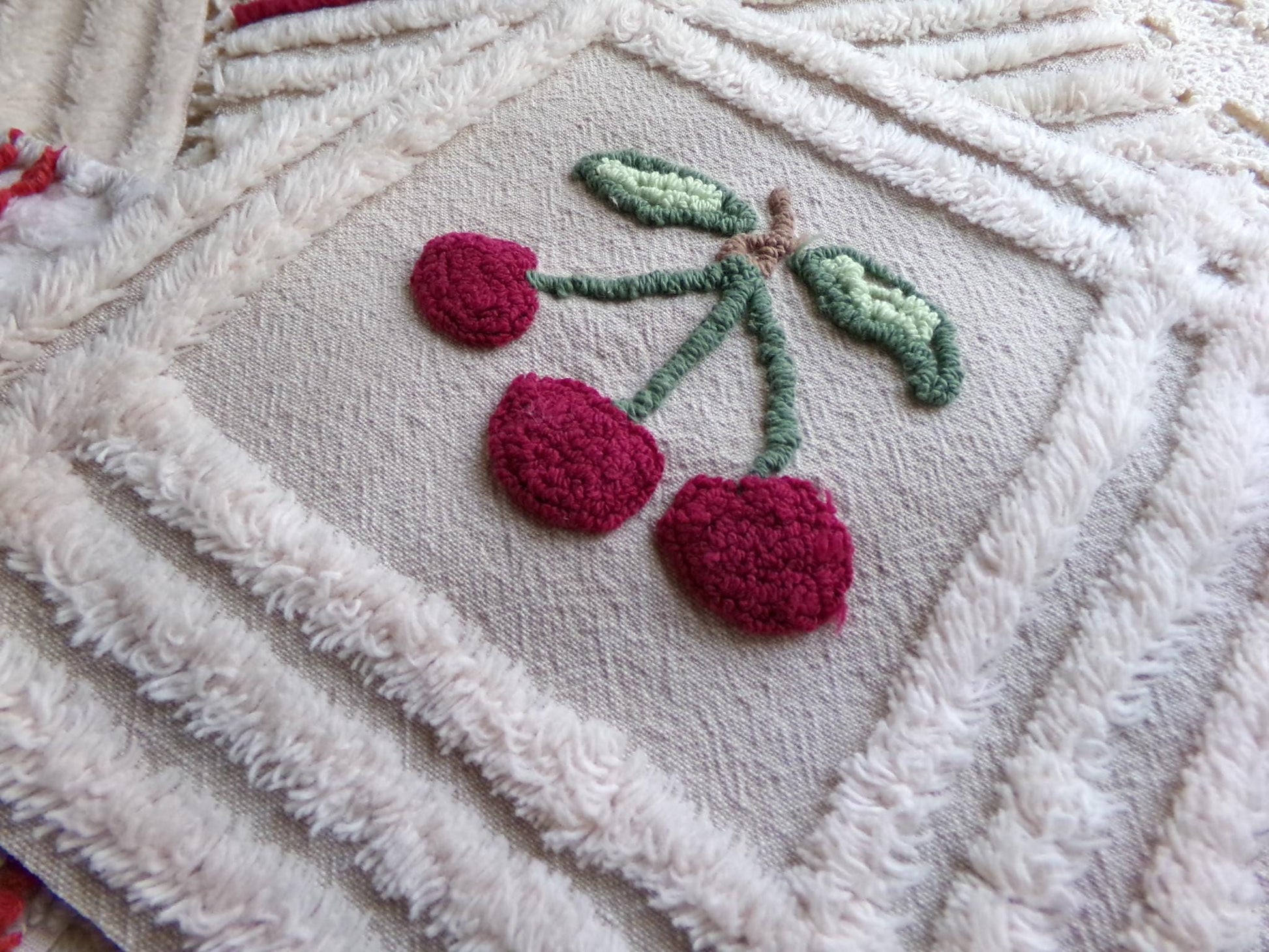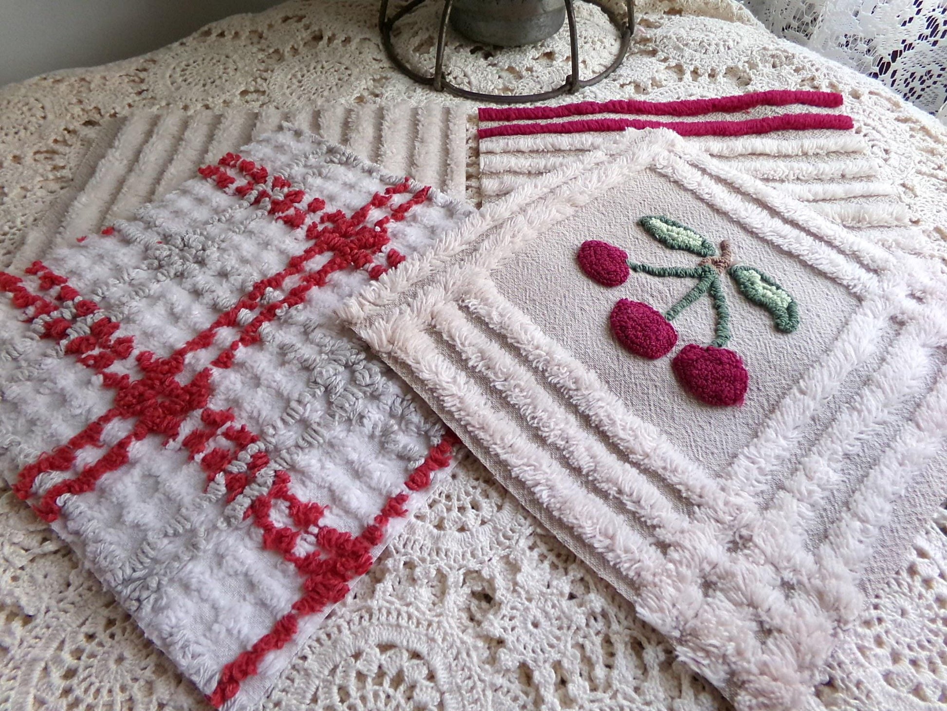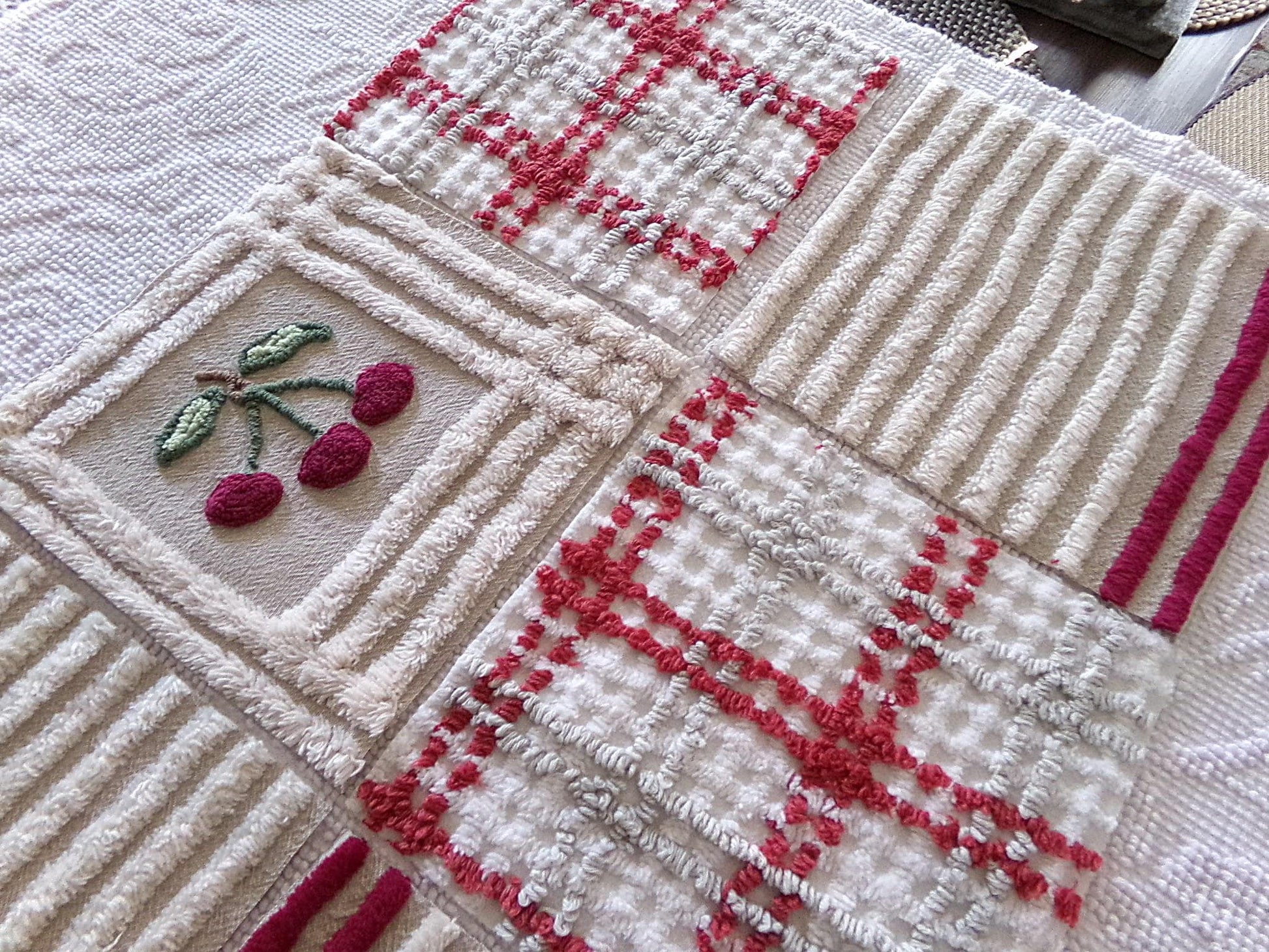 It's the cherry cheery set...Get crafty with this retro mix of 8 vintage chenille quilt blocks that measure about 7.5" x 7.5" square each. I put together this coordinated set to highlight that cute cherry square - make a patchwork pillow, an inlay for a quilt, or whatever else your creative mind can dream up ;)You'll receive a total of 8 rotary cut craft squares, which include: 1 cherry square, 3 grey & maroon plaid, 2 grey & mist white stripe, and 2 grey & mist white stripe with double line maroon edge. All are cotton.