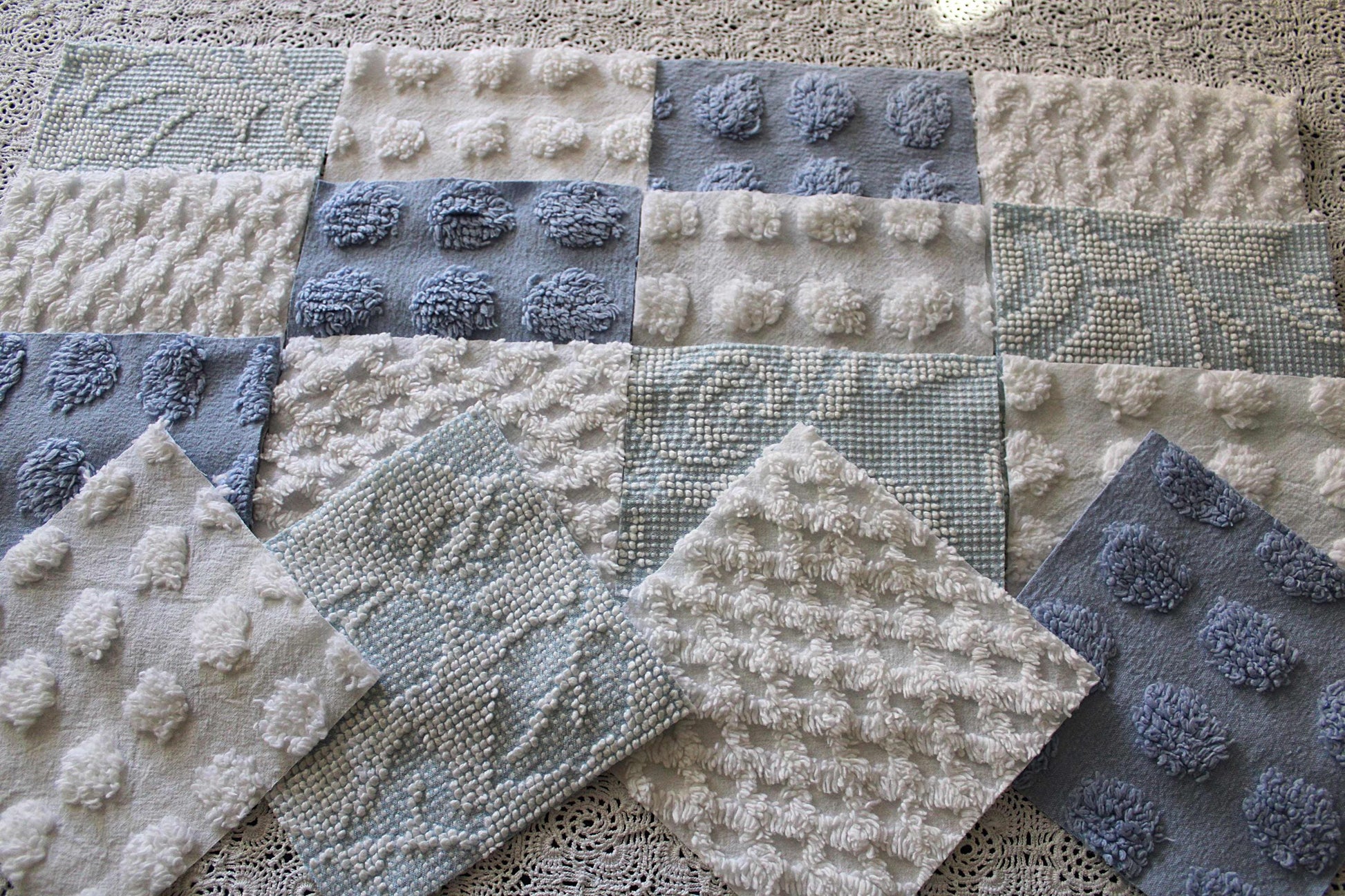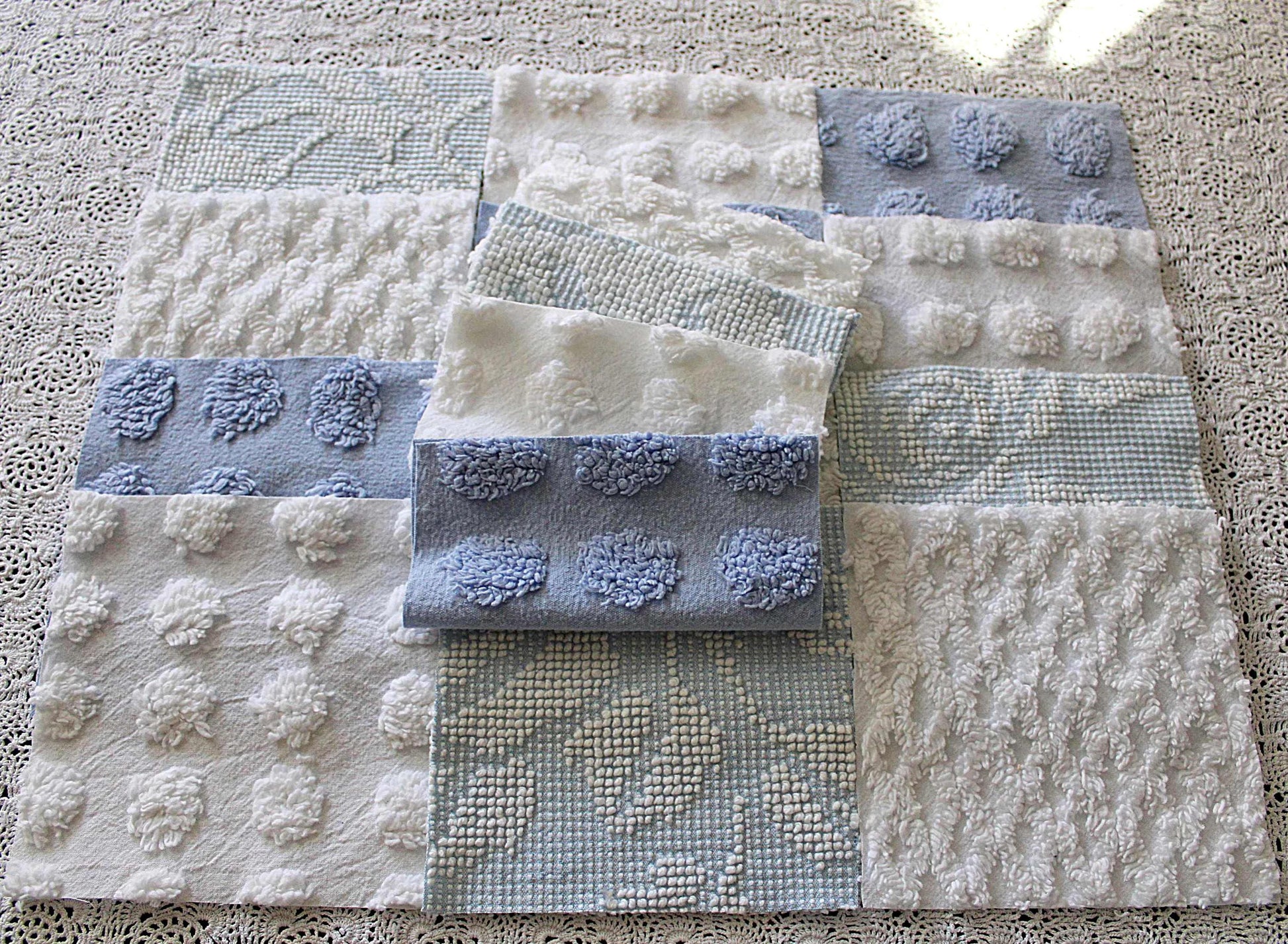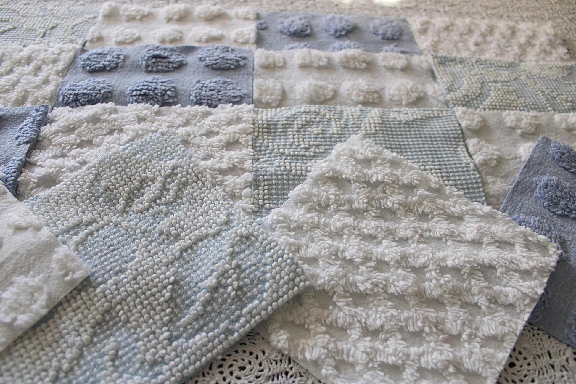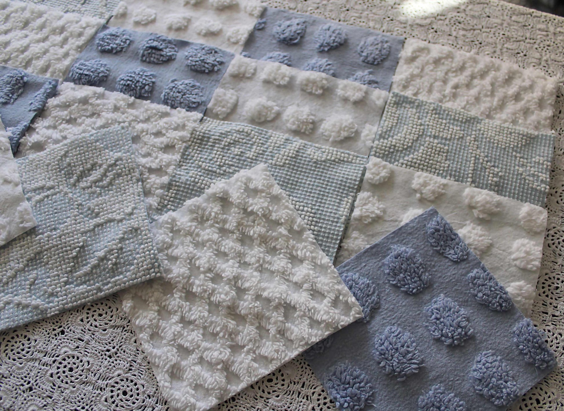 A classic set of chenille fabric squares in popular, traditional patterns and versatile colors...fresh white & beachy blues.Includes 4 of each pattern: white coin dot, blue coin dot, white lattice, blue & white hobnail. A great set to inspire or enhance your creative design.