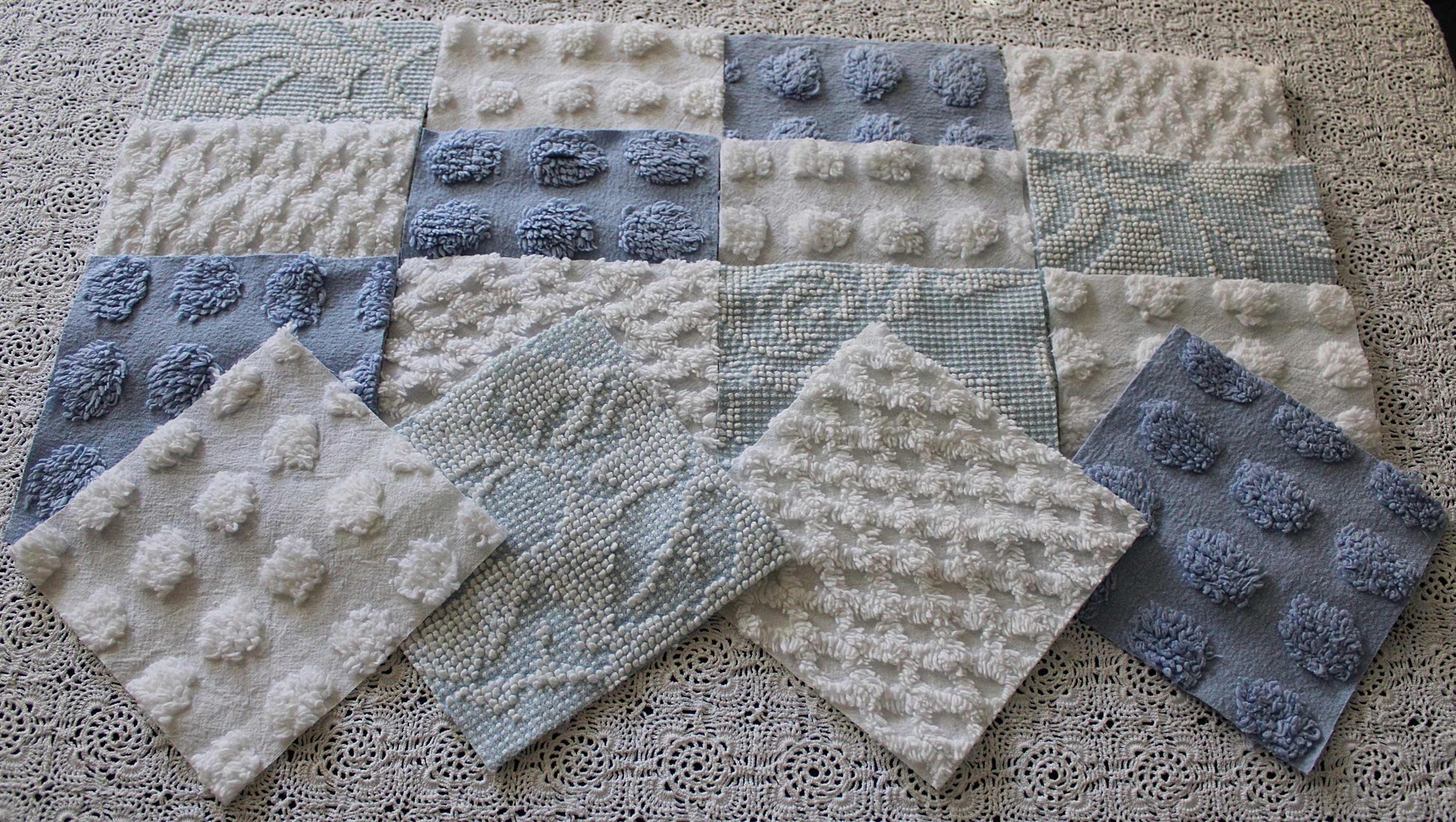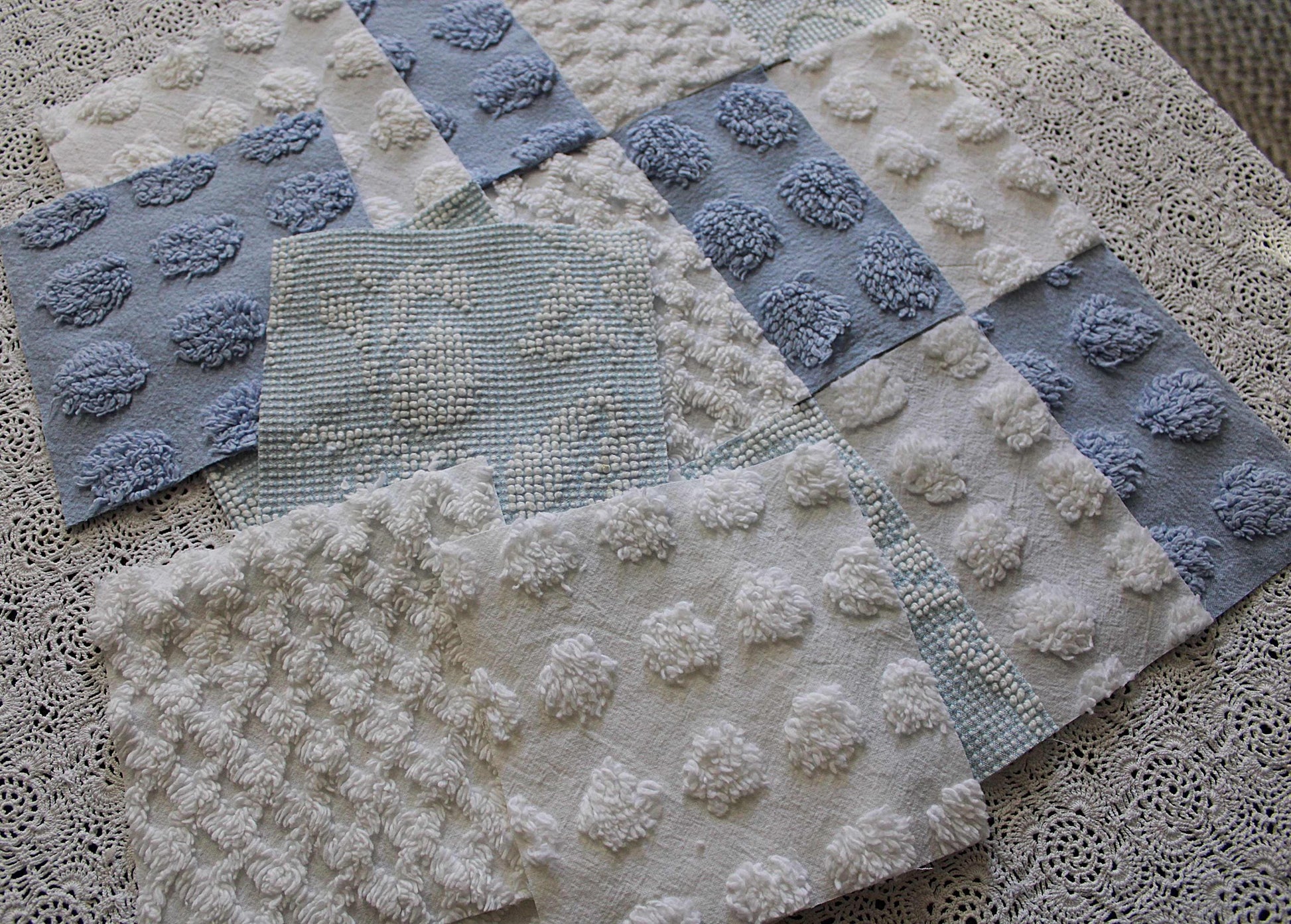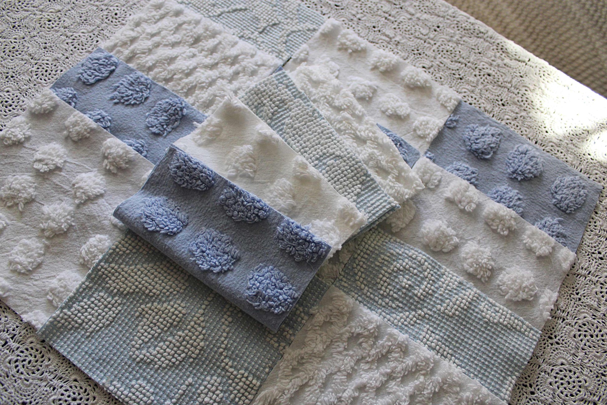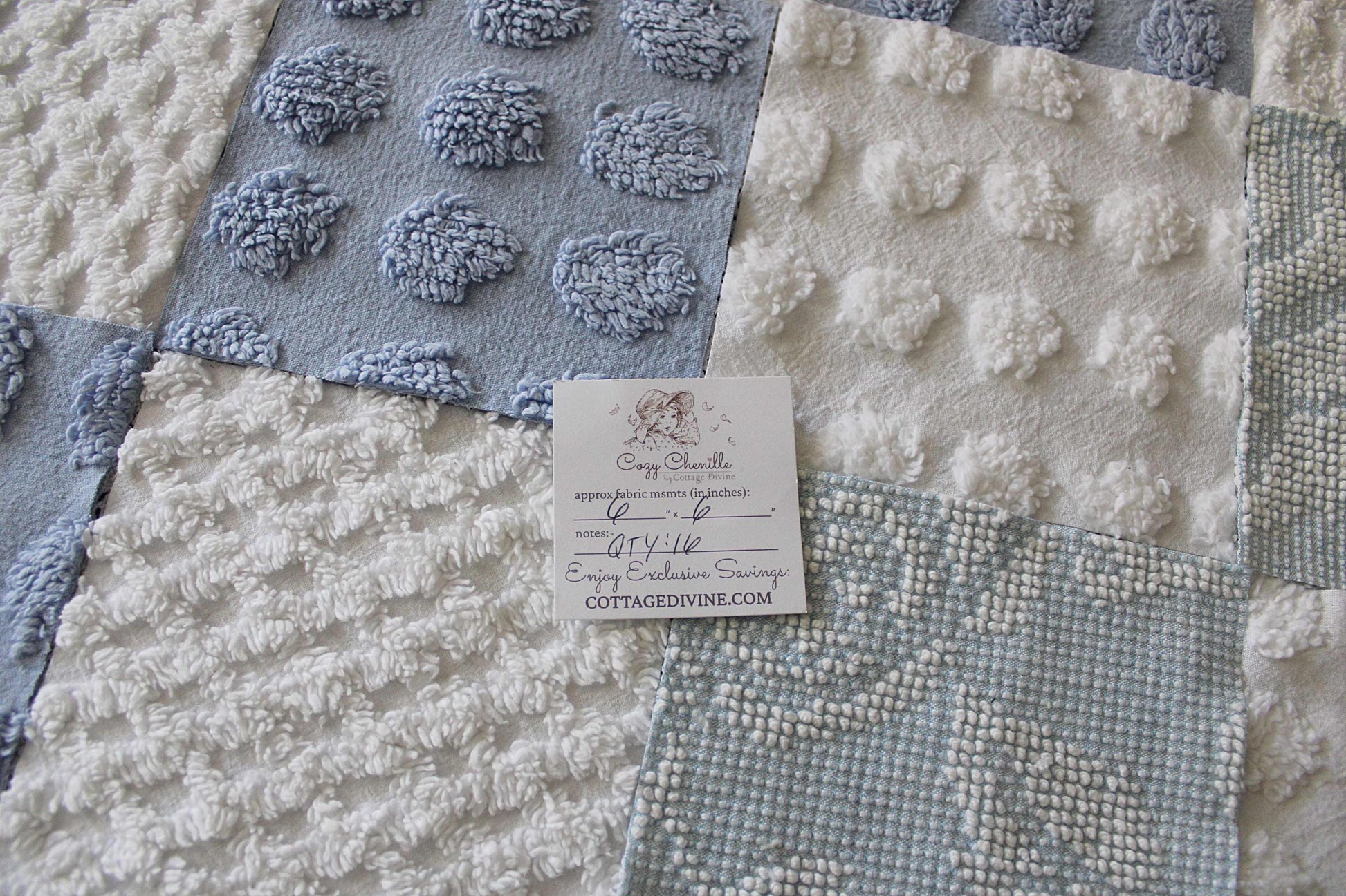 A classic set of chenille fabric squares in popular, traditional patterns and versatile colors...fresh white & beachy blues.Includes 4 of each pattern: white coin dot, blue coin dot, white lattice, blue & white hobnail. A great set to inspire or enhance your creative design.