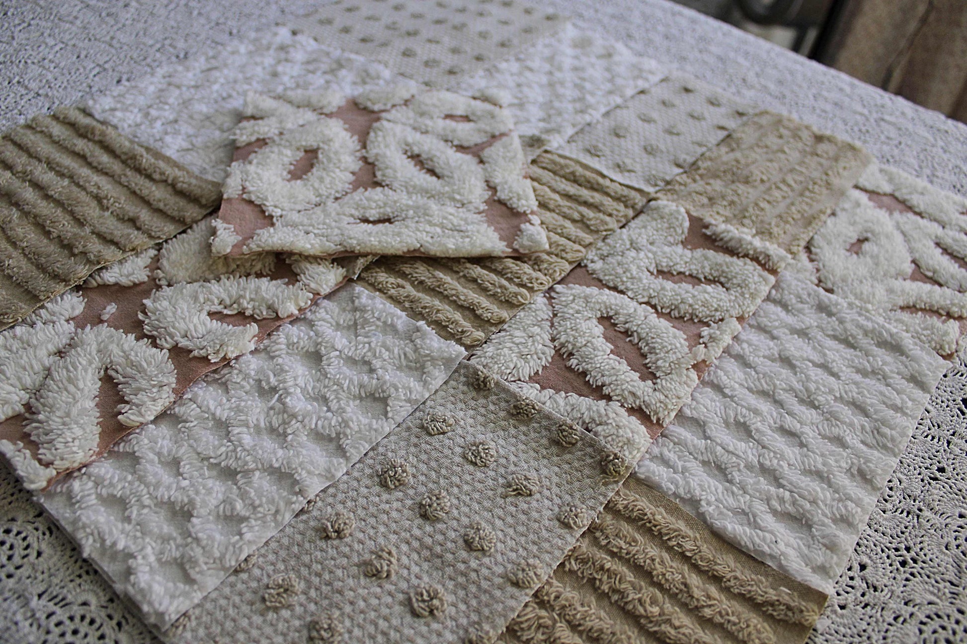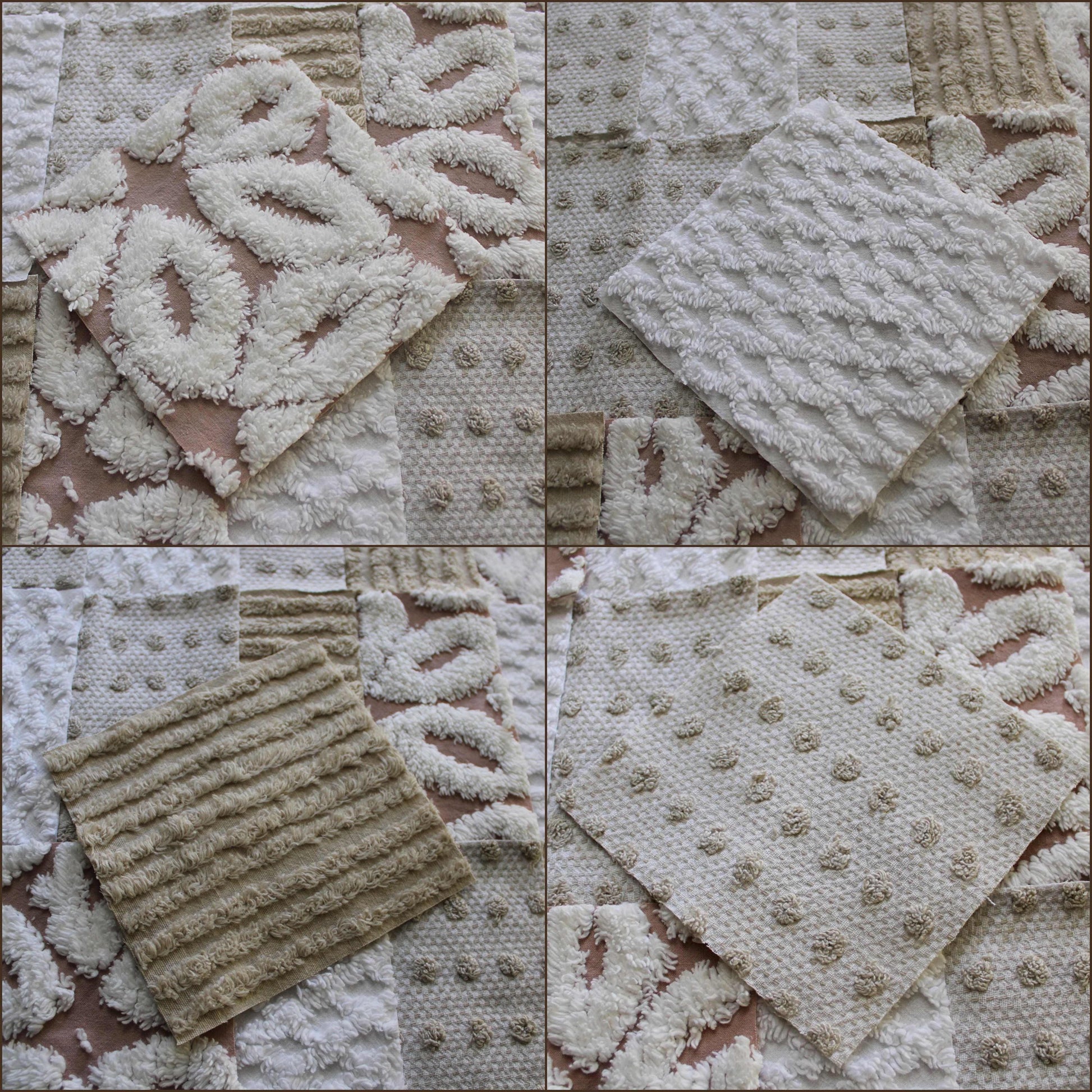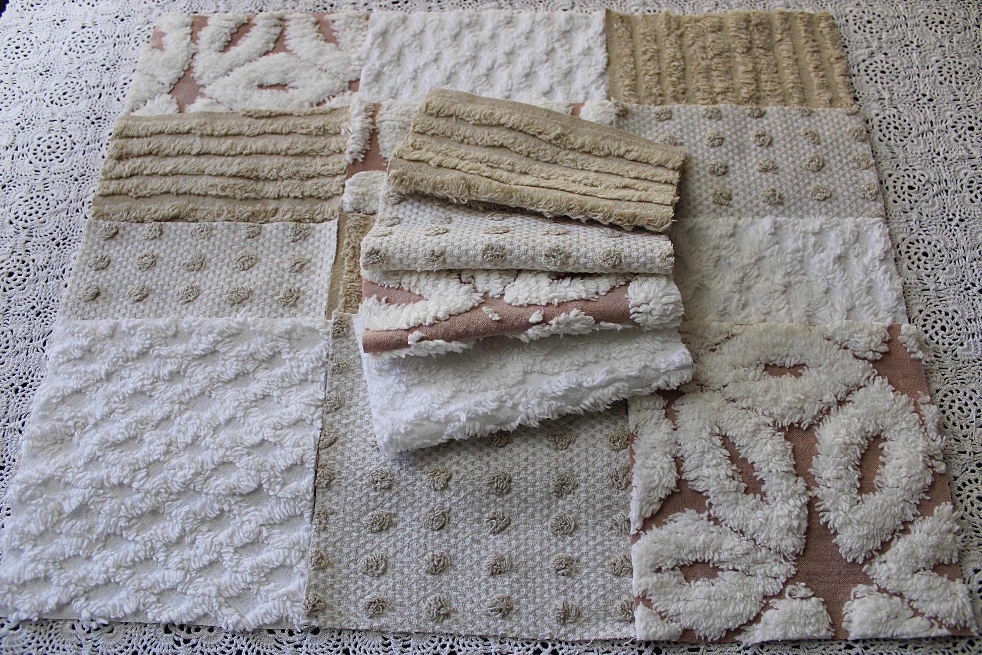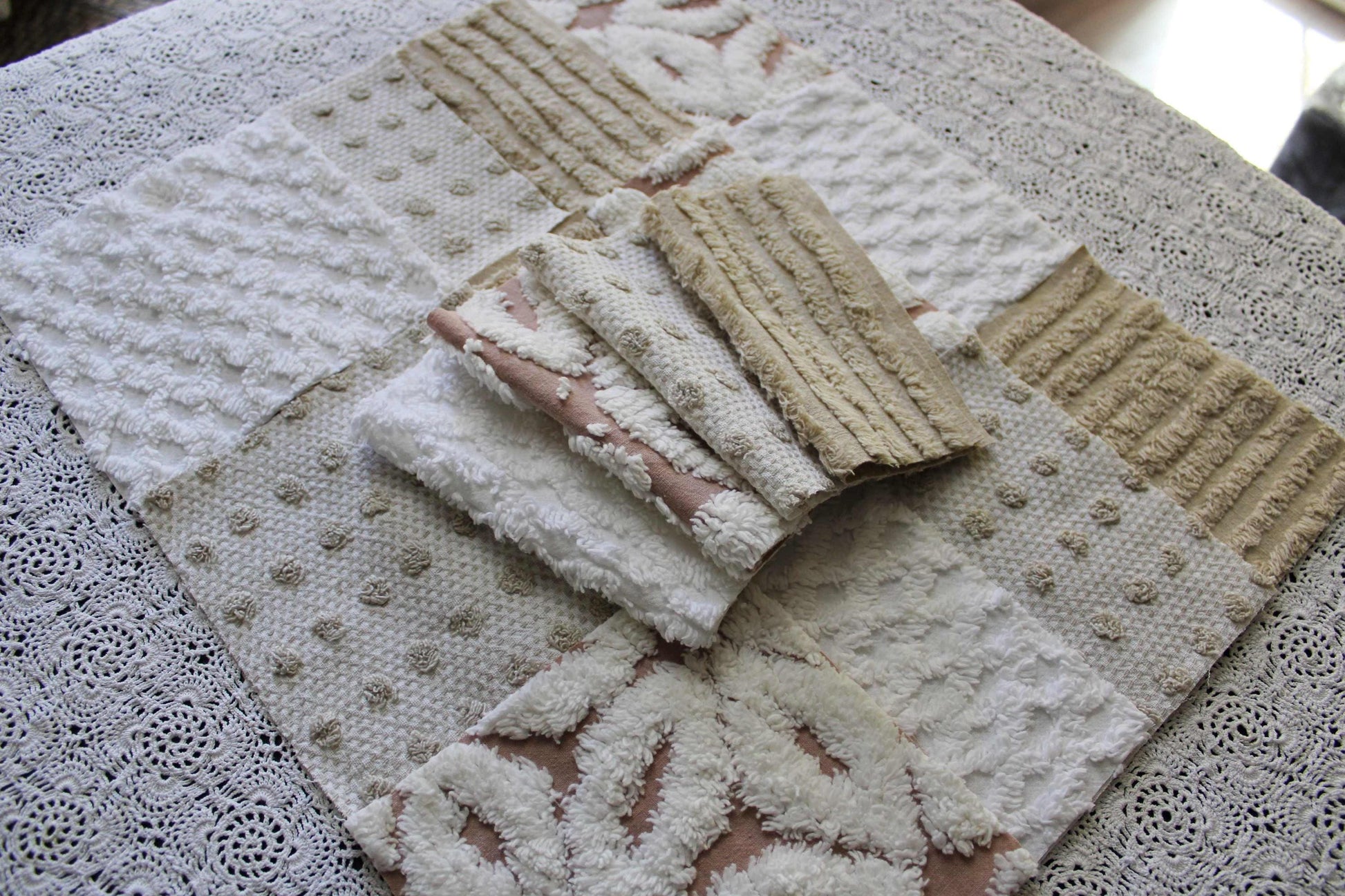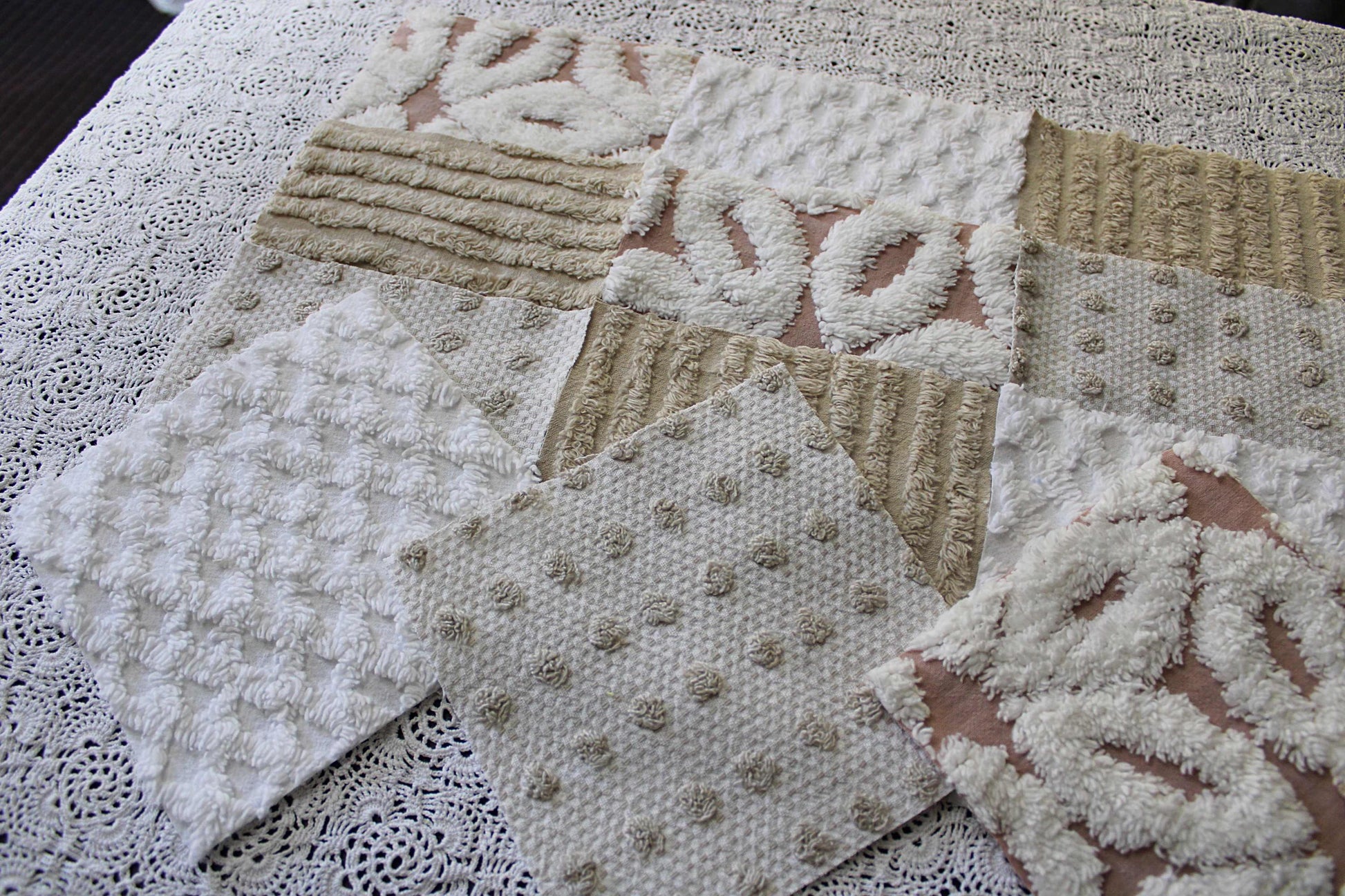 A nice & neutral set of chenille fabric squares in unique patterns to bring both texture and modern color to any project...all cut from a selection of original vintage chenille bedspreadsIncludes 4 of each pattern: sand & white woven pops, white lattice, tan stripes, mocha & white abstract sunflower wedge. A great set to inspire or enhance your creative design.::total qty: 16 chenille quilt squares